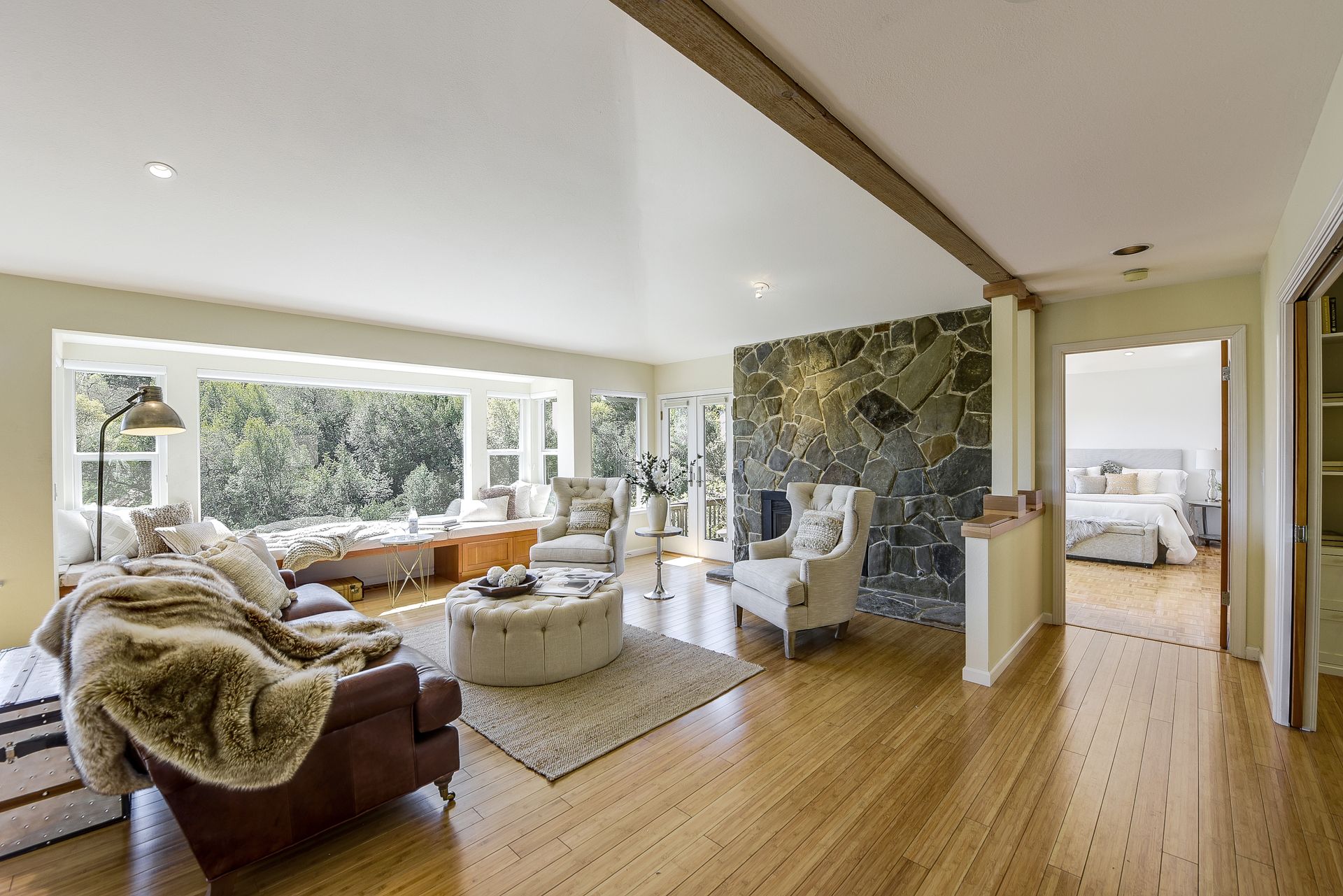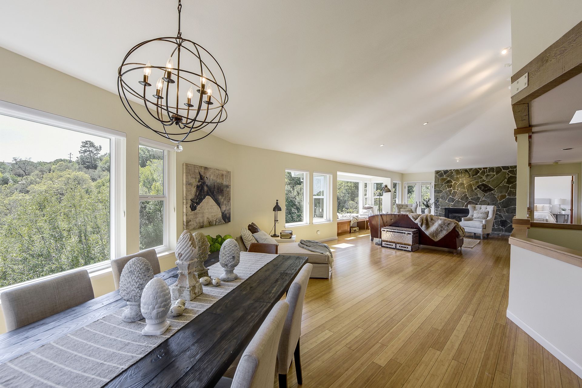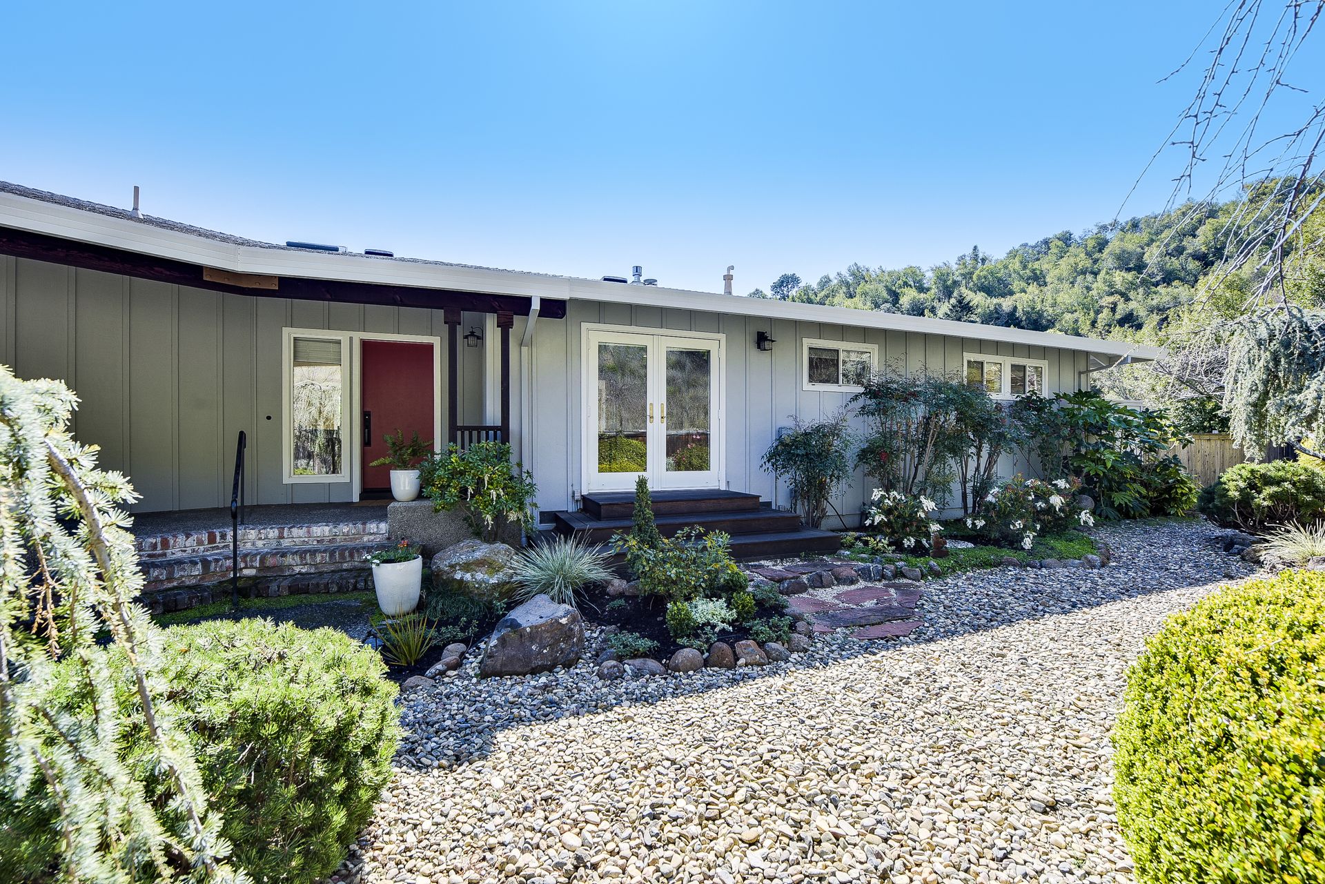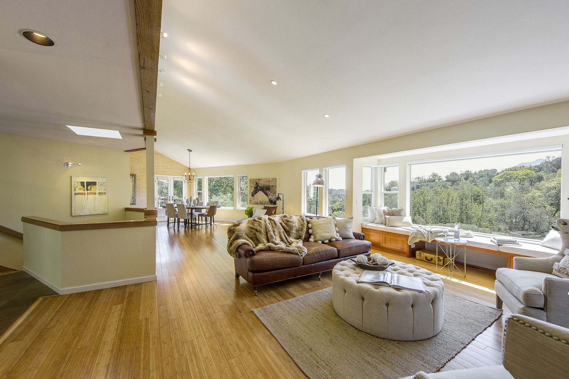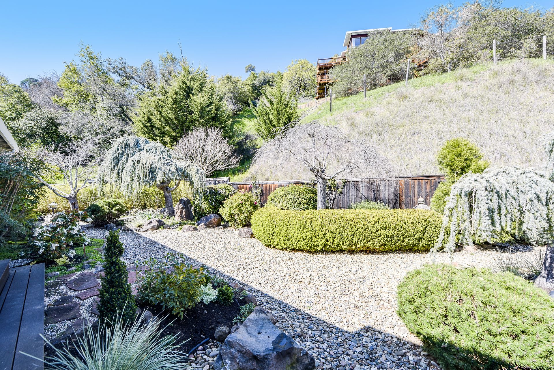 Welcome home to this enchanting oasis of tranquility. Ideally situated between both downtown San Anselmo and Fairfax, this spacious four bedroom + large den, three and one half bath home is approximately 2,872 sq. ft., and is perfectly located on over an acre lot with Mt. Tam, ridge and valley views. The updated kitchen features high end appliances and an eat-in area with sliders out to the deck ideal for barbecuing and al fresco dining. Enjoy the expansive views from the formal dining and living room with built in fireplace. The main level master suite includes a walk-in closet and master bath with double sinks and clawfoot tub. In addition the den on the main level is perfect for an at home office. Three additional bedrooms are conveniently located downstairs. Sunny decks overlook the natural terrain while beautiful mature gardens grace the front yard.