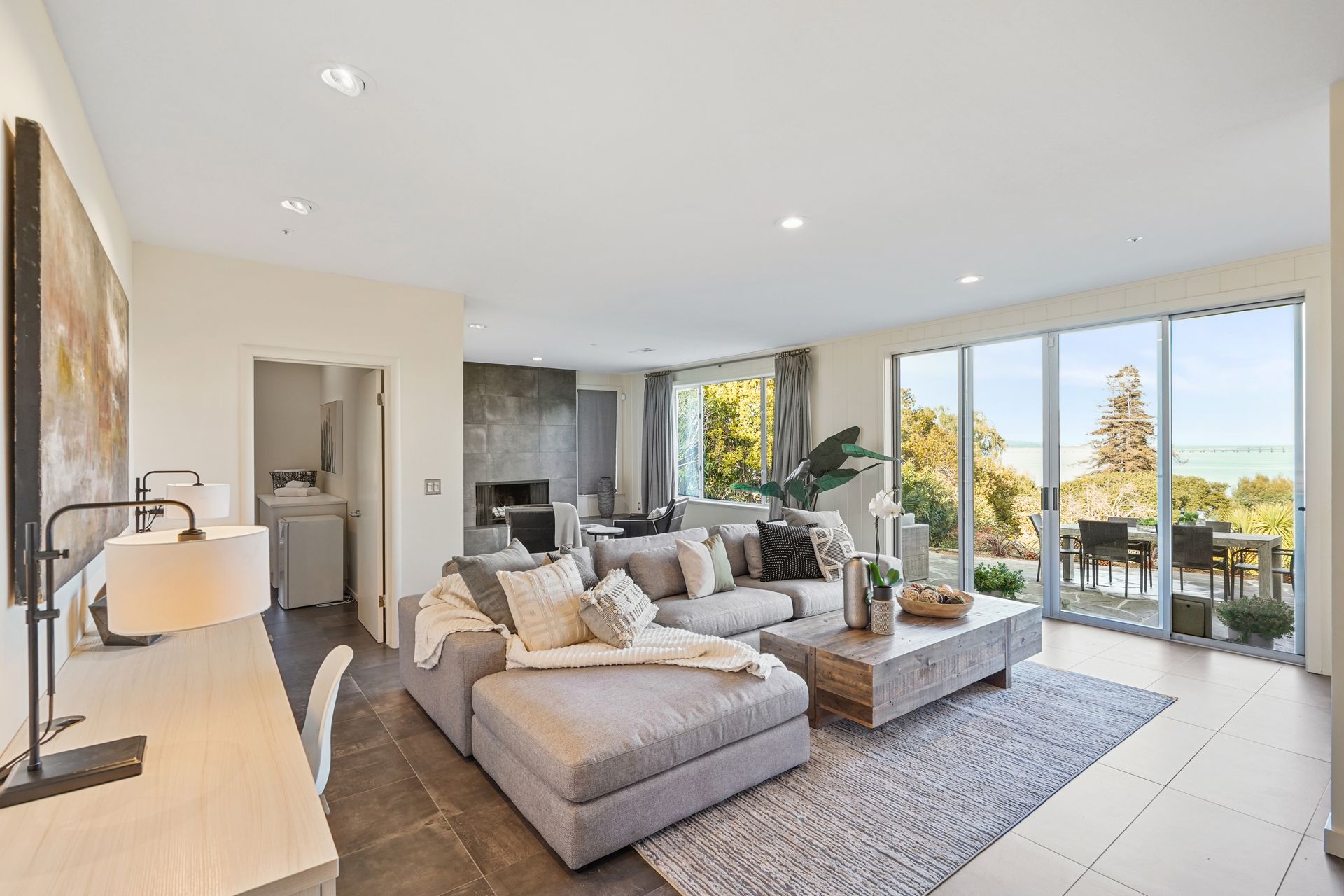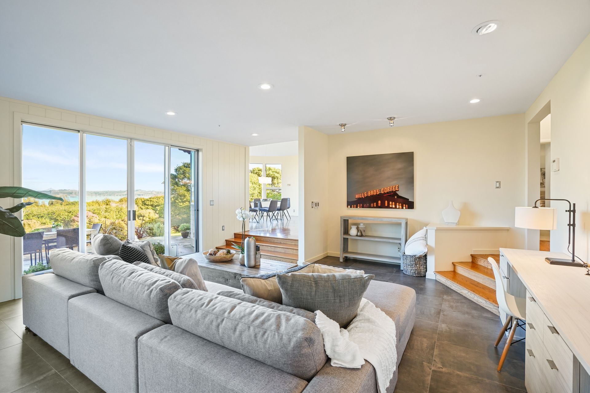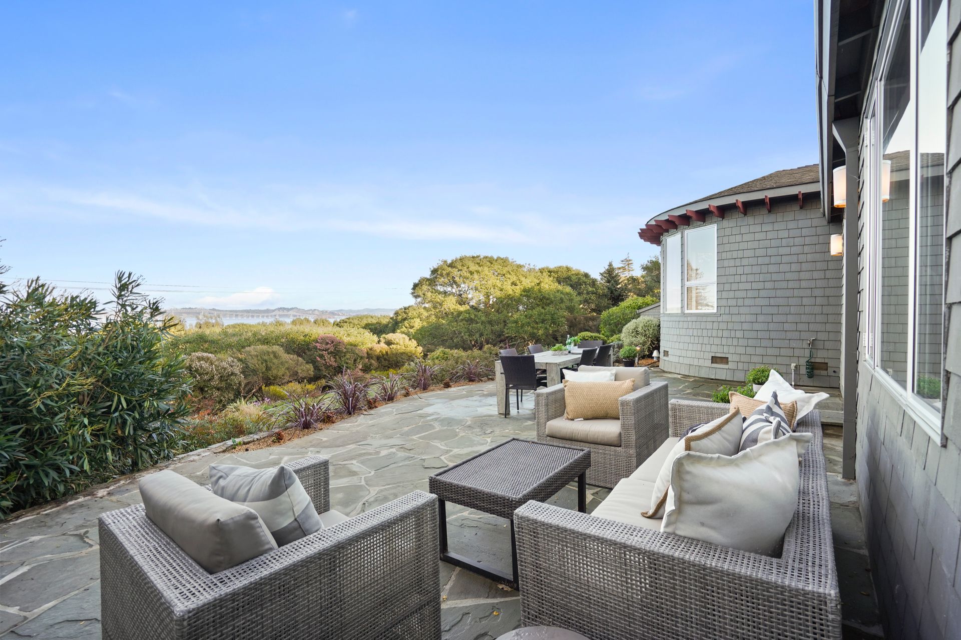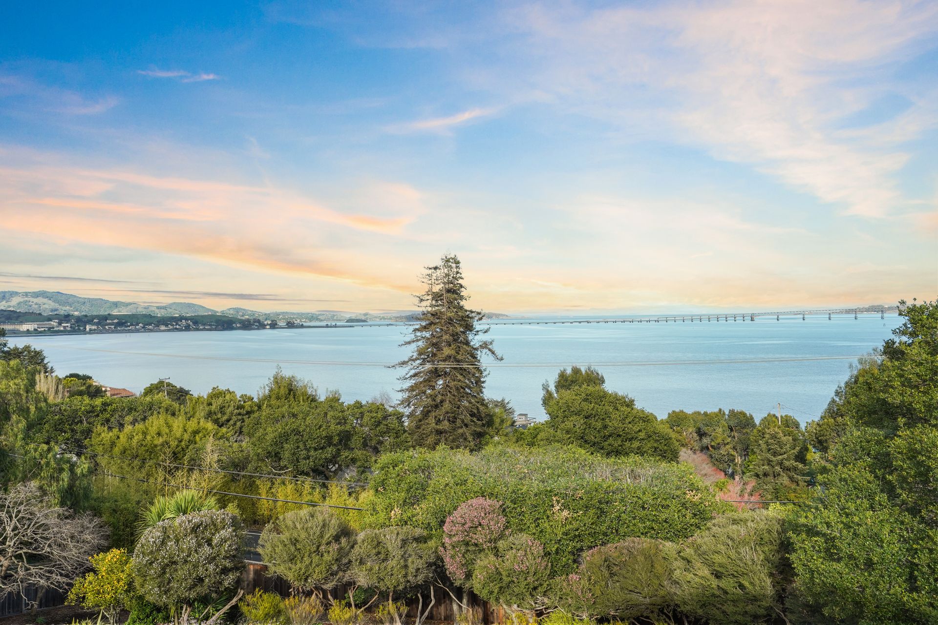 4925 Paradise Drive is a stunning contemporary home with the main living spaces featuring an open floor plan and vaulted ceilings. Multiple large windows offer extensive views of the bay and East Bay hills from the primary bedroom, living room and dining room. The large open kitchen features beautiful cabinetry and high-end appliances. The generous home office is large enough for two to easily share. The family room opens onto a patio overlooking a lawn, garden, and views. Property is nearly three-quarters of an acre, offering plenty of outdoor space and privacy.