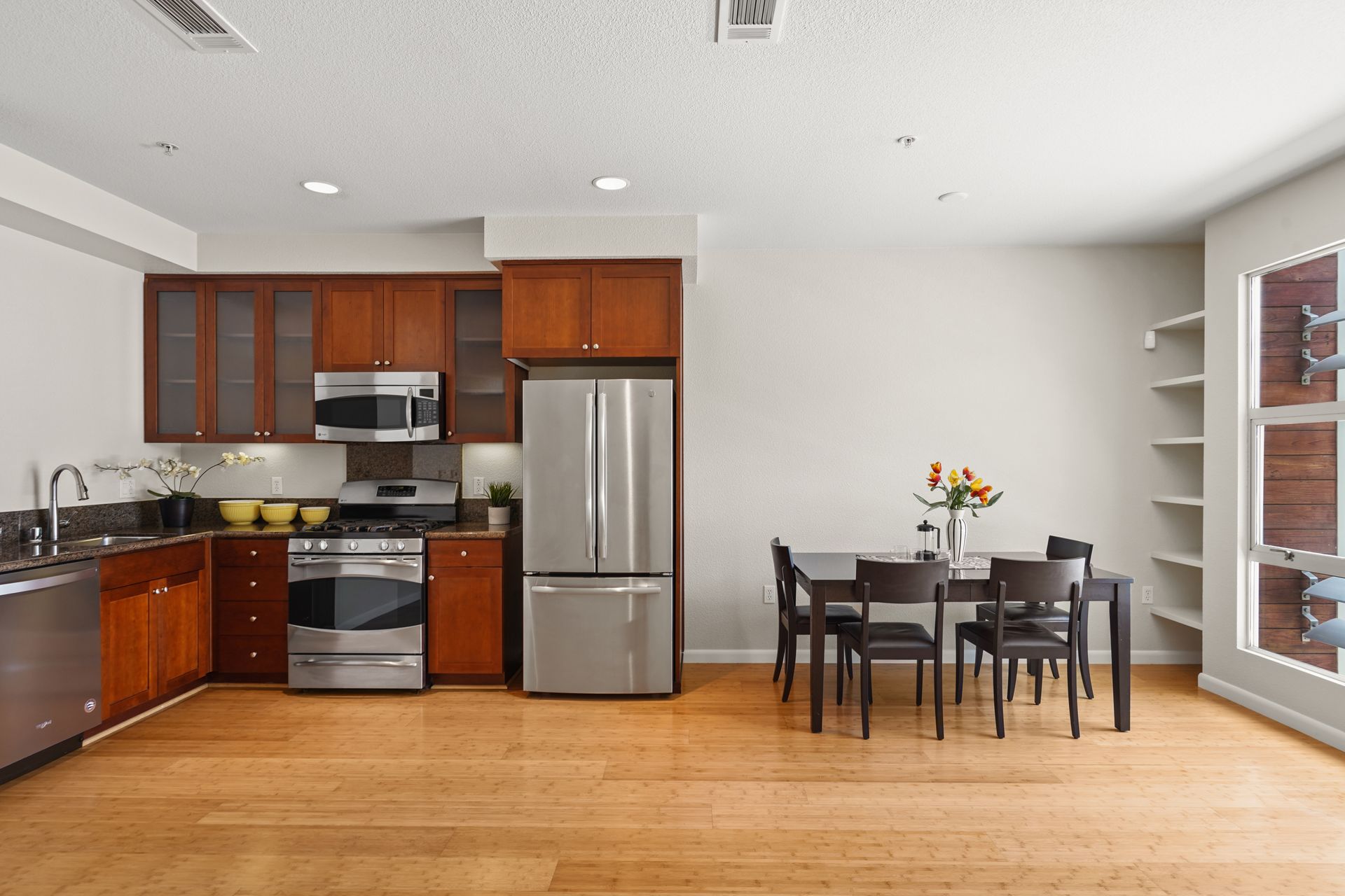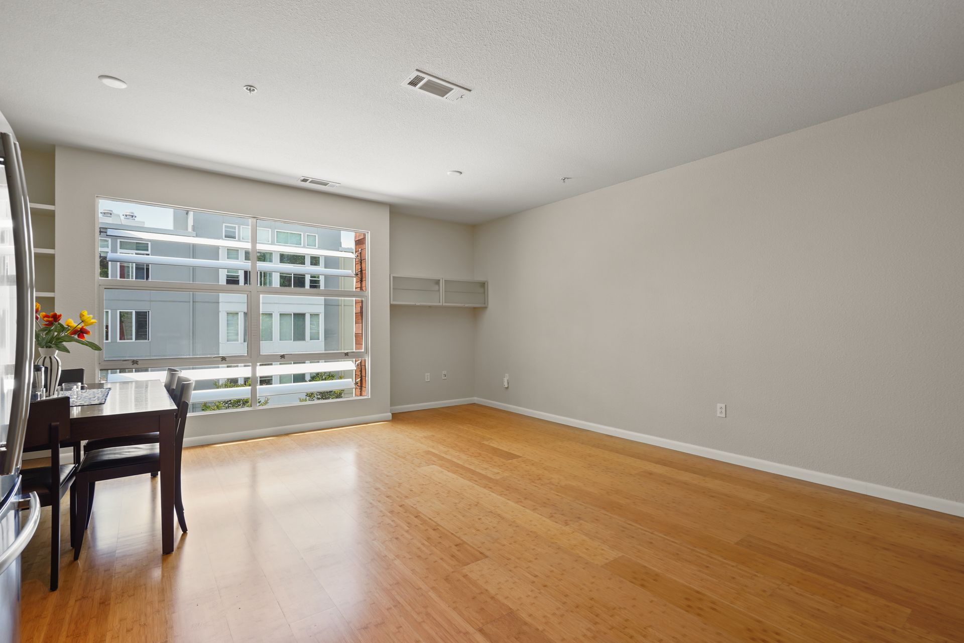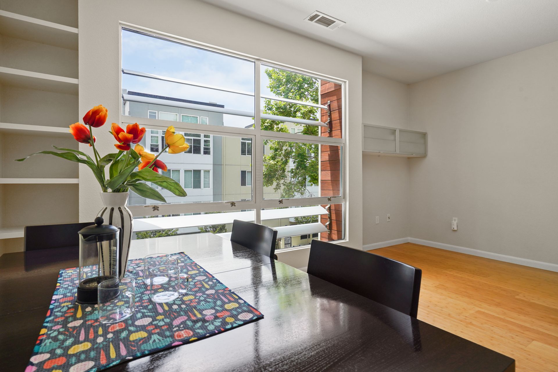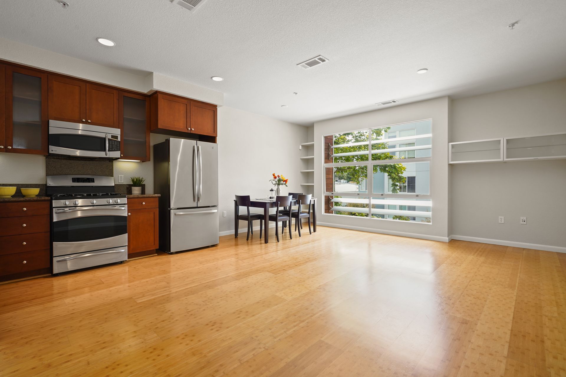 Welcome to this bright and sunny, modern Below Market Rate (BMR) condo in the desirable Glashaus building in the heart of Emeryville built in 2008. Tall, west-facing windows bathe the open floor plan living/kitchen area with light, featuring beautiful bamboo floors, cherry wood-stained cabinets, granite counters and stainless steel appliances. This unit has dual-pane windows, A/C, a full-sized washer/dryer and a walk-in bedroom closet. There is secured garage parking. Nearby are restaurants, cafes, a bakery, noodle shops, greenway, Public Market, Berkeley Bowl West and Trader Joes. A free shuttle to BART/Amtrak/Berkeley Bowl/throughout Emeryville stops in front. Also enjoy easy access to the freeway/AC Transit/SF Shuttle.