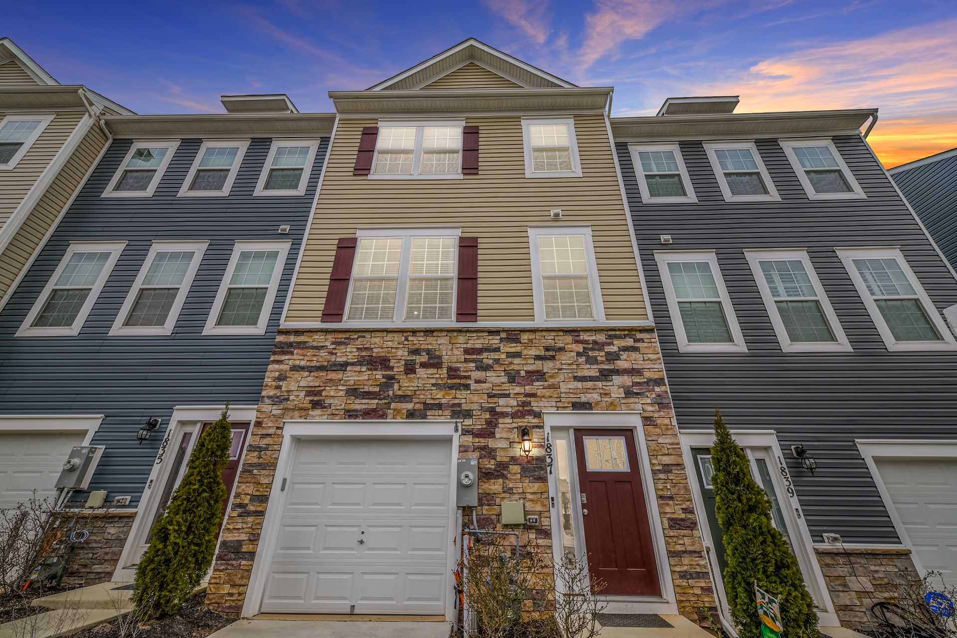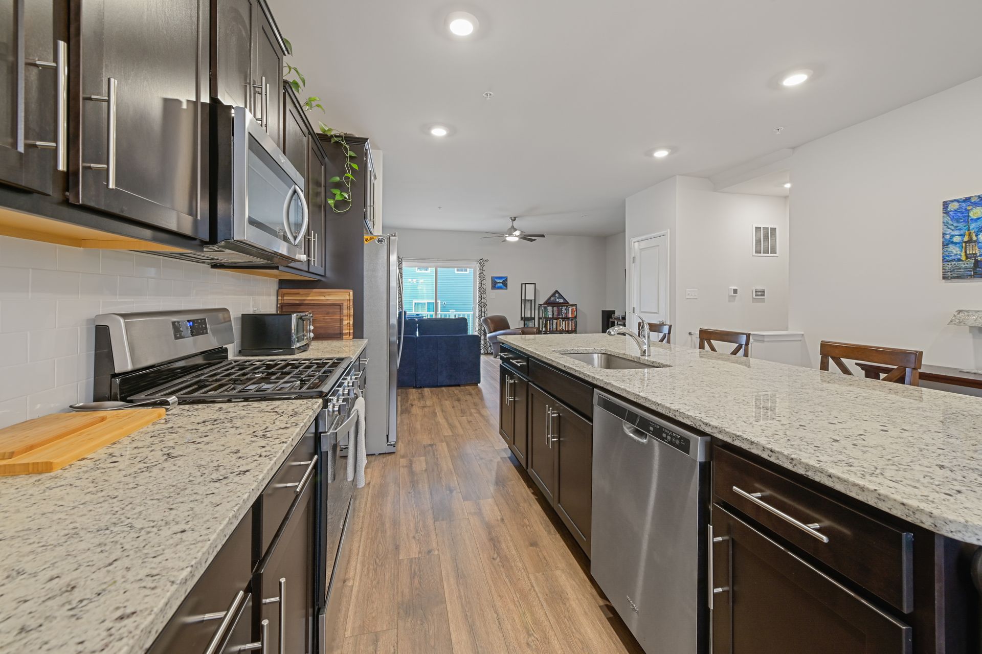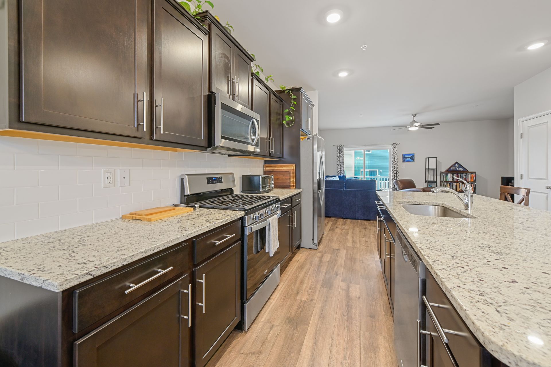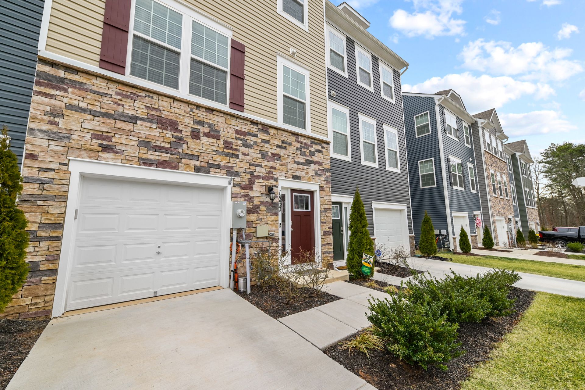 Luxurious townhome with a one car garage in the newer Odenton Town Center community! Over 2,200 square feet! Upgraded features throughout! Vinyl and stone siding! 9 foot ceilings! Neutral decor throughout! Spacious family room with recessed lighting and sliders to rear yard! Main floor features luxury vinyl plank flooring! Amazing gourmet kitchen with 42-inch cabinets, a pantry, recessed lighting, stainless-steel appliances, gas cooking, granite countertops and tile backsplash! Oversized island with plenty of room for entertaining and pendant lighting! Separate dining area next to the kitchen! Large living room with sliders to the custom deck! Half bath with a pedestal sink! Upper level includes a huge primary bedroom with a ceiling fan, walk-in closet and additional shelving! Primary bath features a custom walk-in shower and ceramic tile flooring! Additional second and third bedrooms upstairs! Hall bath with granite vanity top, tub/shower combination and ceramic tile flooring! Reinforced closets! Lots of natural light throughout! Easy access to Fort Meade, NSA, major highways, Marc station, BWI airport, trails, shopping, dining, Baltimore, Annapolis and DC! Immaculate inside and out!