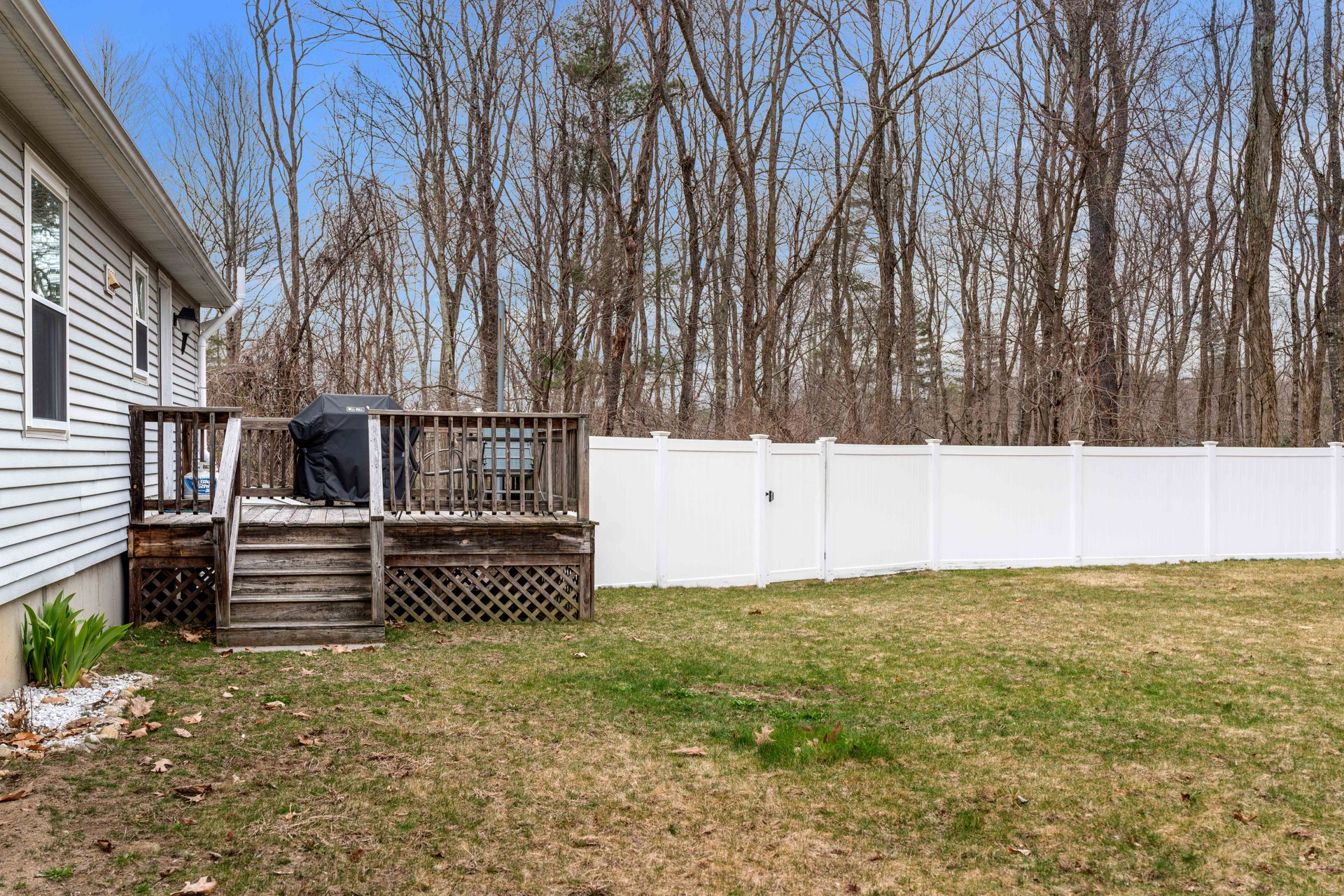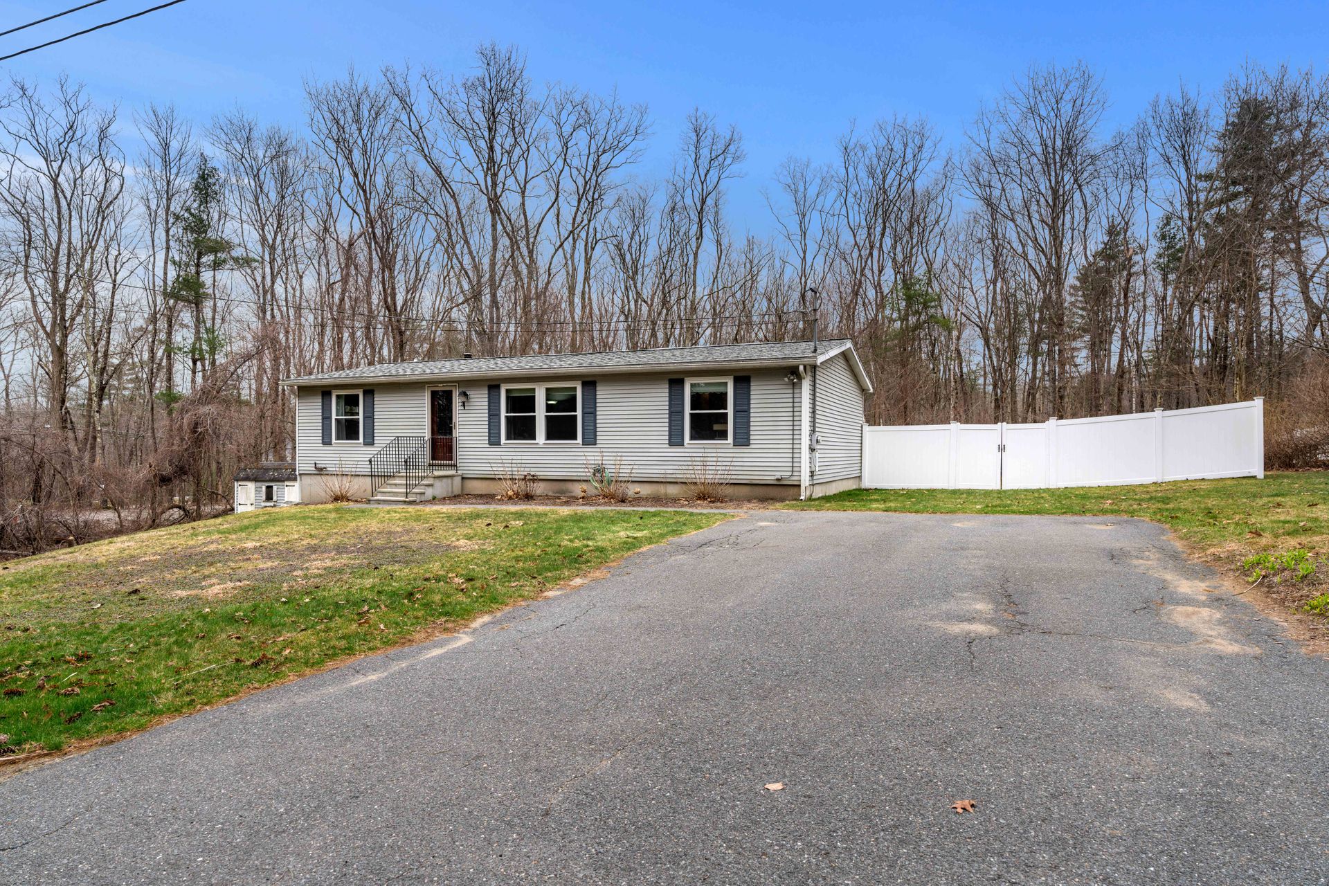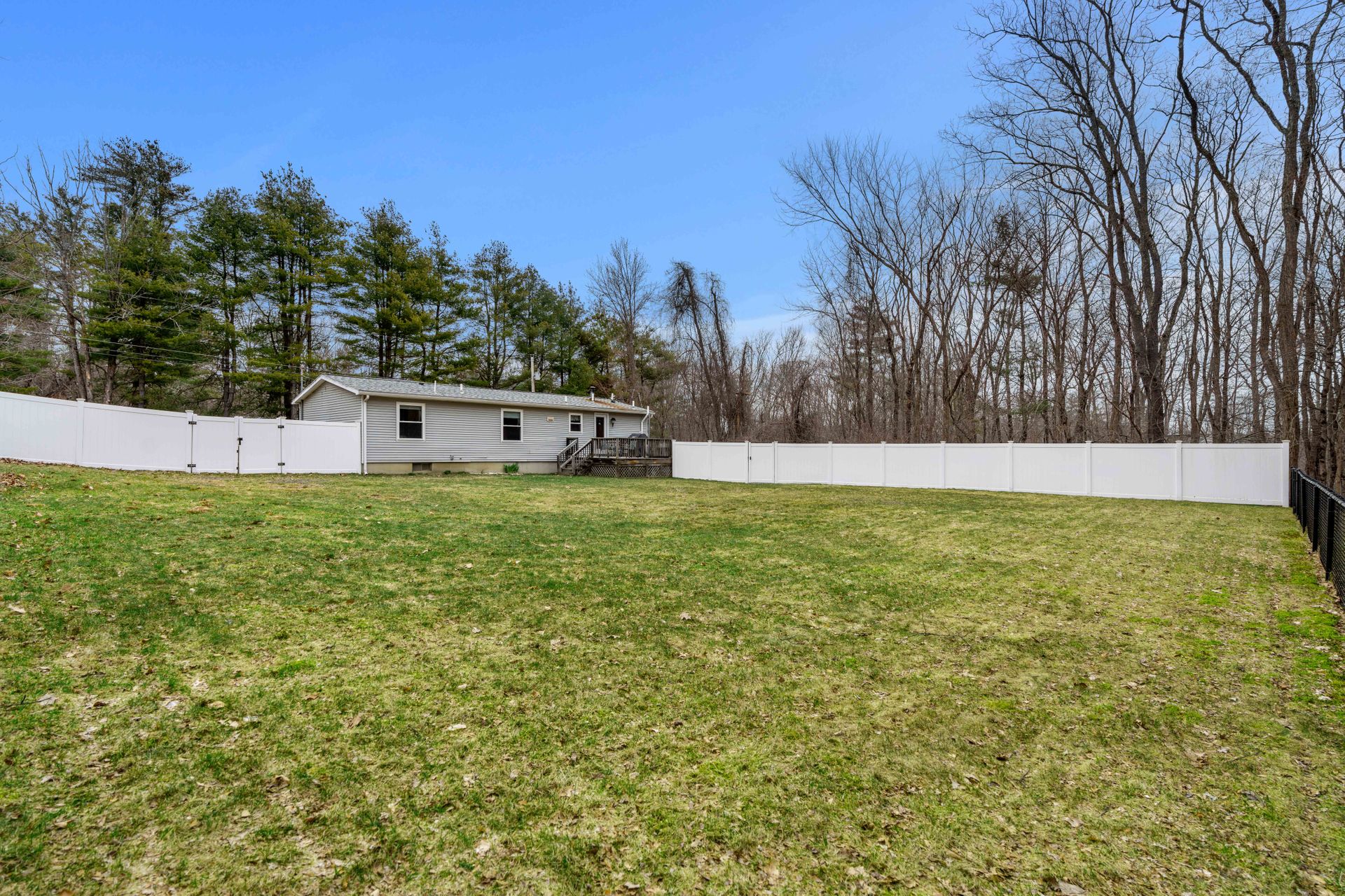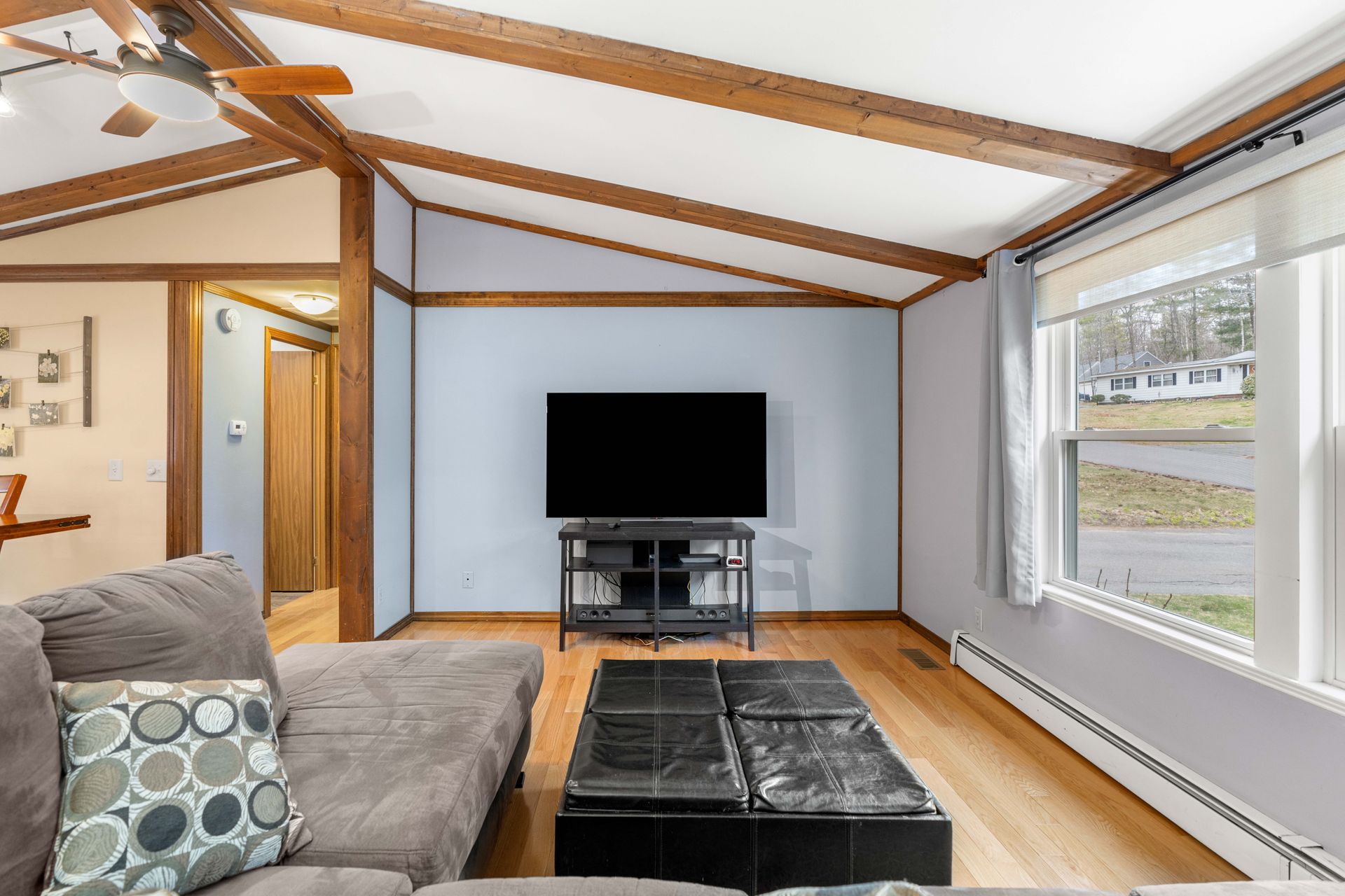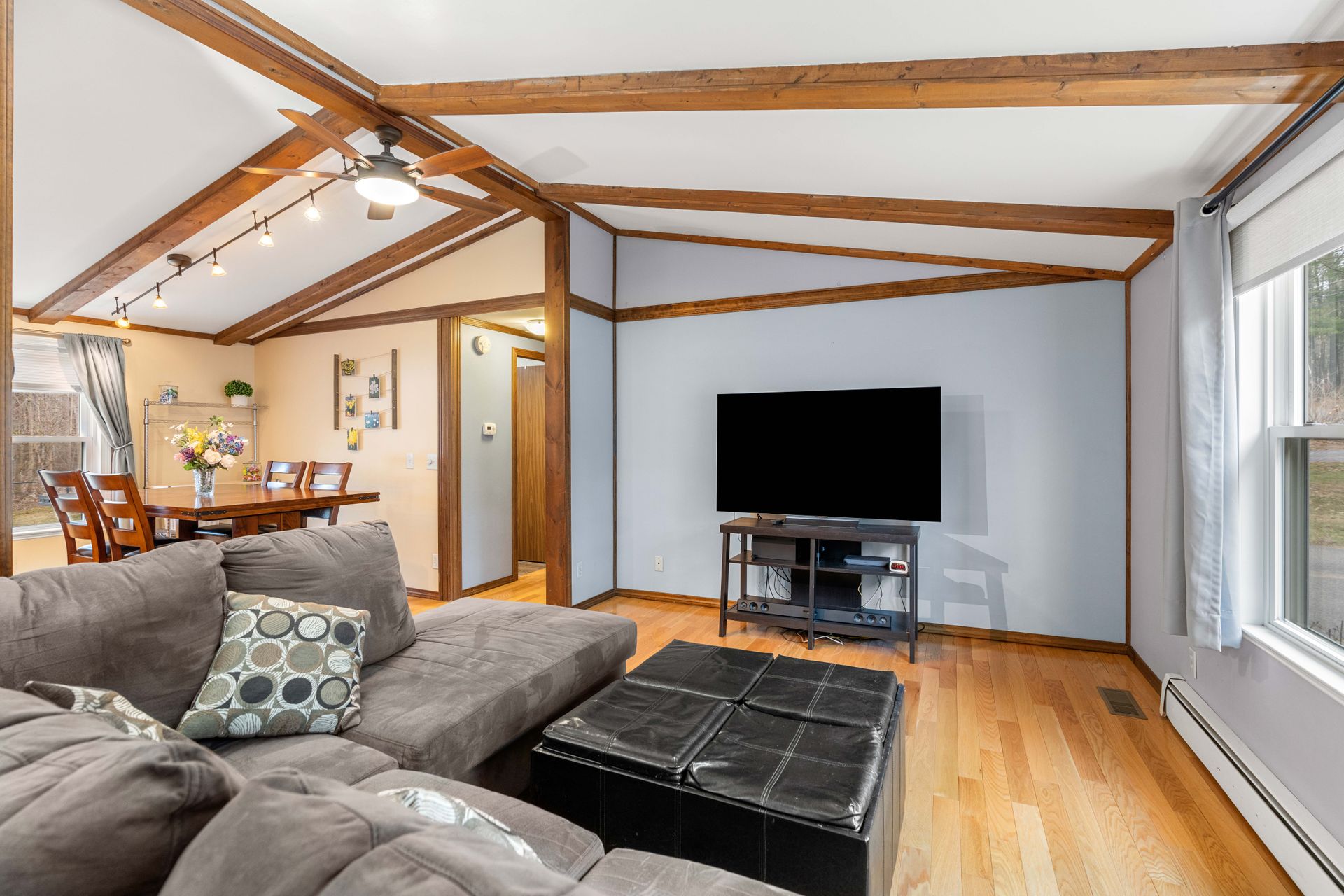 Charming single-level home with the following great features: Open floor plan, layout provides a spacious feel and facilitates easy movement between rooms. The vaulted ceilings with exposed beams add character and visual interest to the living space. The kitchen is modernized with ample cabinetry, stainless steel appliances, and granite countertops, offering functionality and style. The bathrooms have been renovated. The hardwood floors throughout most of the home provide durability, elegance, and easy maintenance. The basement offers plenty of storage space and an additional finished room, which could serve various purposes such as a home office, recreation room, or guest bedroom. Outside you will find the deck that provides space for relaxation and entertainment while overlooking the fenced-in backyard. The home abuts Conservation land and trails, providing opportunities for outdoor activities and enjoyment. Phillips Pond is close and provides further outdoor recreational opportunities and scenic views.