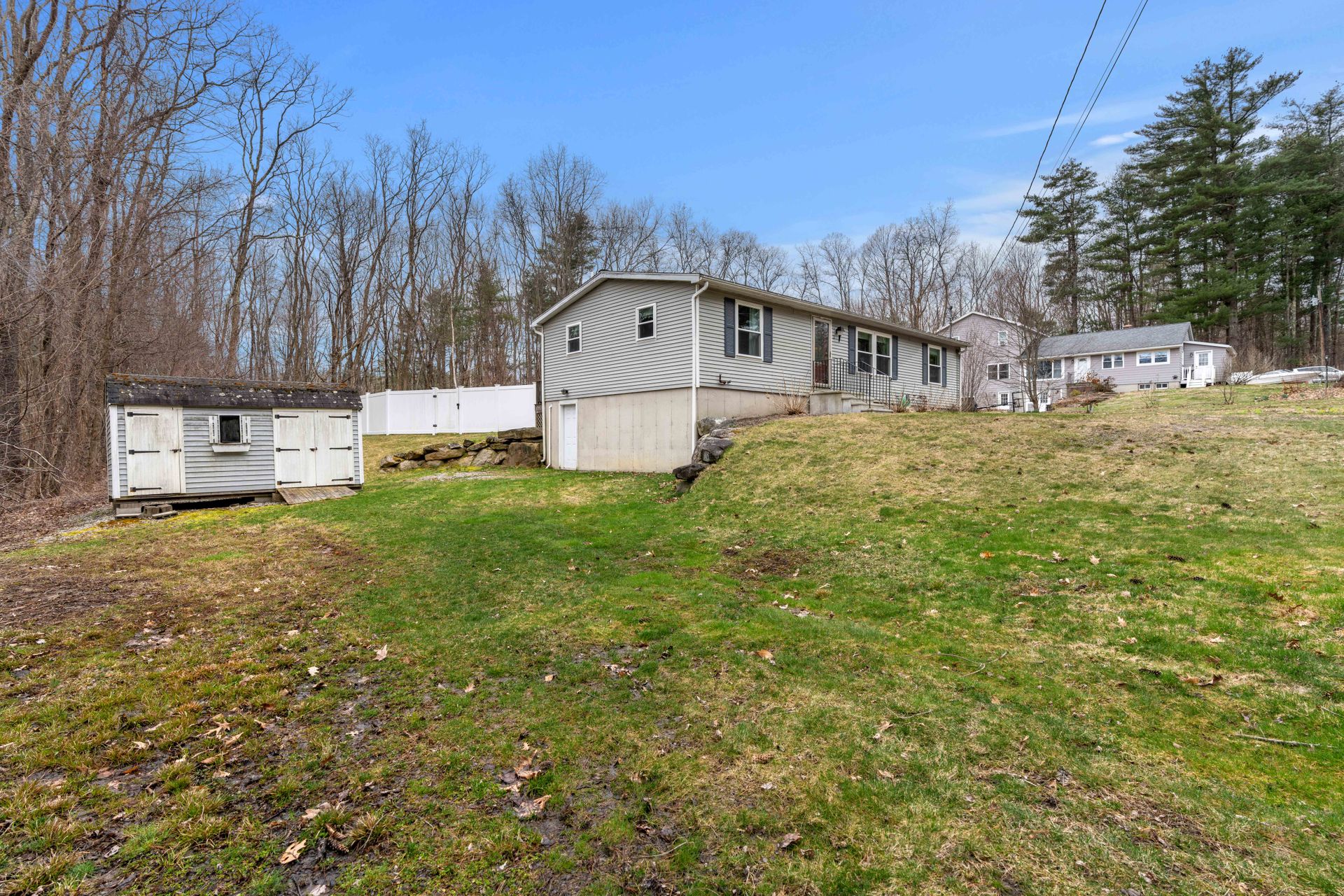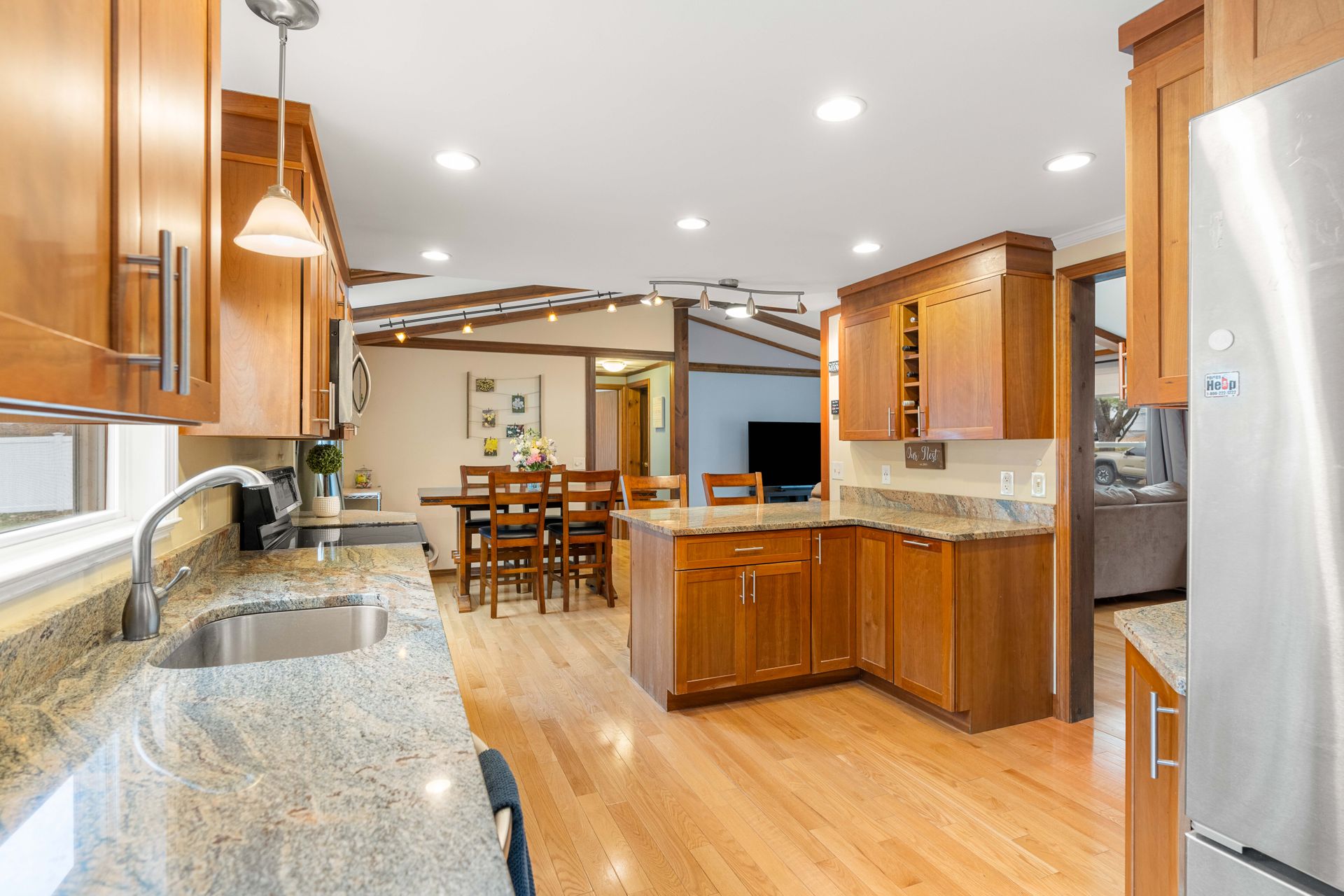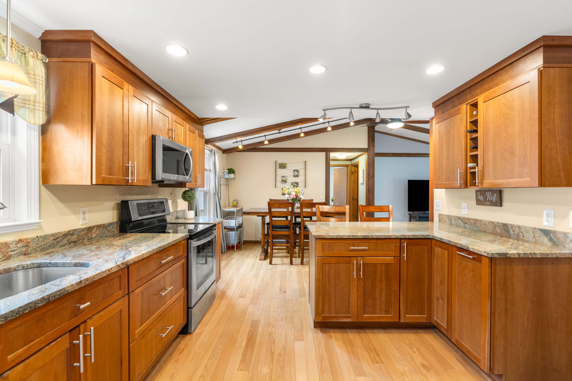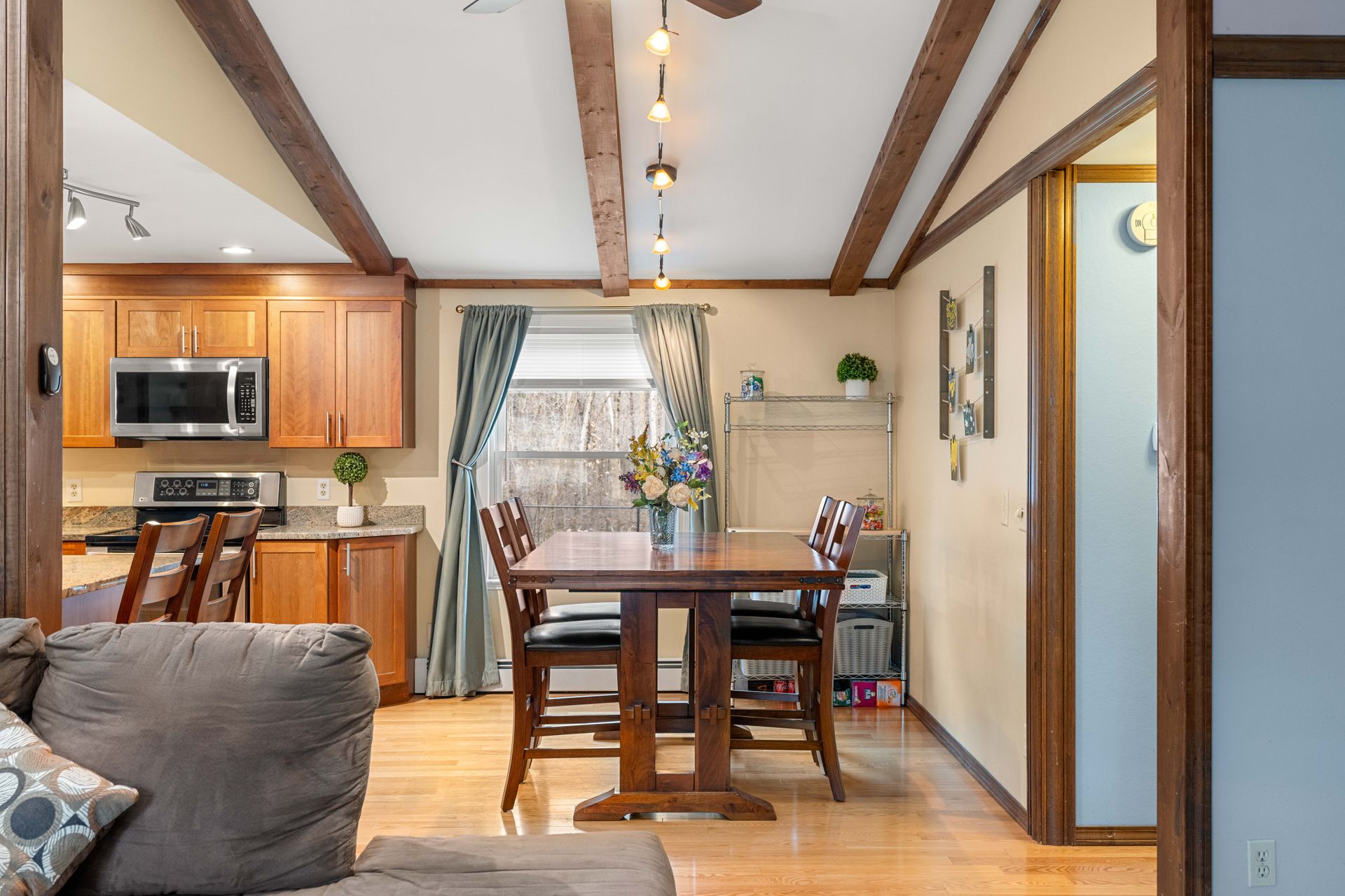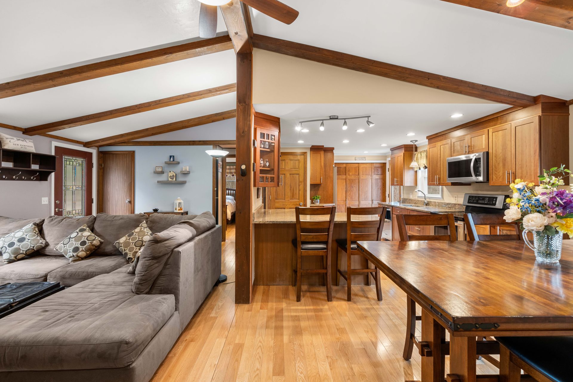 Charming single-level home with the following great features: Open floor plan, layout provides a spacious feel and facilitates easy movement between rooms. The vaulted ceilings with exposed beams add character and visual interest to the living space. The kitchen is modernized with ample cabinetry, stainless steel appliances, and granite countertops, offering functionality and style. The bathrooms have been renovated. The hardwood floors throughout most of the home provide durability, elegance, and easy maintenance. The basement offers plenty of storage space and an additional finished room, which could serve various purposes such as a home office, recreation room, or guest bedroom. Outside you will find the deck that provides space for relaxation and entertainment while overlooking the fenced-in backyard. The home abuts Conservation land and trails, providing opportunities for outdoor activities and enjoyment. Phillips Pond is close and provides further outdoor recreational opportunities and scenic views.