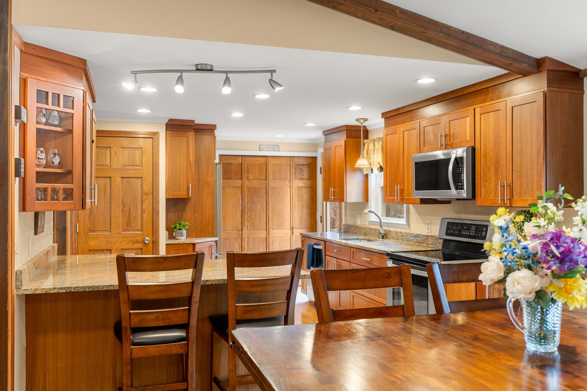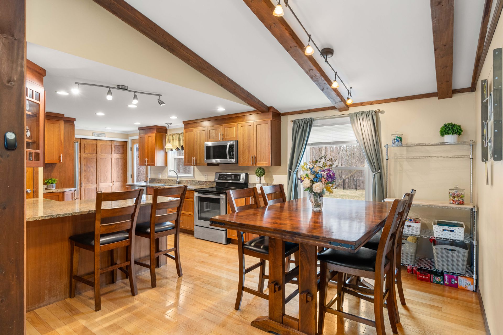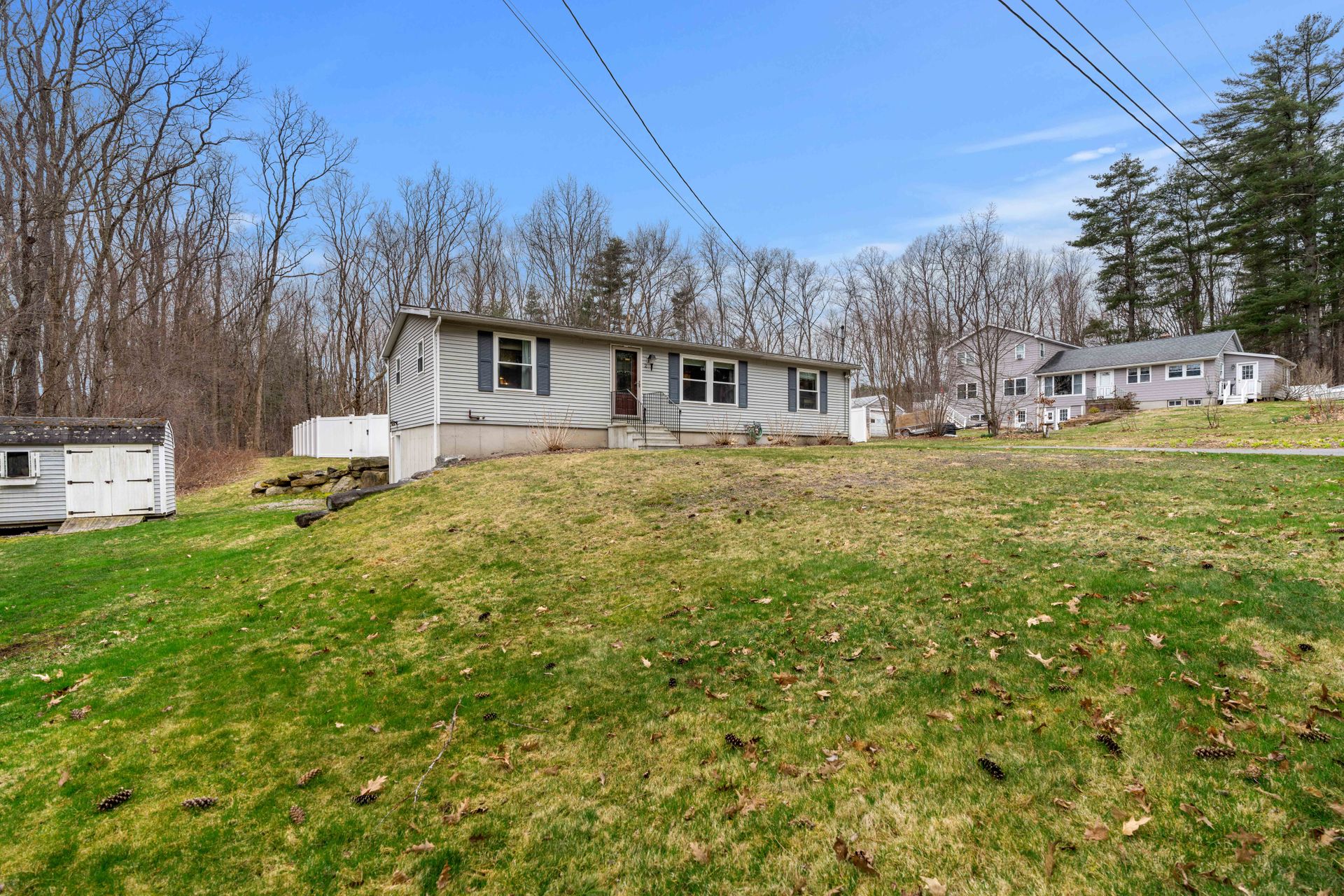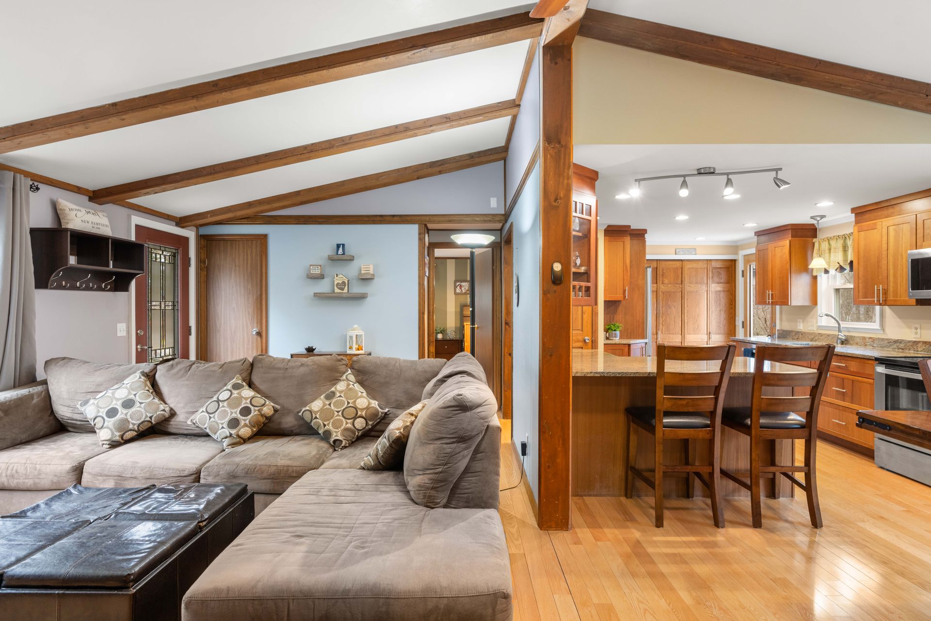 Charming single-level home with the following great features: Open floor plan, layout provides a spacious feel and facilitates easy movement between rooms. The vaulted ceilings with exposed beams add character and visual interest to the living space. The kitchen is modernized with ample cabinetry, stainless steel appliances, and granite countertops, offering functionality and style. The bathrooms have been renovated. The hardwood floors throughout most of the home provide durability, elegance, and easy maintenance. The basement offers plenty of storage space and an additional finished room, which could serve various purposes such as a home office, recreation room, or guest bedroom. Outside you will find the deck that provides space for relaxation and entertainment while overlooking the fenced-in backyard. The home abuts Conservation land and trails, providing opportunities for outdoor activities and enjoyment. Phillips Pond is close and provides further outdoor recreational opportunities and scenic views.