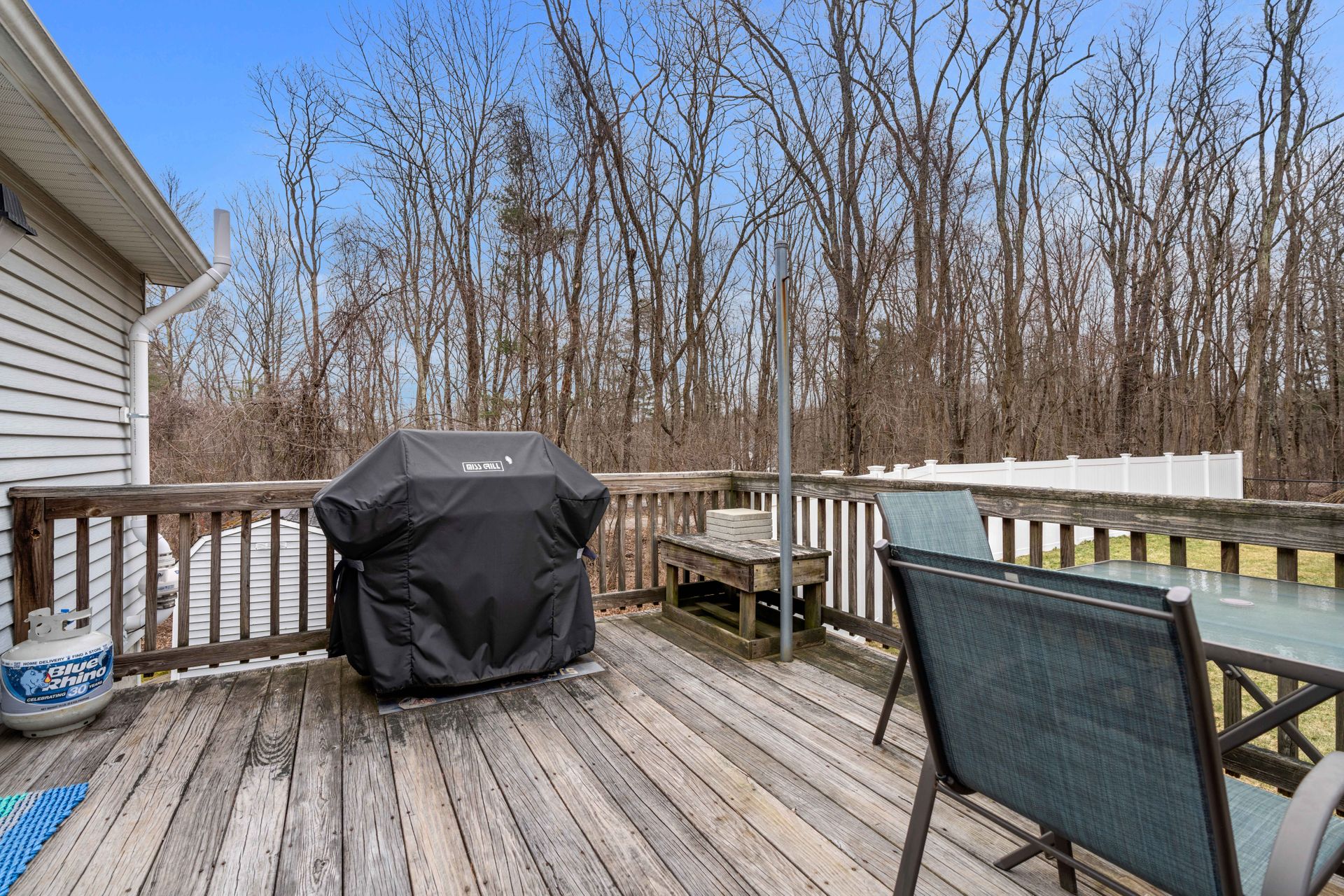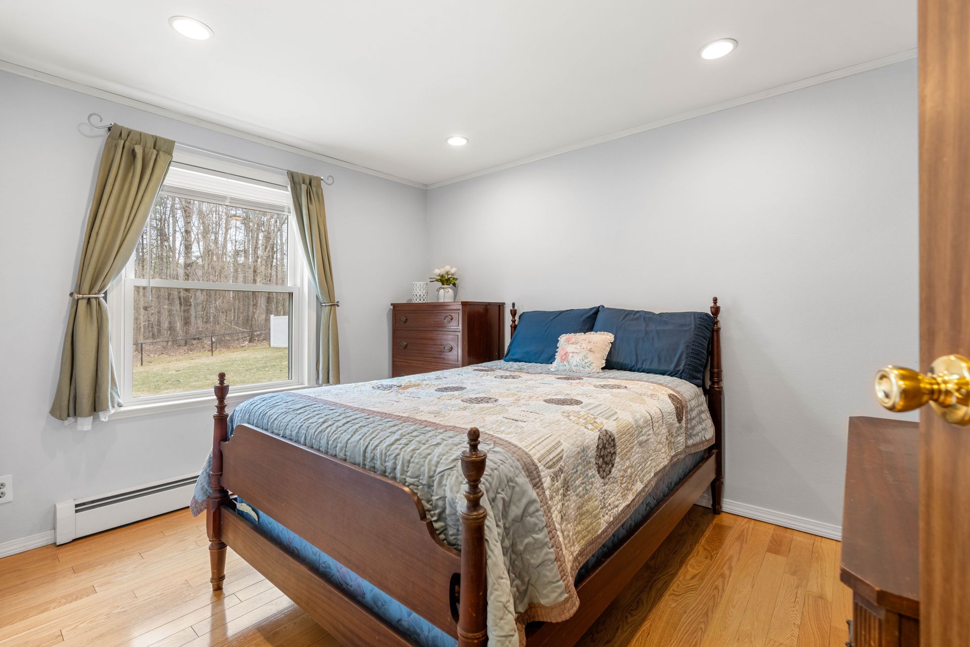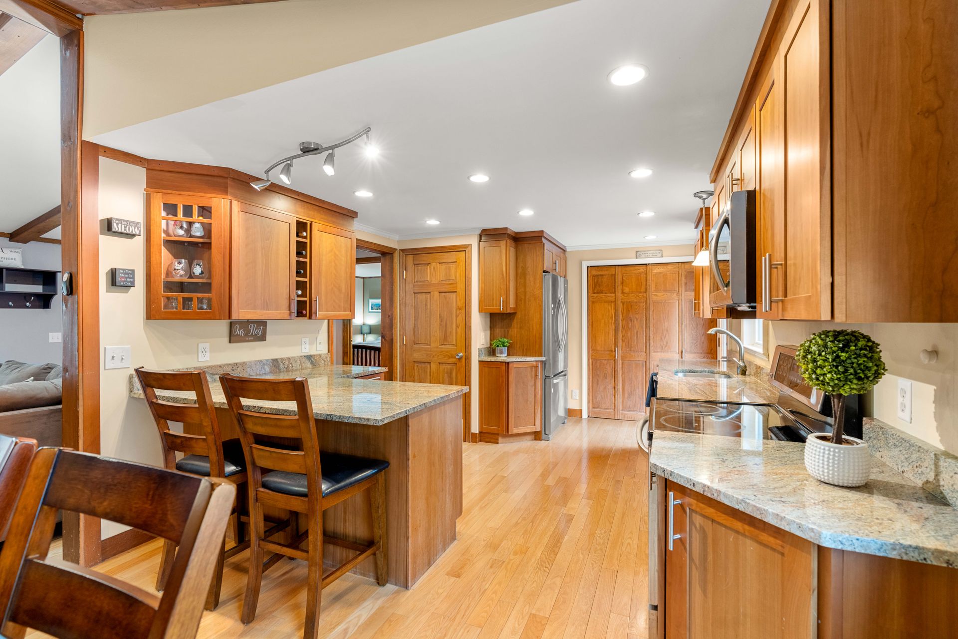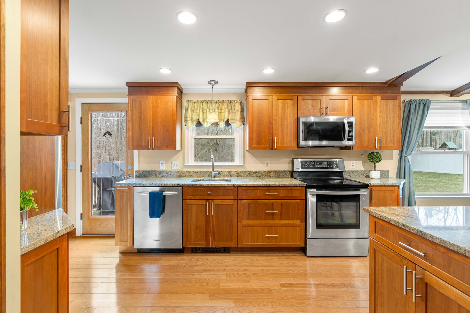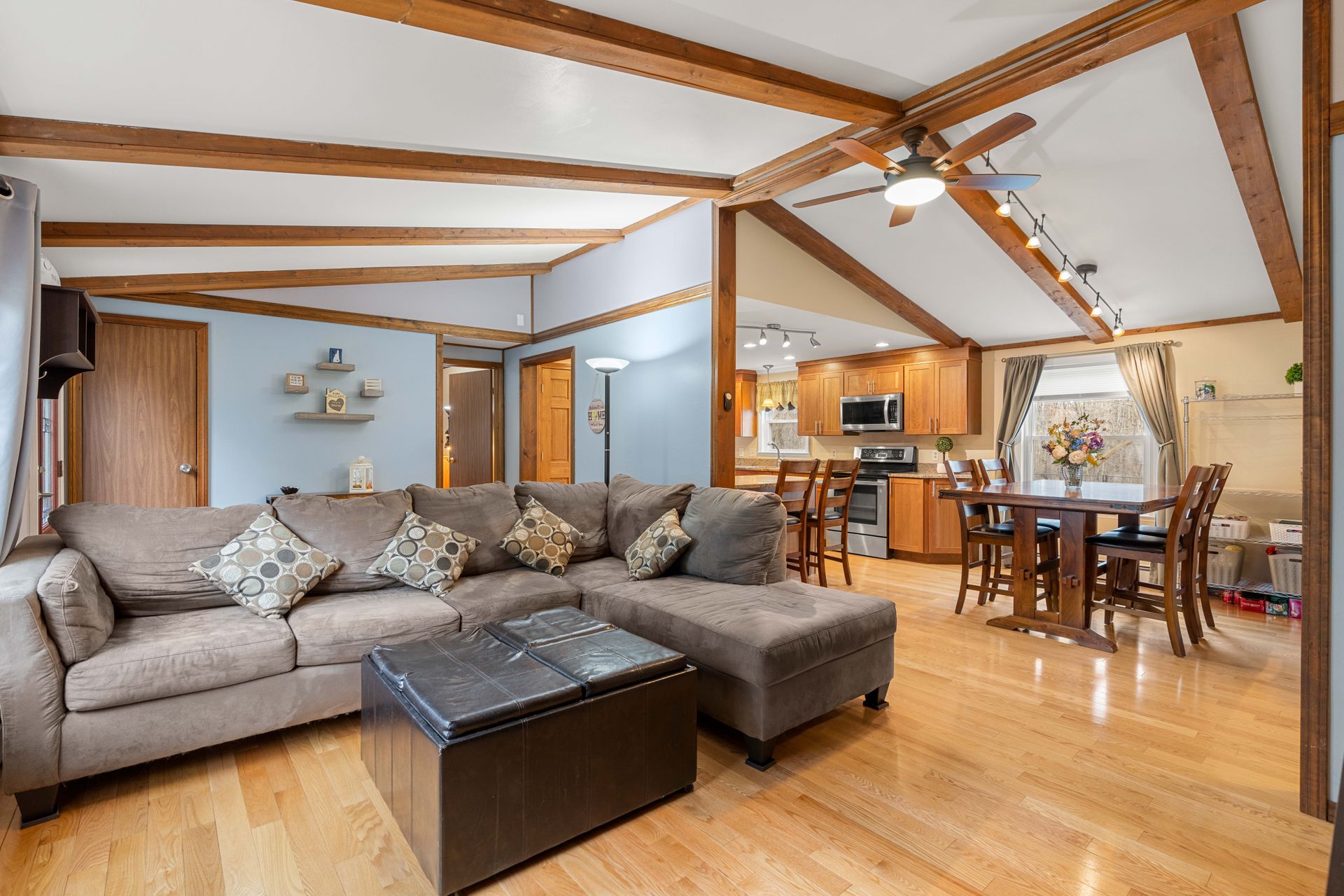 Charming single-level home with the following great features: Open floor plan, layout provides a spacious feel and facilitates easy movement between rooms. The vaulted ceilings with exposed beams add character and visual interest to the living space. The kitchen is modernized with ample cabinetry, stainless steel appliances, and granite countertops, offering functionality and style. The bathrooms have been renovated. The hardwood floors throughout most of the home provide durability, elegance, and easy maintenance. The basement offers plenty of storage space and an additional finished room, which could serve various purposes such as a home office, recreation room, or guest bedroom. Outside you will find the deck that provides space for relaxation and entertainment while overlooking the fenced-in backyard. The home abuts Conservation land and trails, providing opportunities for outdoor activities and enjoyment. Phillips Pond is close and provides further outdoor recreational opportunities and scenic views.