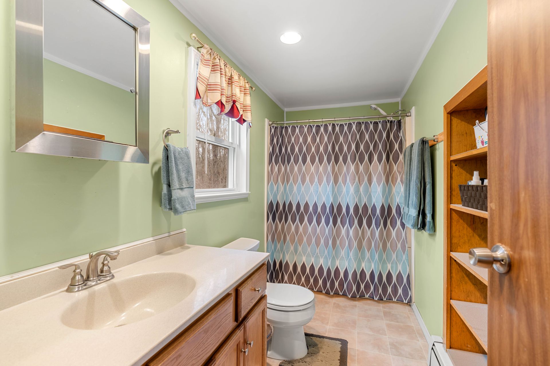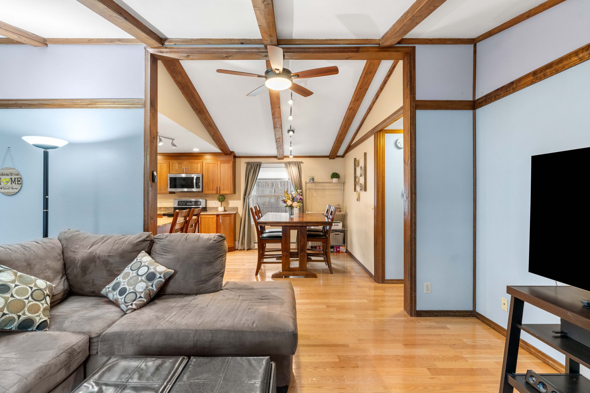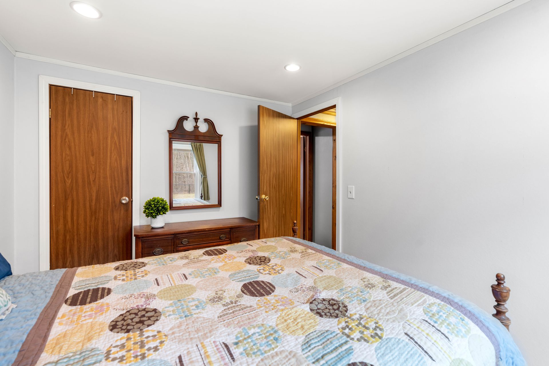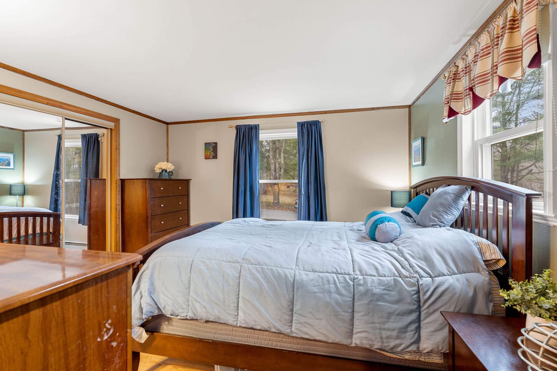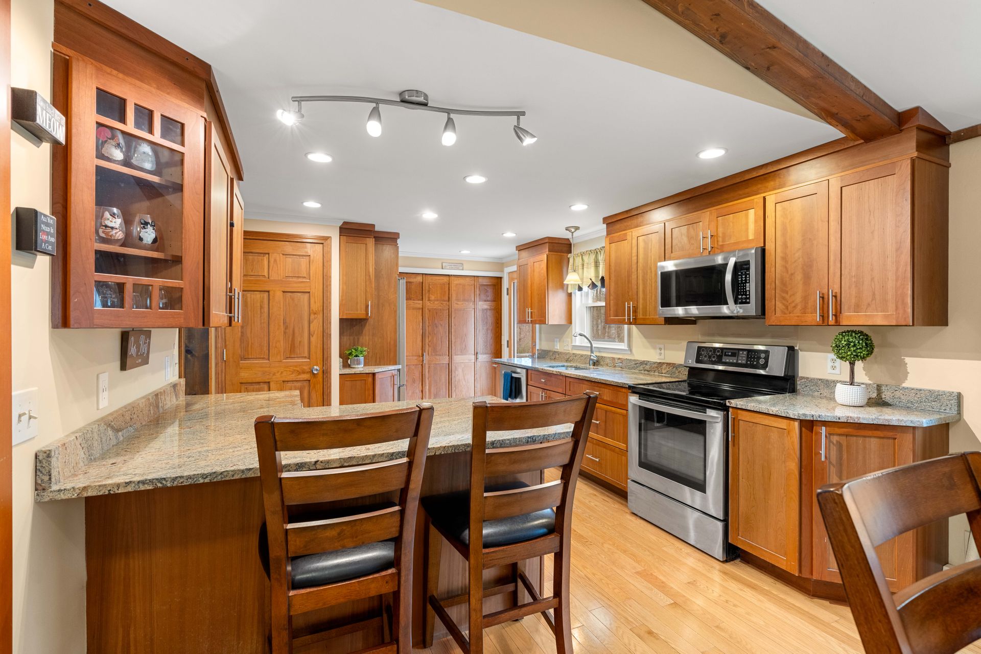 Charming single-level home with the following great features: Open floor plan, layout provides a spacious feel and facilitates easy movement between rooms. The vaulted ceilings with exposed beams add character and visual interest to the living space. The kitchen is modernized with ample cabinetry, stainless steel appliances, and granite countertops, offering functionality and style. The bathrooms have been renovated. The hardwood floors throughout most of the home provide durability, elegance, and easy maintenance. The basement offers plenty of storage space and an additional finished room, which could serve various purposes such as a home office, recreation room, or guest bedroom. Outside you will find the deck that provides space for relaxation and entertainment while overlooking the fenced-in backyard. The home abuts Conservation land and trails, providing opportunities for outdoor activities and enjoyment. Phillips Pond is close and provides further outdoor recreational opportunities and scenic views.