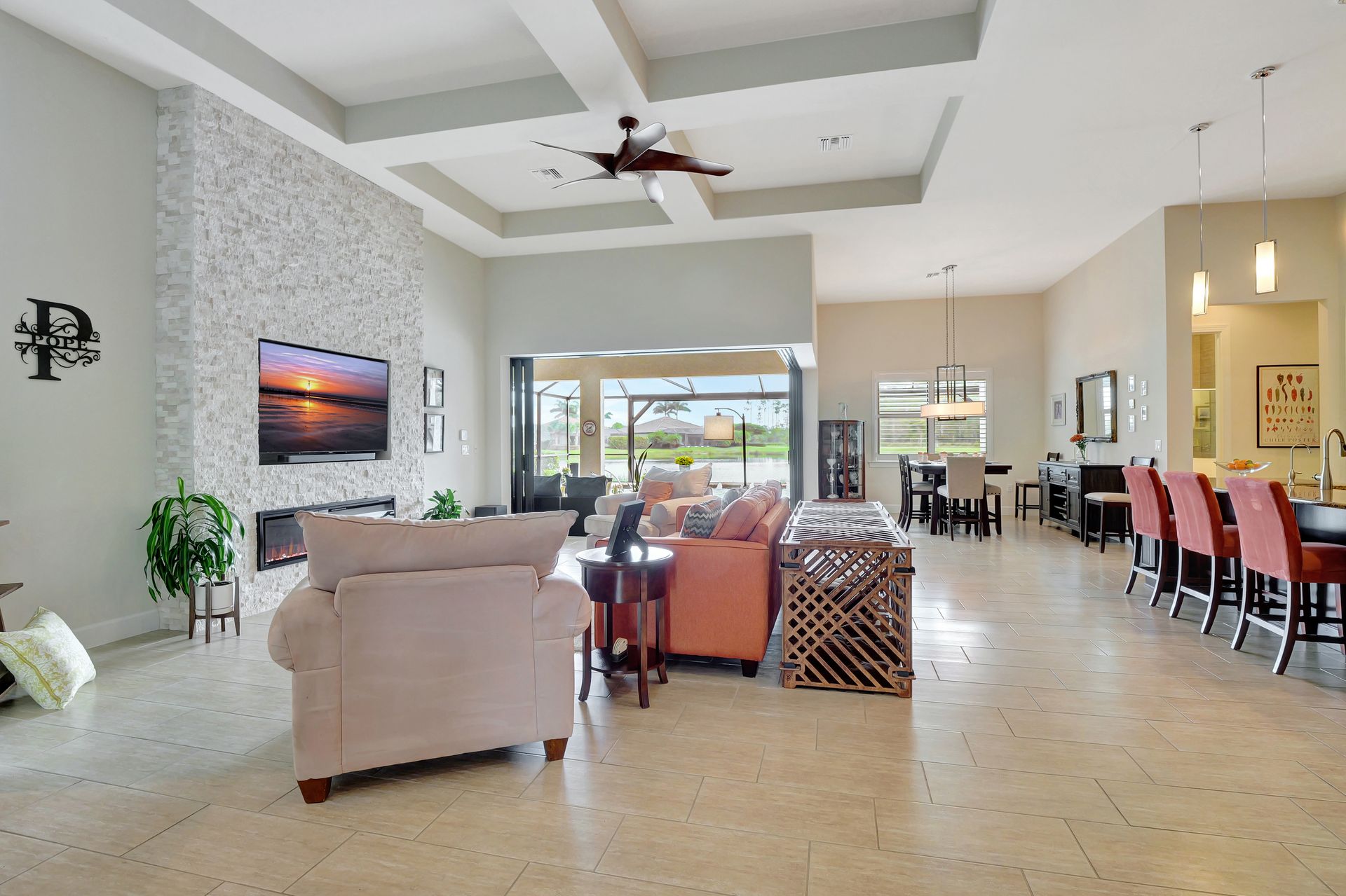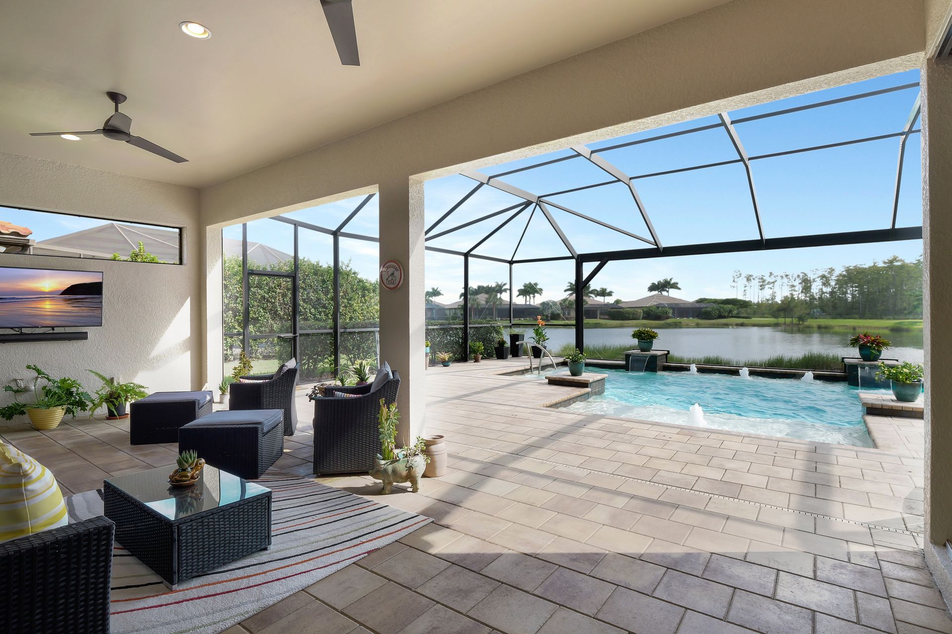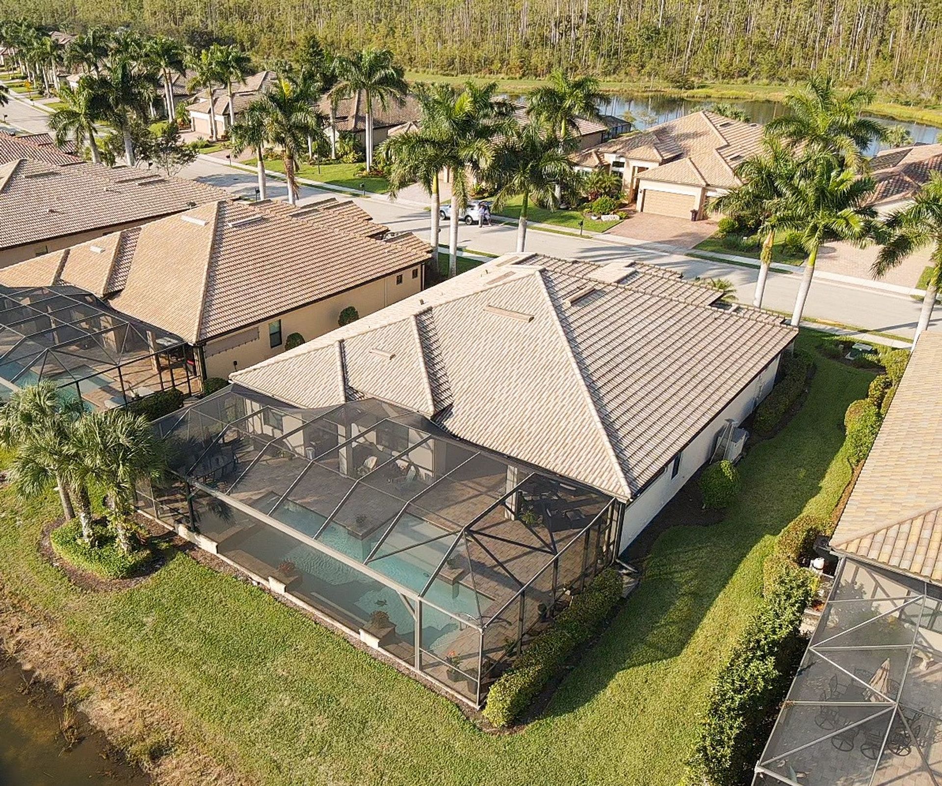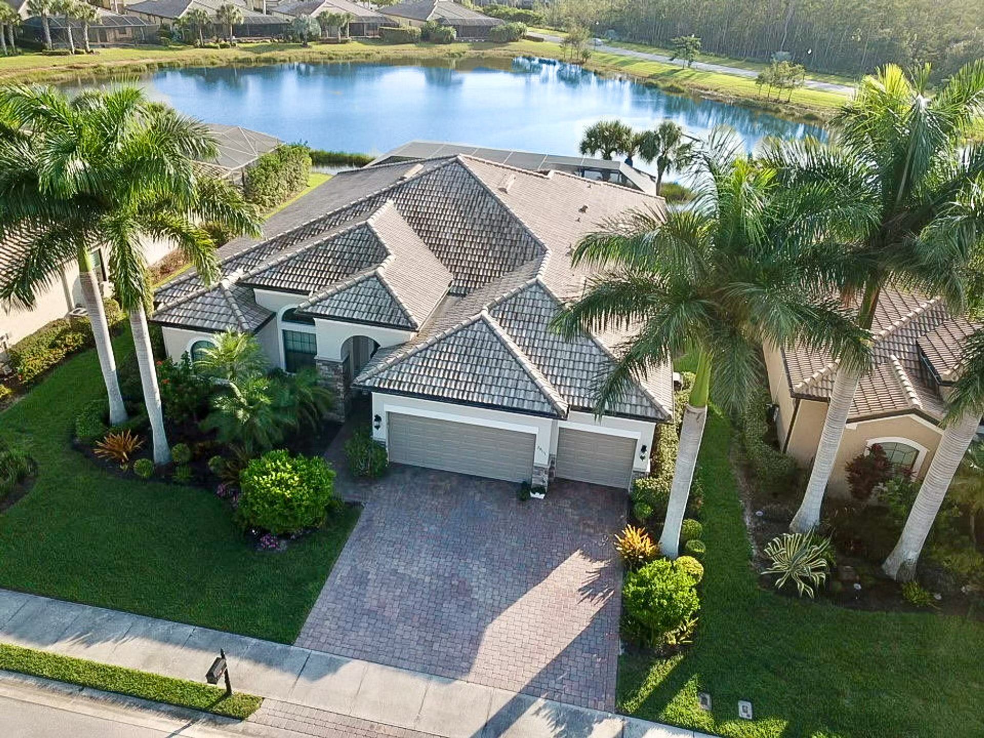Tucked inside the 'resort style' gated community - 'Preserve At Corkscrew'! Impressive the moment you pull up and see the brand-new exterior paint and lush tropical landscaping! 3,078 sq ft under air and a total of almost 6,000 sq ft total of living/entertaining space. The open floor plan welcomes you with trayed volume ceilings and instant 'water views' of the gleaming lake. Indoor/Outdoor intermingle the gathering spaces with disappearing zero-corner sliding glass doors inviting you to the covered, panoramic screened lanai area (plumbed for an outdoor kitchen). The outdoor oasis boasts an expansive, salt-water pool with a heated spa. Relax in the tranquility of the bubblers and waterfalls - all with views of the lake and wildlife. Four bedrooms, two home offices/dens and three full baths (including a pool bath). Double French doors open to the fabulous primary retreat offering (2) custom closets, a spa-like bath (with separate tub and shower) and glass doors to the pool. The three-car garage has custom storage and an epoxy-coated floor. Located in the Estates section on a low-traffic dead-end. Amenities included: resort-style pool, pickleball, tennis, fitness, outdoor fireplace and more. No flood insurance. Close to RSW airport, Hertz Arena, open-air shopping/dining, I-75, golf and beaches.