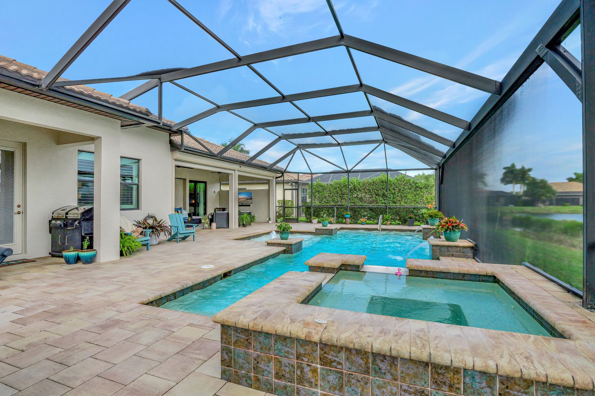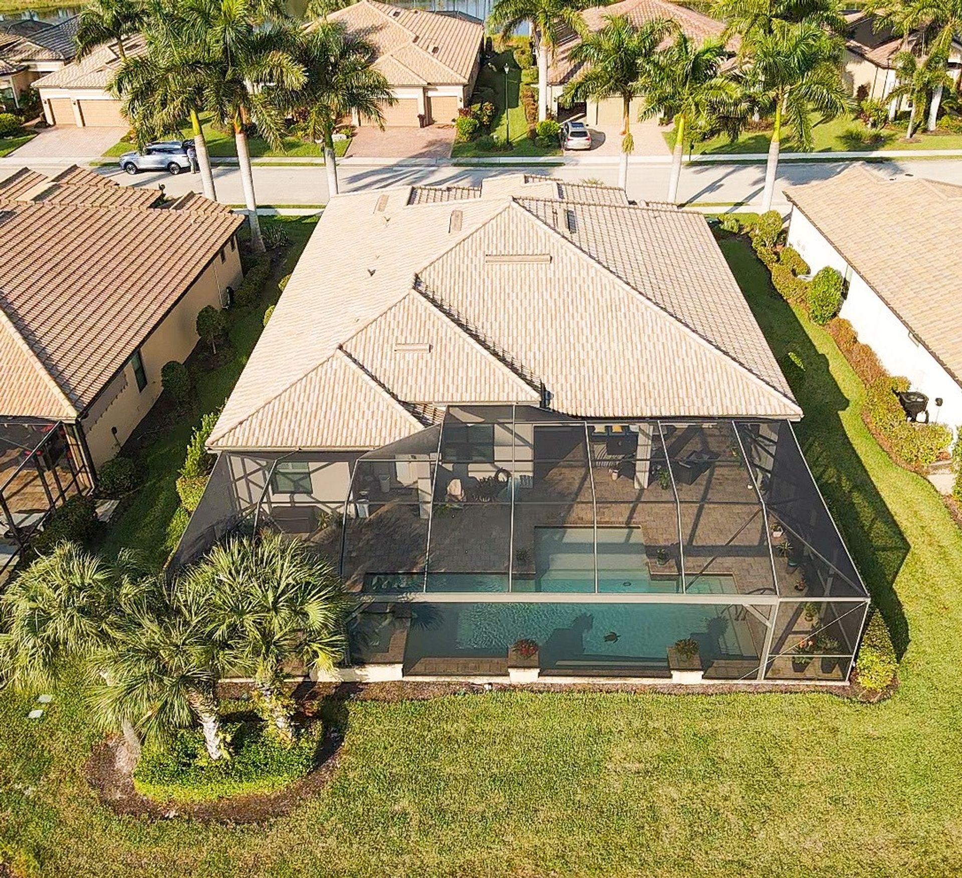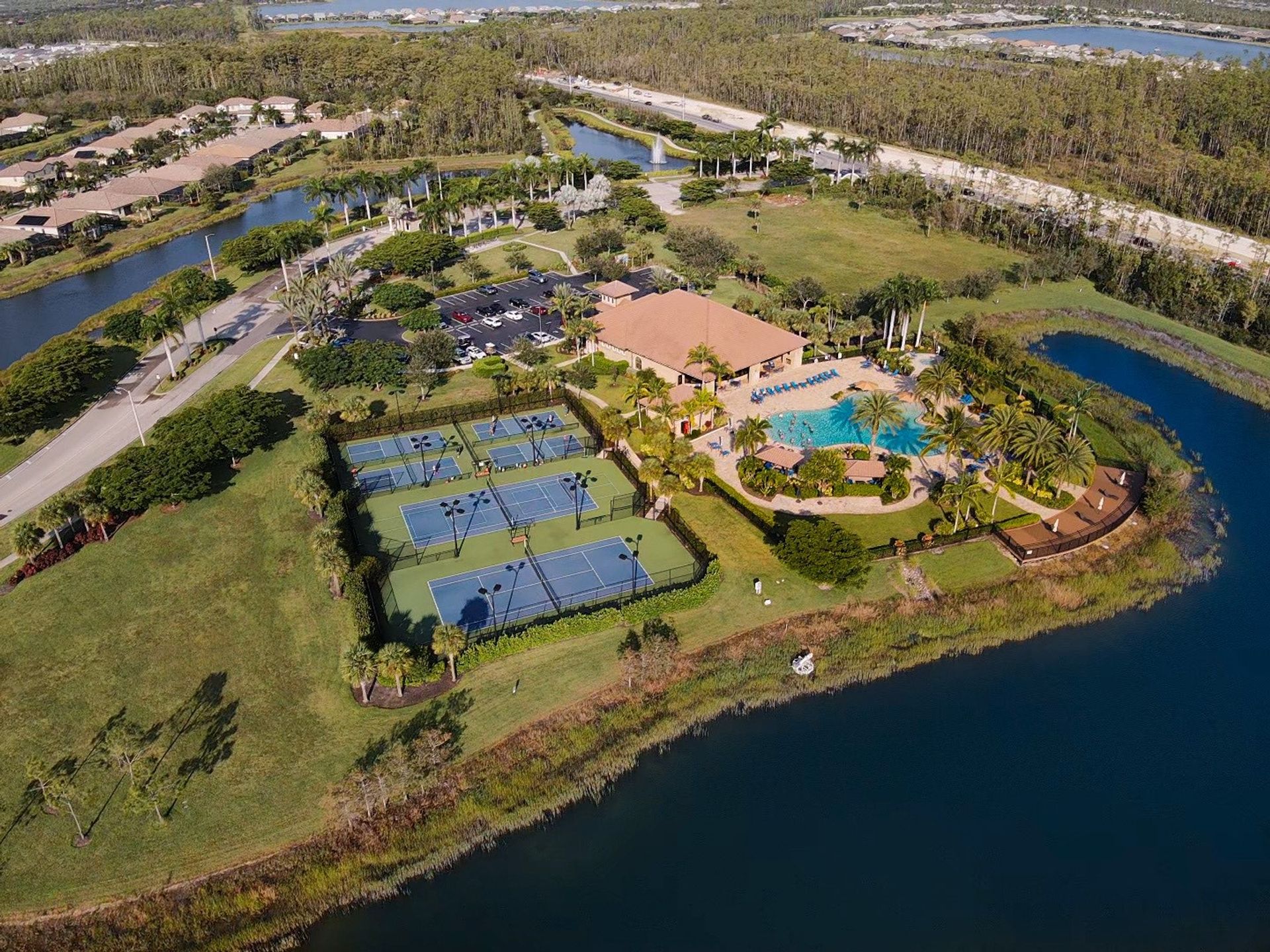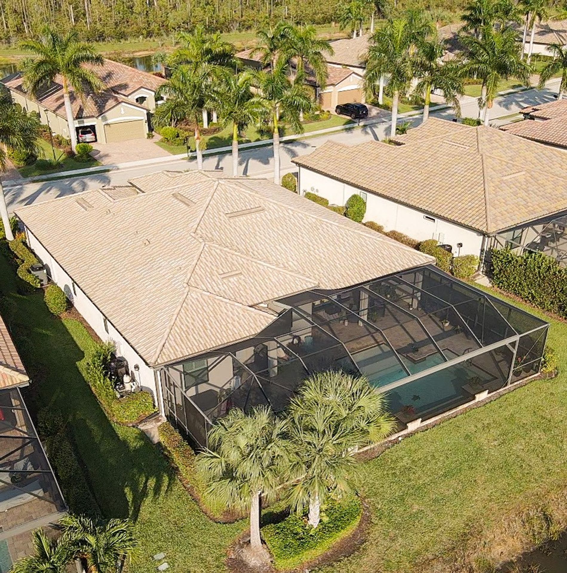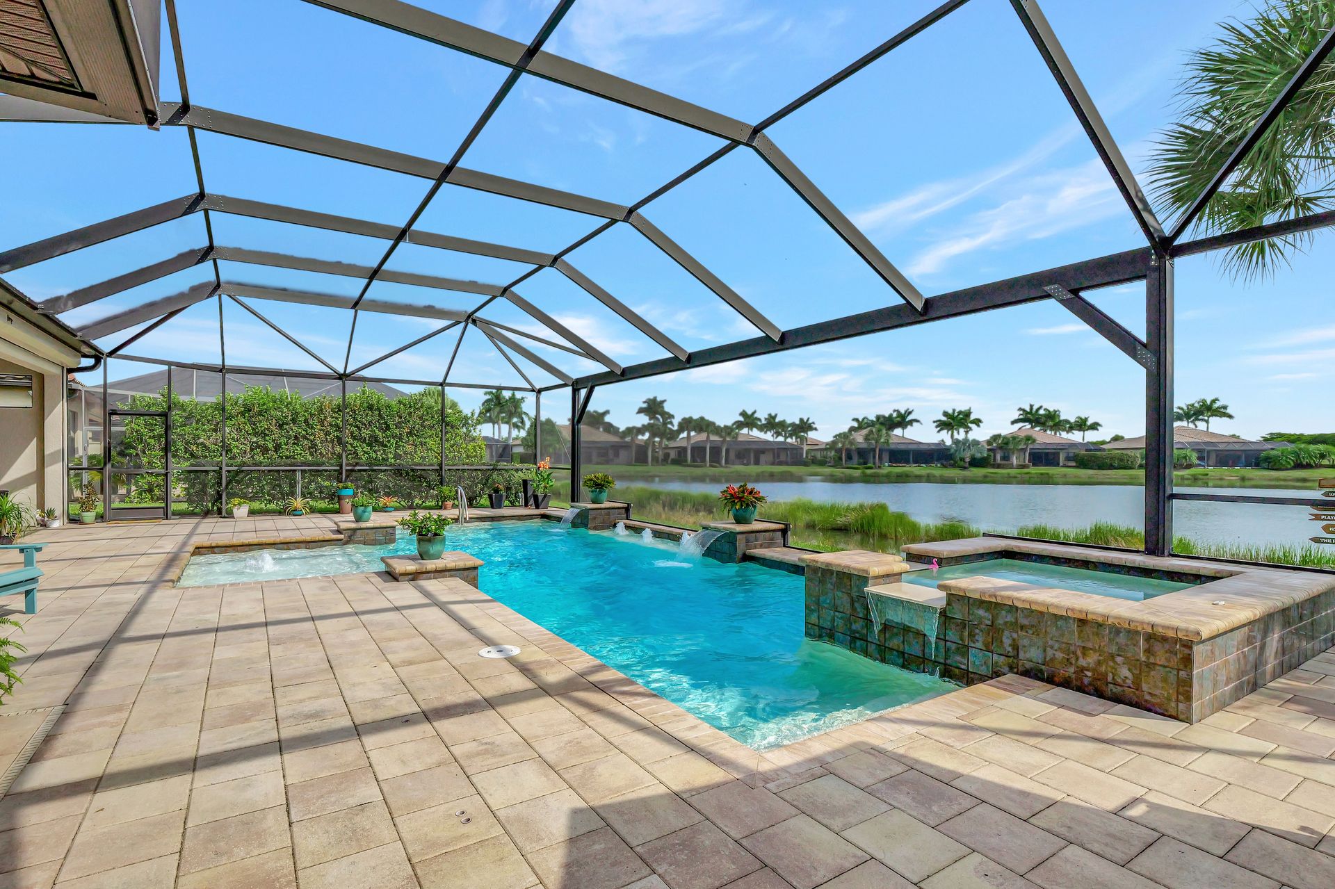 Tucked inside the 'resort style' gated community - 'Preserve At Corkscrew'! Impressive the moment you pull up and see the brand-new exterior paint and lush tropical landscaping! 3,078 sq ft under air and a total of almost 6,000 sq ft total of living/entertaining space. The open floor plan welcomes you with trayed volume ceilings and instant 'water views' of the gleaming lake. Indoor/Outdoor intermingle the gathering spaces with disappearing zero-corner sliding glass doors inviting you to the covered, panoramic screened lanai area (plumbed for an outdoor kitchen). The outdoor oasis boasts an expansive, salt-water pool with a heated spa. Relax in the tranquility of the bubblers and waterfalls - all with views of the lake and wildlife. Four bedrooms, two home offices/dens and three full baths (including a pool bath). Double French doors open to the fabulous primary retreat offering (2) custom closets, a spa-like bath (with separate tub and shower) and glass doors to the pool. The three-car garage has custom storage and an epoxy-coated floor. Located in the Estates section on a low-traffic dead-end. Amenities included: resort-style pool, pickleball, tennis, fitness, outdoor fireplace and more. No flood insurance. Close to RSW airport, Hertz Arena, open-air shopping/dining, I-75, golf and beaches.
