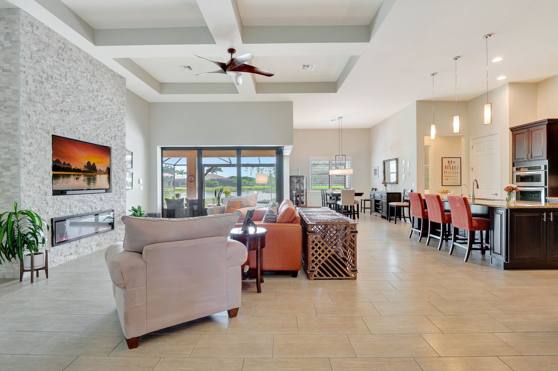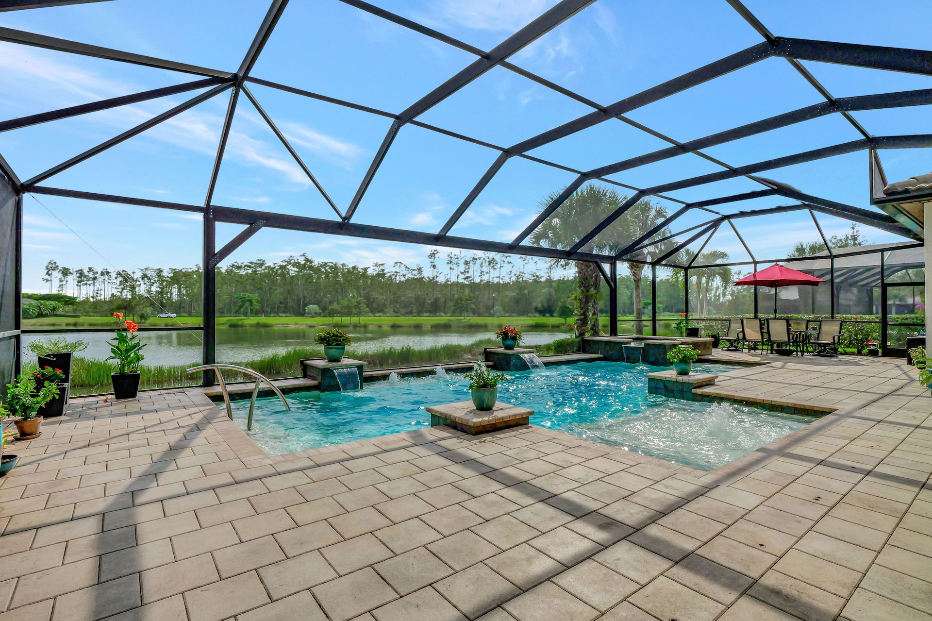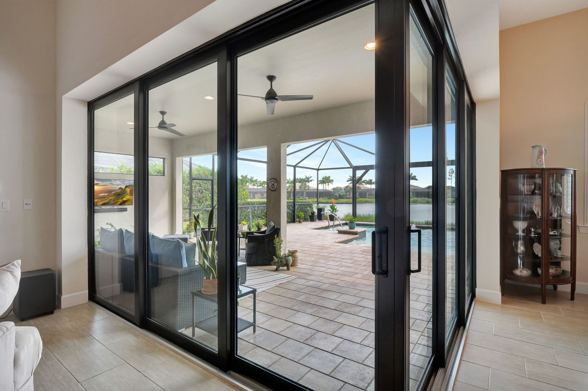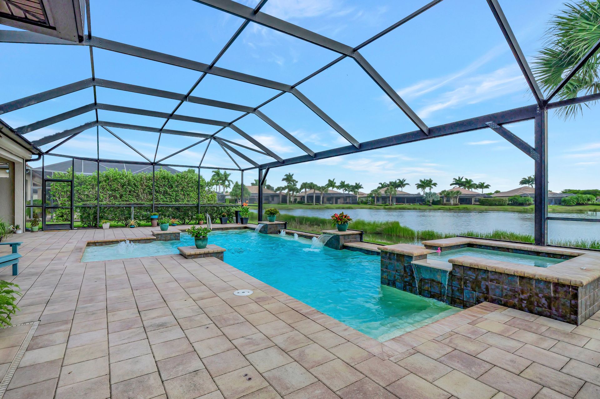 Tucked inside the 'resort style' gated community - 'Preserve At Corkscrew'! Impressive the moment you pull up and see the brand-new exterior paint and lush tropical landscaping! 3,078 sq ft under air and a total of almost 6,000 sq ft total of living/entertaining space. The open floor plan welcomes you with trayed volume ceilings and instant 'water views' of the gleaming lake. Indoor/Outdoor intermingle the gathering spaces with disappearing zero-corner sliding glass doors inviting you to the covered, panoramic screened lanai area (plumbed for an outdoor kitchen). The outdoor oasis boasts an expansive, salt-water pool with a heated spa. Relax in the tranquility of the bubblers and waterfalls - all with views of the lake and wildlife. Four bedrooms, two home offices/dens and three full baths (including a pool bath). Double French doors open to the fabulous primary retreat offering (2) custom closets, a spa-like bath (with separate tub and shower) and glass doors to the pool. The three-car garage has custom storage and an epoxy-coated floor. Located in the Estates section on a low-traffic dead-end. Amenities included: resort-style pool, pickleball, tennis, fitness, outdoor fireplace and more. No flood insurance. Close to RSW airport, Hertz Arena, open-air shopping/dining, I-75, golf and beaches.