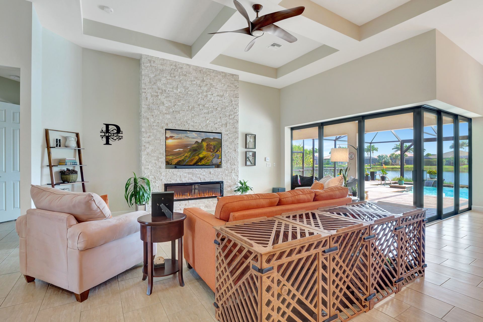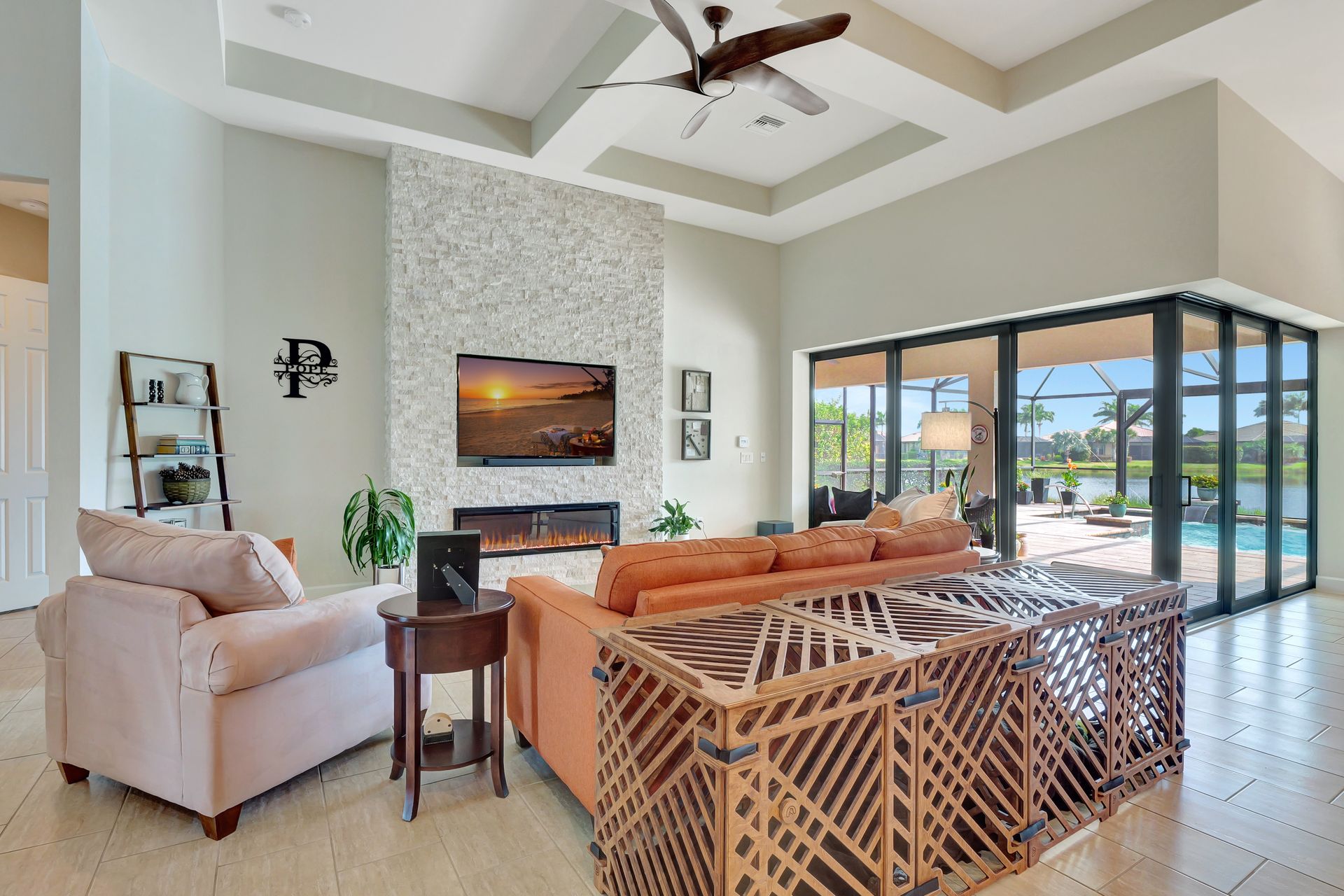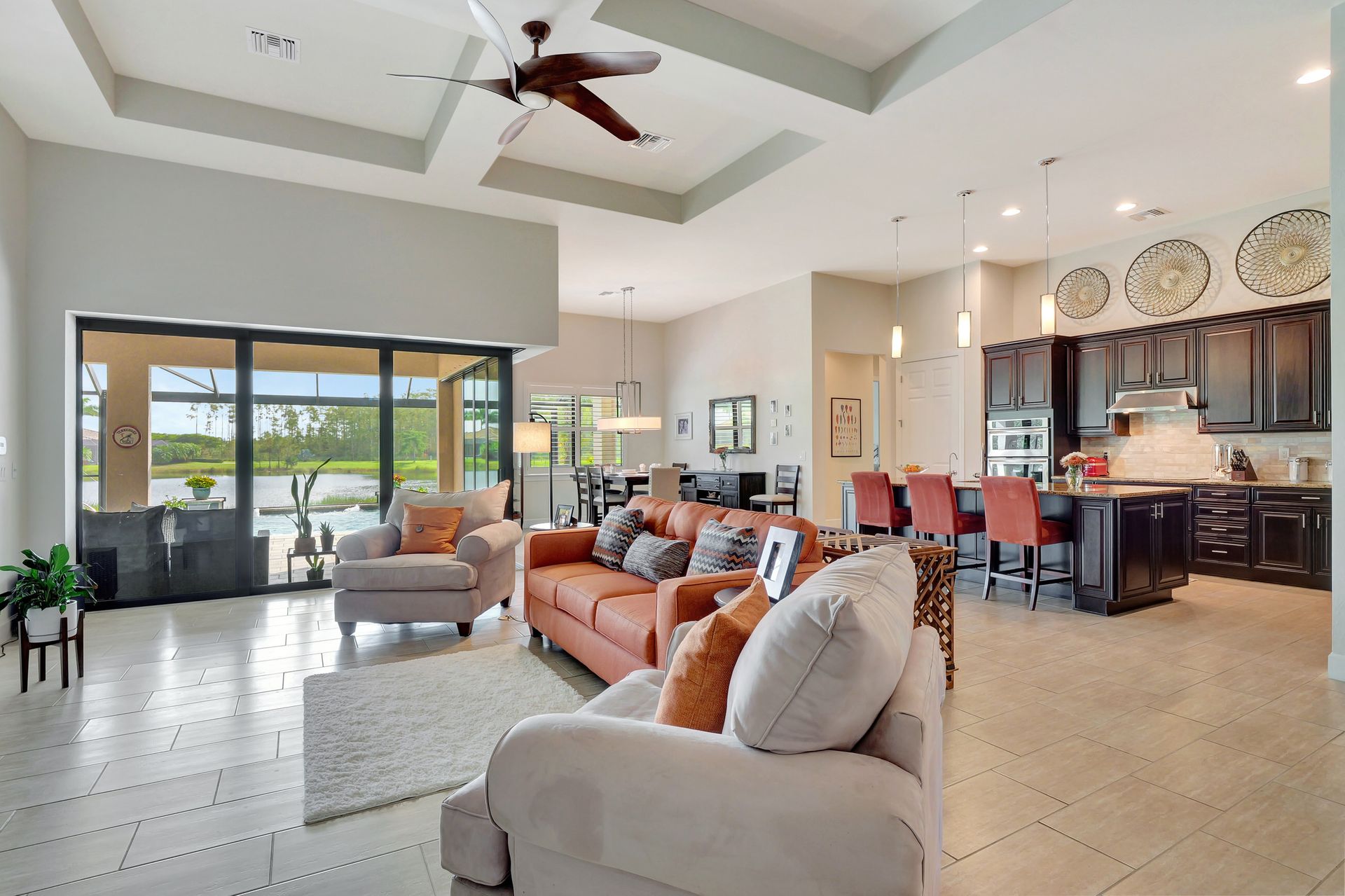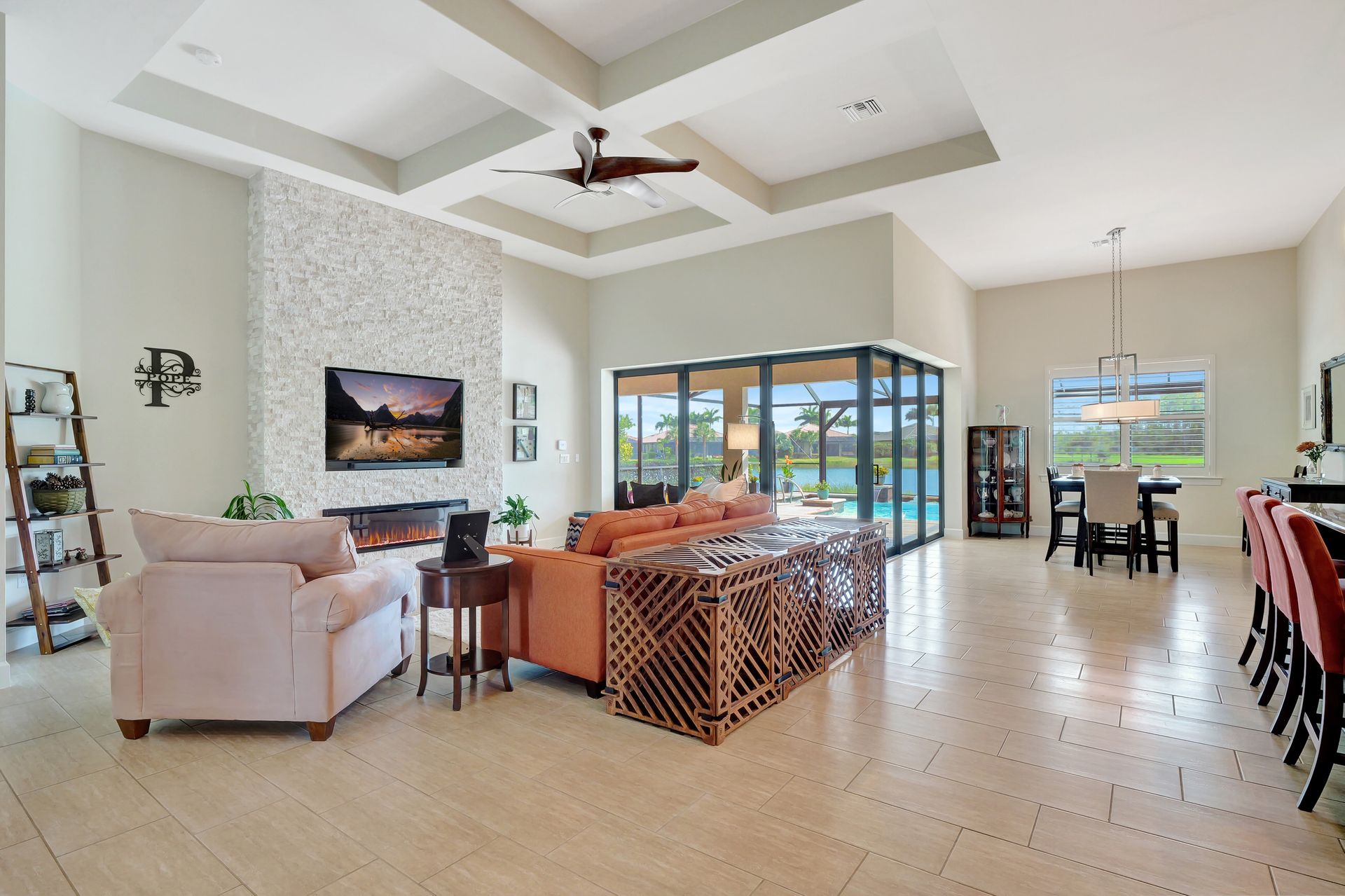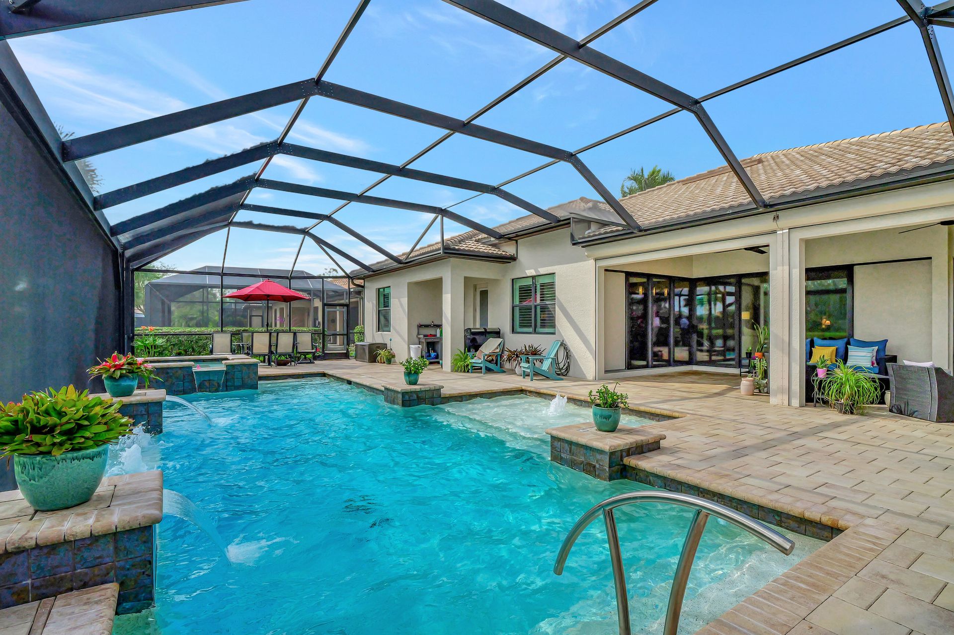 Tucked inside the 'resort style' gated community - 'Preserve At Corkscrew'! Impressive the moment you pull up and see the brand-new exterior paint and lush tropical landscaping! 3,078 sq ft under air and a total of almost 6,000 sq ft total of living/entertaining space. The open floor plan welcomes you with trayed volume ceilings and instant 'water views' of the gleaming lake. Indoor/Outdoor intermingle the gathering spaces with disappearing zero-corner sliding glass doors inviting you to the covered, panoramic screened lanai area (plumbed for an outdoor kitchen). The outdoor oasis boasts an expansive, salt-water pool with a heated spa. Relax in the tranquility of the bubblers and waterfalls - all with views of the lake and wildlife. Four bedrooms, two home offices/dens and three full baths (including a pool bath). Double French doors open to the fabulous primary retreat offering (2) custom closets, a spa-like bath (with separate tub and shower) and glass doors to the pool. The three-car garage has custom storage and an epoxy-coated floor. Located in the Estates section on a low-traffic dead-end. Amenities included: resort-style pool, pickleball, tennis, fitness, outdoor fireplace and more. No flood insurance. Close to RSW airport, Hertz Arena, open-air shopping/dining, I-75, golf and beaches.
