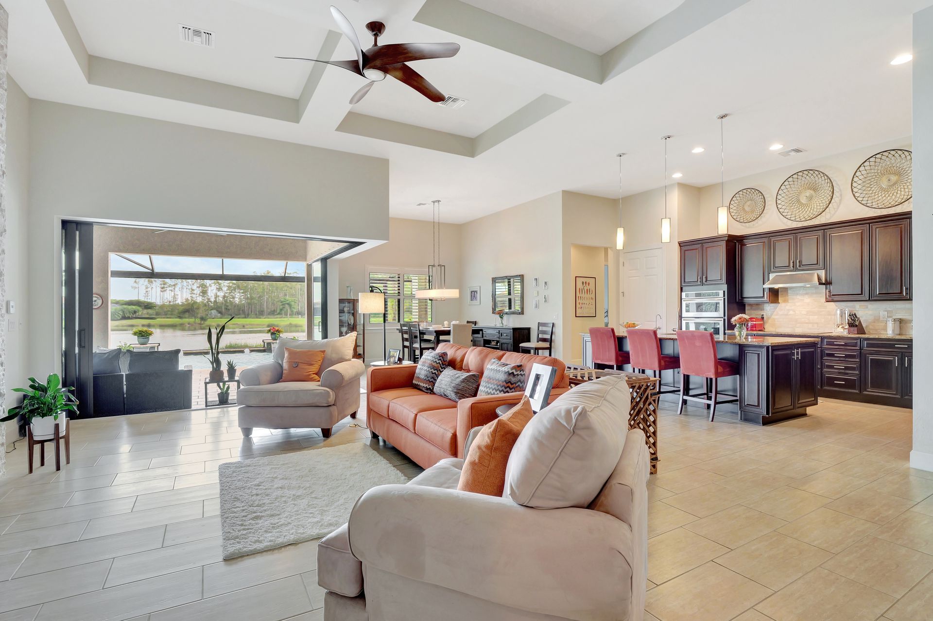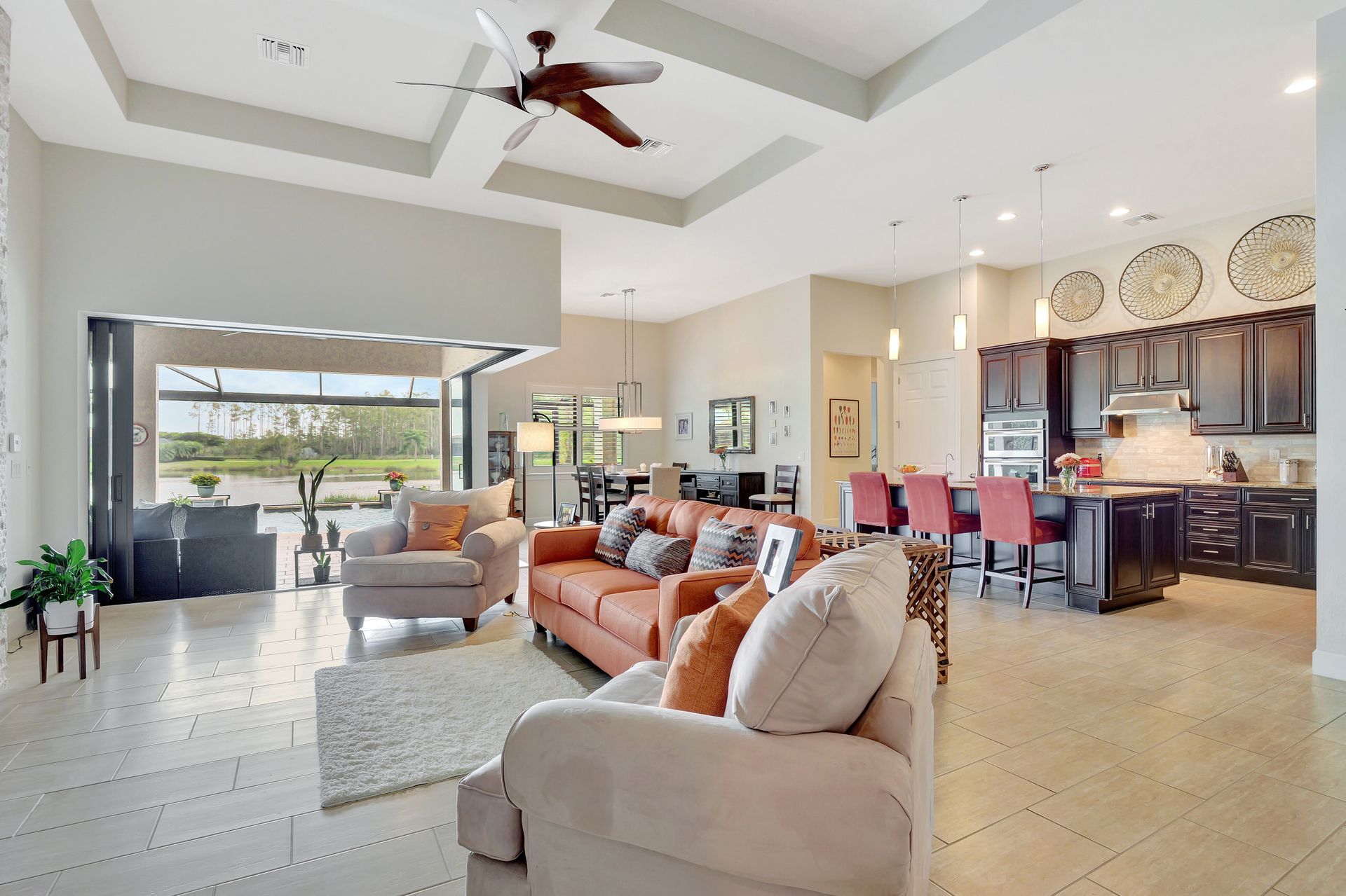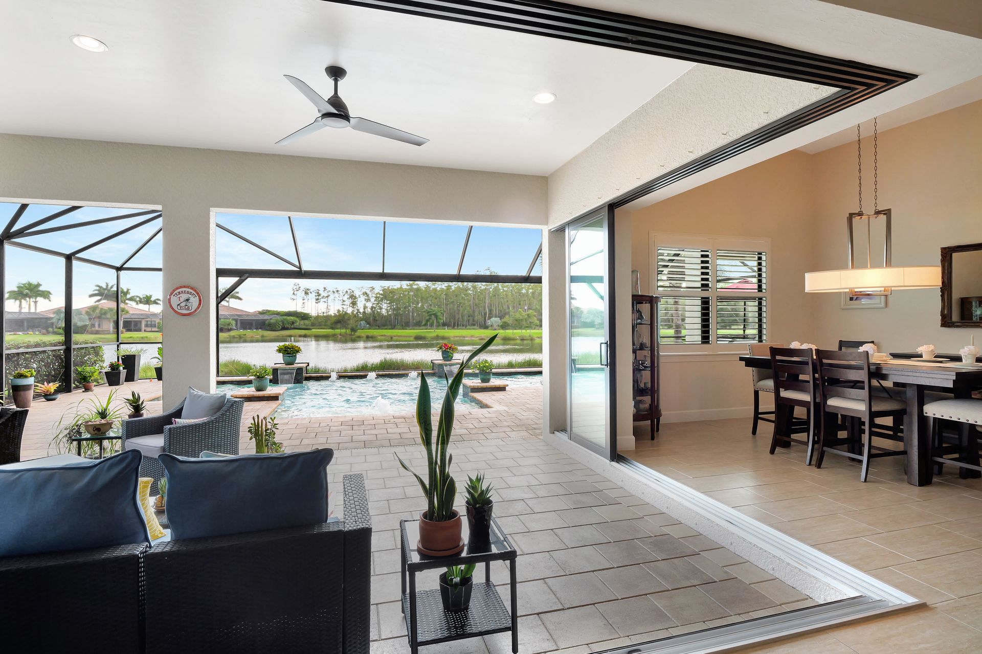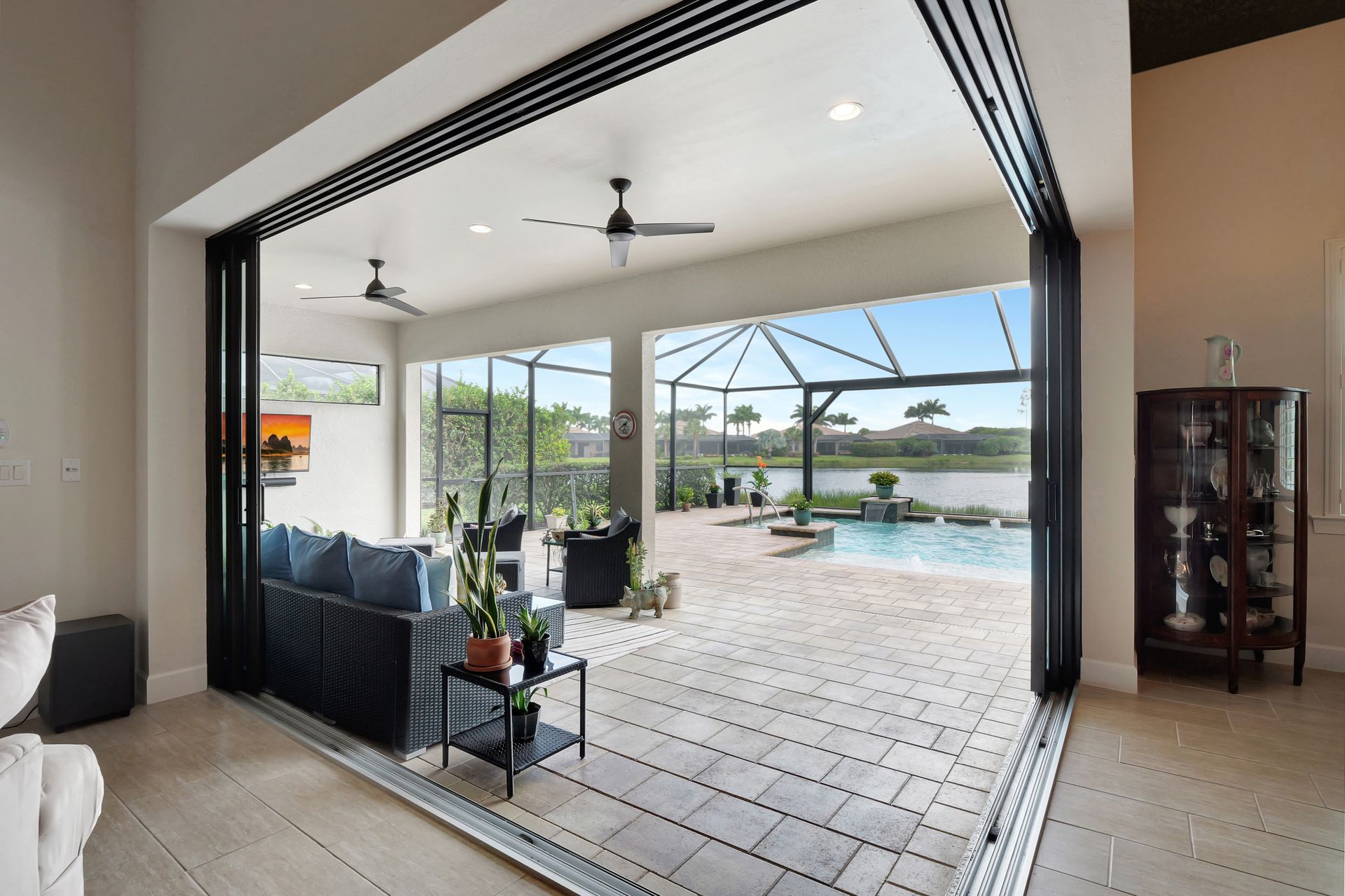 Tucked inside the 'resort style' gated community - 'Preserve At Corkscrew'! Impressive the moment you pull up and see the brand-new exterior paint and lush tropical landscaping! 3,078 sq ft under air and a total of almost 6,000 sq ft total of living/entertaining space. The open floor plan welcomes you with trayed volume ceilings and instant 'water views' of the gleaming lake. Indoor/Outdoor intermingle the gathering spaces with disappearing zero-corner sliding glass doors inviting you to the covered, panoramic screened lanai area (plumbed for an outdoor kitchen). The outdoor oasis boasts an expansive, salt-water pool with a heated spa. Relax in the tranquility of the bubblers and waterfalls - all with views of the lake and wildlife. Four bedrooms, two home offices/dens and three full baths (including a pool bath). Double French doors open to the fabulous primary retreat offering (2) custom closets, a spa-like bath (with separate tub and shower) and glass doors to the pool. The three-car garage has custom storage and an epoxy-coated floor. Located in the Estates section on a low-traffic dead-end. Amenities included: resort-style pool, pickleball, tennis, fitness, outdoor fireplace and more. No flood insurance. Close to RSW airport, Hertz Arena, open-air shopping/dining, I-75, golf and beaches.