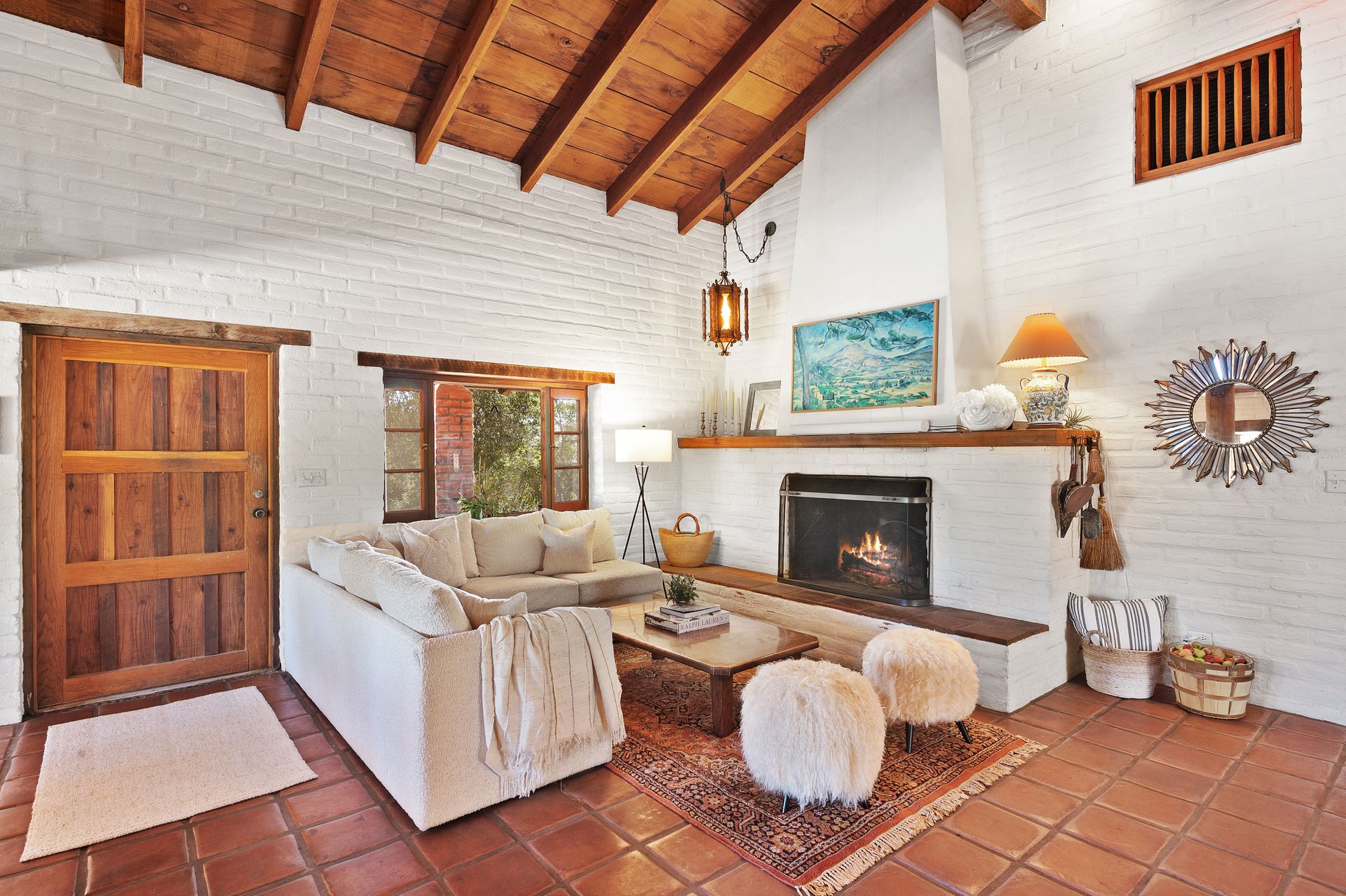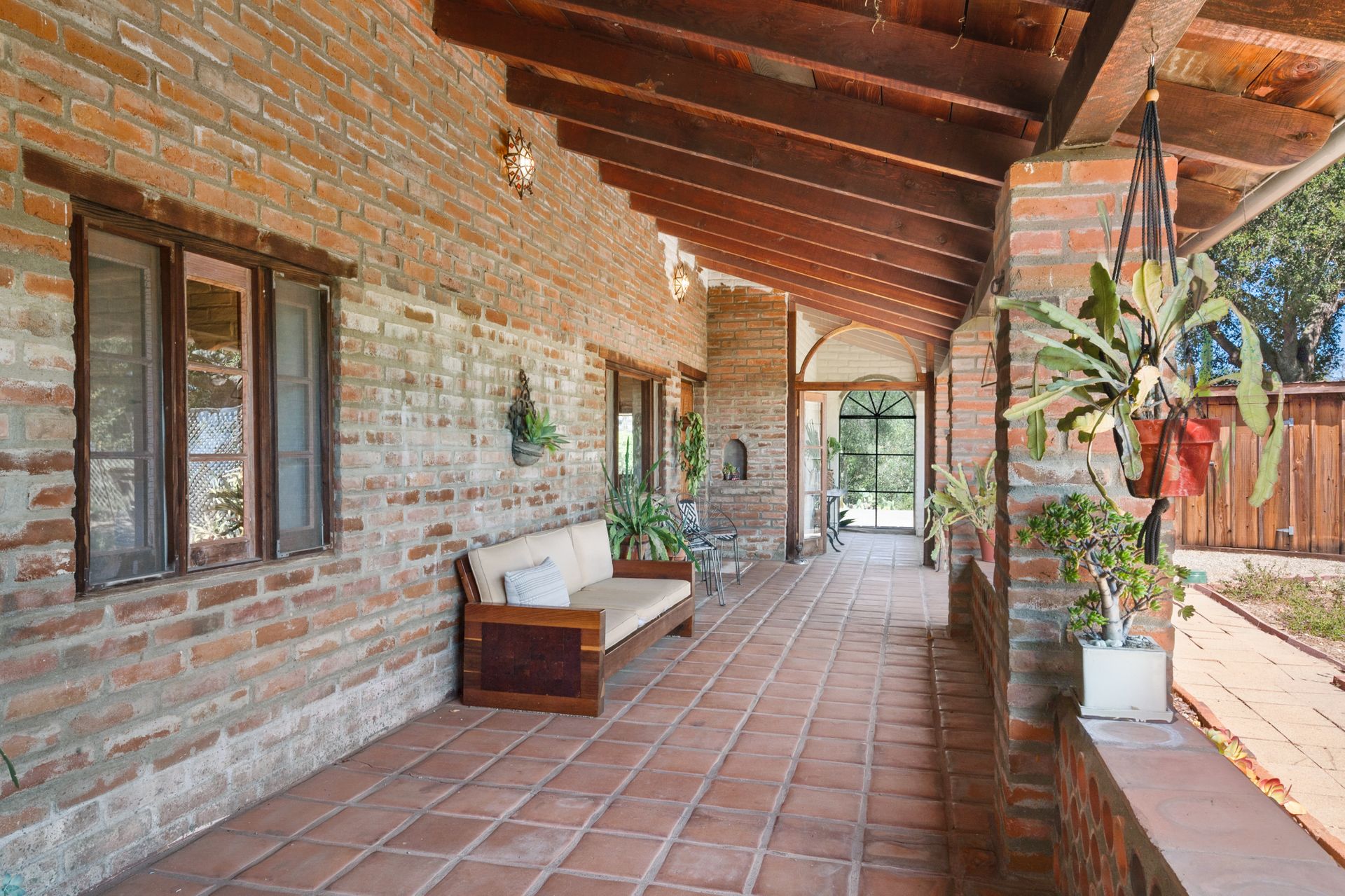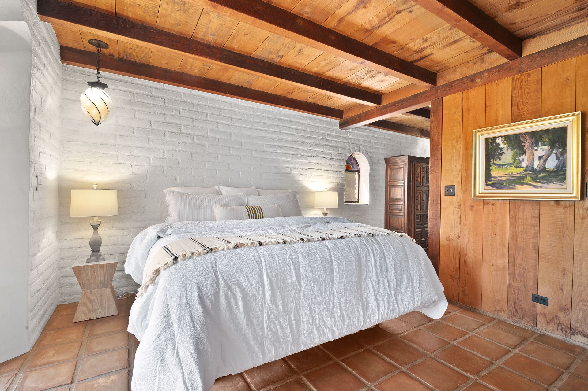 The primary bedroom suite, with a stunning scalloped window frame and doors to the veranda, features a corner fireplace, built-in storage and traditional painted tiles in the bath.