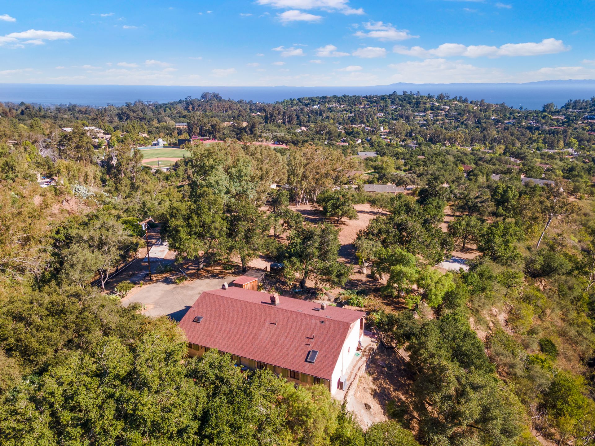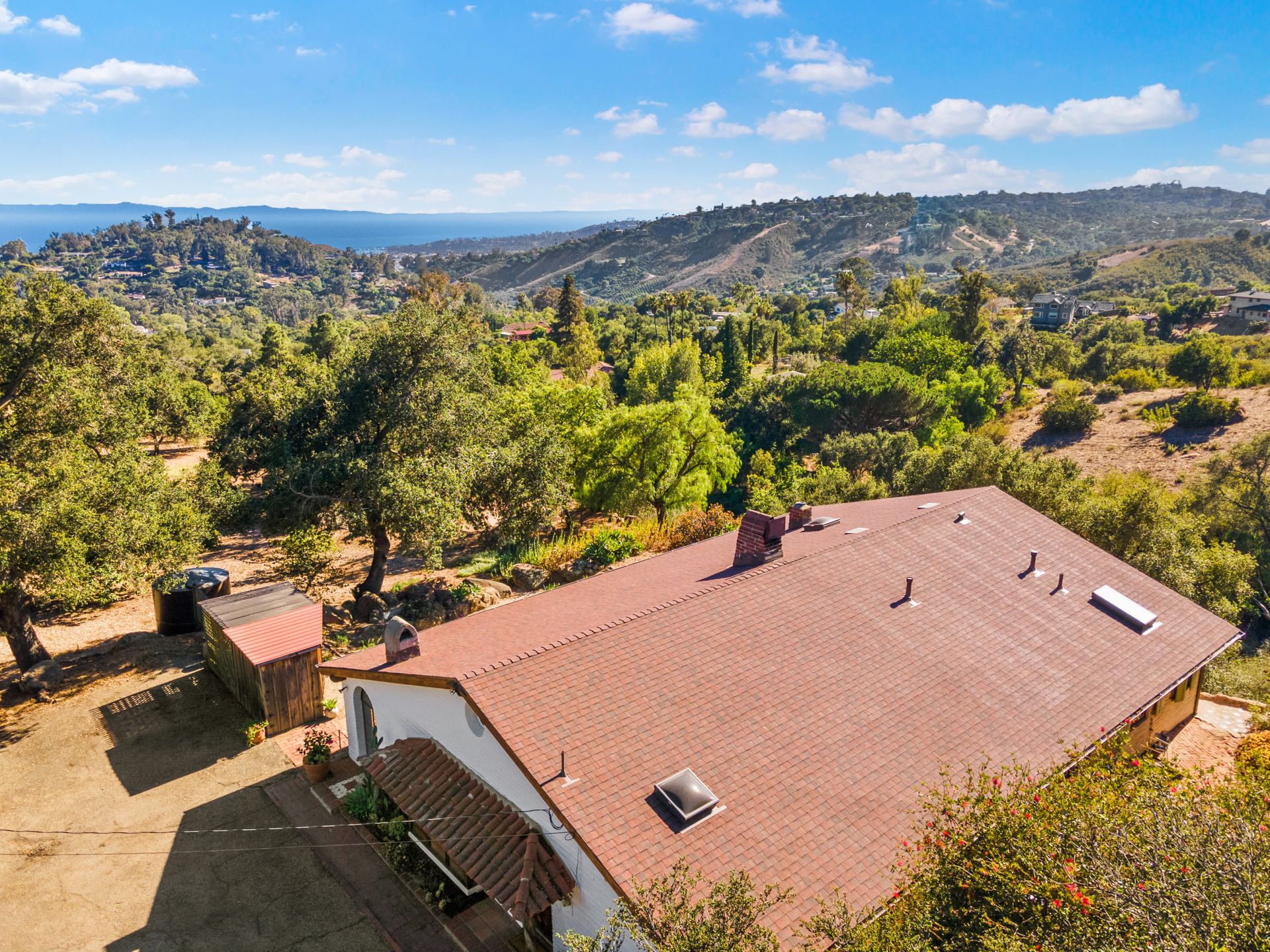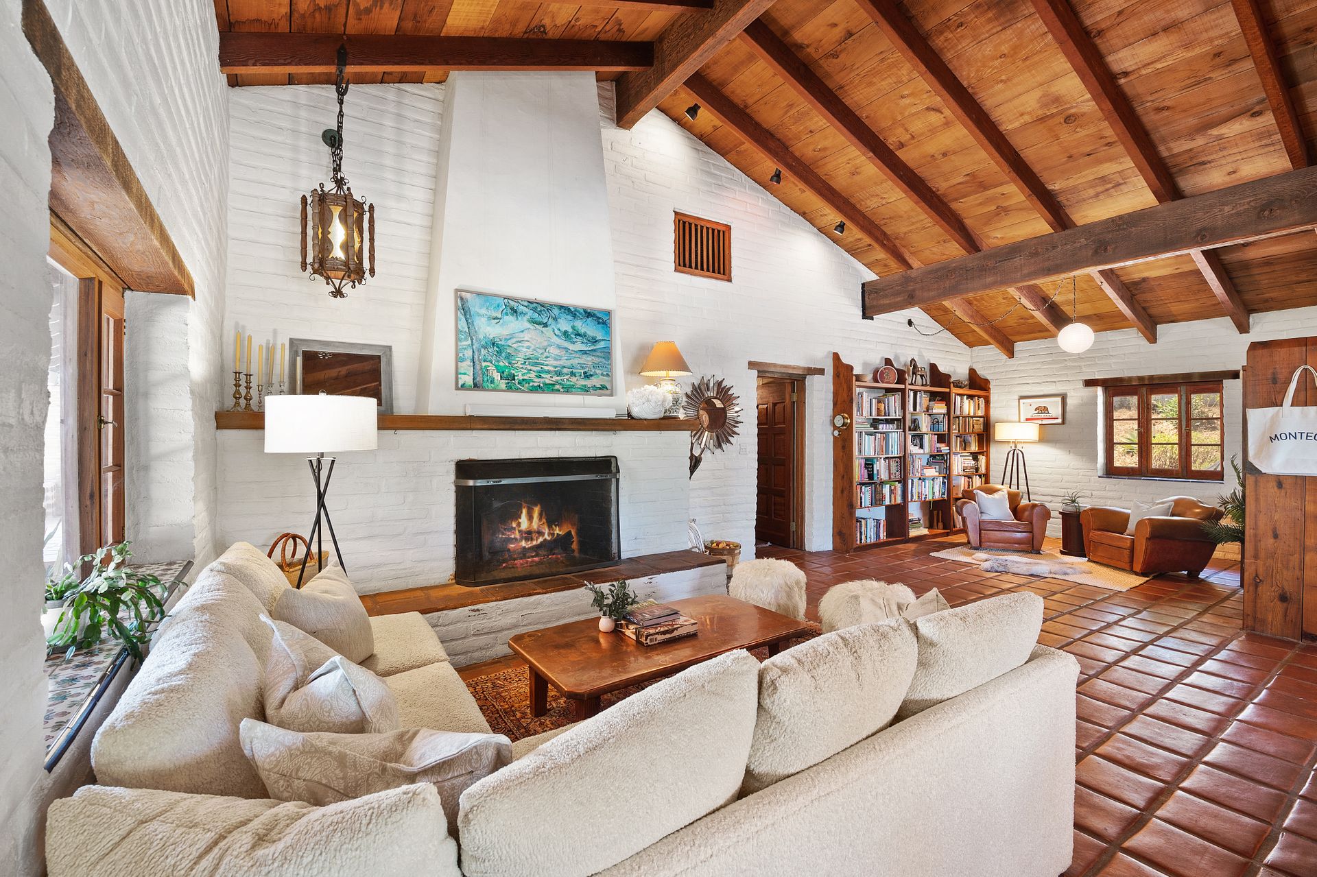 This classic Hacienda is situated on two private lots (total 3.55 acres) in the Cold Spring School District! Designed by Frank Robinson with a great-room floor plan, the chef's kitchen is open to the living and dining rooms. Enjoy the ambiance of a vaulted ceiling with beams reclaimed from a Big Sur bridge, a living room with fireplace and views to the veranda and ocean. The dining area offers a window seat and cozy corner fireplace for inviting gatherings. A covered veranda with a sunroom and city and ocean views welcomes year-round gatherings. Or sneak up to the snuggly reading loft.