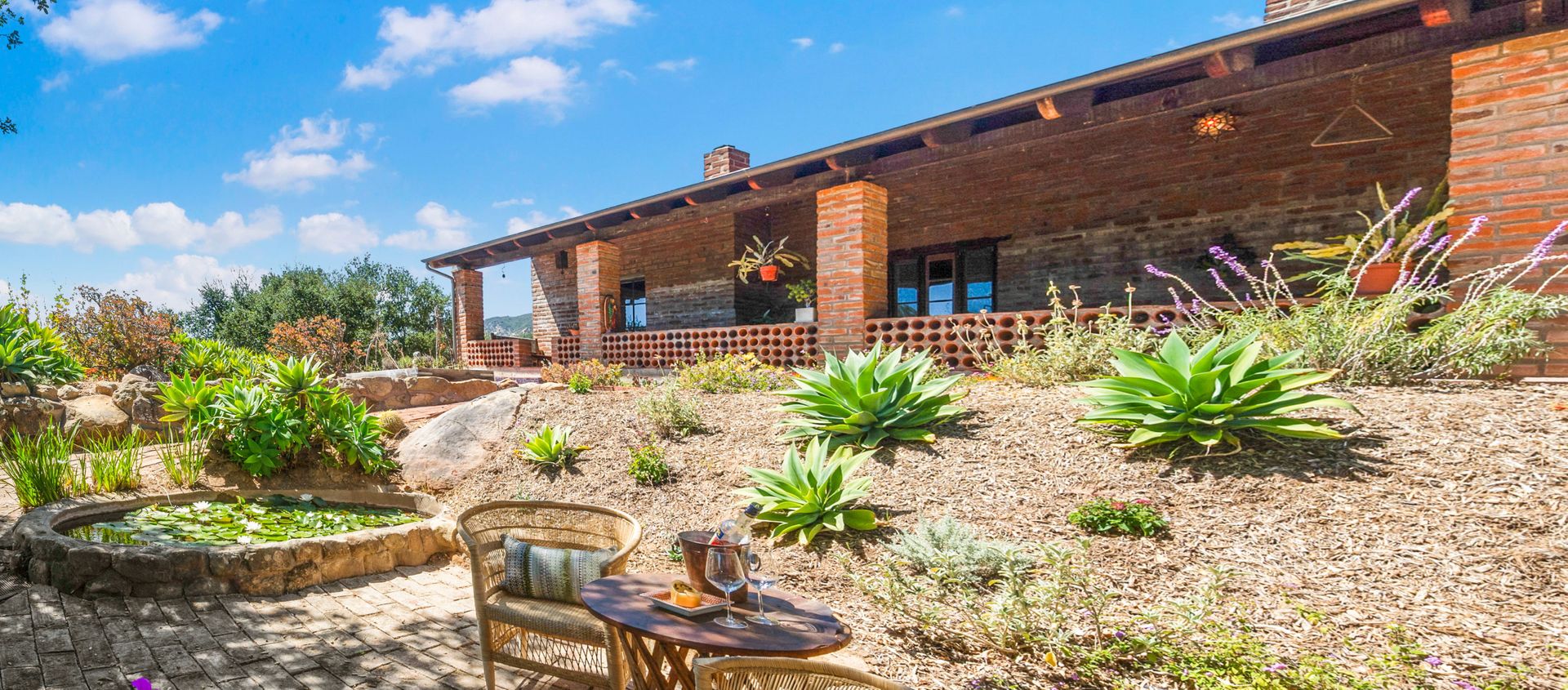 Amenities include a barbeque patio convenient to the kitchen, a wine cellar, Koi-pond patio and fruit trees.