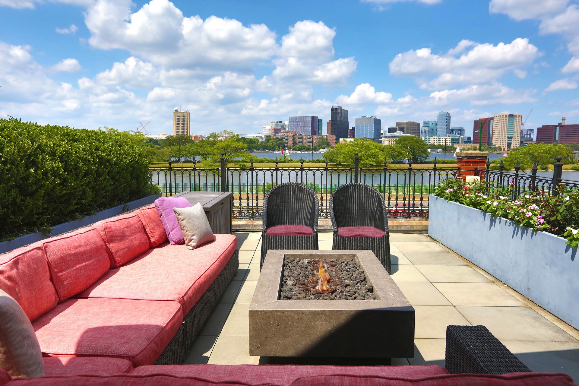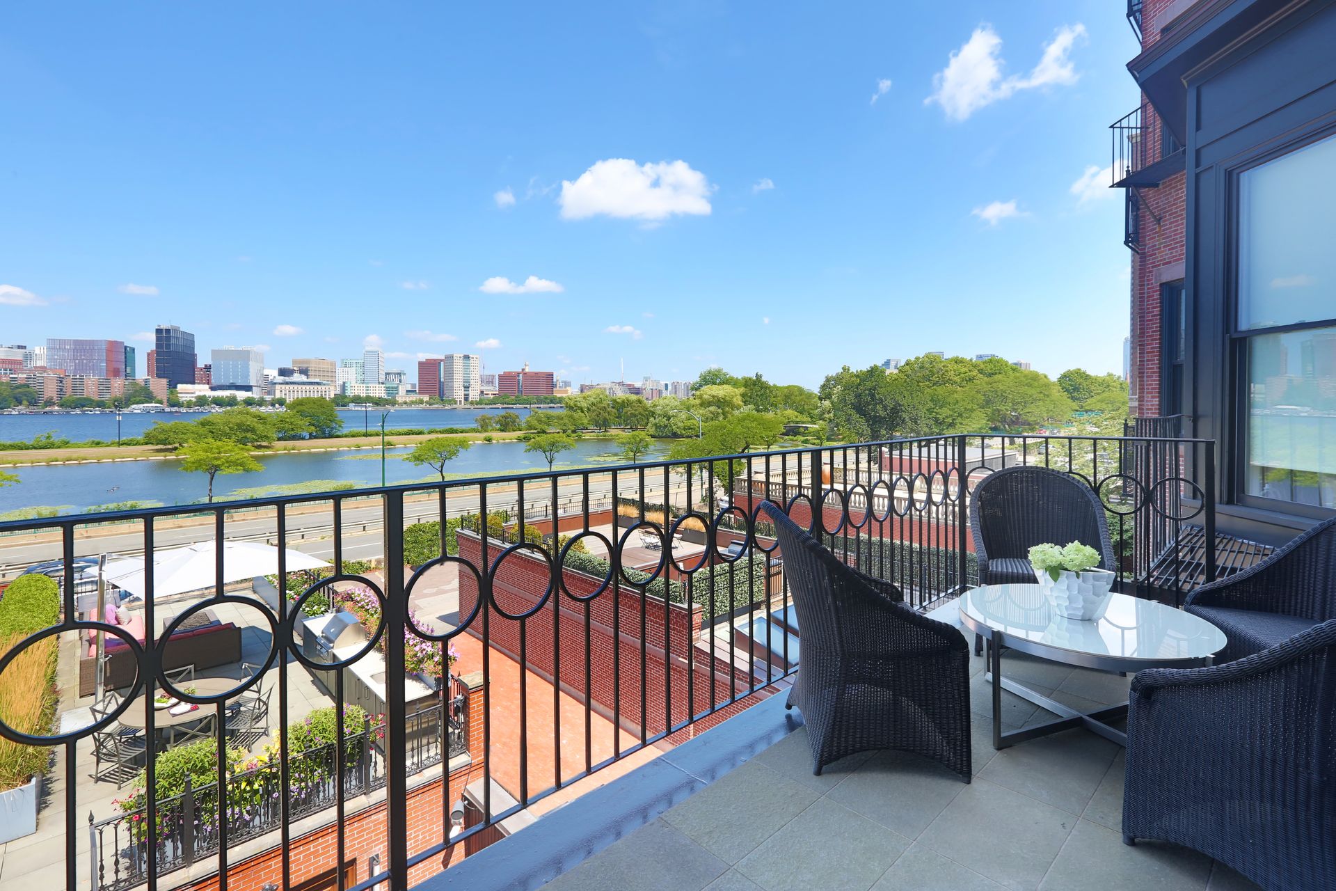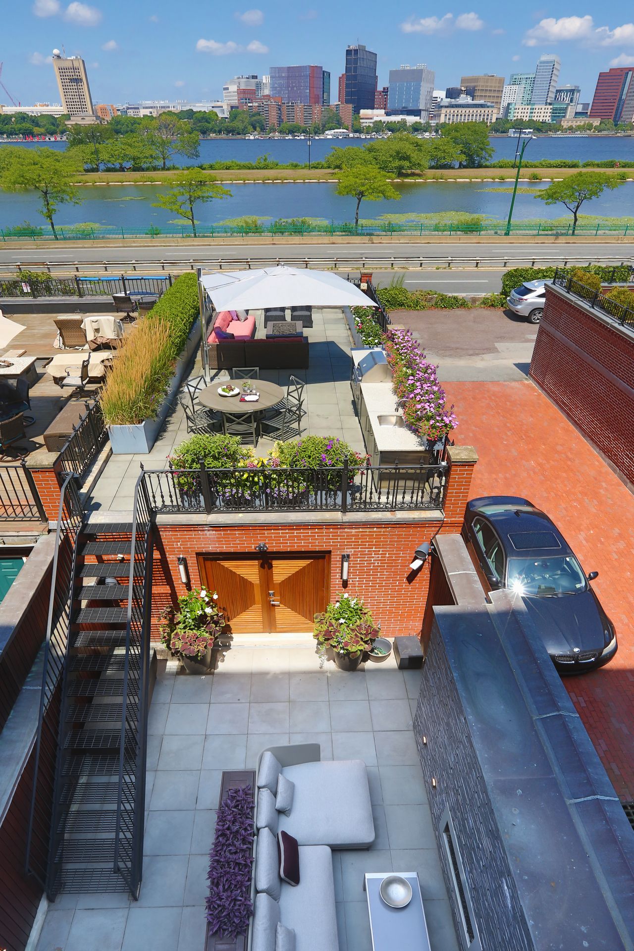 Awe-inspiring floor-to-ceiling windows offer stunning, unobstructed views of the Charles River and gorgeous sunsets. This exquisite residence has been completely renovated to perfection, meticulously maintained, and impeccably designed with the finest finishes. Featuring three bedrooms, three and one-half baths, soaring ceilings, a kitchen with top-of-the-line appliances and Calacatta marble, and three parking spaces (two garage and one outdoor). The three private outdoor options make this sophisticated home an entertaining oasis. The Hope’s folding glass doors provide a seamless transition to the outdoor living area, melding the interior with the exterior courtyard, gas fireplace, large roof deck over the garage, outdoor kitchen, professional gas grill, fire pit, and automatic snow melt system. Direct elevator access to all floors and Control4 Smart Home technology. One of just two residences in a historic brownstone and only steps to the Commonwealth Avenue Mall, Charles River Esplanade, Public Garden, and many shops and restaurants of Newbury Street, the Prudential Center, and Back Bay.