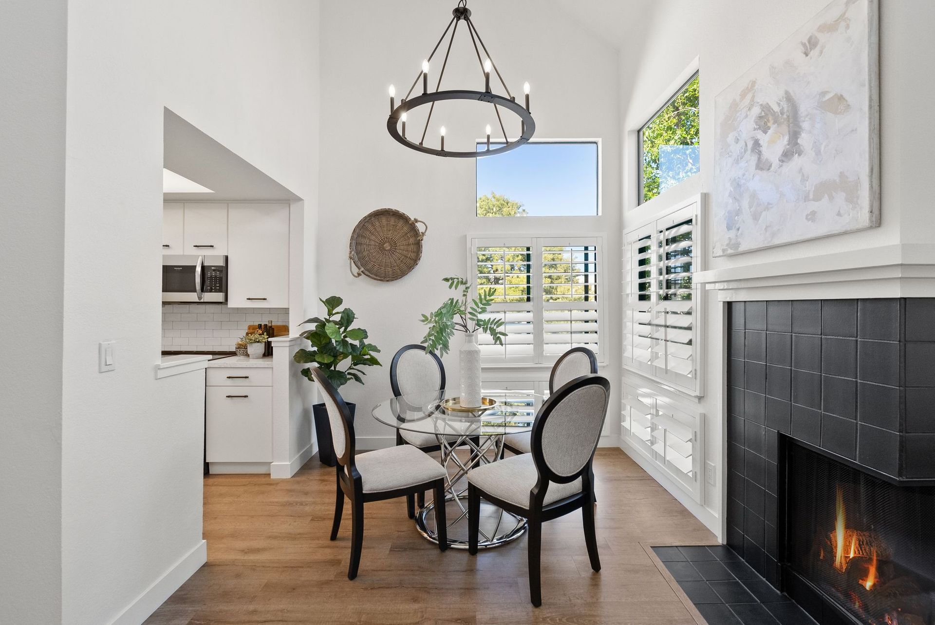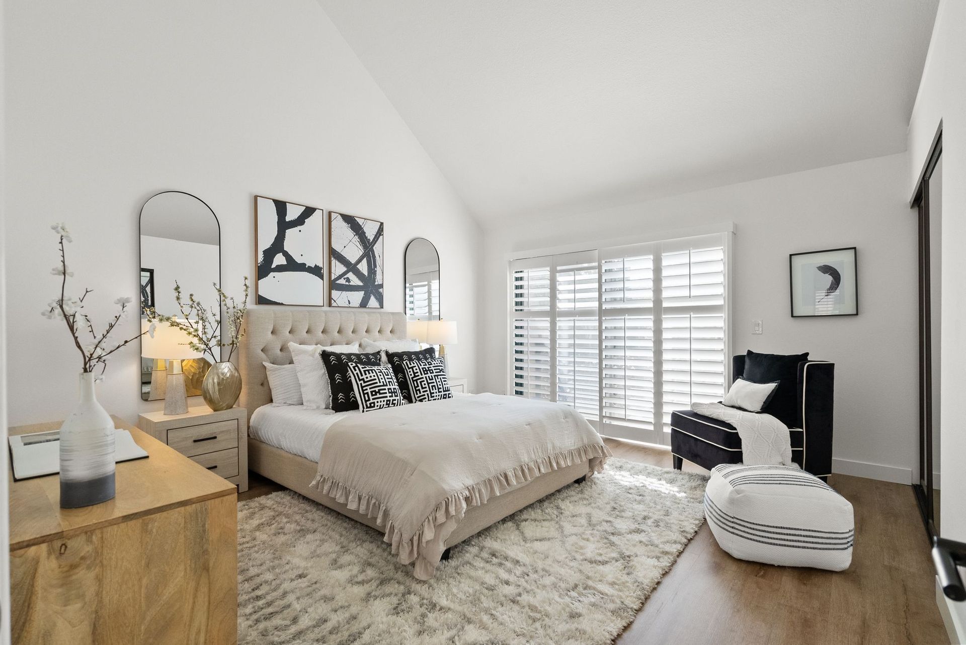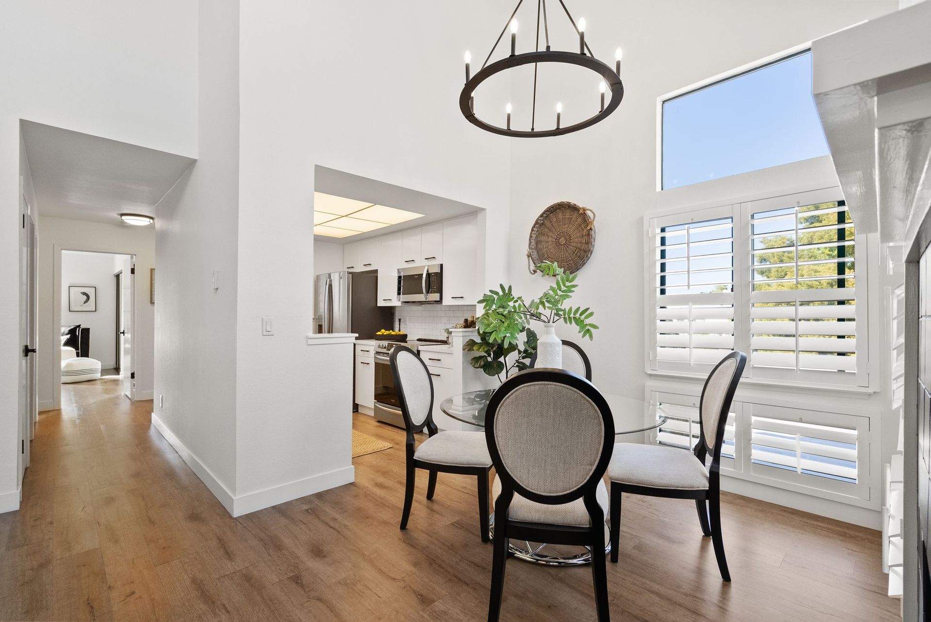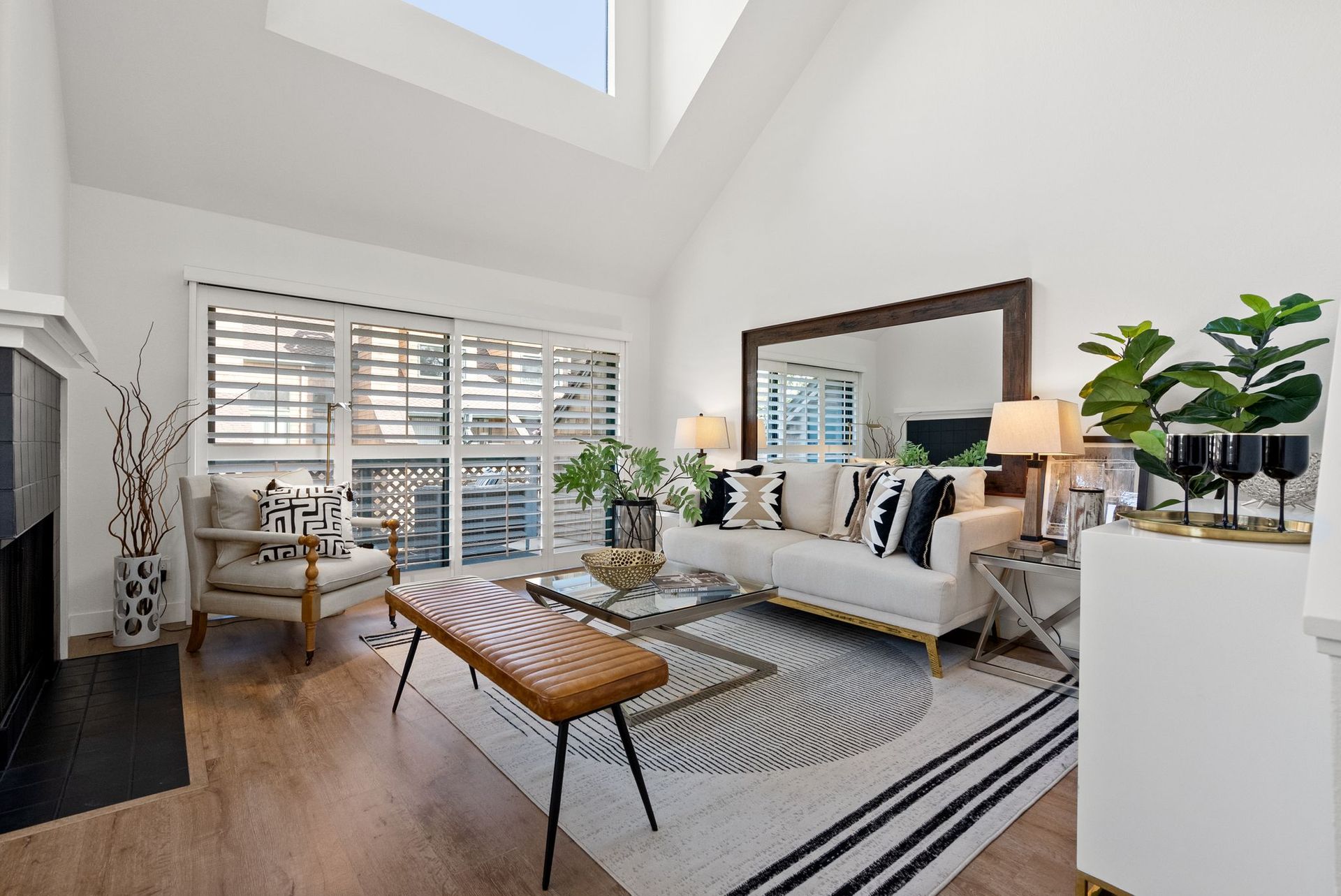 This move-in ready corner unit condo is what you have been waiting for. Located in the desirable Pelican Cove community in Redwood Shores, this bright and airy top floor 2 story beauty has its own private entrance. The living room and dining room are enhanced by vaulted ceilings, abundant windows, wood burning fireplace, a beautiful chandelier and sliding glass door access to a private balcony with storage. Remodeled kitchen features stainless steel appliances, newly painted white bamboo cabinets, quartz countertops and decorative tile backsplash. The main level bedroom is spacious with high ceilings, 2 mirrored closets and access to a second private balcony. The stylish bathroom has an updated vanity, quartz countertop, shower over tub, stackable washer/dryer and additional storage. Upstairs is a second bedroom with an office alcove and a closet. Throughout this beautiful condo, you will find luxury vinyl plank flooring, louvered wood shutters and tons of storage including an oversized under staircase storage closet. Parking is hassle-free with one-assigned carport and second-car parking with permit sticker. Resort like amenities include extensive landscaping, 2 pools, hot tub, clubhouse, boating facilities, kayak and bike storage. Centrally located near walking and biking trails, parks, library, schools, Nob Hill shopping center and Highway 101. Excellent Belmont-Redwood Shores school district!