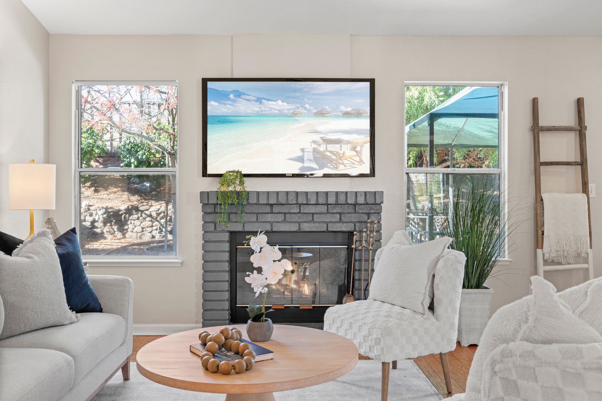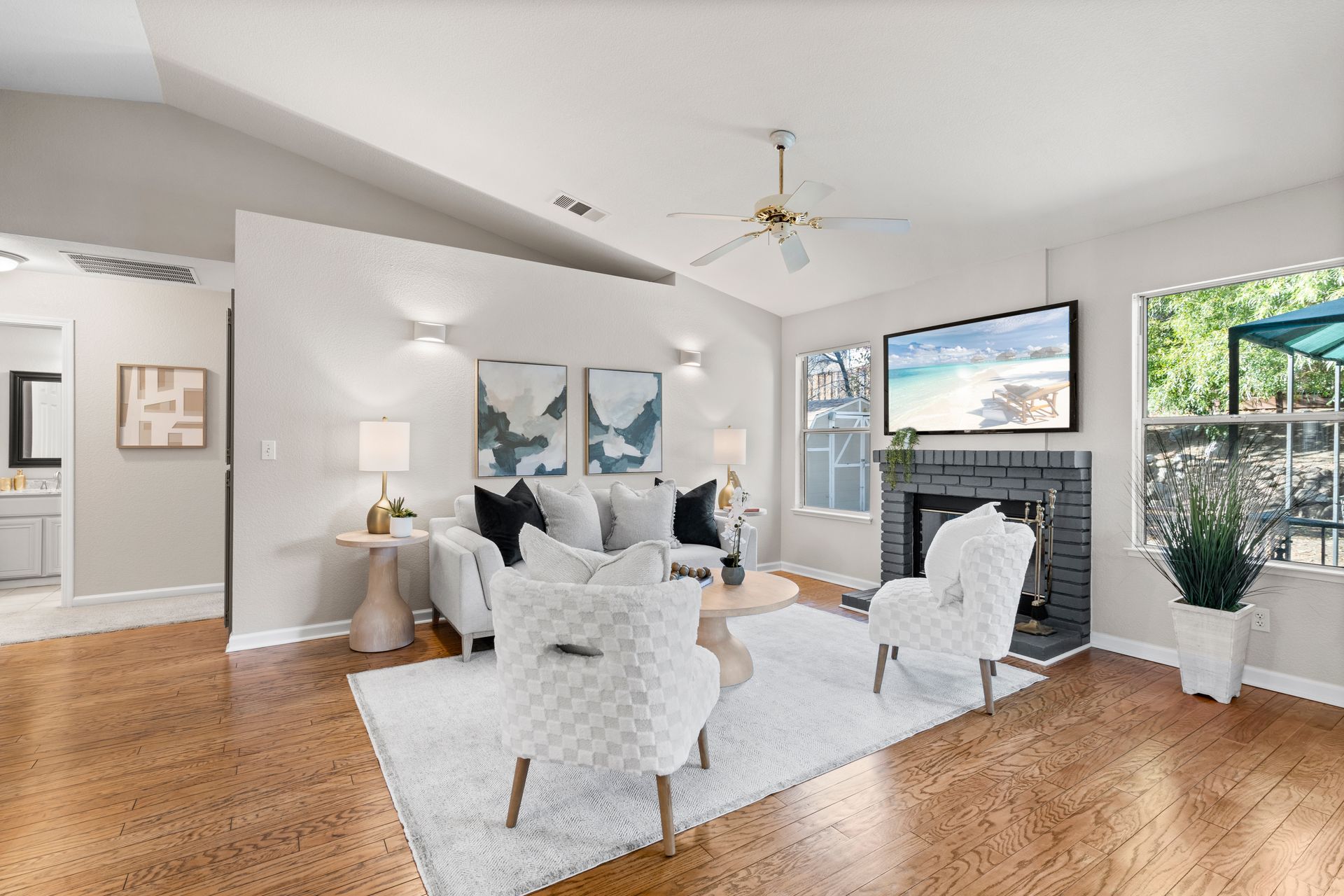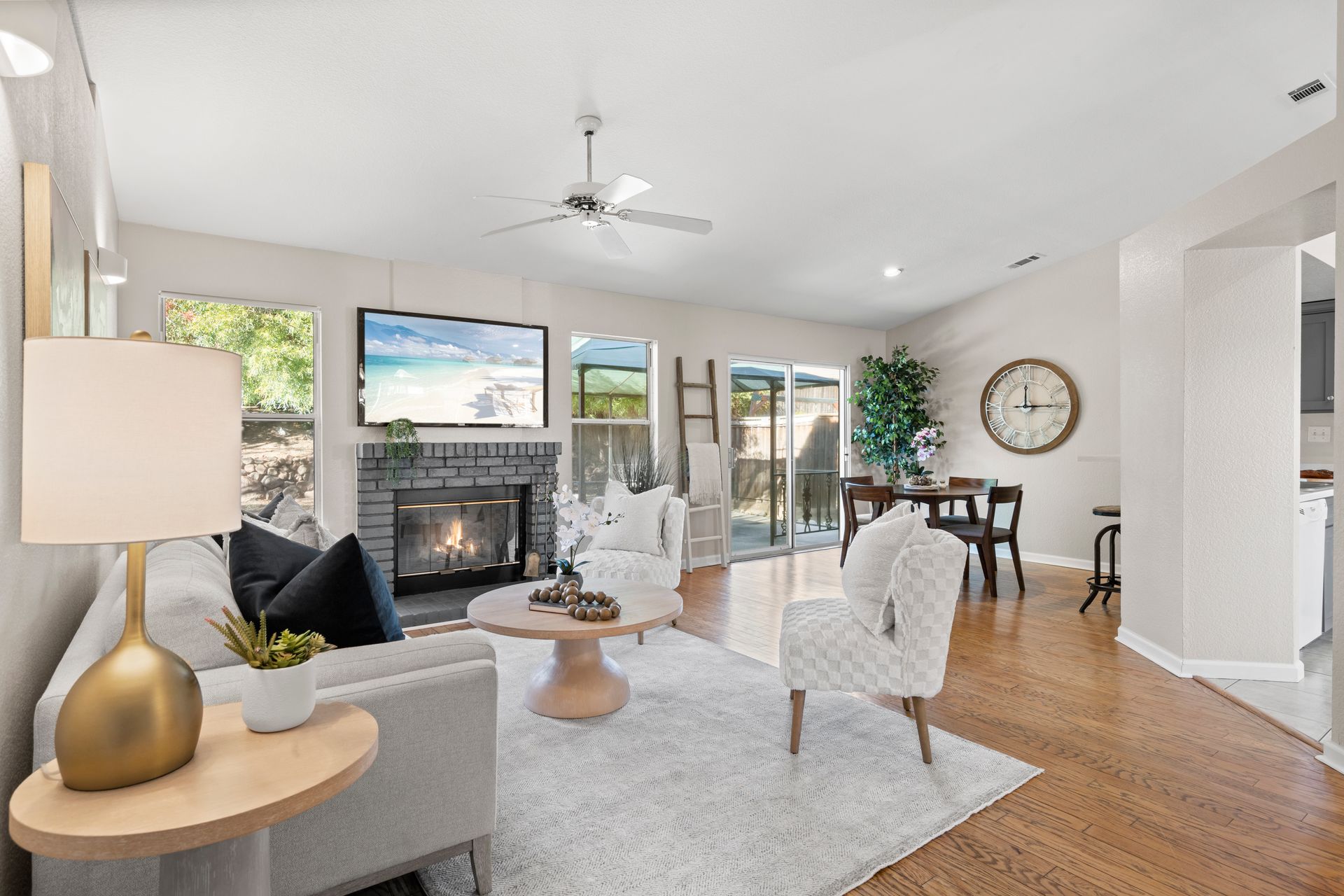Hardwood floors in the main livable area add a touch of elegance, complemented by a separate dining space and a cozy wood-burning fireplace, creating a warm and inviting atmosphere. Abundant natural light throughout the home creates a bright and airy feel.