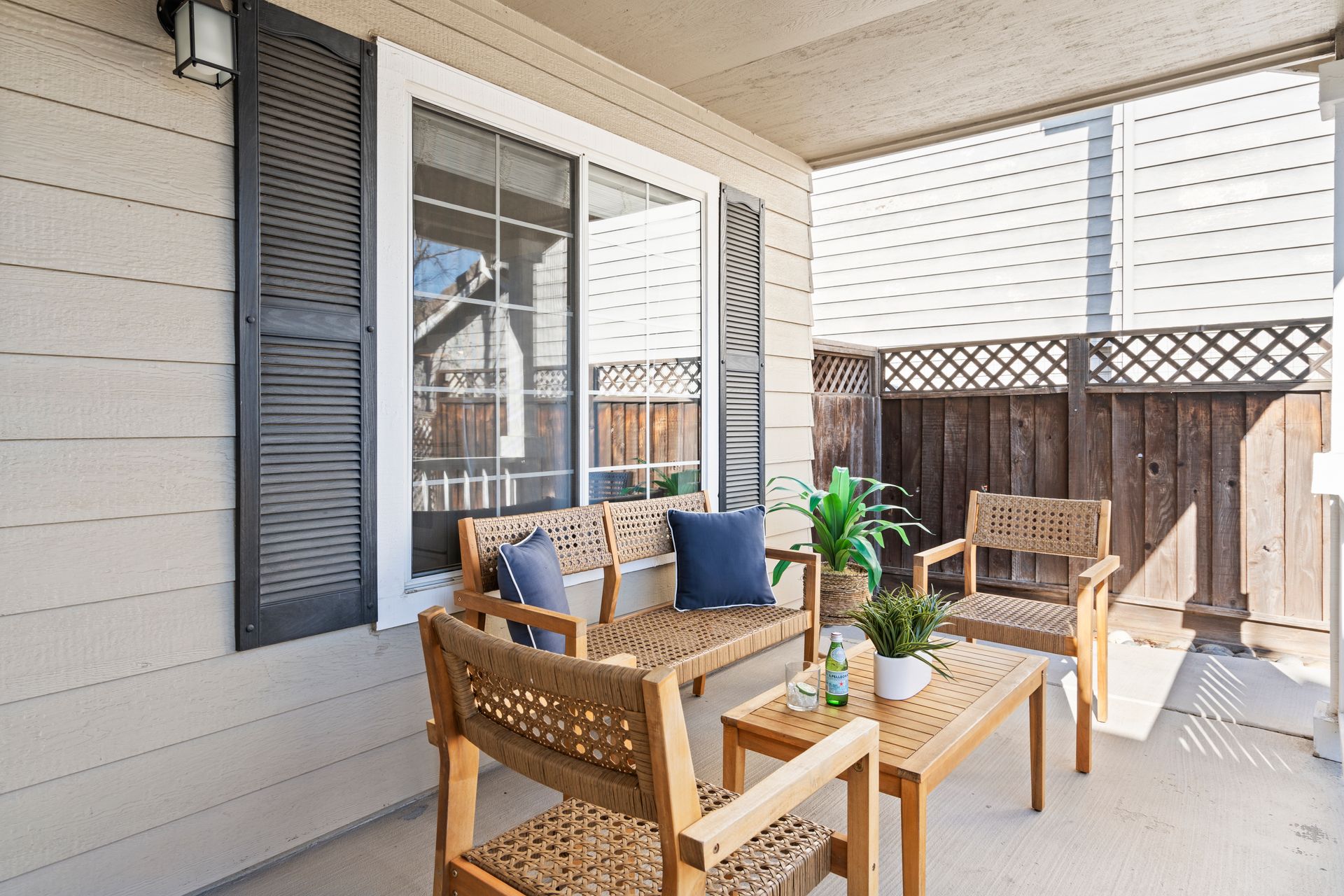 The property features a welcoming front porch providing a comfortable outdoor space and the backyard is generous and private, with a patio area ideal for relaxation or outdoor gatherings.