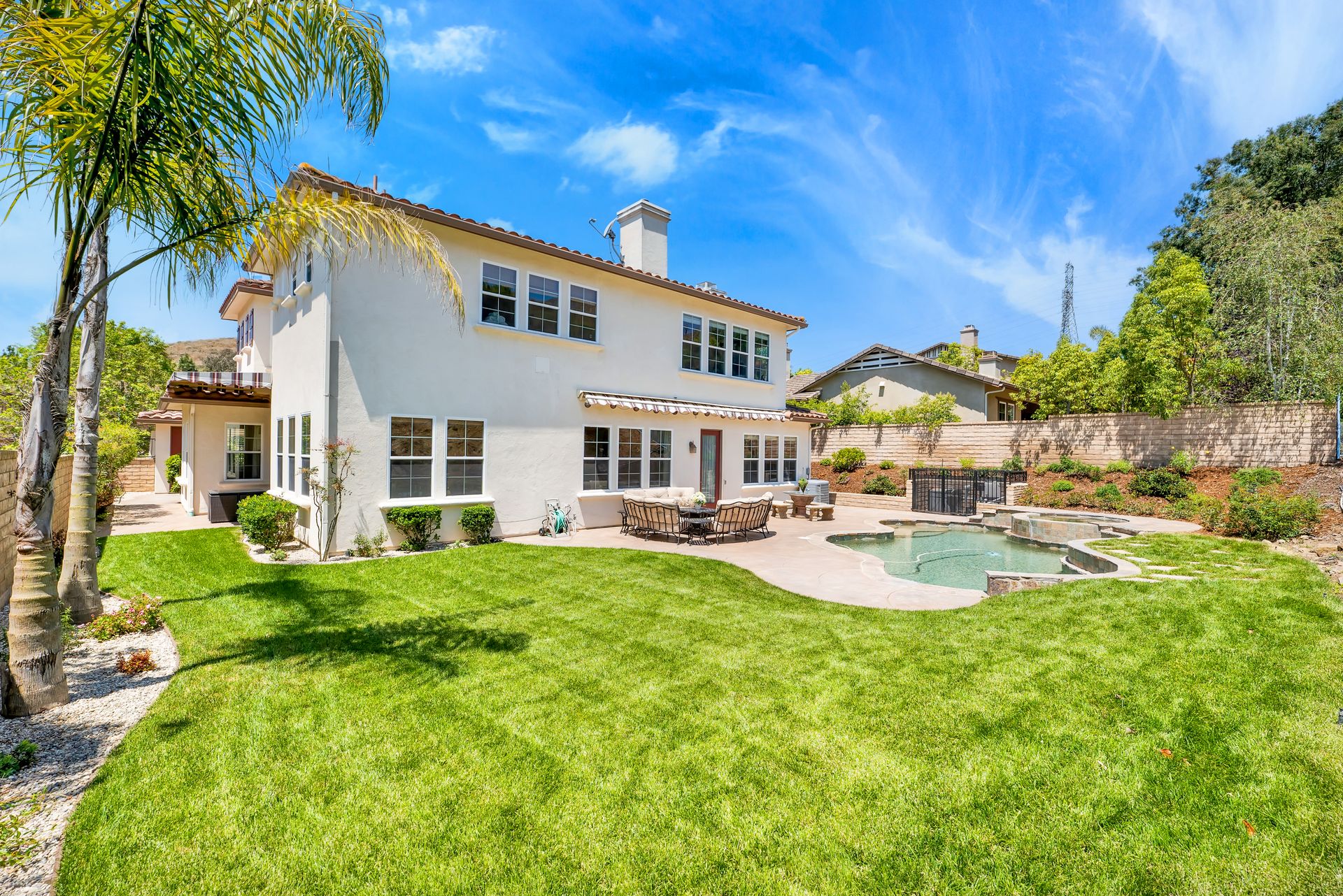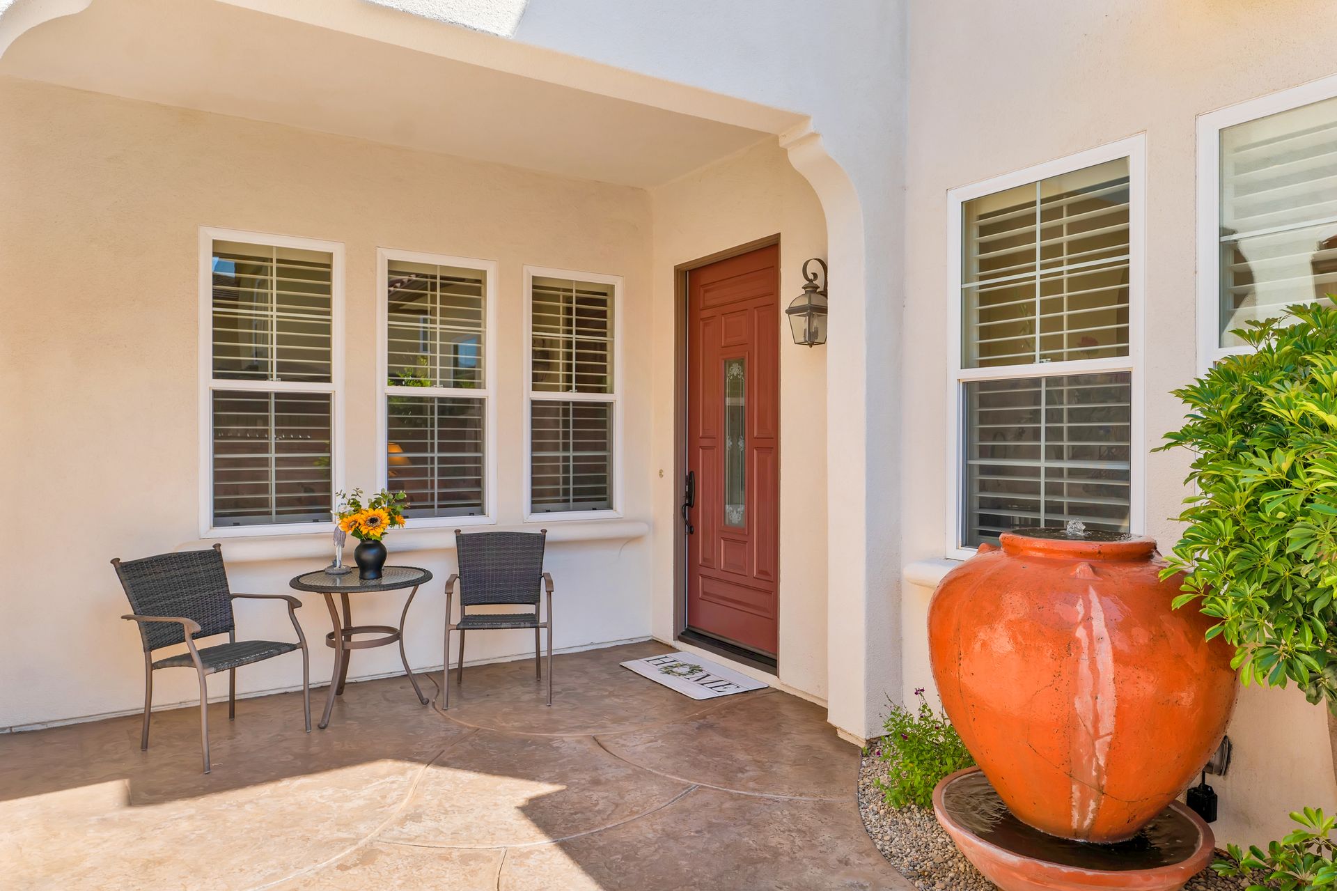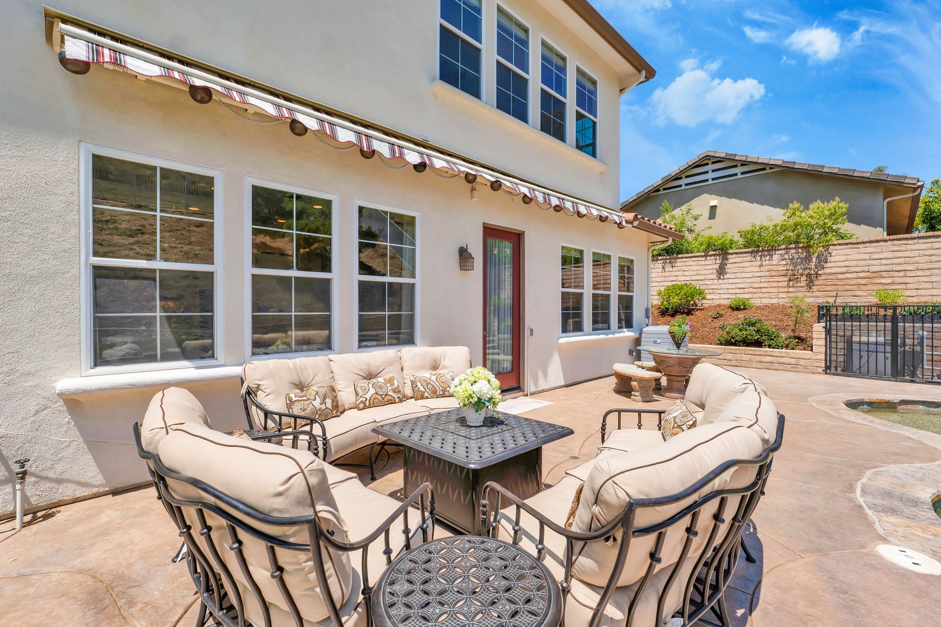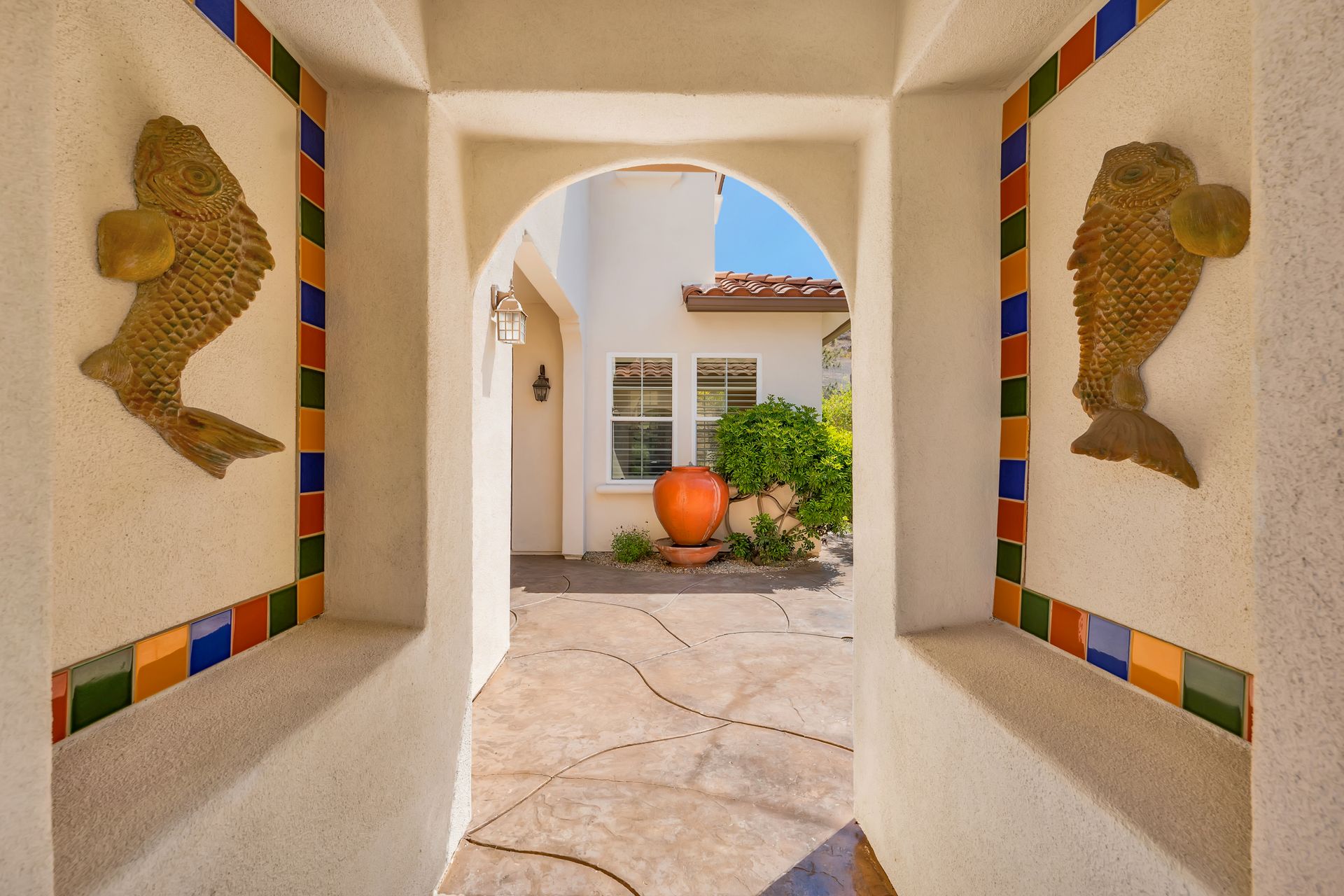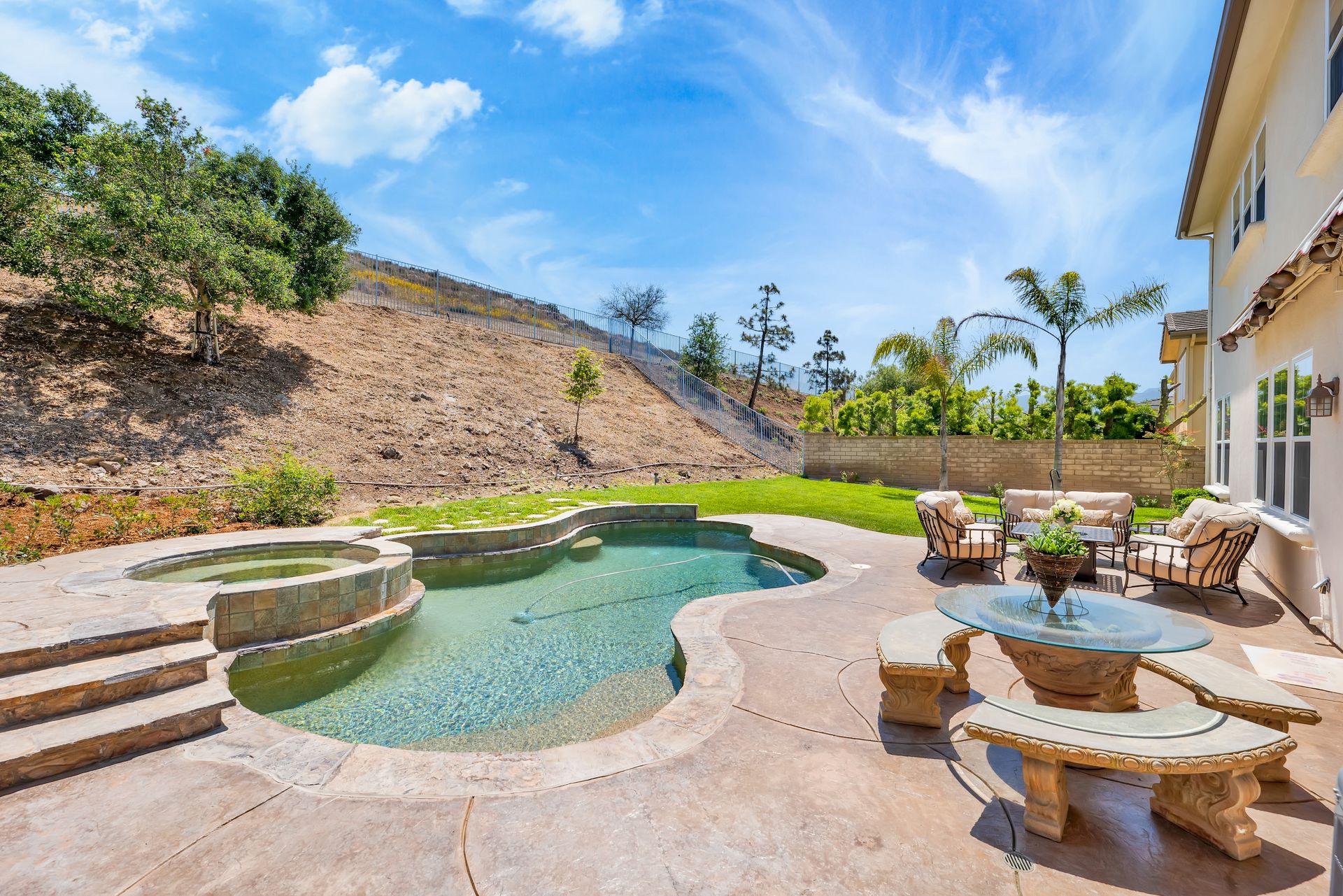 Stunning Highly Upgraded Dos Vientos Pool Home with Five Bedrooms, a Bonus Room, a Music Room/Office, four and one-half baths, and approximately 4,124 square feet. A gated courtyard with a soothing fountain welcomes you to this gorgeous home! The elegant living room has a fireplace and plantation shutters. The formal dining room has high ceilings. The upgraded gourmet kitchen offers quartz counters, a large island, stainless steel appliances, a walk-in pantry, and a family eating area. The family room offers a built-in entertainment center, fireplace, and large windows opening to the backyard. Downstairs, there is a bedroom with an en-suite bath and a music room/office. Additionally, there is a powder room with a pedestal sink on the first floor. Upstairs is a huge Bonus room with built-in desks and shelves that could be a theater room. The luxurious primary bedroom suite has a fireplace, double crown molding, tray ceilings, and tall windows with views of the beautiful backyard, pool, and hills beyond. The lavish en-suite primary bath features dual vanities and sinks, a spa tub, a separate shower, and two walk-in closets. Additionally, there are three bedrooms upstairs, one with an en-suite bath. The upstairs laundry room has a utility sink and cabinets. Upgrades include crown molding, plantation shutters, wood flooring with inlaid mosaic marble, upgraded neutral carpeting, a recently painted interior, recessed lighting, dual paned windows, and a fully owned Solar system. The three-car garage has an automatic opener. The fabulous private yard features a sparkling Pebble Tec, saltwater pool and spa, an inviting stamped-colored concrete patio for entertaining with an electric retractable awning, and a large grassy area.