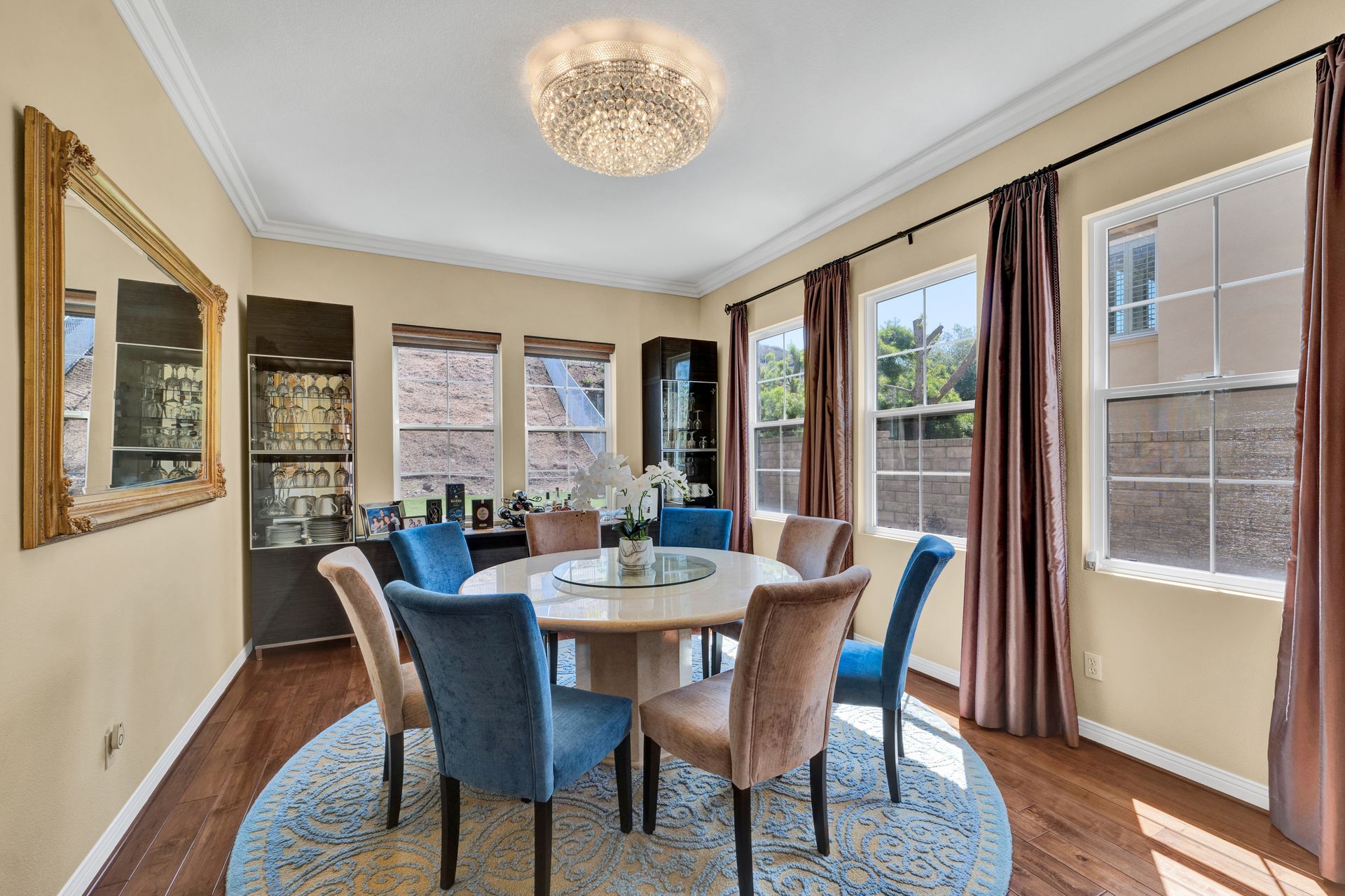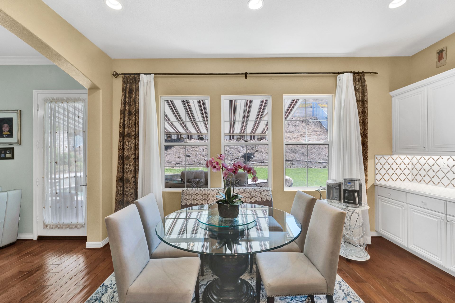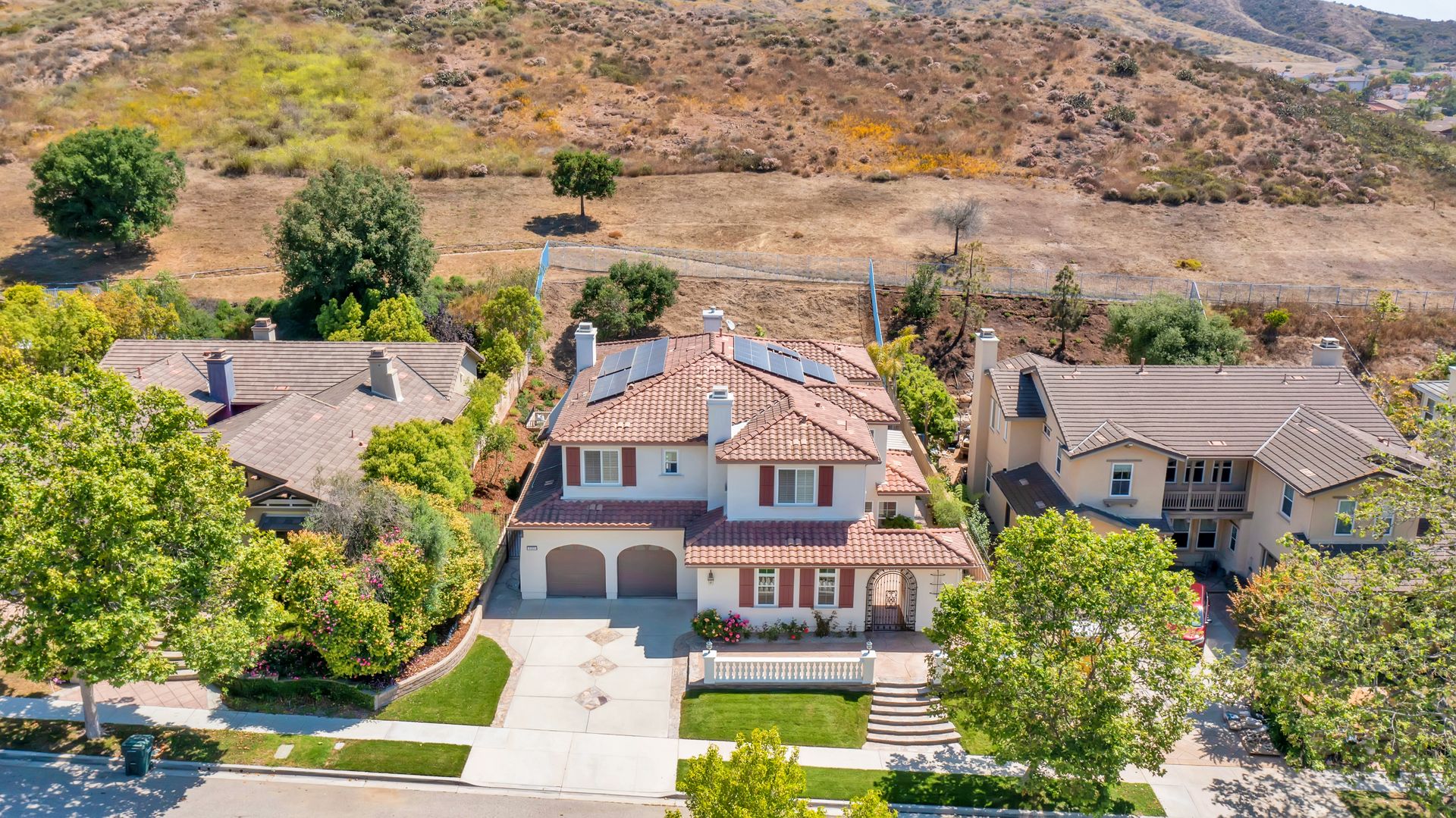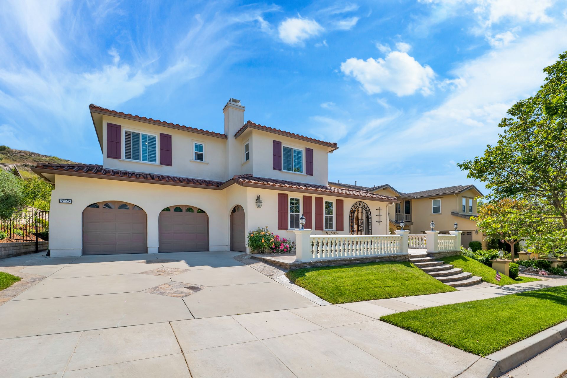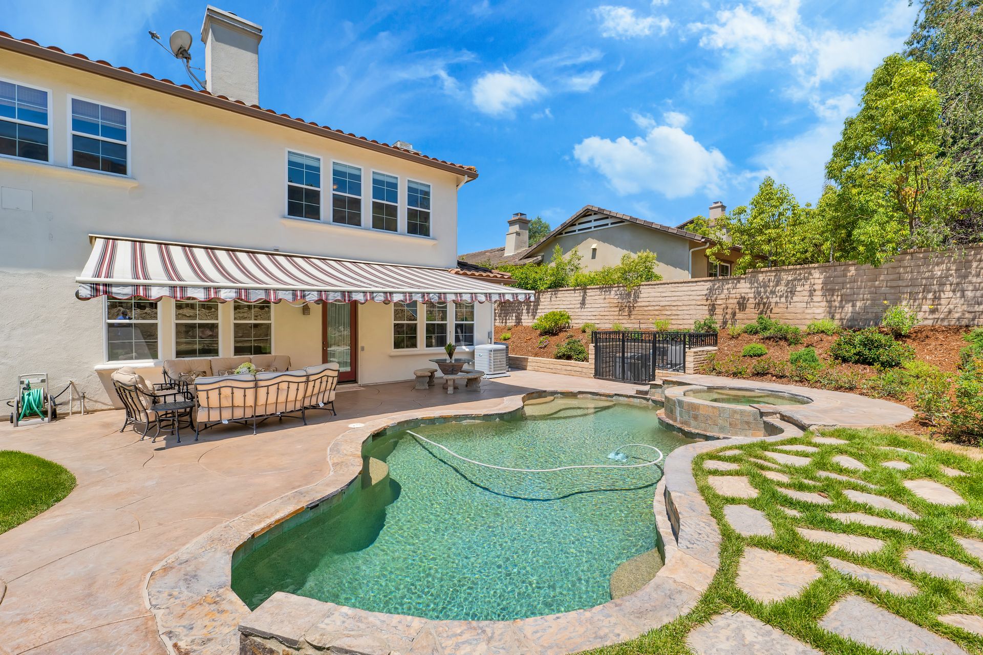 Stunning Highly Upgraded Dos Vientos Pool Home with Five Bedrooms, a Bonus Room, a Music Room/Office, four and one-half baths, and approximately 4,124 square feet. A gated courtyard with a soothing fountain welcomes you to this gorgeous home! The elegant living room has a fireplace and plantation shutters. The formal dining room has high ceilings. The upgraded gourmet kitchen offers quartz counters, a large island, stainless steel appliances, a walk-in pantry, and a family eating area. The family room offers a built-in entertainment center, fireplace, and large windows opening to the backyard. Downstairs, there is a bedroom with an en-suite bath and a music room/office. Additionally, there is a powder room with a pedestal sink on the first floor. Upstairs is a huge Bonus room with built-in desks and shelves that could be a theater room. The luxurious primary bedroom suite has a fireplace, double crown molding, tray ceilings, and tall windows with views of the beautiful backyard, pool, and hills beyond. The lavish en-suite primary bath features dual vanities and sinks, a spa tub, a separate shower, and two walk-in closets. Additionally, there are three bedrooms upstairs, one with an en-suite bath. The upstairs laundry room has a utility sink and cabinets. Upgrades include crown molding, plantation shutters, wood flooring with inlaid mosaic marble, upgraded neutral carpeting, a recently painted interior, recessed lighting, dual paned windows, and a fully owned Solar system. The three-car garage has an automatic opener. The fabulous private yard features a sparkling Pebble Tec, saltwater pool and spa, an inviting stamped-colored concrete patio for entertaining with an electric retractable awning, and a large grassy area.