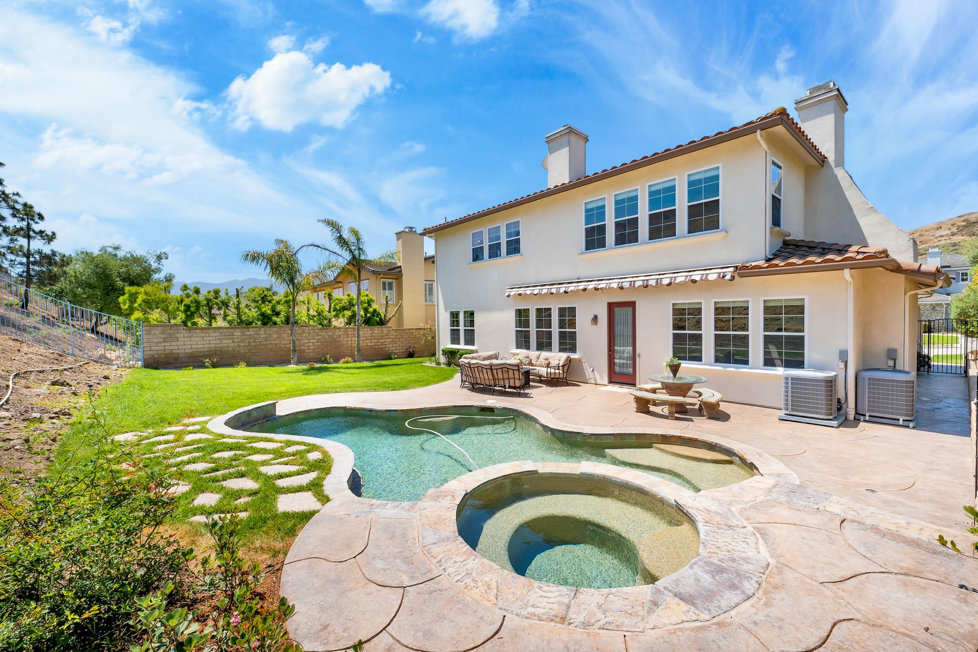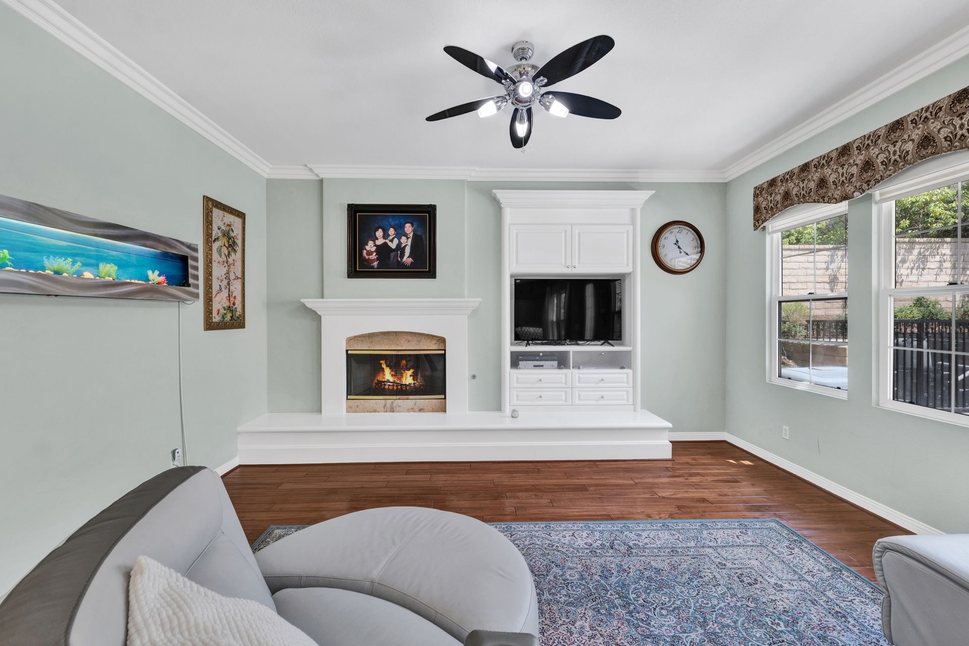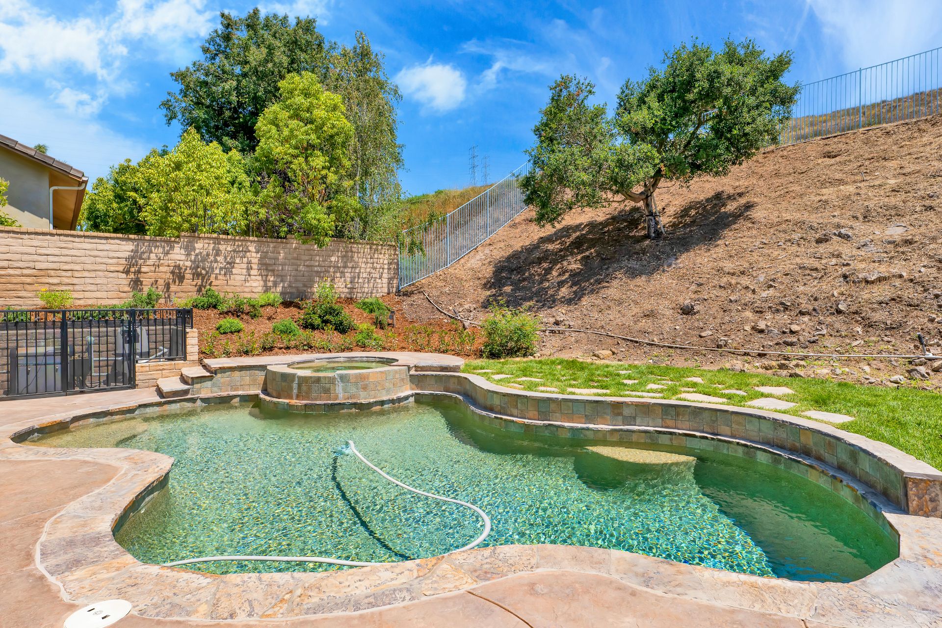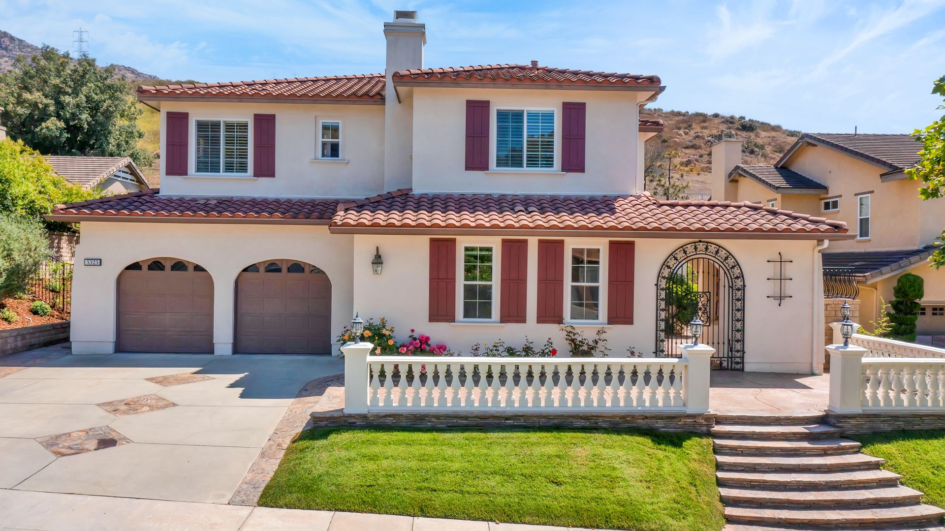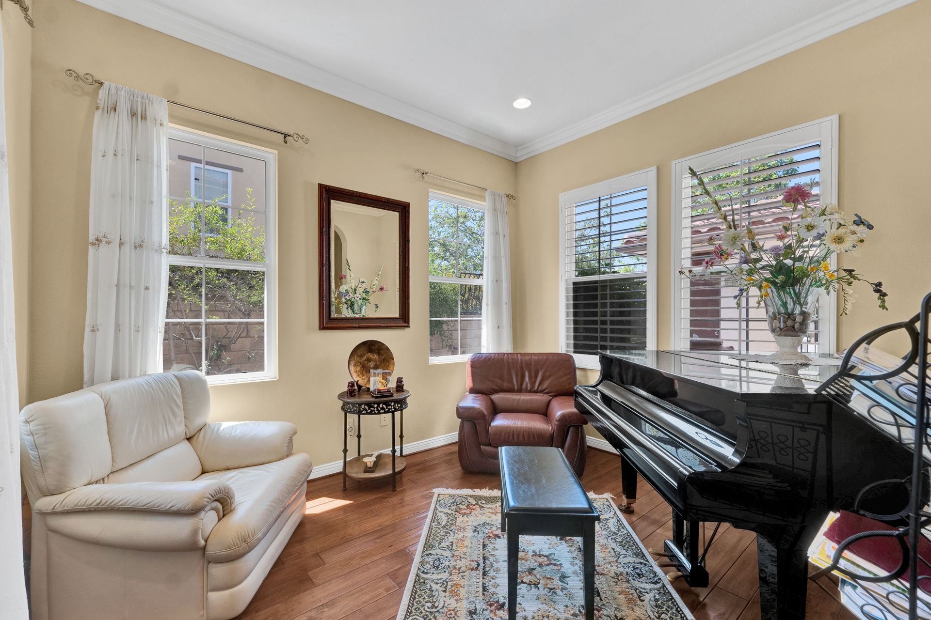 Stunning Highly Upgraded Dos Vientos Pool Home with Five Bedrooms, a Bonus Room, a Music Room/Office, four and one-half baths, and approximately 4,124 square feet. A gated courtyard with a soothing fountain welcomes you to this gorgeous home! The elegant living room has a fireplace and plantation shutters. The formal dining room has high ceilings. The upgraded gourmet kitchen offers quartz counters, a large island, stainless steel appliances, a walk-in pantry, and a family eating area. The family room offers a built-in entertainment center, fireplace, and large windows opening to the backyard. Downstairs, there is a bedroom with an en-suite bath and a music room/office. Additionally, there is a powder room with a pedestal sink on the first floor. Upstairs is a huge Bonus room with built-in desks and shelves that could be a theater room. The luxurious primary bedroom suite has a fireplace, double crown molding, tray ceilings, and tall windows with views of the beautiful backyard, pool, and hills beyond. The lavish en-suite primary bath features dual vanities and sinks, a spa tub, a separate shower, and two walk-in closets. Additionally, there are three bedrooms upstairs, one with an en-suite bath. The upstairs laundry room has a utility sink and cabinets. Upgrades include crown molding, plantation shutters, wood flooring with inlaid mosaic marble, upgraded neutral carpeting, a recently painted interior, recessed lighting, dual paned windows, and a fully owned Solar system. The three-car garage has an automatic opener. The fabulous private yard features a sparkling Pebble Tec, saltwater pool and spa, an inviting stamped-colored concrete patio for entertaining with an electric retractable awning, and a large grassy area.