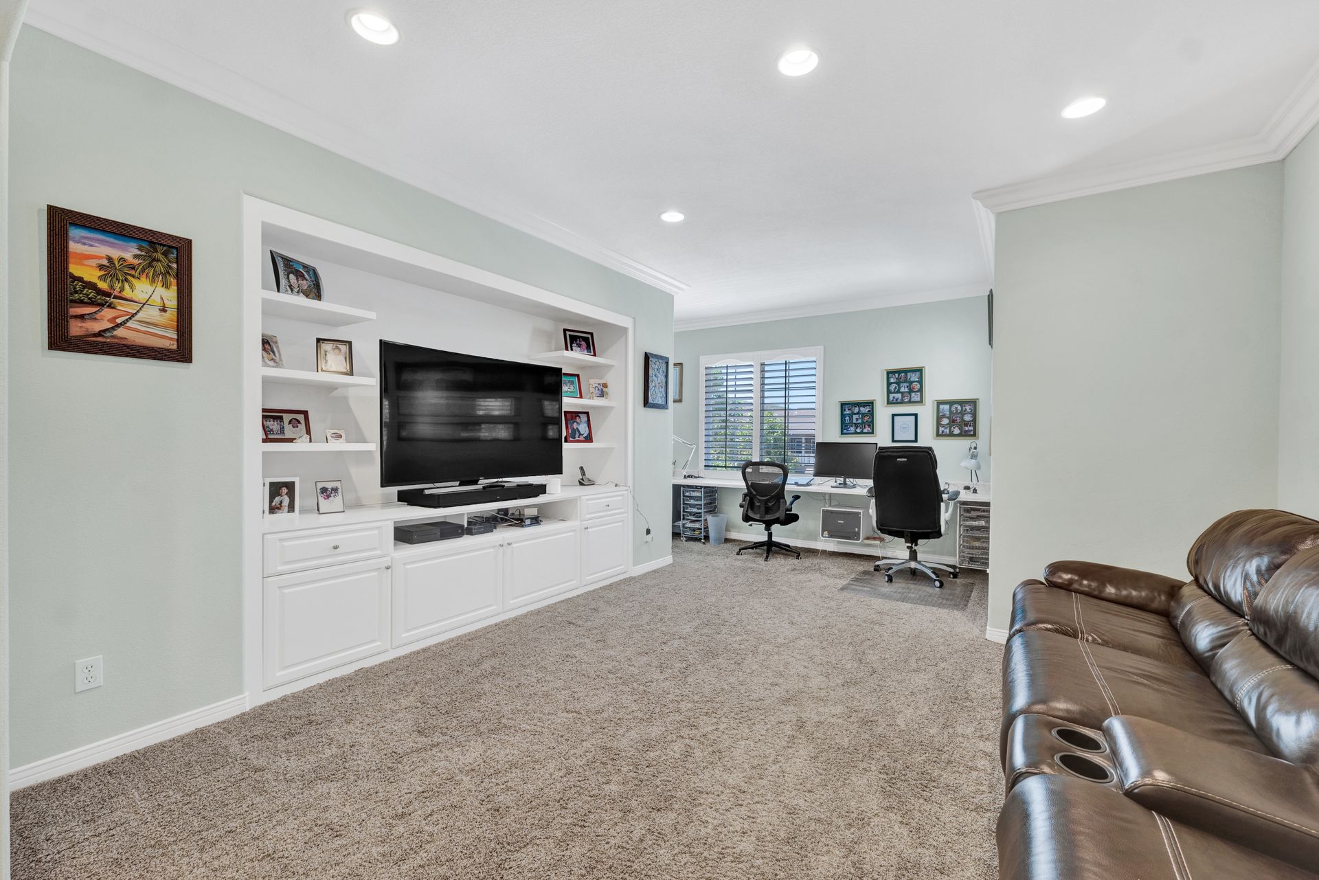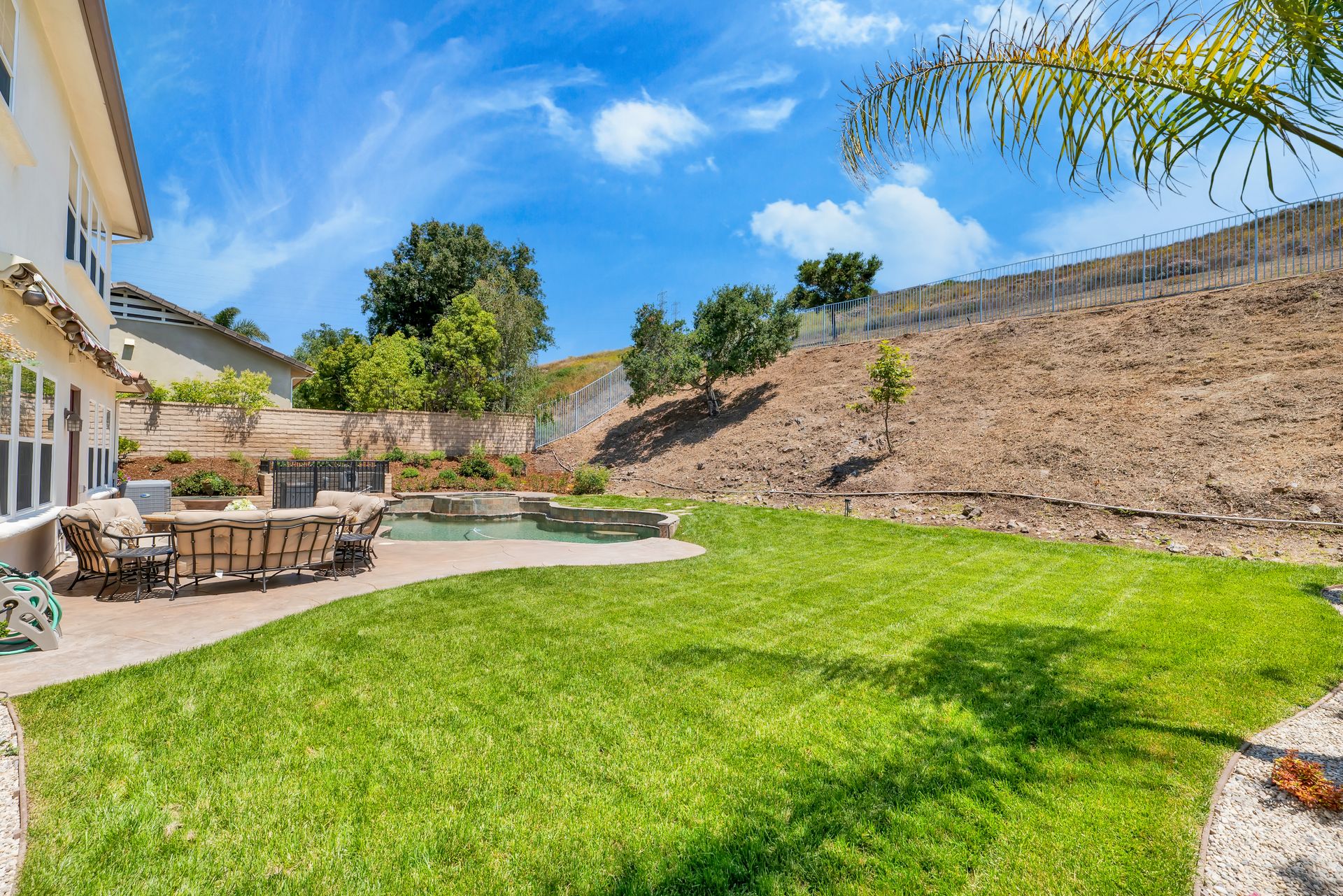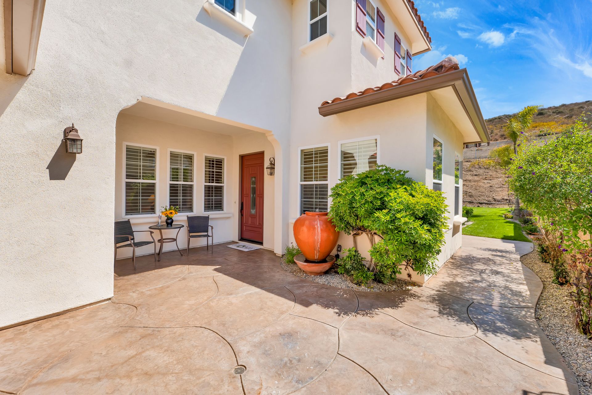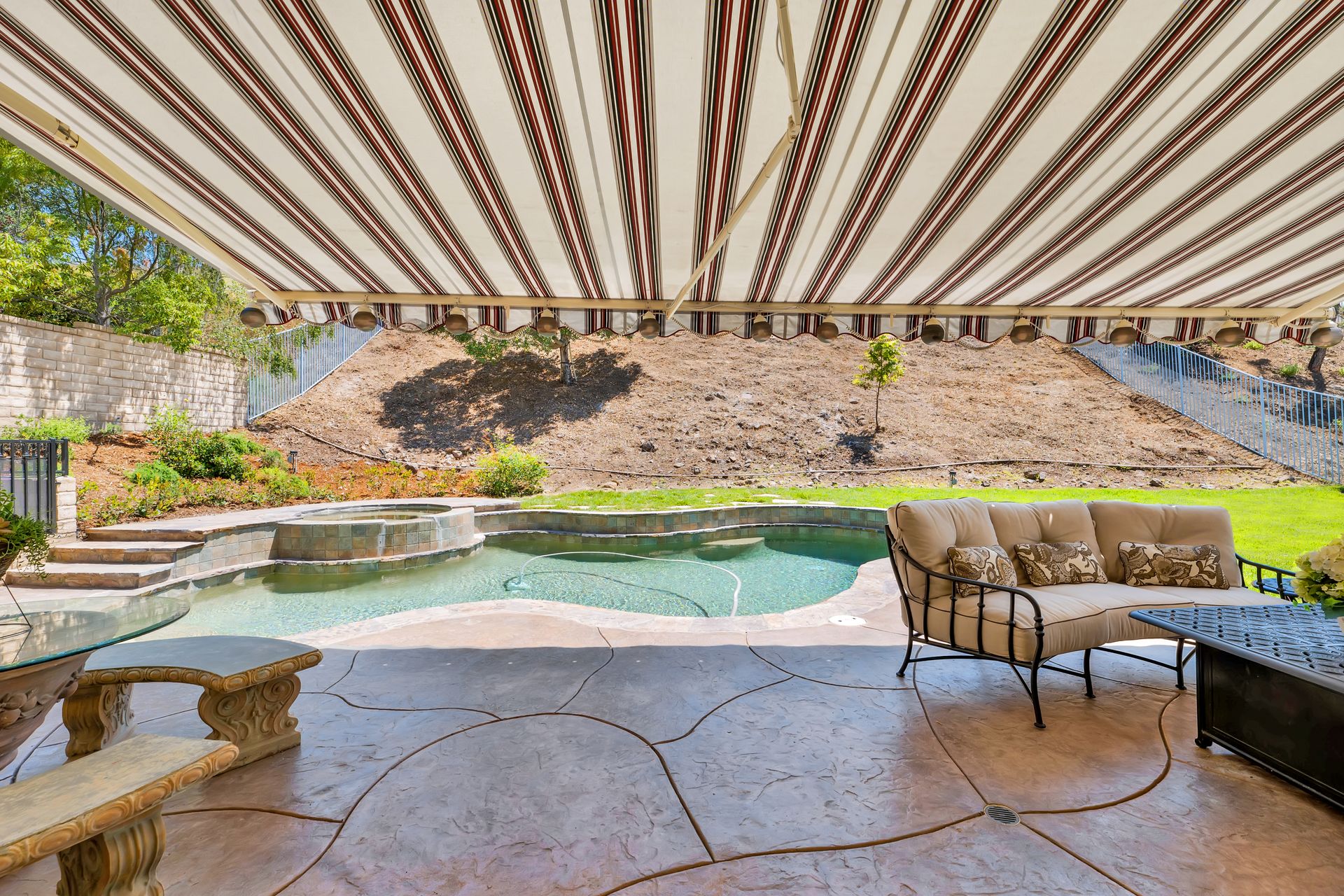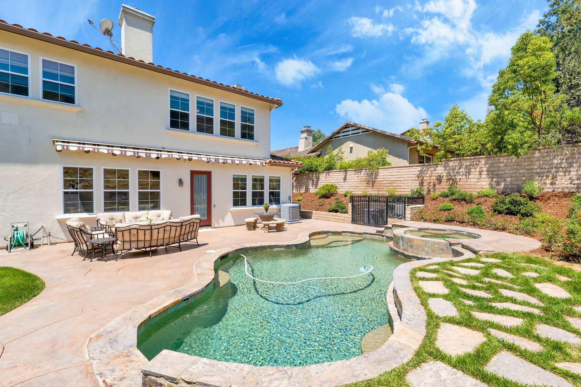 Stunning Highly Upgraded Dos Vientos Pool Home with Five Bedrooms, a Bonus Room, a Music Room/Office, four and one-half baths, and approximately 4,124 square feet. A gated courtyard with a soothing fountain welcomes you to this gorgeous home! The elegant living room has a fireplace and plantation shutters. The formal dining room has high ceilings. The upgraded gourmet kitchen offers quartz counters, a large island, stainless steel appliances, a walk-in pantry, and a family eating area. The family room offers a built-in entertainment center, fireplace, and large windows opening to the backyard. Downstairs, there is a bedroom with an en-suite bath and a music room/office. Additionally, there is a powder room with a pedestal sink on the first floor. Upstairs is a huge Bonus room with built-in desks and shelves that could be a theater room. The luxurious primary bedroom suite has a fireplace, double crown molding, tray ceilings, and tall windows with views of the beautiful backyard, pool, and hills beyond. The lavish en-suite primary bath features dual vanities and sinks, a spa tub, a separate shower, and two walk-in closets. Additionally, there are three bedrooms upstairs, one with an en-suite bath. The upstairs laundry room has a utility sink and cabinets. Upgrades include crown molding, plantation shutters, wood flooring with inlaid mosaic marble, upgraded neutral carpeting, a recently painted interior, recessed lighting, dual paned windows, and a fully owned Solar system. The three-car garage has an automatic opener. The fabulous private yard features a sparkling Pebble Tec, saltwater pool and spa, an inviting stamped-colored concrete patio for entertaining with an electric retractable awning, and a large grassy area.