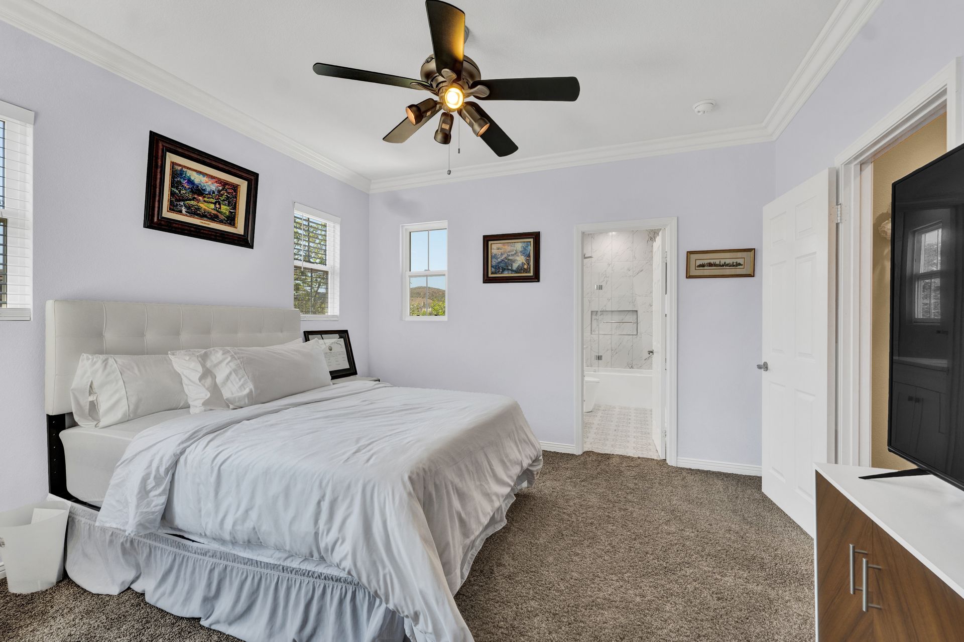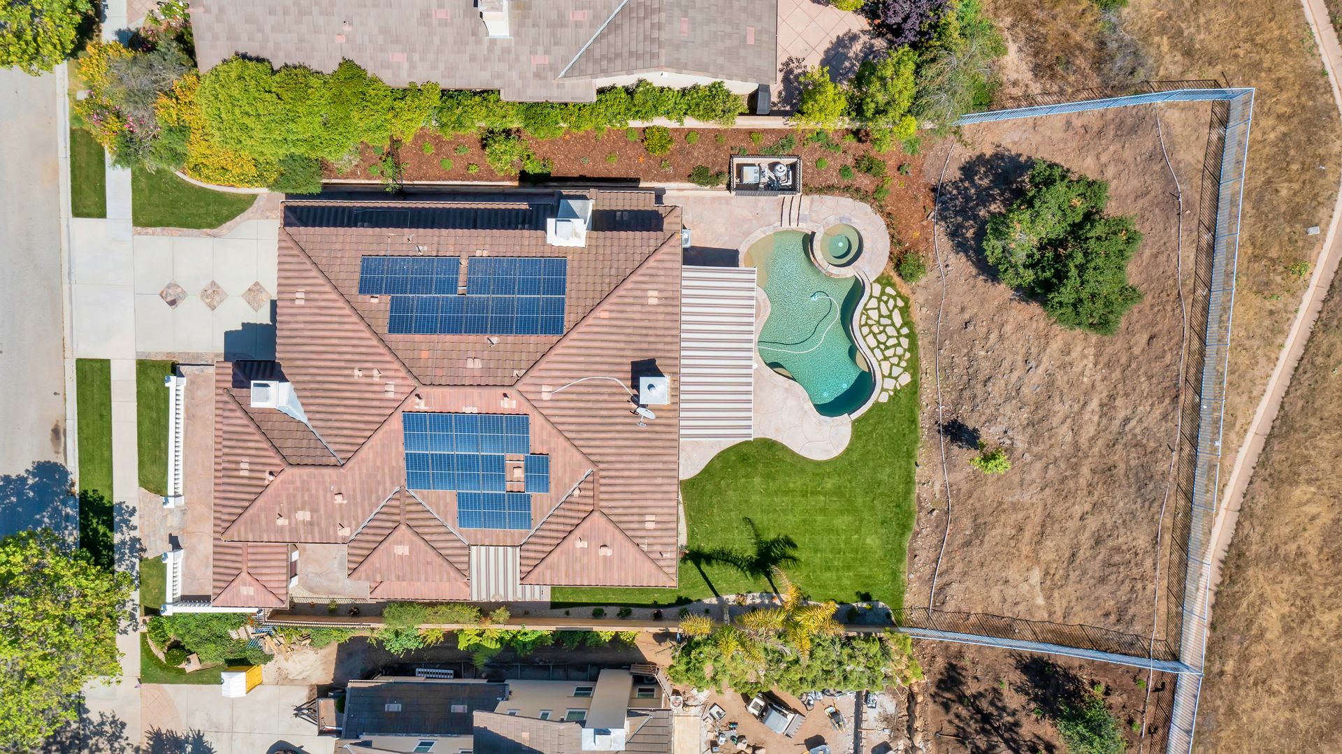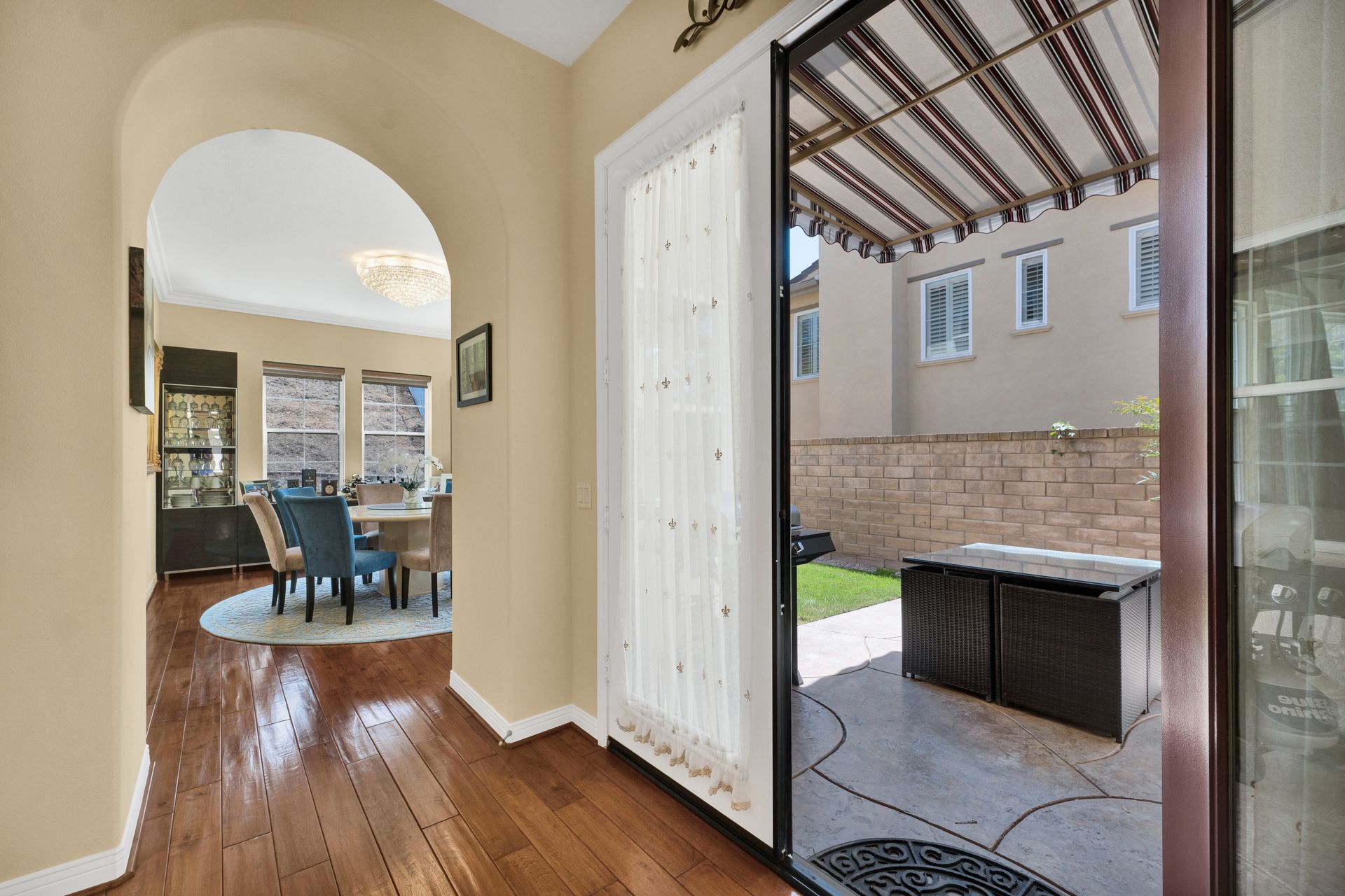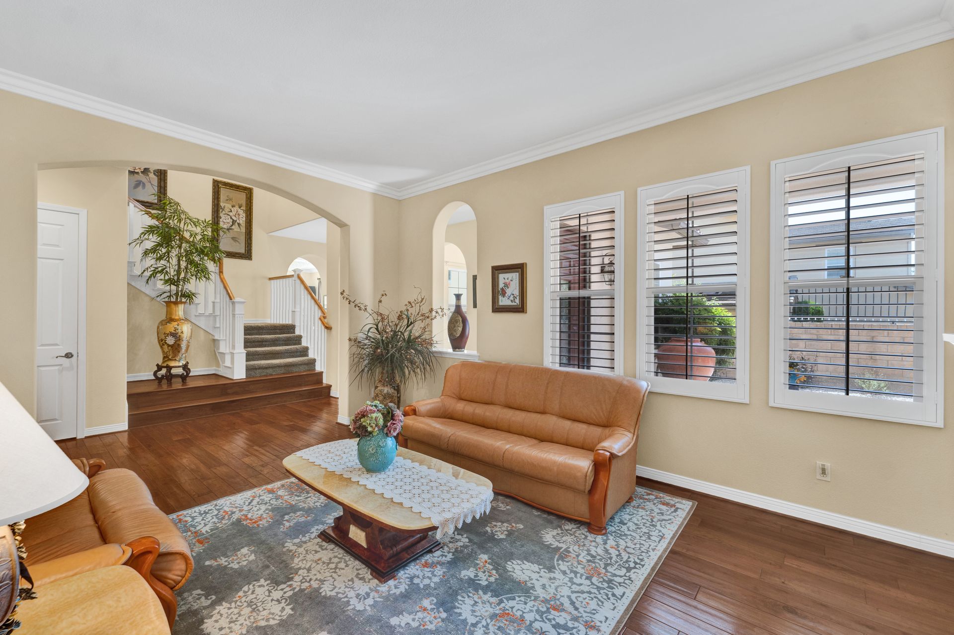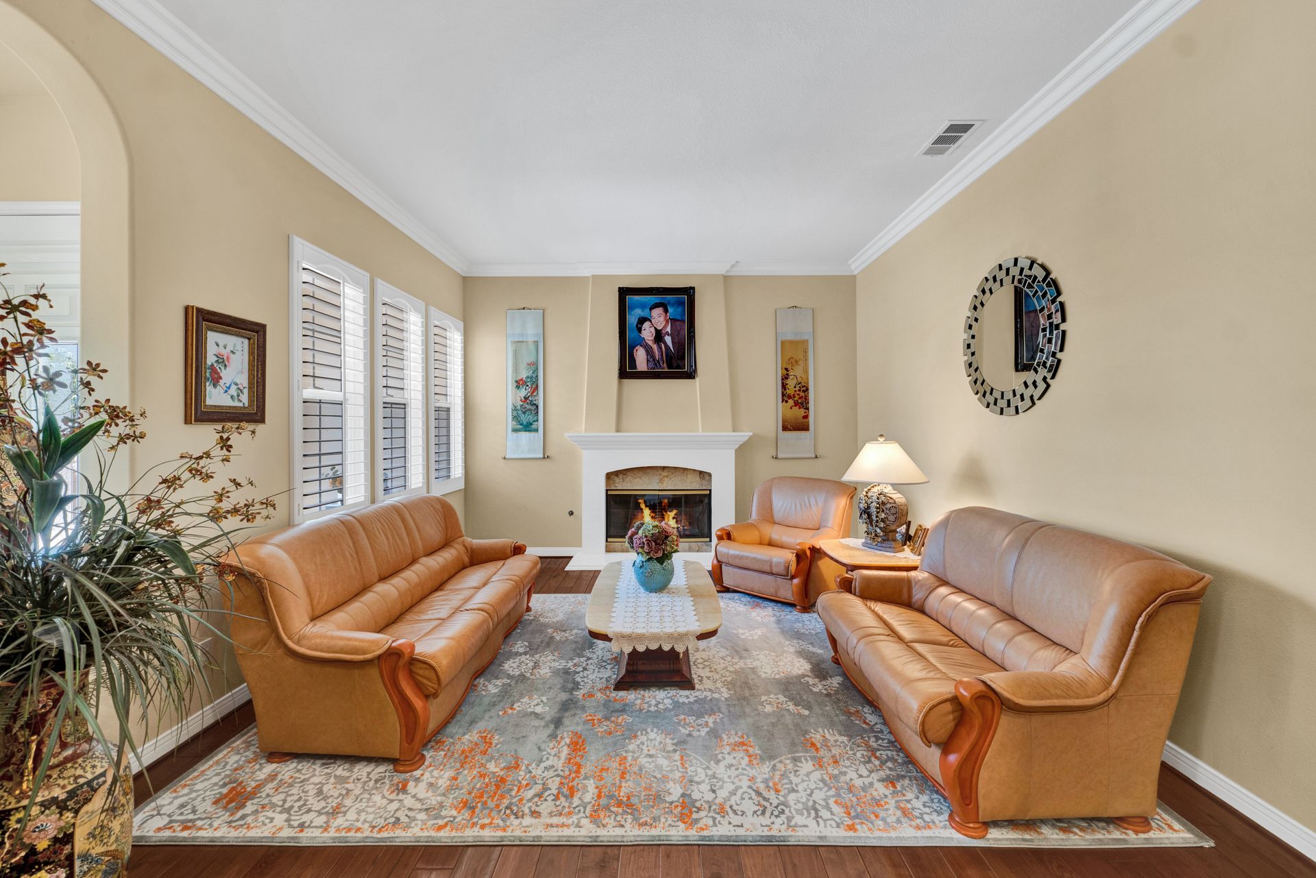 Stunning Highly Upgraded Dos Vientos Pool Home with Five Bedrooms, a Bonus Room, a Music Room/Office, four and one-half baths, and approximately 4,124 square feet. A gated courtyard with a soothing fountain welcomes you to this gorgeous home! The elegant living room has a fireplace and plantation shutters. The formal dining room has high ceilings. The upgraded gourmet kitchen offers quartz counters, a large island, stainless steel appliances, a walk-in pantry, and a family eating area. The family room offers a built-in entertainment center, fireplace, and large windows opening to the backyard. Downstairs, there is a bedroom with an en-suite bath and a music room/office. Additionally, there is a powder room with a pedestal sink on the first floor. Upstairs is a huge Bonus room with built-in desks and shelves that could be a theater room. The luxurious primary bedroom suite has a fireplace, double crown molding, tray ceilings, and tall windows with views of the beautiful backyard, pool, and hills beyond. The lavish en-suite primary bath features dual vanities and sinks, a spa tub, a separate shower, and two walk-in closets. Additionally, there are three bedrooms upstairs, one with an en-suite bath. The upstairs laundry room has a utility sink and cabinets. Upgrades include crown molding, plantation shutters, wood flooring with inlaid mosaic marble, upgraded neutral carpeting, a recently painted interior, recessed lighting, dual paned windows, and a fully owned Solar system. The three-car garage has an automatic opener. The fabulous private yard features a sparkling Pebble Tec, saltwater pool and spa, an inviting stamped-colored concrete patio for entertaining with an electric retractable awning, and a large grassy area.