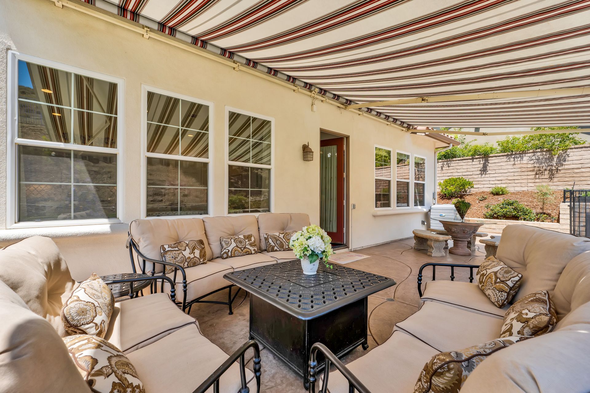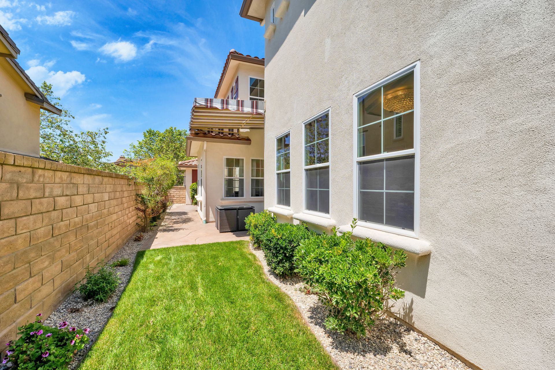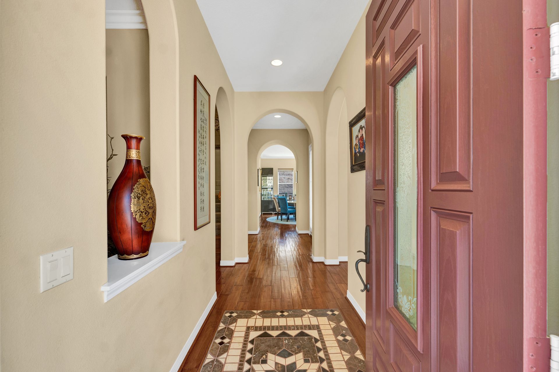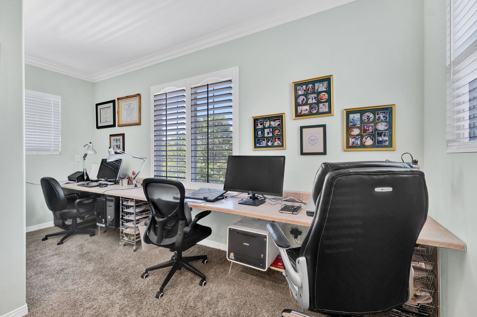 Stunning Highly Upgraded Dos Vientos Pool Home with Five Bedrooms, a Bonus Room, a Music Room/Office, four and one-half baths, and approximately 4,124 square feet. A gated courtyard with a soothing fountain welcomes you to this gorgeous home! The elegant living room has a fireplace and plantation shutters. The formal dining room has high ceilings. The upgraded gourmet kitchen offers quartz counters, a large island, stainless steel appliances, a walk-in pantry, and a family eating area. The family room offers a built-in entertainment center, fireplace, and large windows opening to the backyard. Downstairs, there is a bedroom with an en-suite bath and a music room/office. Additionally, there is a powder room with a pedestal sink on the first floor. Upstairs is a huge Bonus room with built-in desks and shelves that could be a theater room. The luxurious primary bedroom suite has a fireplace, double crown molding, tray ceilings, and tall windows with views of the beautiful backyard, pool, and hills beyond. The lavish en-suite primary bath features dual vanities and sinks, a spa tub, a separate shower, and two walk-in closets. Additionally, there are three bedrooms upstairs, one with an en-suite bath. The upstairs laundry room has a utility sink and cabinets. Upgrades include crown molding, plantation shutters, wood flooring with inlaid mosaic marble, upgraded neutral carpeting, a recently painted interior, recessed lighting, dual paned windows, and a fully owned Solar system. The three-car garage has an automatic opener. The fabulous private yard features a sparkling Pebble Tec, saltwater pool and spa, an inviting stamped-colored concrete patio for entertaining with an electric retractable awning, and a large grassy area.