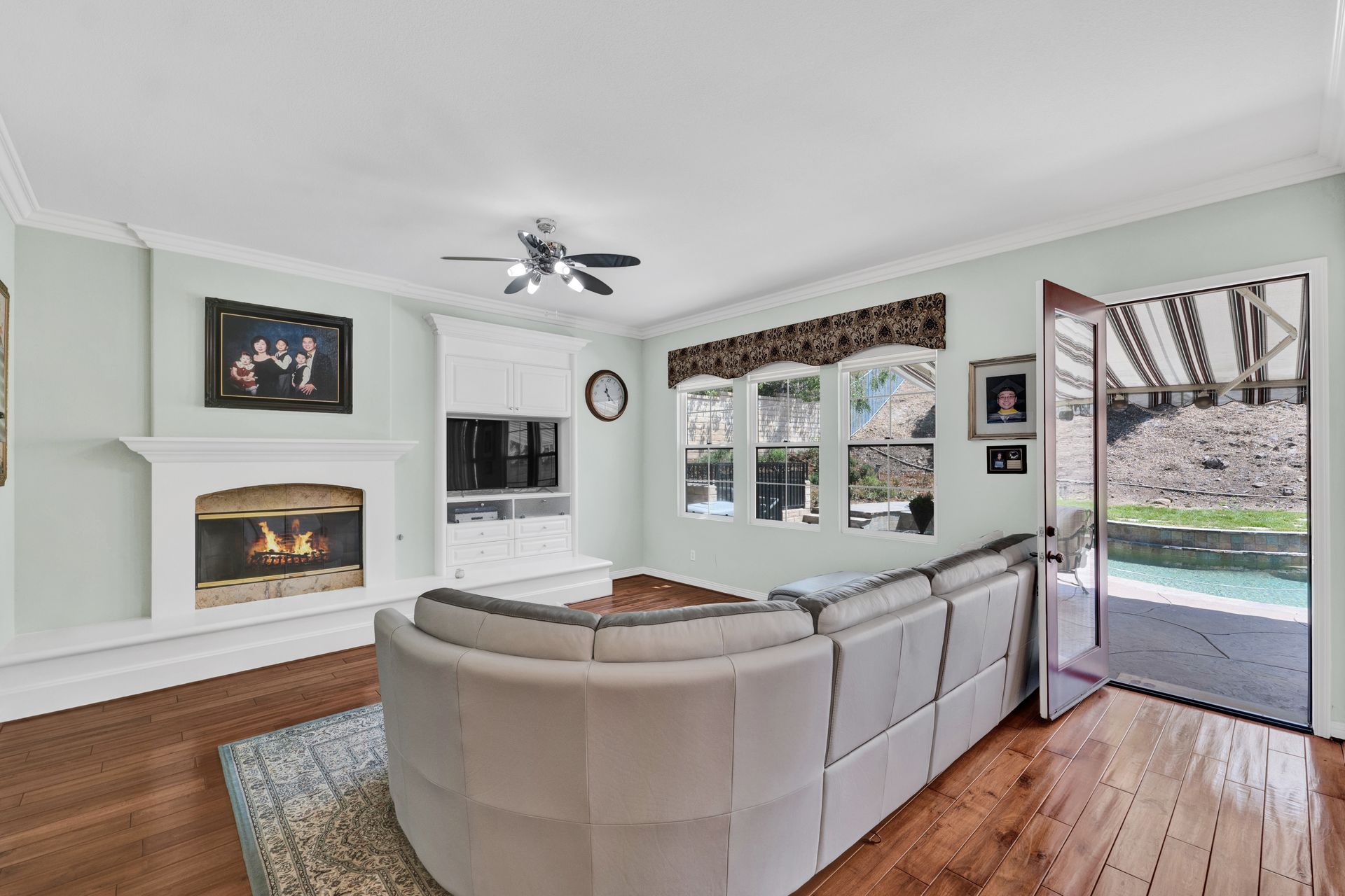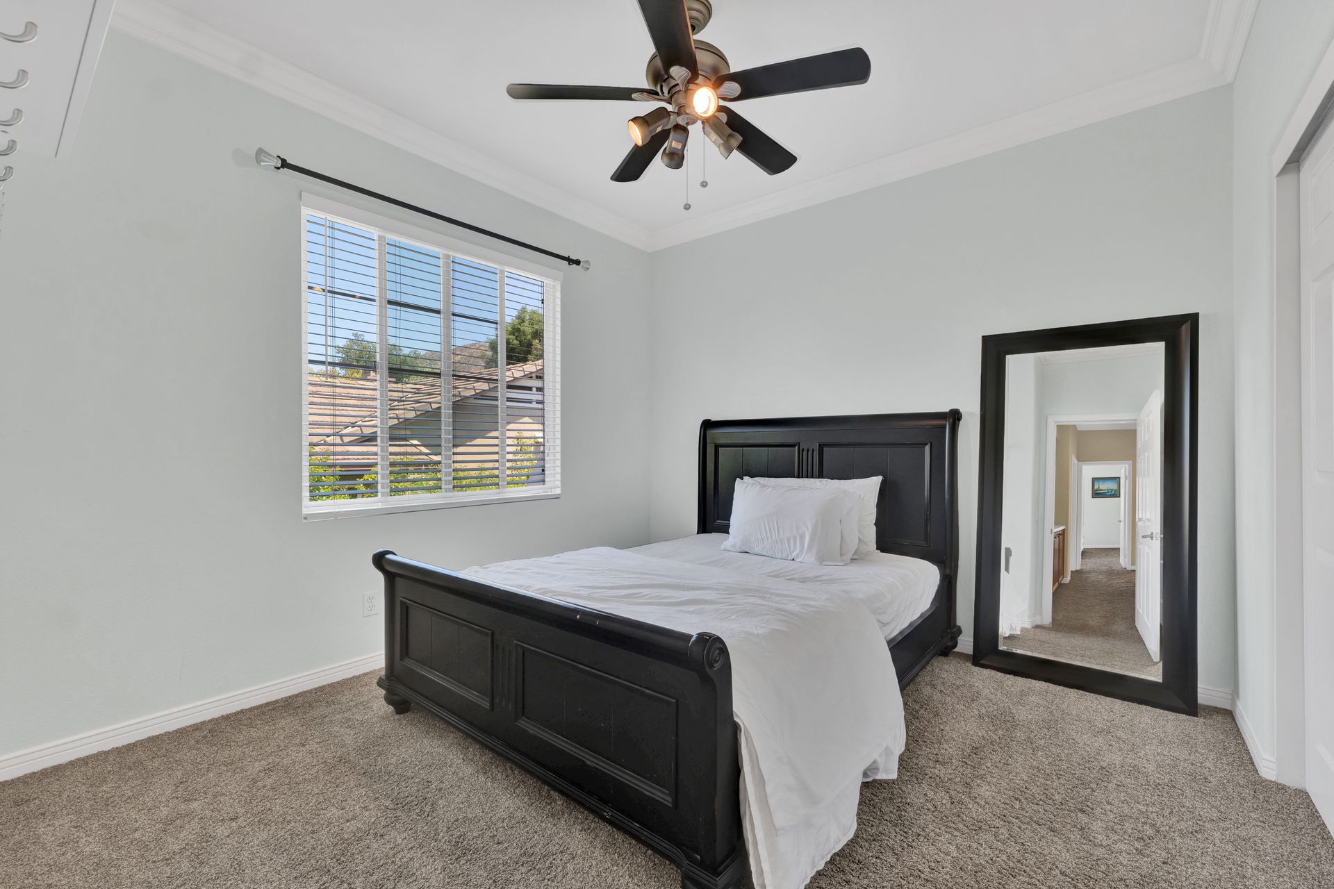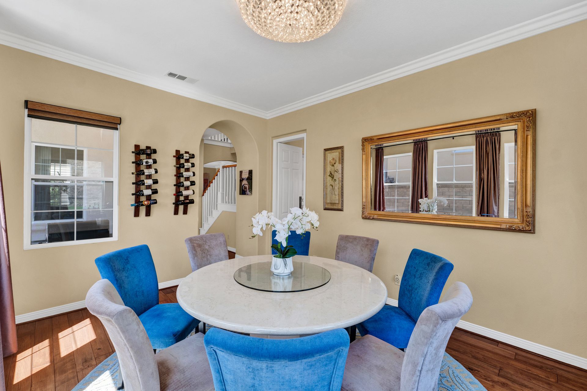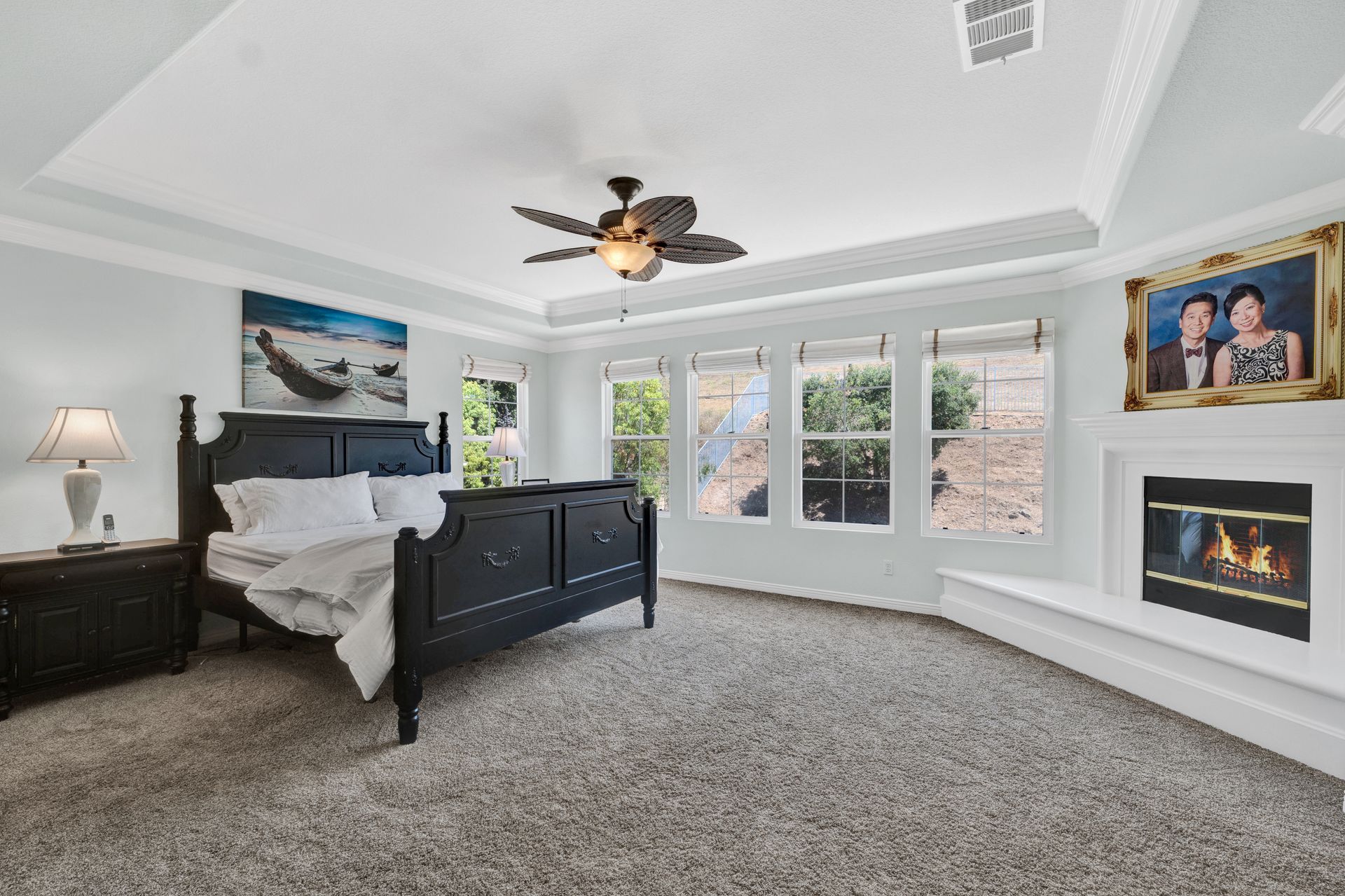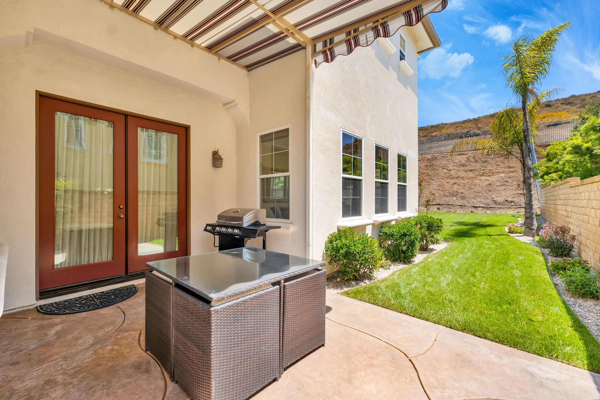 Stunning Highly Upgraded Dos Vientos Pool Home with Five Bedrooms, a Bonus Room, a Music Room/Office, four and one-half baths, and approximately 4,124 square feet. A gated courtyard with a soothing fountain welcomes you to this gorgeous home! The elegant living room has a fireplace and plantation shutters. The formal dining room has high ceilings. The upgraded gourmet kitchen offers quartz counters, a large island, stainless steel appliances, a walk-in pantry, and a family eating area. The family room offers a built-in entertainment center, fireplace, and large windows opening to the backyard. Downstairs, there is a bedroom with an en-suite bath and a music room/office. Additionally, there is a powder room with a pedestal sink on the first floor. Upstairs is a huge Bonus room with built-in desks and shelves that could be a theater room. The luxurious primary bedroom suite has a fireplace, double crown molding, tray ceilings, and tall windows with views of the beautiful backyard, pool, and hills beyond. The lavish en-suite primary bath features dual vanities and sinks, a spa tub, a separate shower, and two walk-in closets. Additionally, there are three bedrooms upstairs, one with an en-suite bath. The upstairs laundry room has a utility sink and cabinets. Upgrades include crown molding, plantation shutters, wood flooring with inlaid mosaic marble, upgraded neutral carpeting, a recently painted interior, recessed lighting, dual paned windows, and a fully owned Solar system. The three-car garage has an automatic opener. The fabulous private yard features a sparkling Pebble Tec, saltwater pool and spa, an inviting stamped-colored concrete patio for entertaining with an electric retractable awning, and a large grassy area.