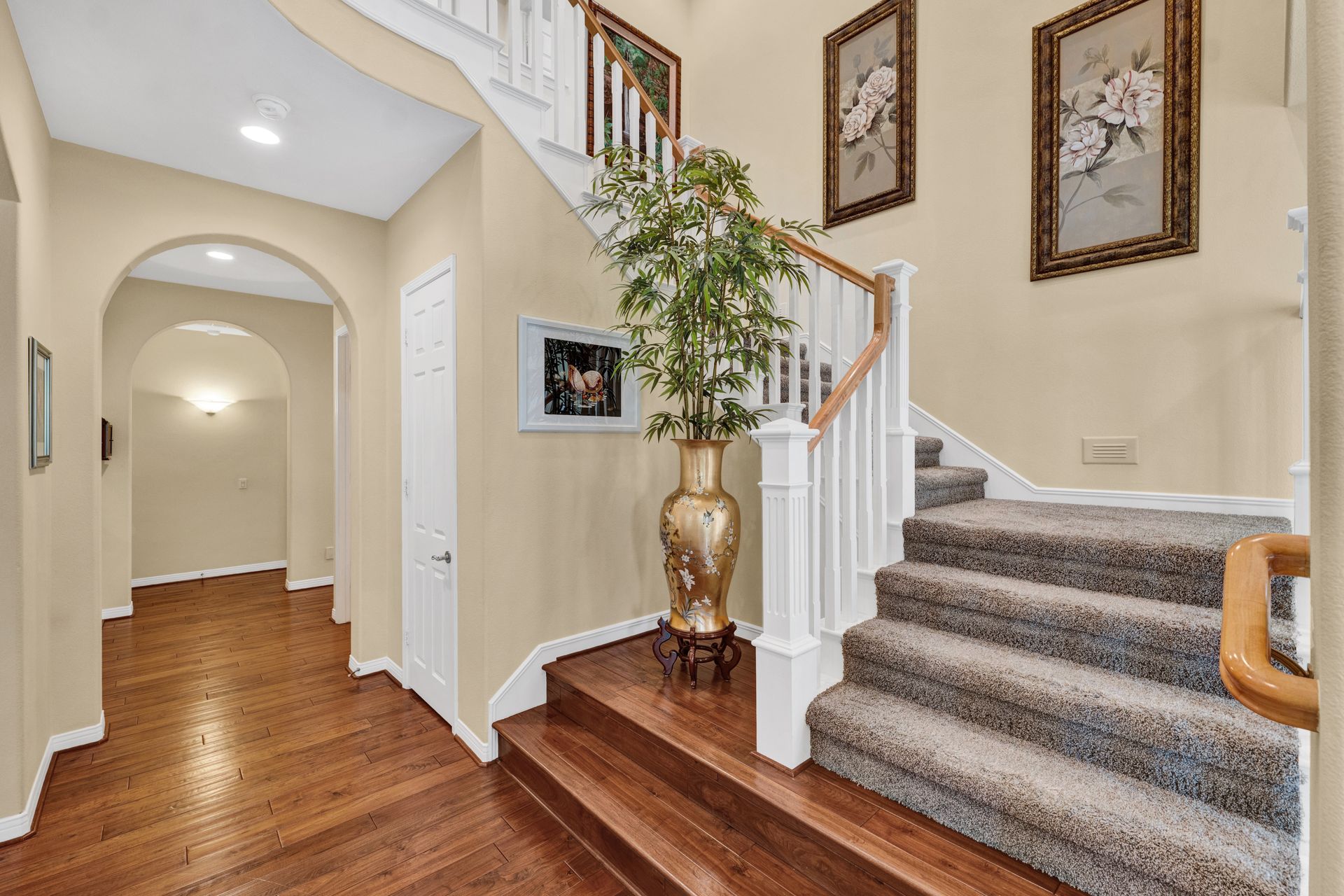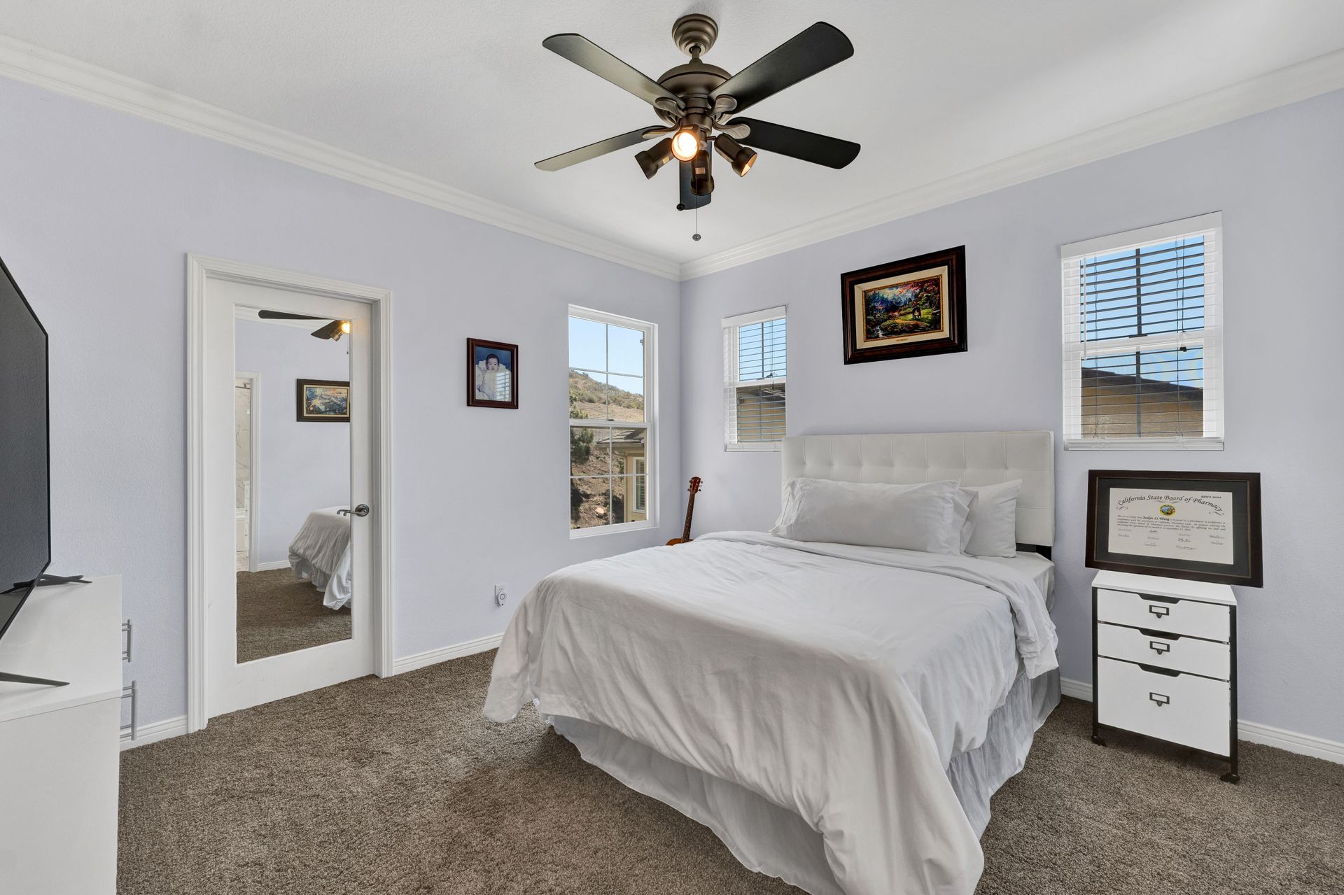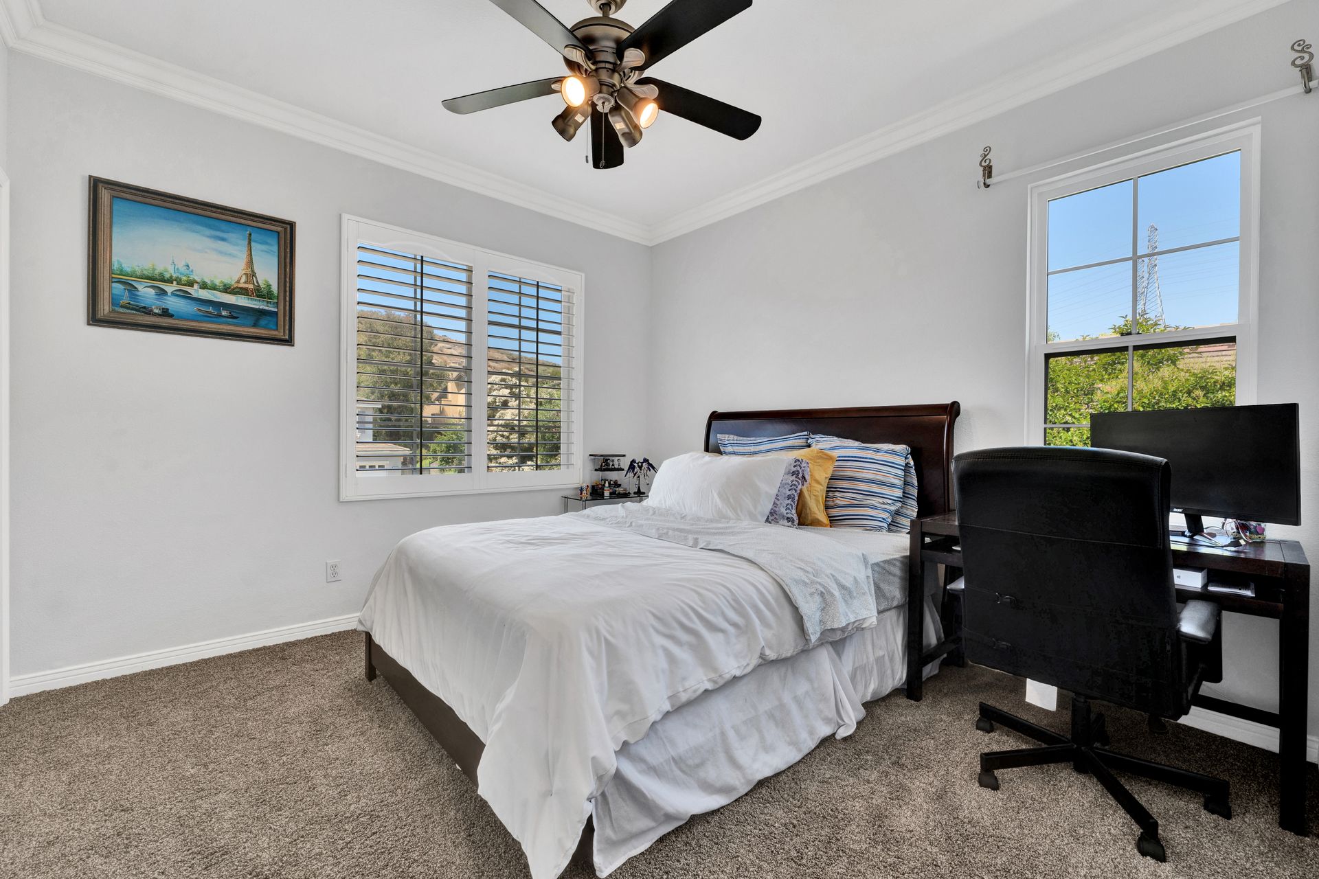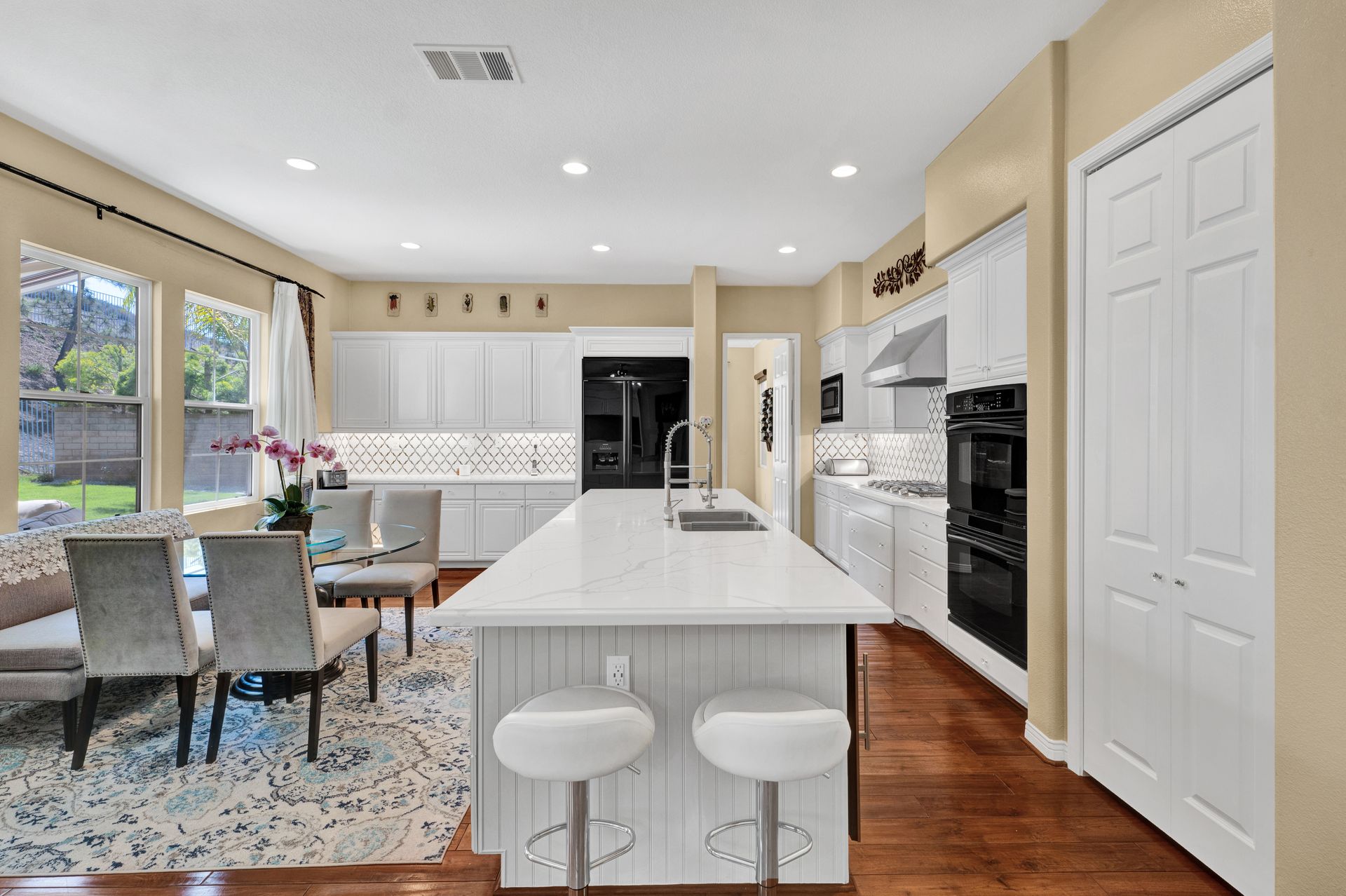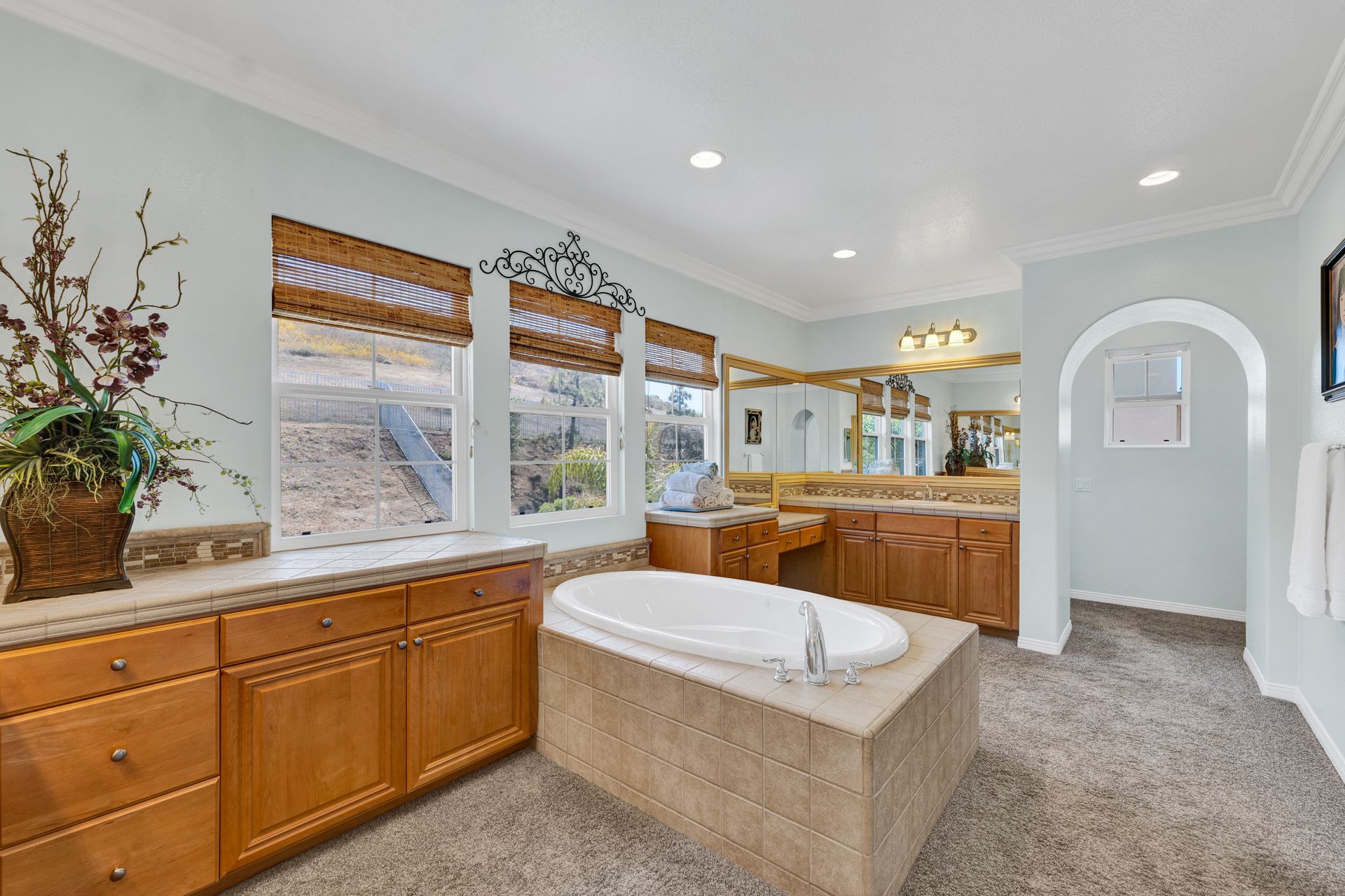 Stunning Highly Upgraded Dos Vientos Pool Home with Five Bedrooms, a Bonus Room, a Music Room/Office, four and one-half baths, and approximately 4,124 square feet. A gated courtyard with a soothing fountain welcomes you to this gorgeous home! The elegant living room has a fireplace and plantation shutters. The formal dining room has high ceilings. The upgraded gourmet kitchen offers quartz counters, a large island, stainless steel appliances, a walk-in pantry, and a family eating area. The family room offers a built-in entertainment center, fireplace, and large windows opening to the backyard. Downstairs, there is a bedroom with an en-suite bath and a music room/office. Additionally, there is a powder room with a pedestal sink on the first floor. Upstairs is a huge Bonus room with built-in desks and shelves that could be a theater room. The luxurious primary bedroom suite has a fireplace, double crown molding, tray ceilings, and tall windows with views of the beautiful backyard, pool, and hills beyond. The lavish en-suite primary bath features dual vanities and sinks, a spa tub, a separate shower, and two walk-in closets. Additionally, there are three bedrooms upstairs, one with an en-suite bath. The upstairs laundry room has a utility sink and cabinets. Upgrades include crown molding, plantation shutters, wood flooring with inlaid mosaic marble, upgraded neutral carpeting, a recently painted interior, recessed lighting, dual paned windows, and a fully owned Solar system. The three-car garage has an automatic opener. The fabulous private yard features a sparkling Pebble Tec, saltwater pool and spa, an inviting stamped-colored concrete patio for entertaining with an electric retractable awning, and a large grassy area.