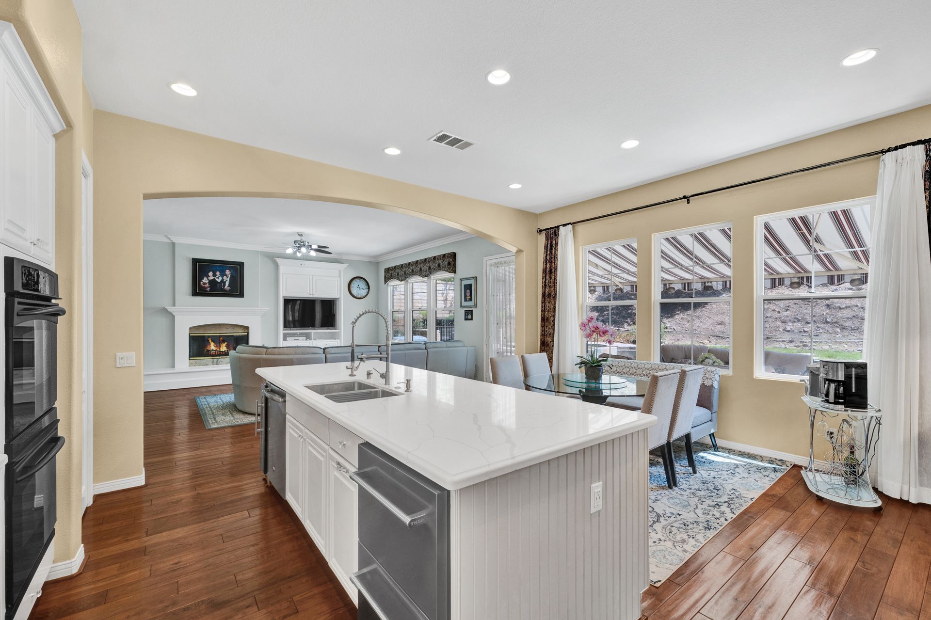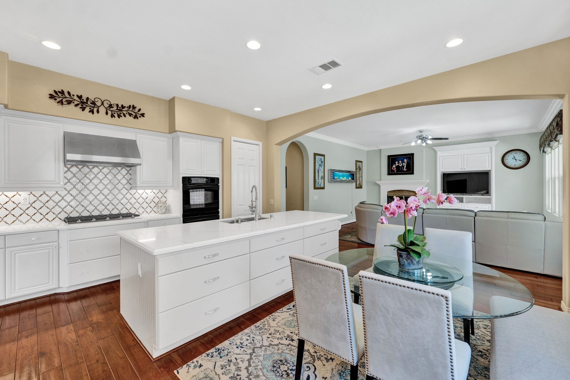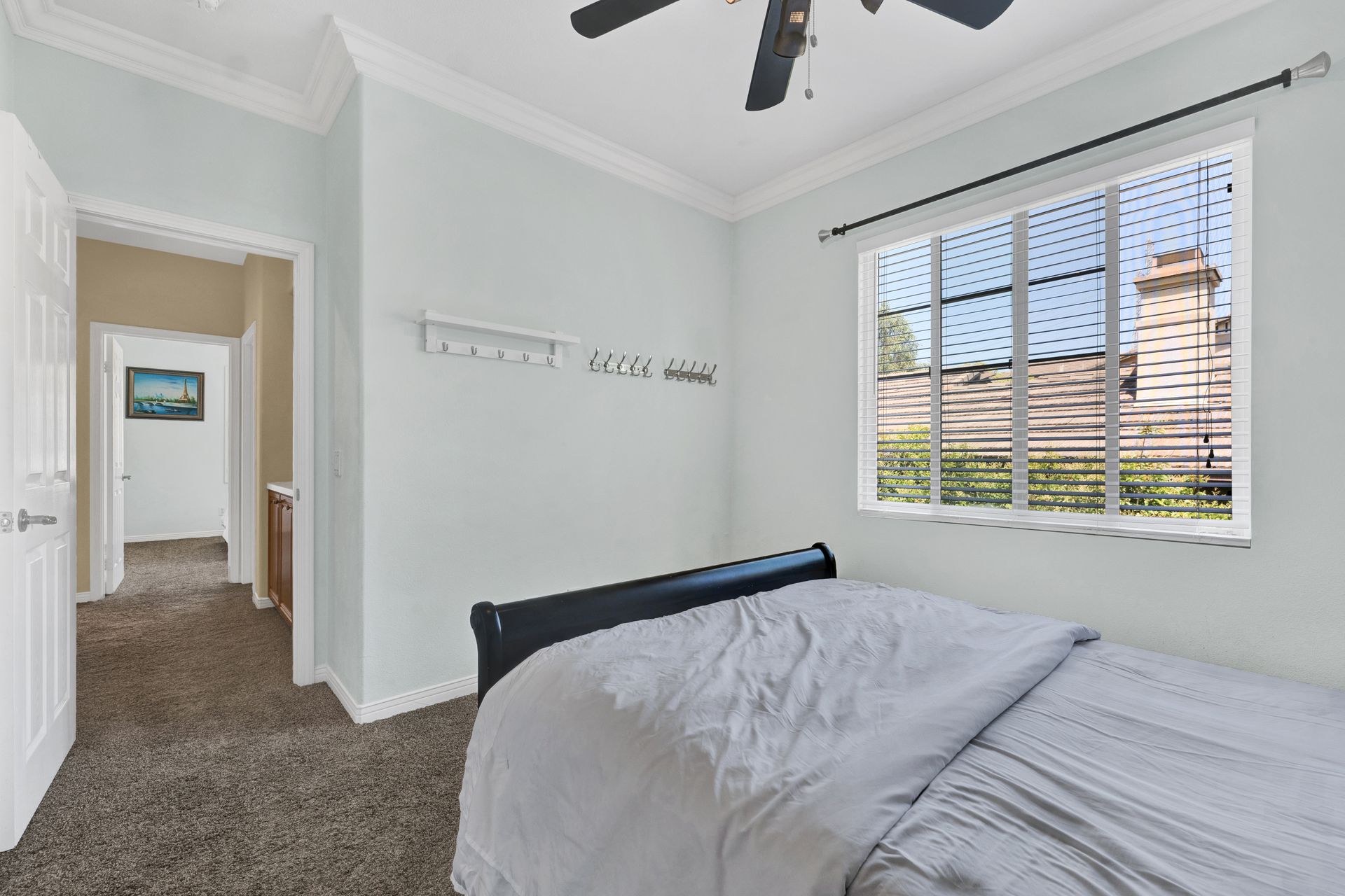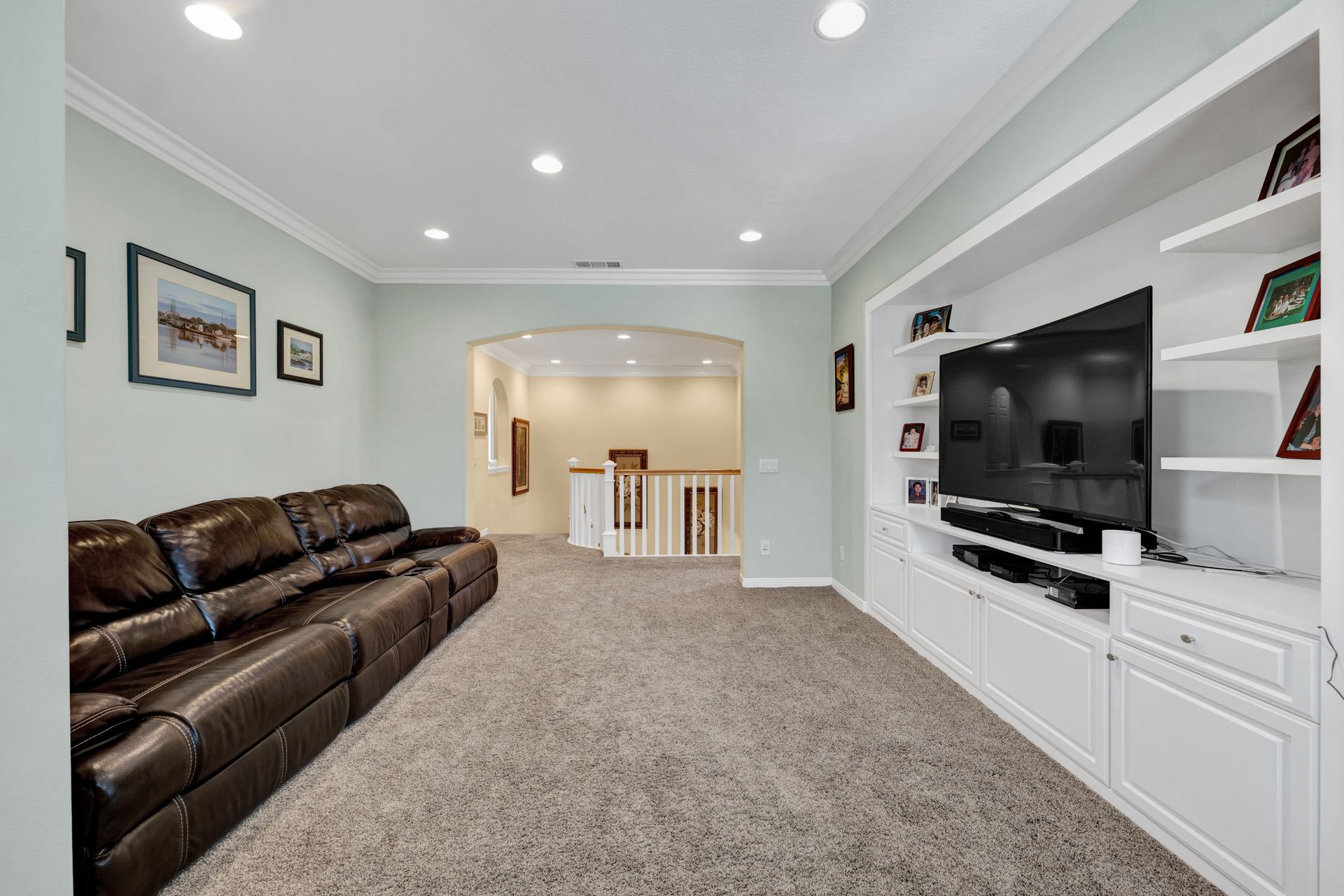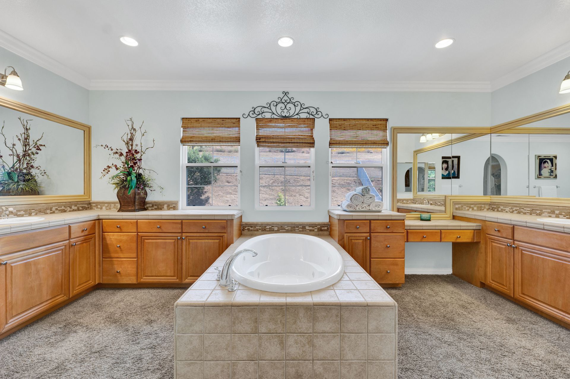 Stunning Highly Upgraded Dos Vientos Pool Home with Five Bedrooms, a Bonus Room, a Music Room/Office, four and one-half baths, and approximately 4,124 square feet. A gated courtyard with a soothing fountain welcomes you to this gorgeous home! The elegant living room has a fireplace and plantation shutters. The formal dining room has high ceilings. The upgraded gourmet kitchen offers quartz counters, a large island, stainless steel appliances, a walk-in pantry, and a family eating area. The family room offers a built-in entertainment center, fireplace, and large windows opening to the backyard. Downstairs, there is a bedroom with an en-suite bath and a music room/office. Additionally, there is a powder room with a pedestal sink on the first floor. Upstairs is a huge Bonus room with built-in desks and shelves that could be a theater room. The luxurious primary bedroom suite has a fireplace, double crown molding, tray ceilings, and tall windows with views of the beautiful backyard, pool, and hills beyond. The lavish en-suite primary bath features dual vanities and sinks, a spa tub, a separate shower, and two walk-in closets. Additionally, there are three bedrooms upstairs, one with an en-suite bath. The upstairs laundry room has a utility sink and cabinets. Upgrades include crown molding, plantation shutters, wood flooring with inlaid mosaic marble, upgraded neutral carpeting, a recently painted interior, recessed lighting, dual paned windows, and a fully owned Solar system. The three-car garage has an automatic opener. The fabulous private yard features a sparkling Pebble Tec, saltwater pool and spa, an inviting stamped-colored concrete patio for entertaining with an electric retractable awning, and a large grassy area.