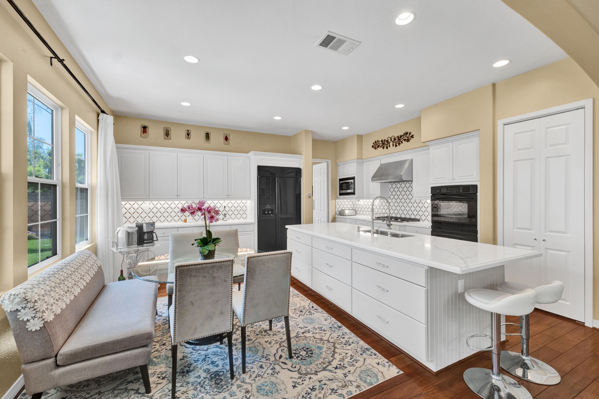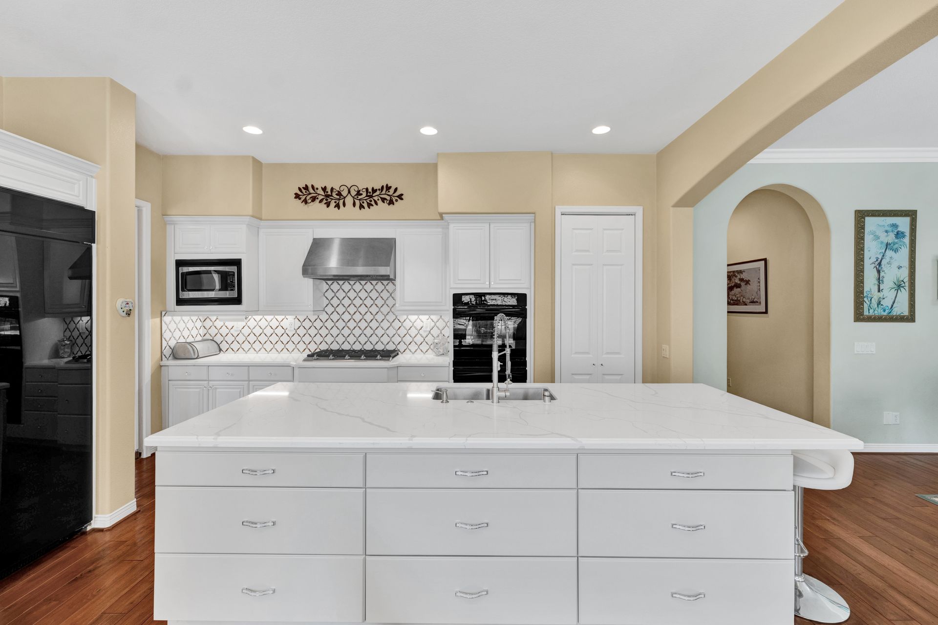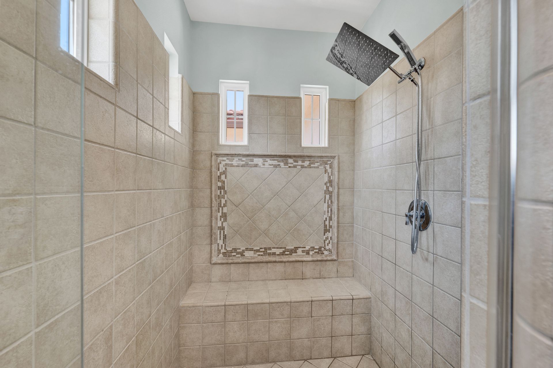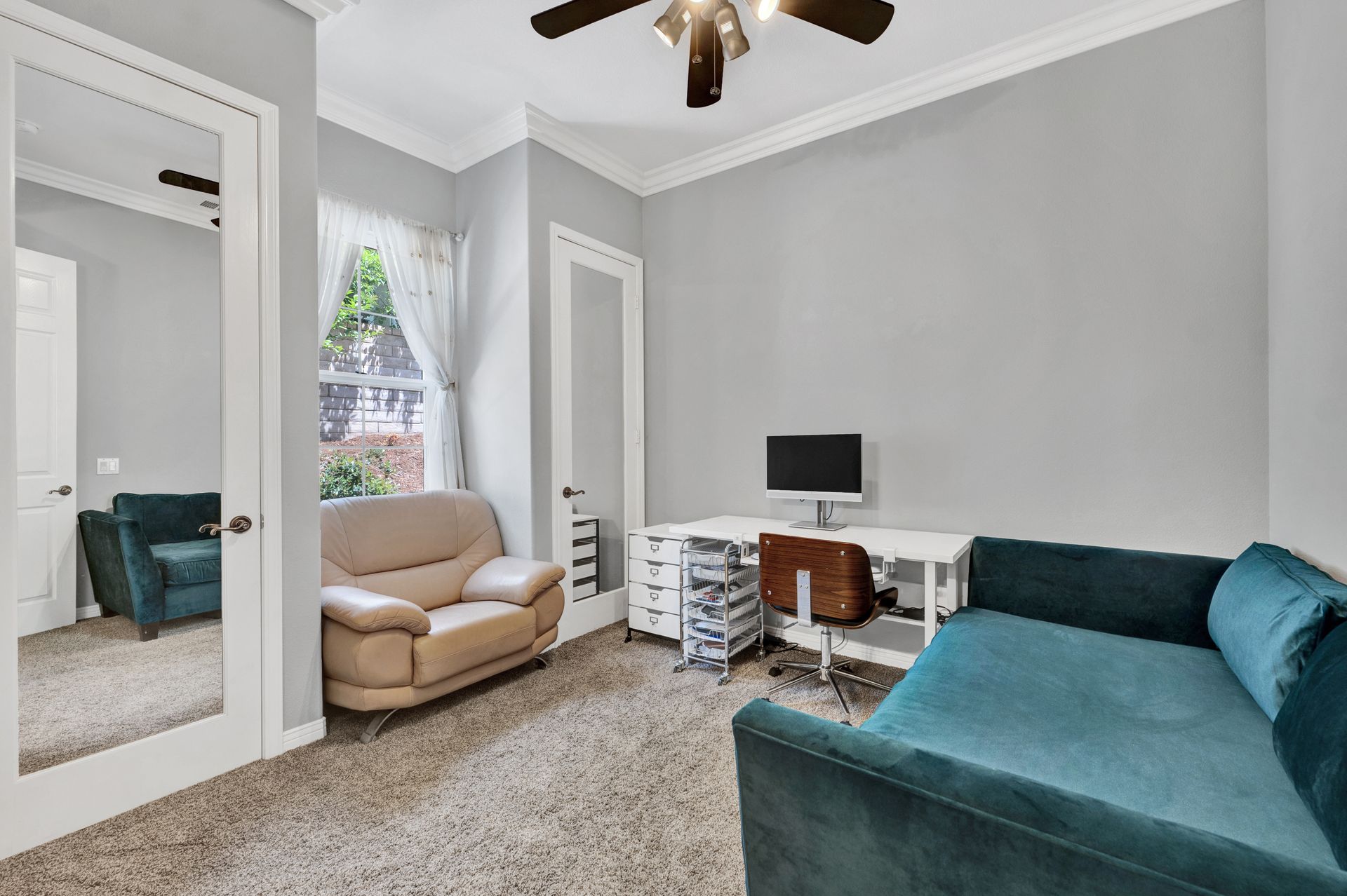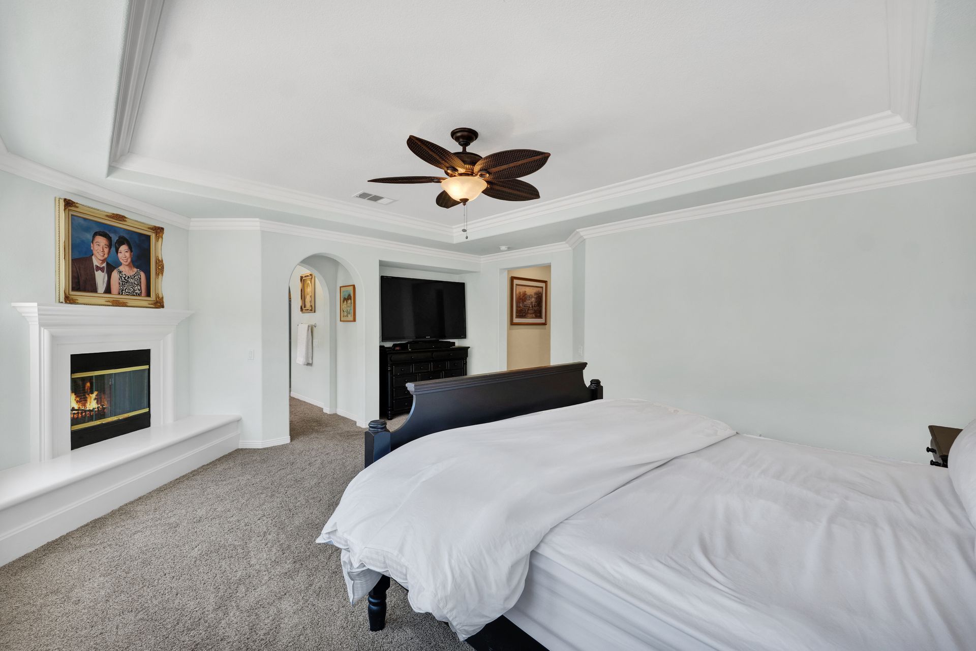 Stunning Highly Upgraded Dos Vientos Pool Home with Five Bedrooms, a Bonus Room, a Music Room/Office, four and one-half baths, and approximately 4,124 square feet. A gated courtyard with a soothing fountain welcomes you to this gorgeous home! The elegant living room has a fireplace and plantation shutters. The formal dining room has high ceilings. The upgraded gourmet kitchen offers quartz counters, a large island, stainless steel appliances, a walk-in pantry, and a family eating area. The family room offers a built-in entertainment center, fireplace, and large windows opening to the backyard. Downstairs, there is a bedroom with an en-suite bath and a music room/office. Additionally, there is a powder room with a pedestal sink on the first floor. Upstairs is a huge Bonus room with built-in desks and shelves that could be a theater room. The luxurious primary bedroom suite has a fireplace, double crown molding, tray ceilings, and tall windows with views of the beautiful backyard, pool, and hills beyond. The lavish en-suite primary bath features dual vanities and sinks, a spa tub, a separate shower, and two walk-in closets. Additionally, there are three bedrooms upstairs, one with an en-suite bath. The upstairs laundry room has a utility sink and cabinets. Upgrades include crown molding, plantation shutters, wood flooring with inlaid mosaic marble, upgraded neutral carpeting, a recently painted interior, recessed lighting, dual paned windows, and a fully owned Solar system. The three-car garage has an automatic opener. The fabulous private yard features a sparkling Pebble Tec, saltwater pool and spa, an inviting stamped-colored concrete patio for entertaining with an electric retractable awning, and a large grassy area.