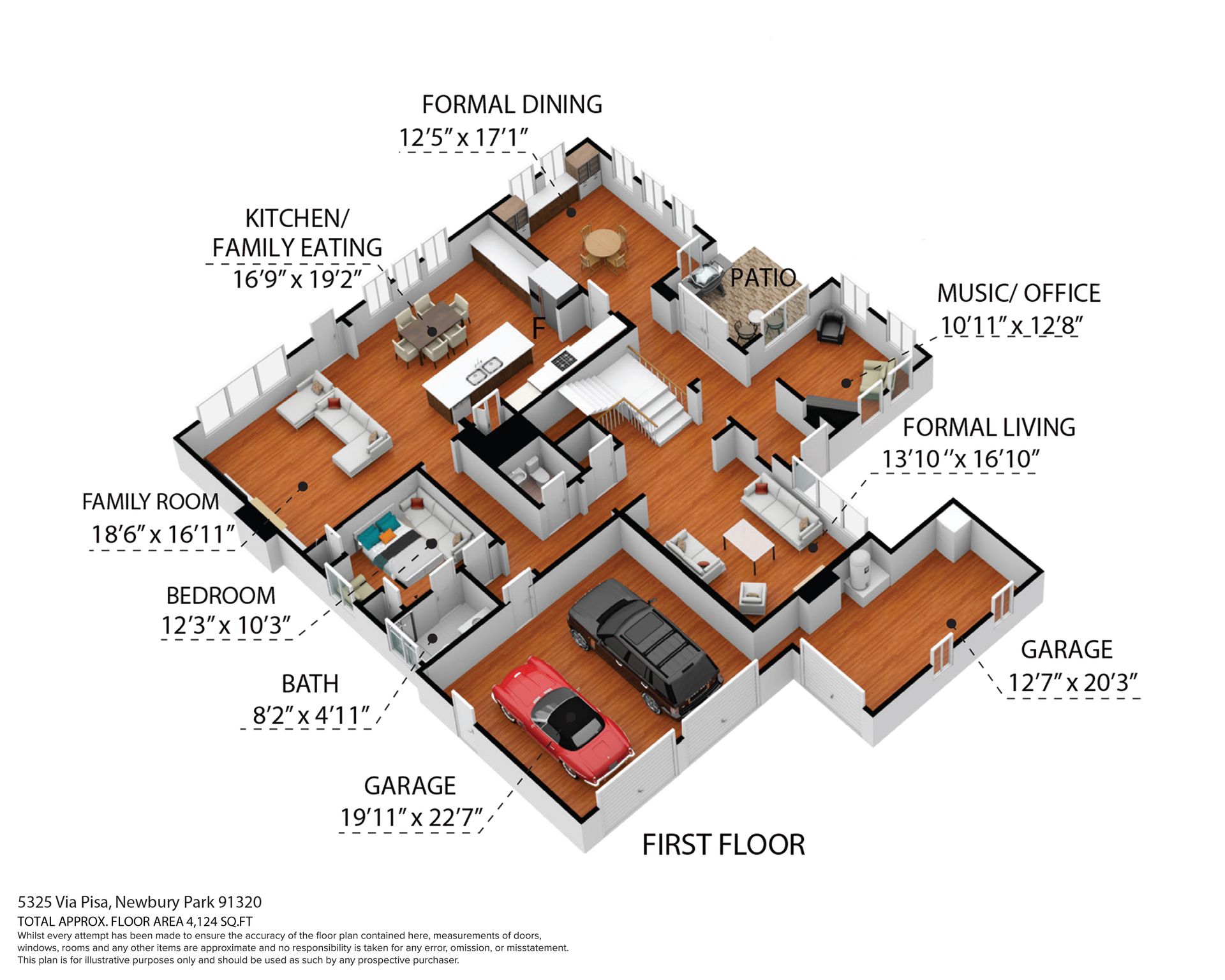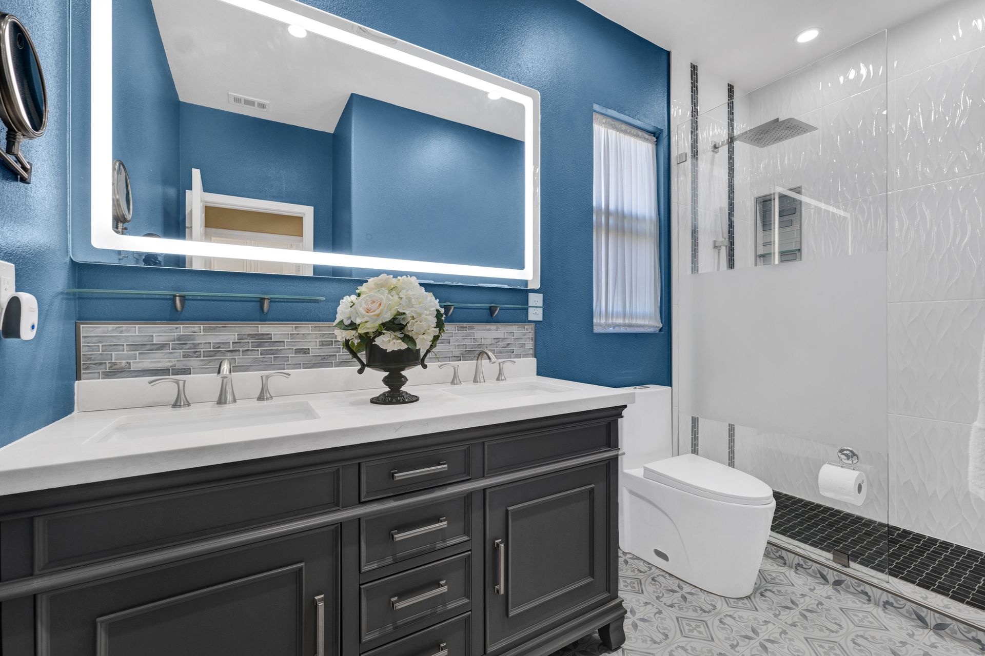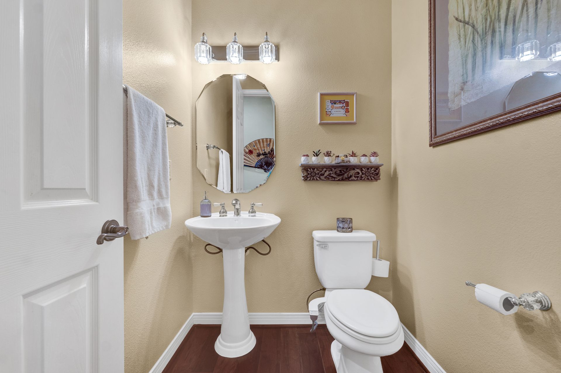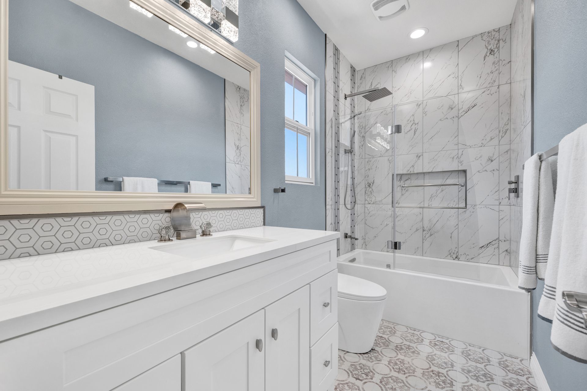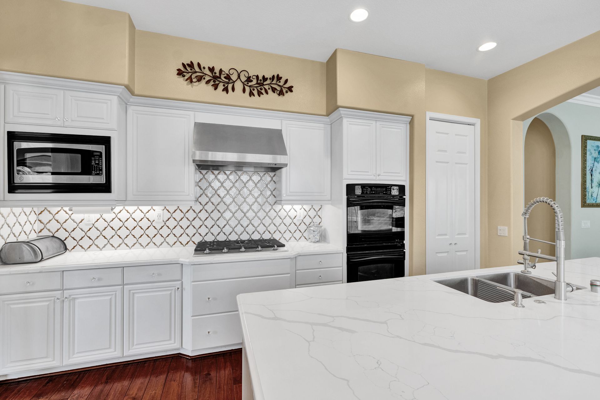 Stunning Highly Upgraded Dos Vientos Pool Home with Five Bedrooms, a Bonus Room, a Music Room/Office, four and one-half baths, and approximately 4,124 square feet. A gated courtyard with a soothing fountain welcomes you to this gorgeous home! The elegant living room has a fireplace and plantation shutters. The formal dining room has high ceilings. The upgraded gourmet kitchen offers quartz counters, a large island, stainless steel appliances, a walk-in pantry, and a family eating area. The family room offers a built-in entertainment center, fireplace, and large windows opening to the backyard. Downstairs, there is a bedroom with an en-suite bath and a music room/office. Additionally, there is a powder room with a pedestal sink on the first floor. Upstairs is a huge Bonus room with built-in desks and shelves that could be a theater room. The luxurious primary bedroom suite has a fireplace, double crown molding, tray ceilings, and tall windows with views of the beautiful backyard, pool, and hills beyond. The lavish en-suite primary bath features dual vanities and sinks, a spa tub, a separate shower, and two walk-in closets. Additionally, there are three bedrooms upstairs, one with an en-suite bath. The upstairs laundry room has a utility sink and cabinets. Upgrades include crown molding, plantation shutters, wood flooring with inlaid mosaic marble, upgraded neutral carpeting, a recently painted interior, recessed lighting, dual paned windows, and a fully owned Solar system. The three-car garage has an automatic opener. The fabulous private yard features a sparkling Pebble Tec, saltwater pool and spa, an inviting stamped-colored concrete patio for entertaining with an electric retractable awning, and a large grassy area.