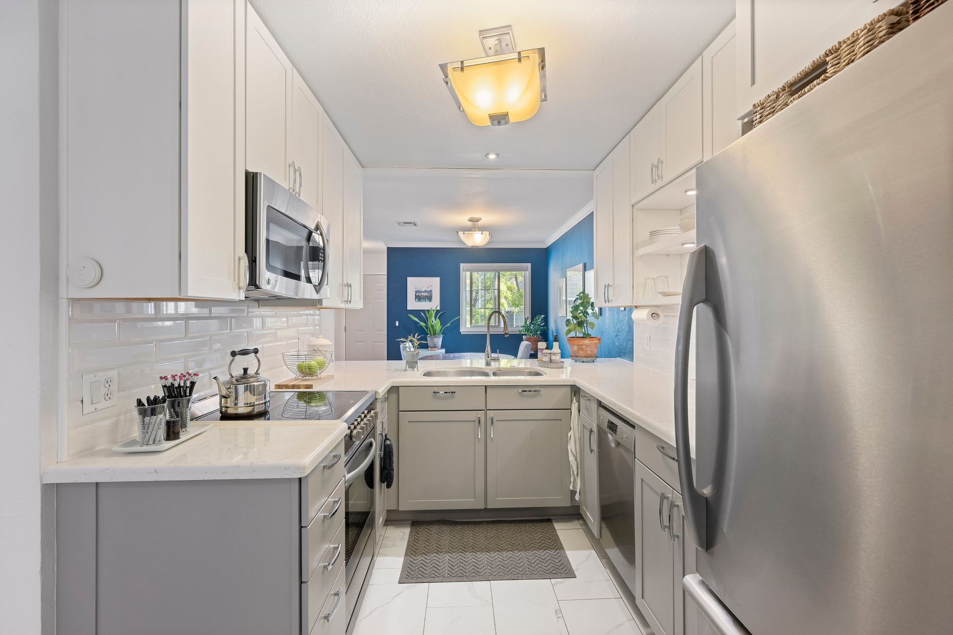 The contemporary kitchen is a culinary haven with premium stainless steel appliances, including an electric stove, dishwasher and refrigerator. Abundant cabinet space, radiant quartz countertops and a stylish subway-tiled backsplash create a culinary masterpiece that seamlessly transitions into a charming dining area - ideal for daily meals and hosting guests.