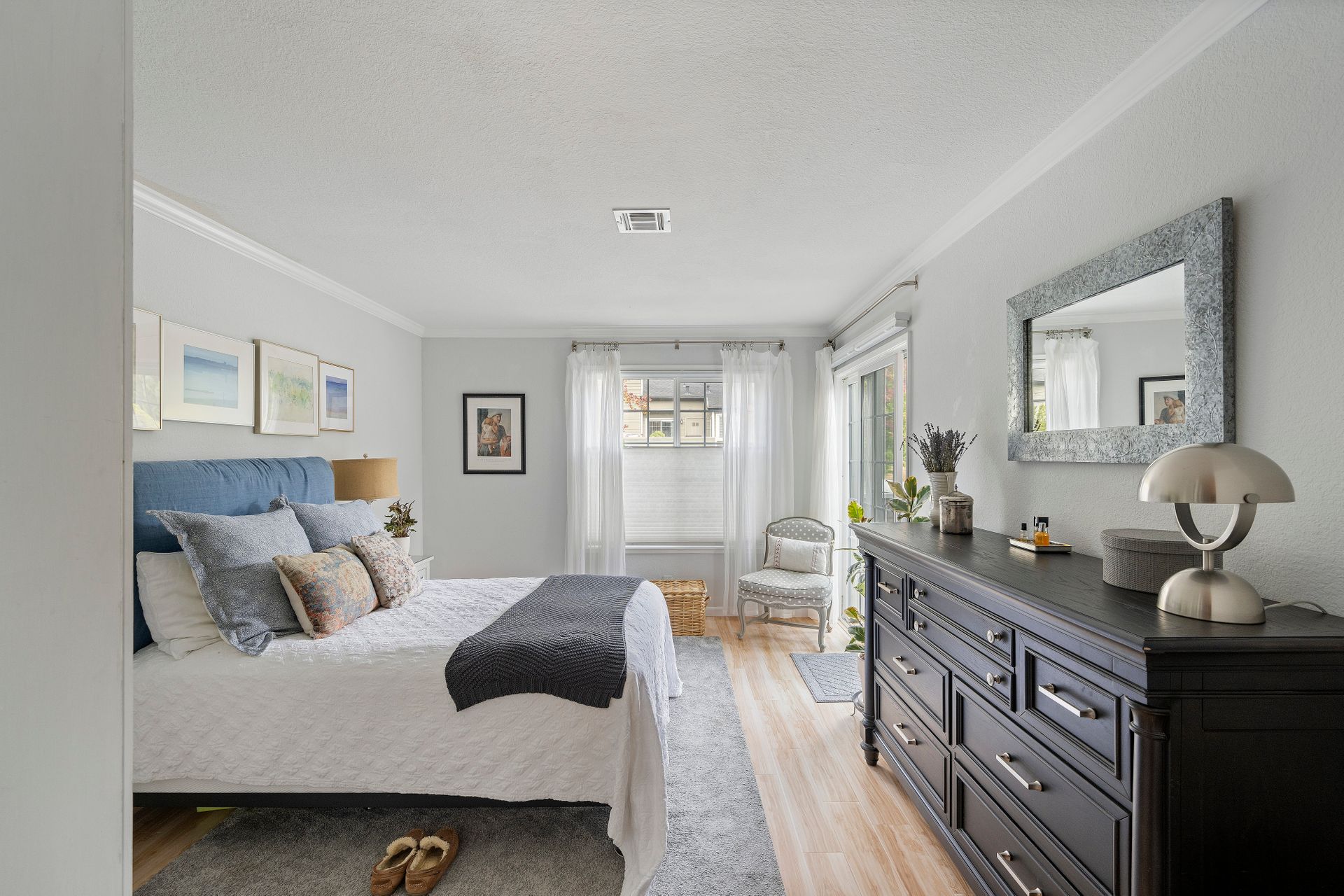 The laundry room is thoughtfully equipped with a top-of-the-line washer and dryer and ample storage space for all your needs. Architectural brilliance shines through with three sliding doors adorned with divided lites, providing exclusive access to a sprawling patio for the main bedroom, living room and guest bedroom.