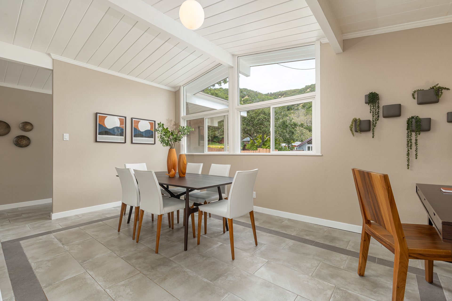 This quintessential and stunning remodeled Eichler, on a premiere and level parcel, is move-in ready to enjoy Marin's Spring and Summer weather. The idyllic indoor-outdoor flow from almost every room, with walls of windows and skylights, defines this style of architecture and creates the natural light that enhances our day to day living and work from home needs. The outdoor niches include a fenced front relaxation and meditation area, side yard with sand box , spacious rear covered patio for dining and unwinding, lush lawns for play and a delightful and tranquil water fall. With views and privacy, this one has it all!