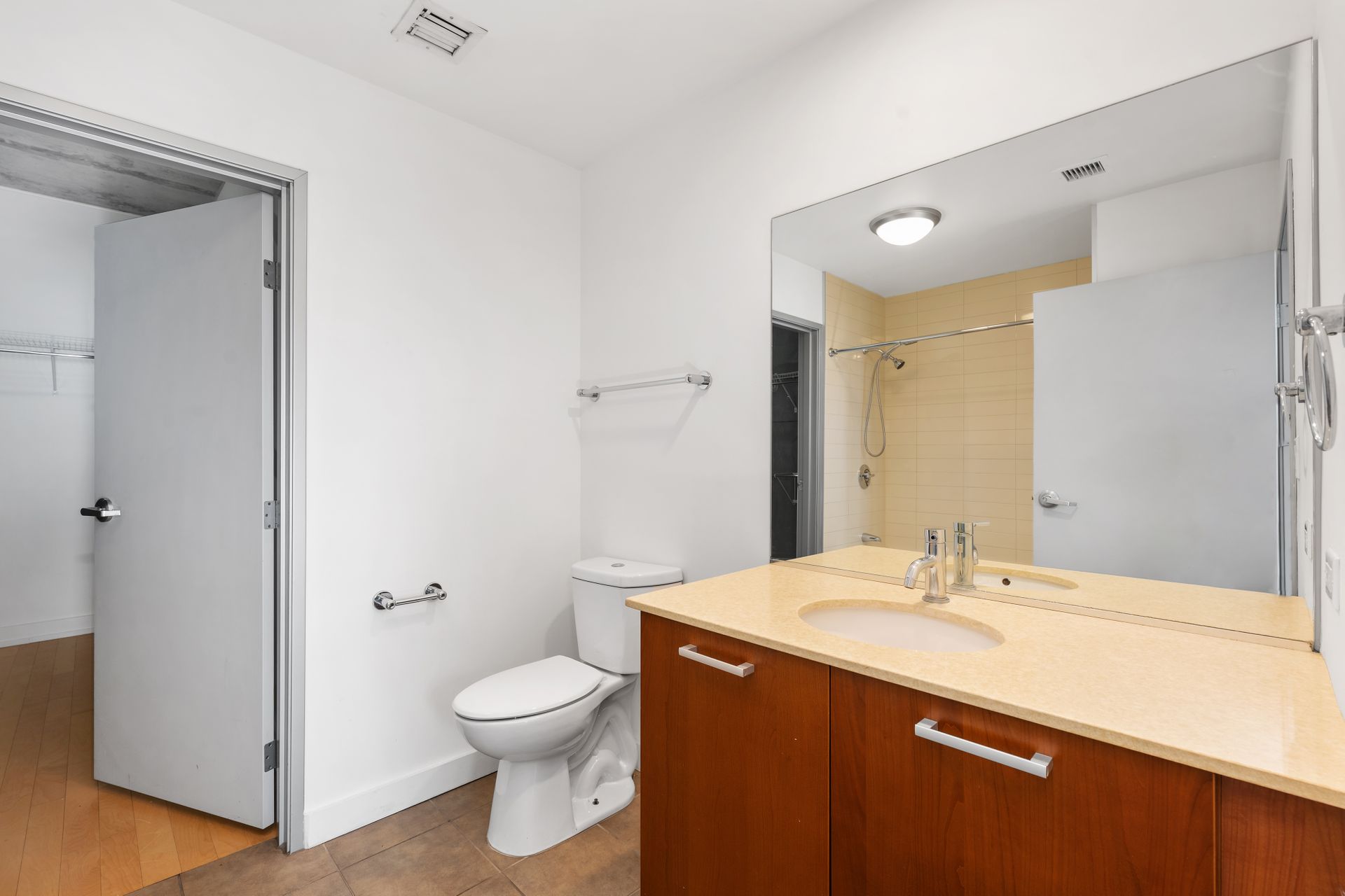 Welcome to the Market Lofts in DTLA! This contemporary-style condominium offers an open floor plan that creates an inviting atmosphere, allowing for natural light to flow throughout the living areas. It's an end unit with no shared walls and offers tons of privacy. The unit comes with hardwood floors, in-unit combo washer/dryer, two bedrooms areas with designated bathrooms, two spacious closets, and a private balcony. The kitchen is equipped with stainless steel appliances and a breakfast bar, providing a modern and functional cooking environment. The private balcony offers views of DTLA, offering a unique and visually appealing perspective. The overall design of the condominium prioritizes functionality and livability, making it an ideal living space for those seeking a comfortable and well-appointed home.