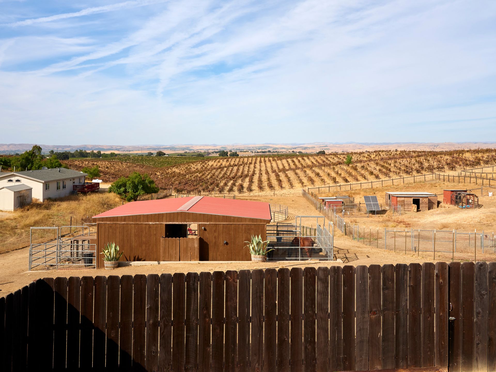 Escape the city and live the country life in Paso Robles. This one acre property offers the perfect haven for equestrian enthusiasts but also offers an income-producing Airbnb experience. Situated in the heart of wine country, this home boasts of breathtaking views of vineyards and rolling hills, creating an idyllic backdrop for homeowners and guests seeking tranquility. With proximity to renowned wineries this property is a prime location for those looking to explore Paso Robles wine culture, music venues and local Paso sights. Don't miss out on owning a piece of paradise where horses, hospitality and vineyard vistas harmoniously coexist. This is a single level 4 bedroom 3 bath home with one of the bedroom and baths converted to a private entry Airbnb with sunroom and deck. Entry to the home via a circular driveway and two car garage with RV access and storage. This country home is cozy with lots of south facing light, a wood burning fireplace for those winter evenings, French doors, custom sliding barn door, open living room and dining area with ceiling fans in every room. The kitchen is adjoined with a separate laundry room with additional storage and pantry area. Private backyard is fenced separately from the barn area with fabulous sunset views to enjoy overlooking the vineyards and rolling hills from the deck. There is 4 stall barn with paddocks, pasture, and round pen. The entire property is fenced with access gates on both sides. Perfectly set up for someone who would like to have their horses and livestock live onsite. Airbnb can also be used as an additional guest room as an option.