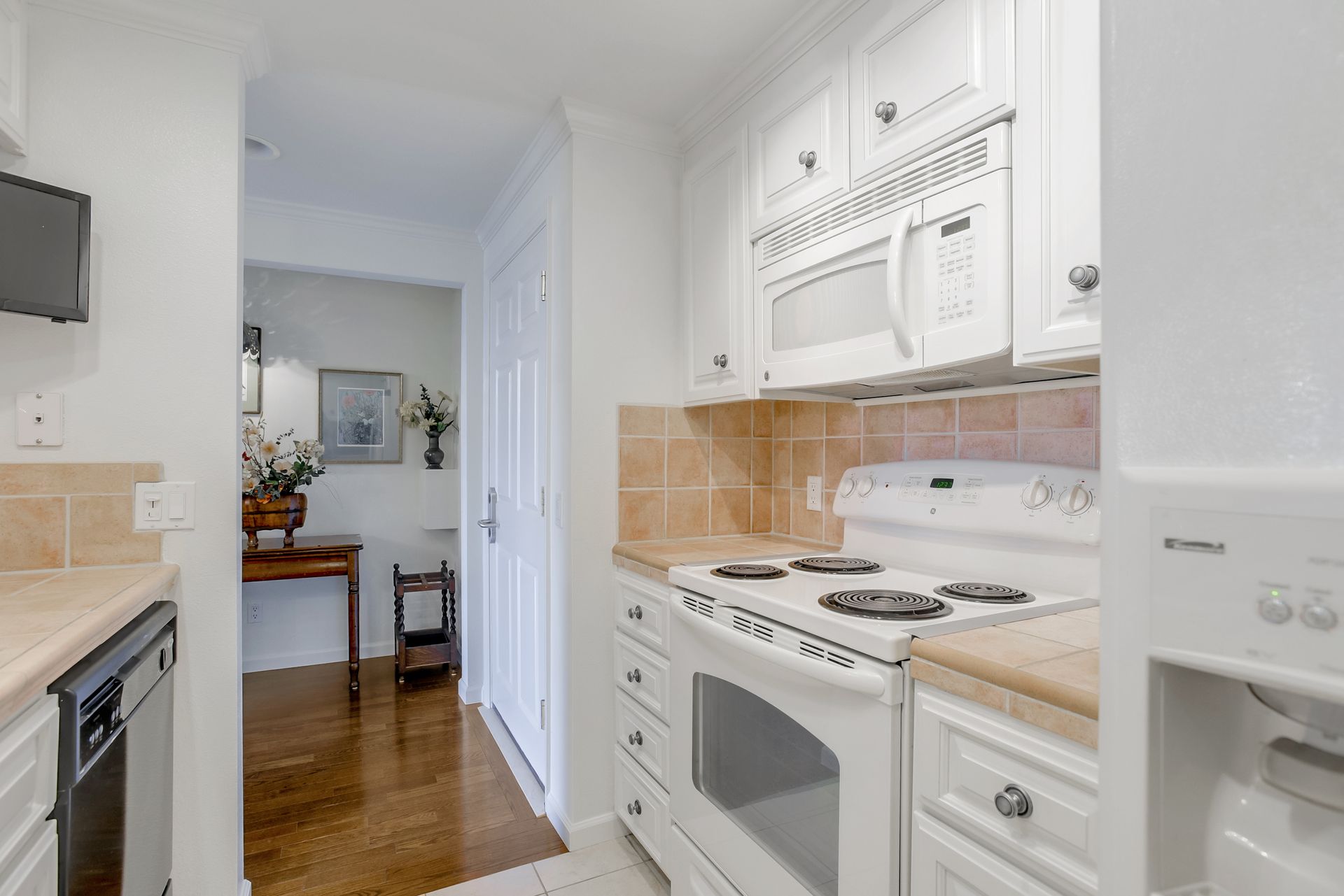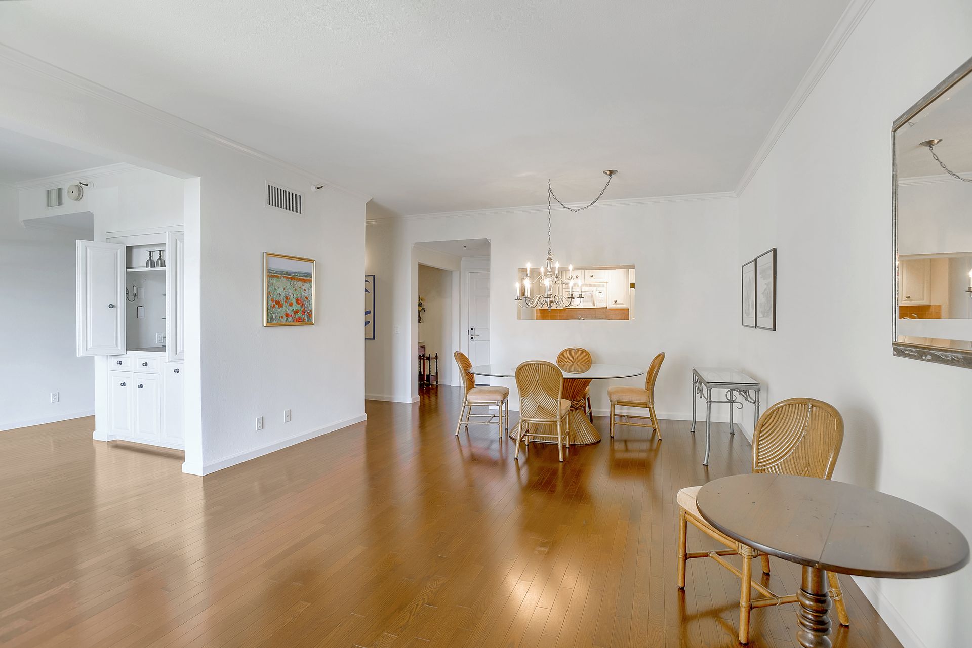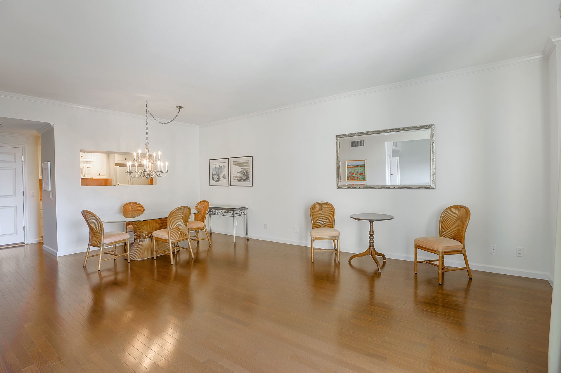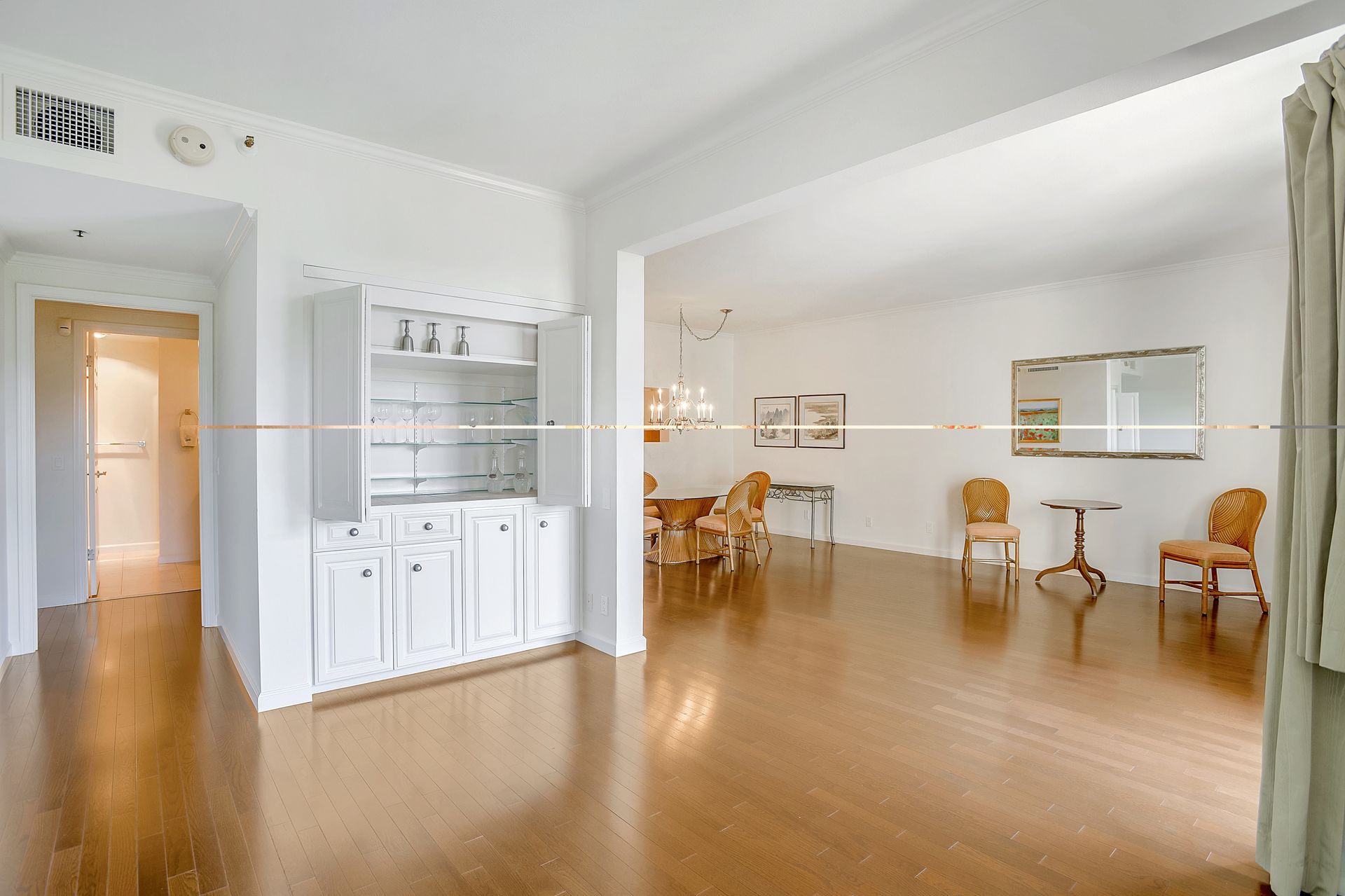 Enjoy life in this active adult community! This bright, single-level unit has been meticulously remodeled and boasts crown molding, wood flooring, faux fireplace, gourmet kitchen and elegant touches which make entertaining a delight. Custom kitchen cabinetry is accented by tile counters, specialized lighting and tile flooring. There is a large open pass-through from the kitchen to the dining area. Gorgeous wood flooring throughout the living areas is stained a walnut color, accentuating the light walls, crown molding and neutral ceilings. The large living room expands to an updated open area which has a built-in bar area and faux fireplace. A wonderful balcony overlooks the western gardens, bocce ball court and sunset views. The hallway bathroom has granite counters and a stacked washer/dryer. The primary suite features two separate closets, a substantial bedroom area, custom cabinetry with sink, make up space and bathroom with a generous stall shower. The sophisticated community for those 60-plus years of age offers an exciting lifestyle, complemented with towel and linen service, housekeeping, planned activities such as theater outings, shopping trips, maintenance and much more! There's a scrumptious bistro, amazing dining room, hair salon, gym, transportation and more!