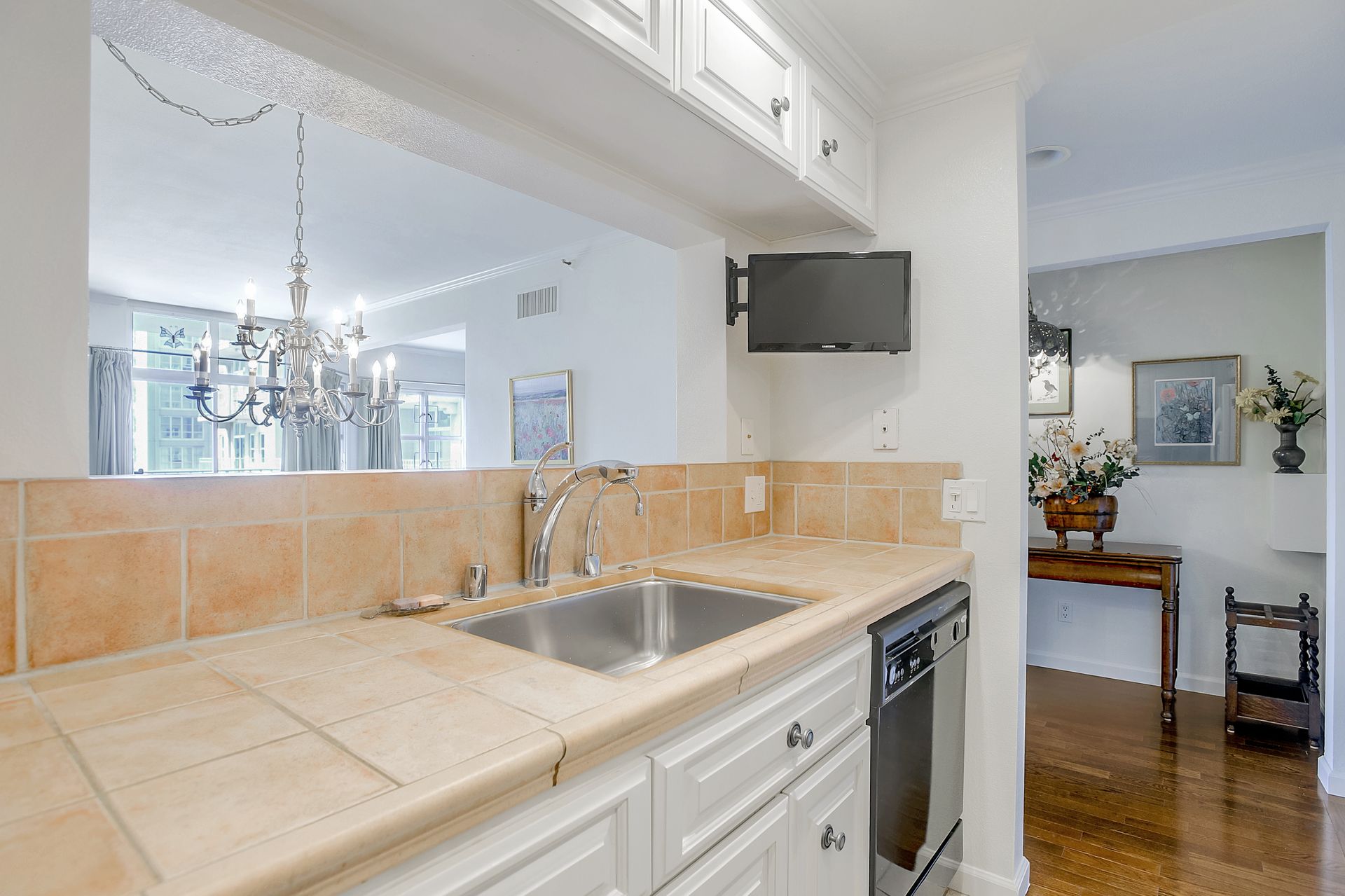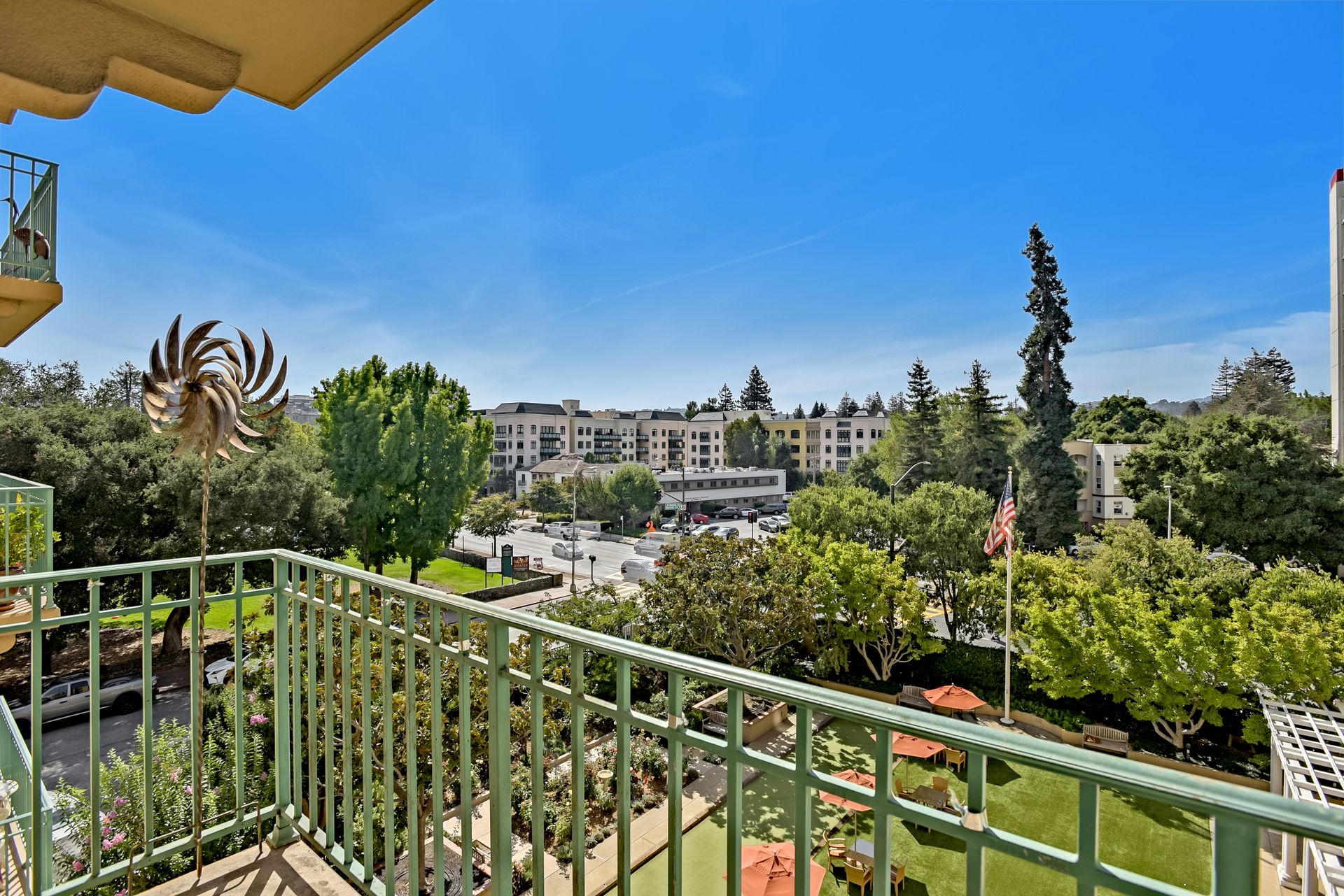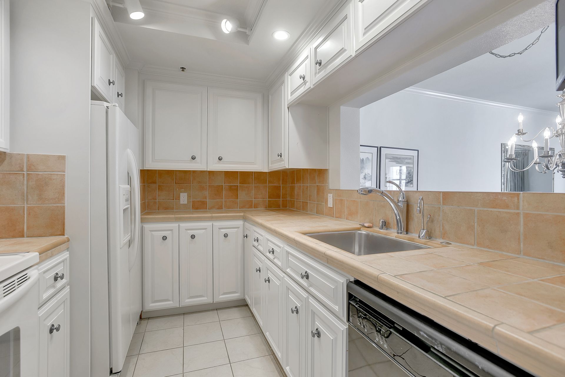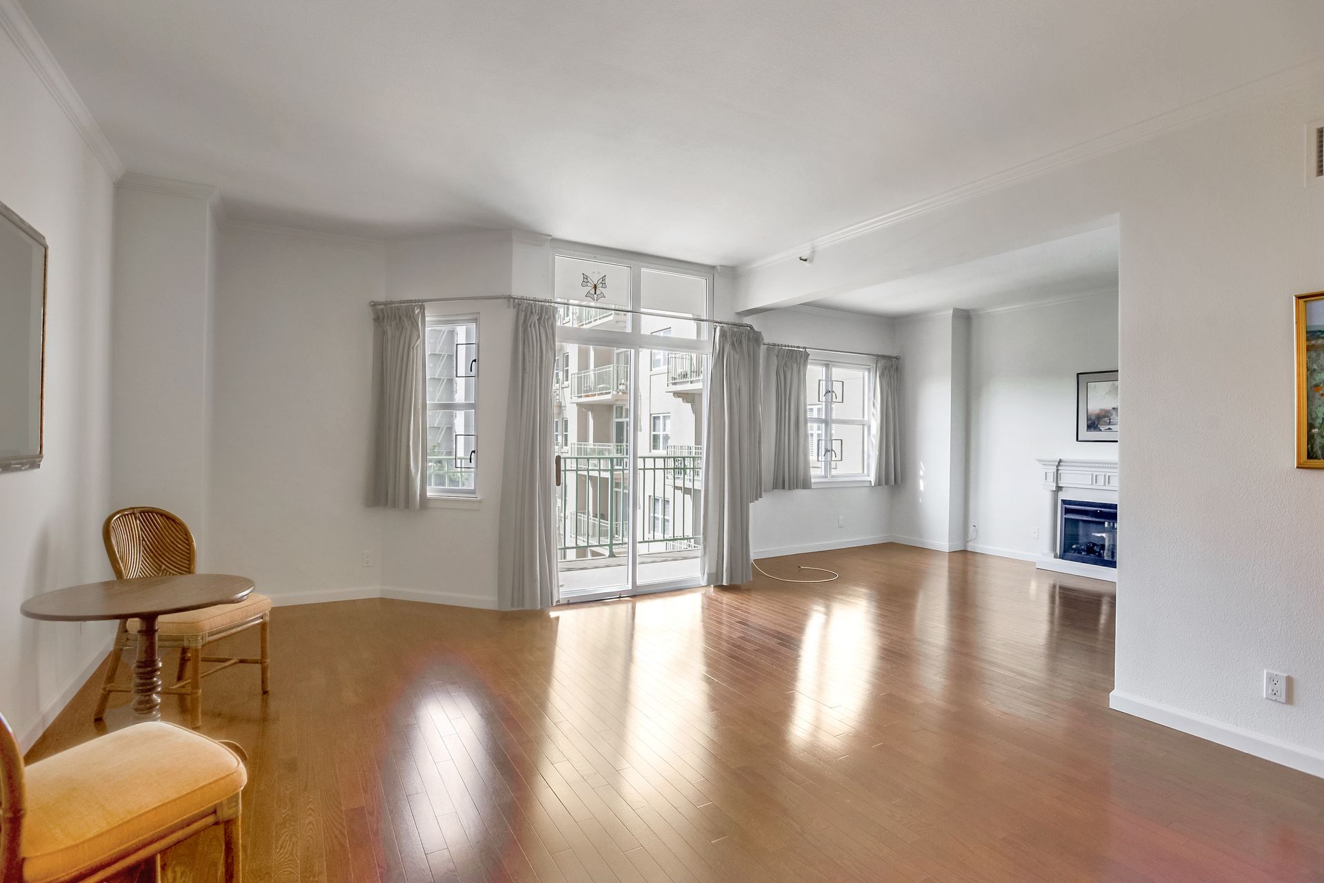 Enjoy life in this active adult community! This bright, single-level unit has been meticulously remodeled and boasts crown molding, wood flooring, faux fireplace, gourmet kitchen and elegant touches which make entertaining a delight. Custom kitchen cabinetry is accented by tile counters, specialized lighting and tile flooring. There is a large open pass-through from the kitchen to the dining area. Gorgeous wood flooring throughout the living areas is stained a walnut color, accentuating the light walls, crown molding and neutral ceilings. The large living room expands to an updated open area which has a built-in bar area and faux fireplace. A wonderful balcony overlooks the western gardens, bocce ball court and sunset views. The hallway bathroom has granite counters and a stacked washer/dryer. The primary suite features two separate closets, a substantial bedroom area, custom cabinetry with sink, make up space and bathroom with a generous stall shower. The sophisticated community for those 60-plus years of age offers an exciting lifestyle, complemented with towel and linen service, housekeeping, planned activities such as theater outings, shopping trips, maintenance and much more! There's a scrumptious bistro, amazing dining room, hair salon, gym, transportation and more!