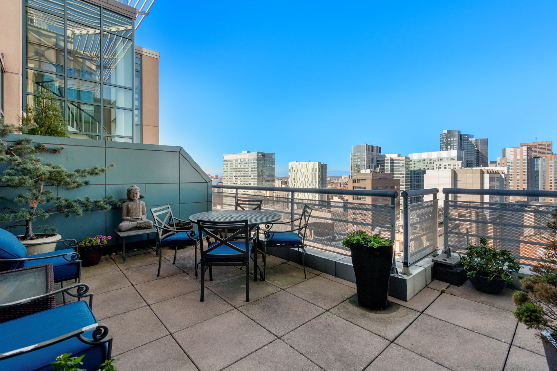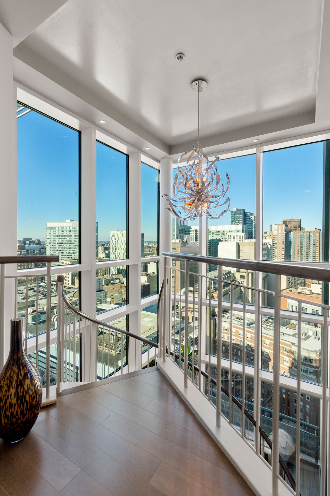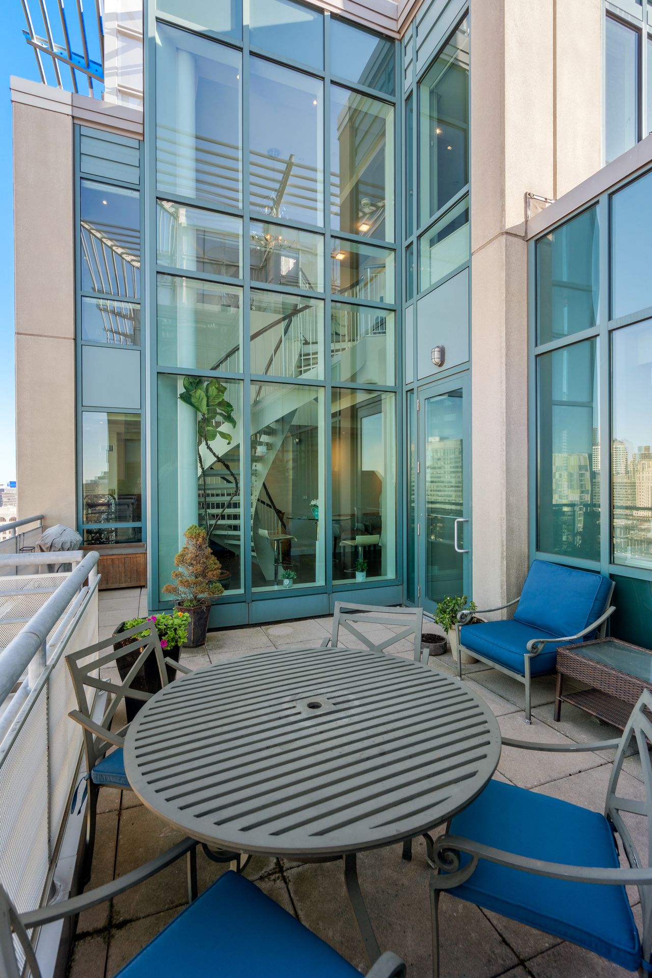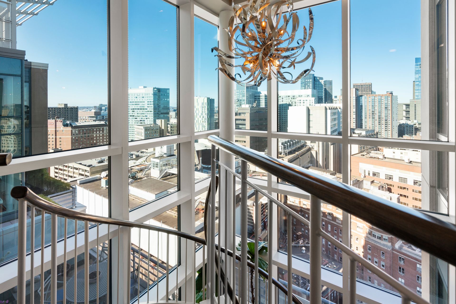 Experience urban luxury in this 2-bedroom, 2-bathroom penthouse duplex. This condo features stunning city views through floor-to-ceiling windows and a private deck, ideal for entertaining or relaxing. The open-concept living and dining area boasts hardwood floors, custom lighting, and built-in dining with a bench and table. The modern kitchen includes custom cabinetry, quartz countertops, and oversized windows showcasing panoramic views. A unique spiral staircase with corner windows connects both levels. The primary bedroom offers city views and an en-suite bathroom with marble flooring and a glass shower. The guest bedroom features a built-in desk overlooking the city. A full second bathroom and in-unit laundry add convenience. The Metropolitan provides 24-hour concierge service, deeded storage, and valet parking. Ideally located near Tufts Medical Center, the South End, Downtown, Whole Foods, dining, shopping, highways, and public transit, with Orange and Silver Line stops nearby.