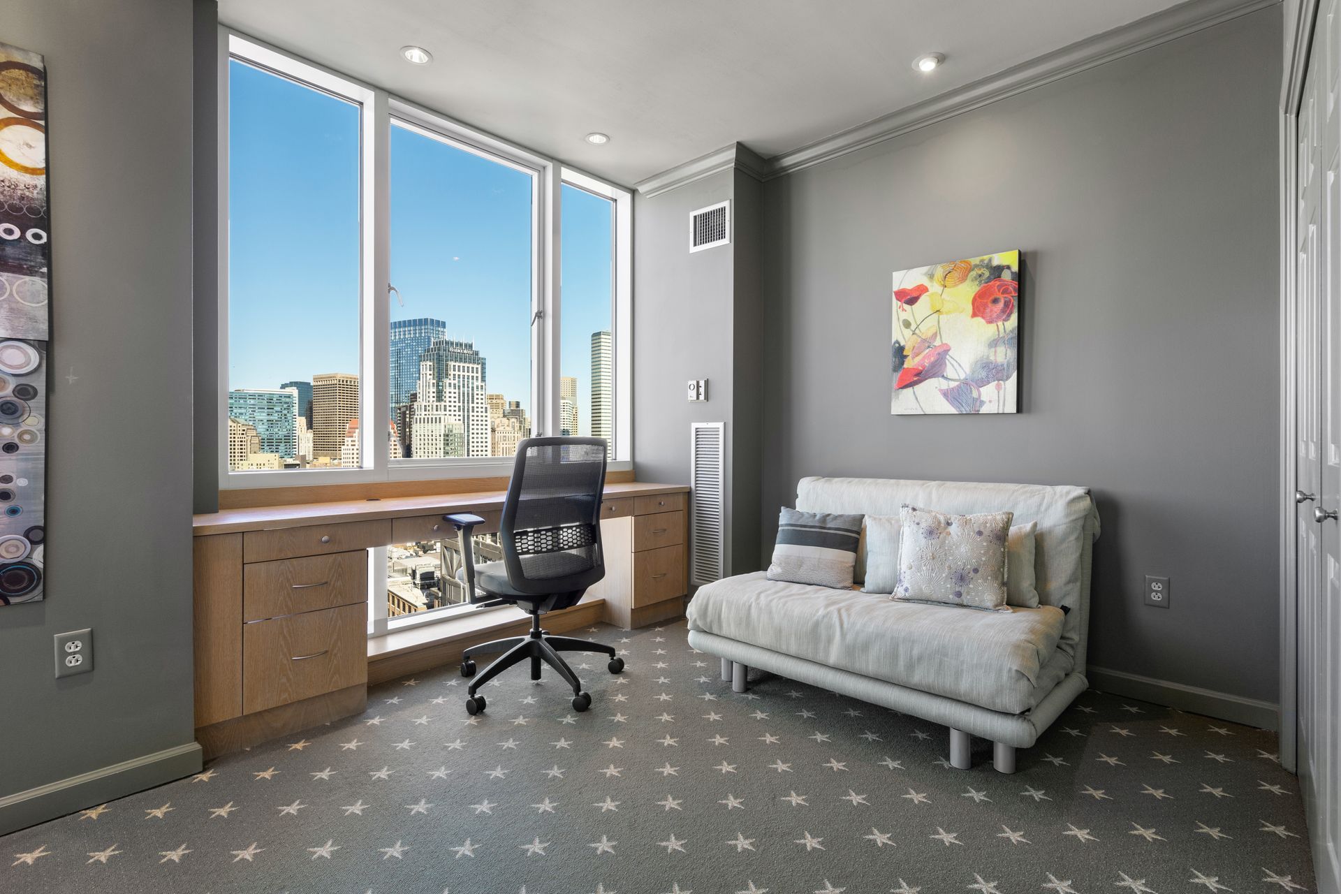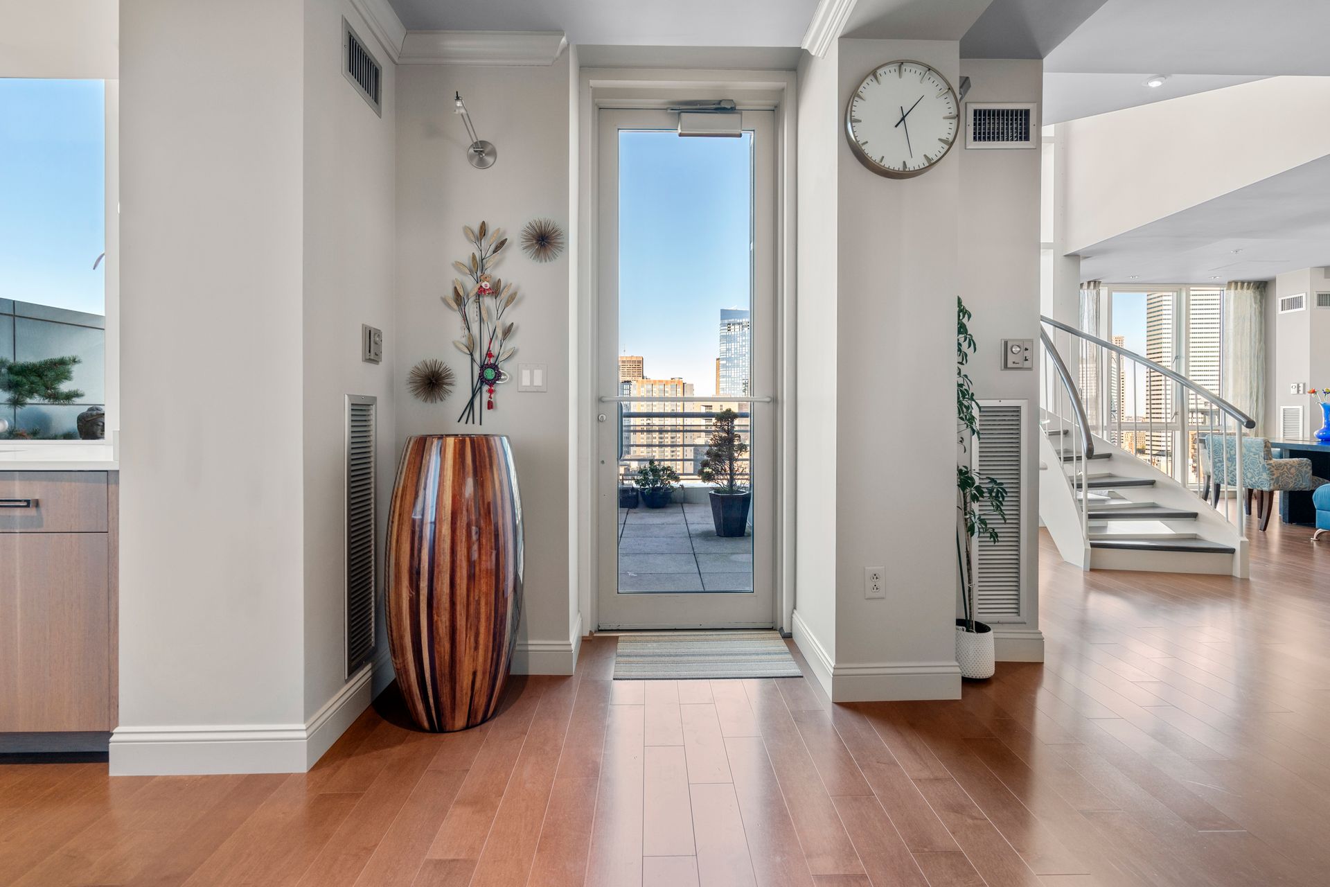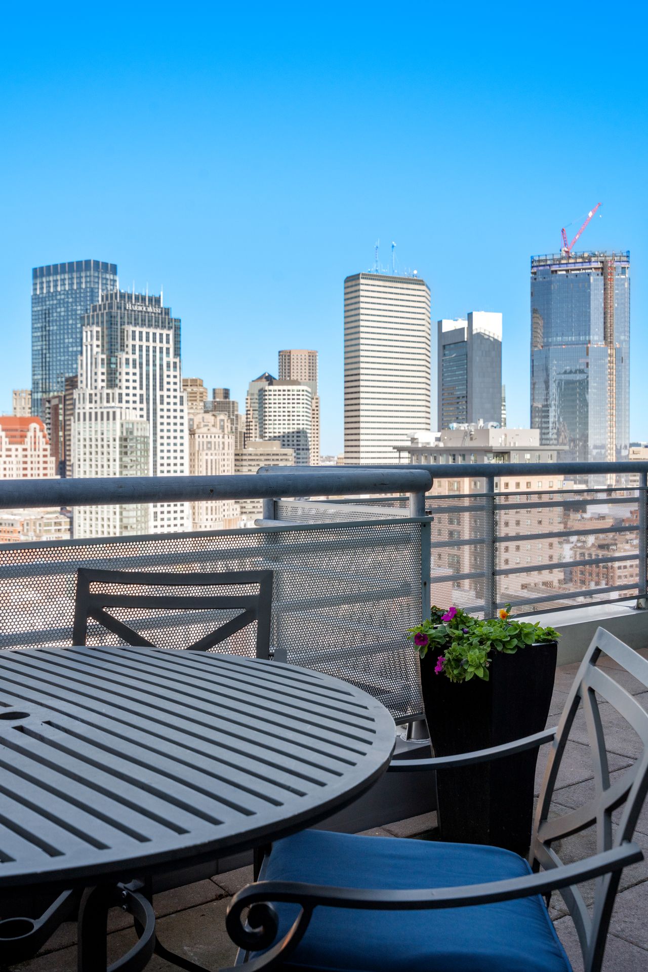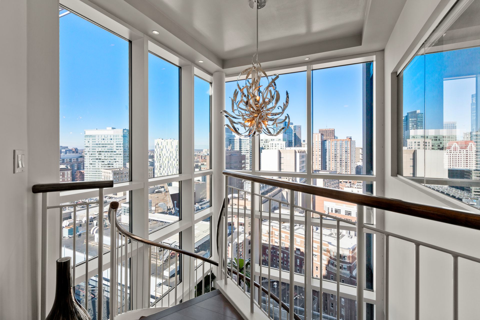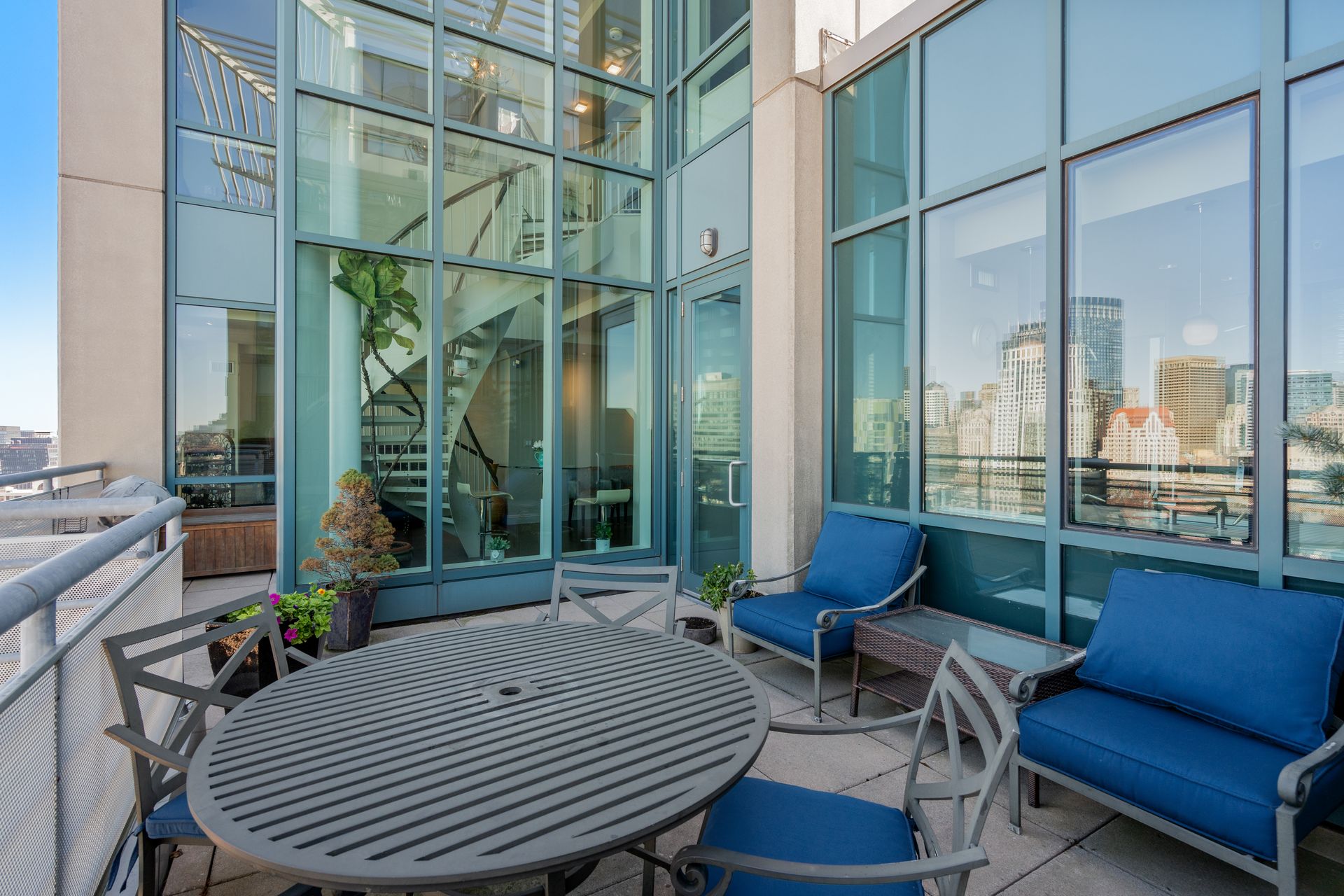 Experience urban luxury in this 2-bedroom, 2-bathroom penthouse duplex. This condo features stunning city views through floor-to-ceiling windows and a private deck, ideal for entertaining or relaxing. The open-concept living and dining area boasts hardwood floors, custom lighting, and built-in dining with a bench and table. The modern kitchen includes custom cabinetry, quartz countertops, and oversized windows showcasing panoramic views. A unique spiral staircase with corner windows connects both levels. The primary bedroom offers city views and an en-suite bathroom with marble flooring and a glass shower. The guest bedroom features a built-in desk overlooking the city. A full second bathroom and in-unit laundry add convenience. The Metropolitan provides 24-hour concierge service, deeded storage, and valet parking. Ideally located near Tufts Medical Center, the South End, Downtown, Whole Foods, dining, shopping, highways, and public transit, with Orange and Silver Line stops nearby.