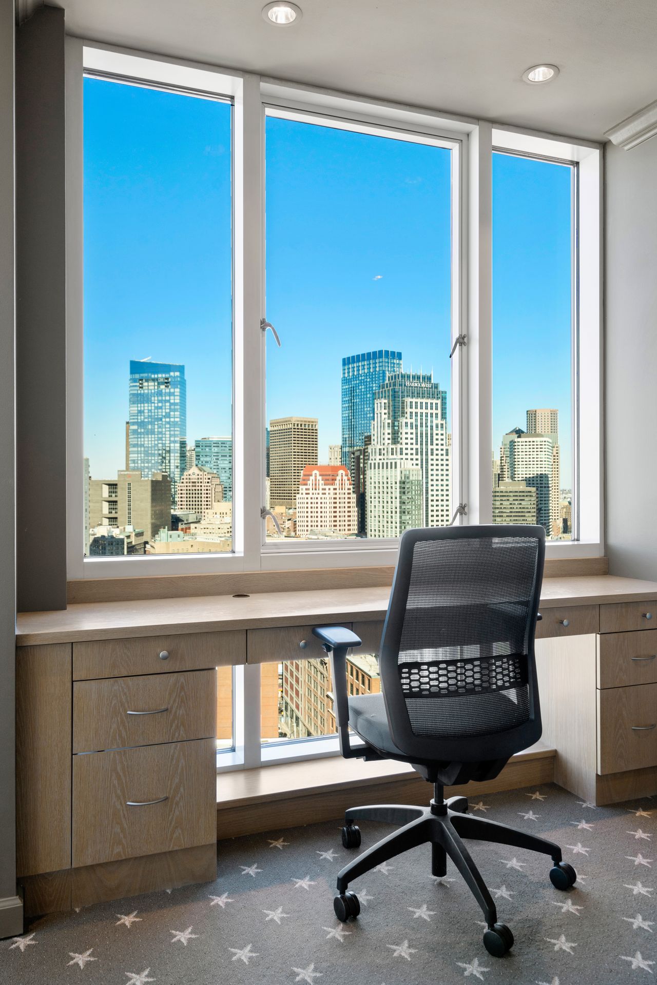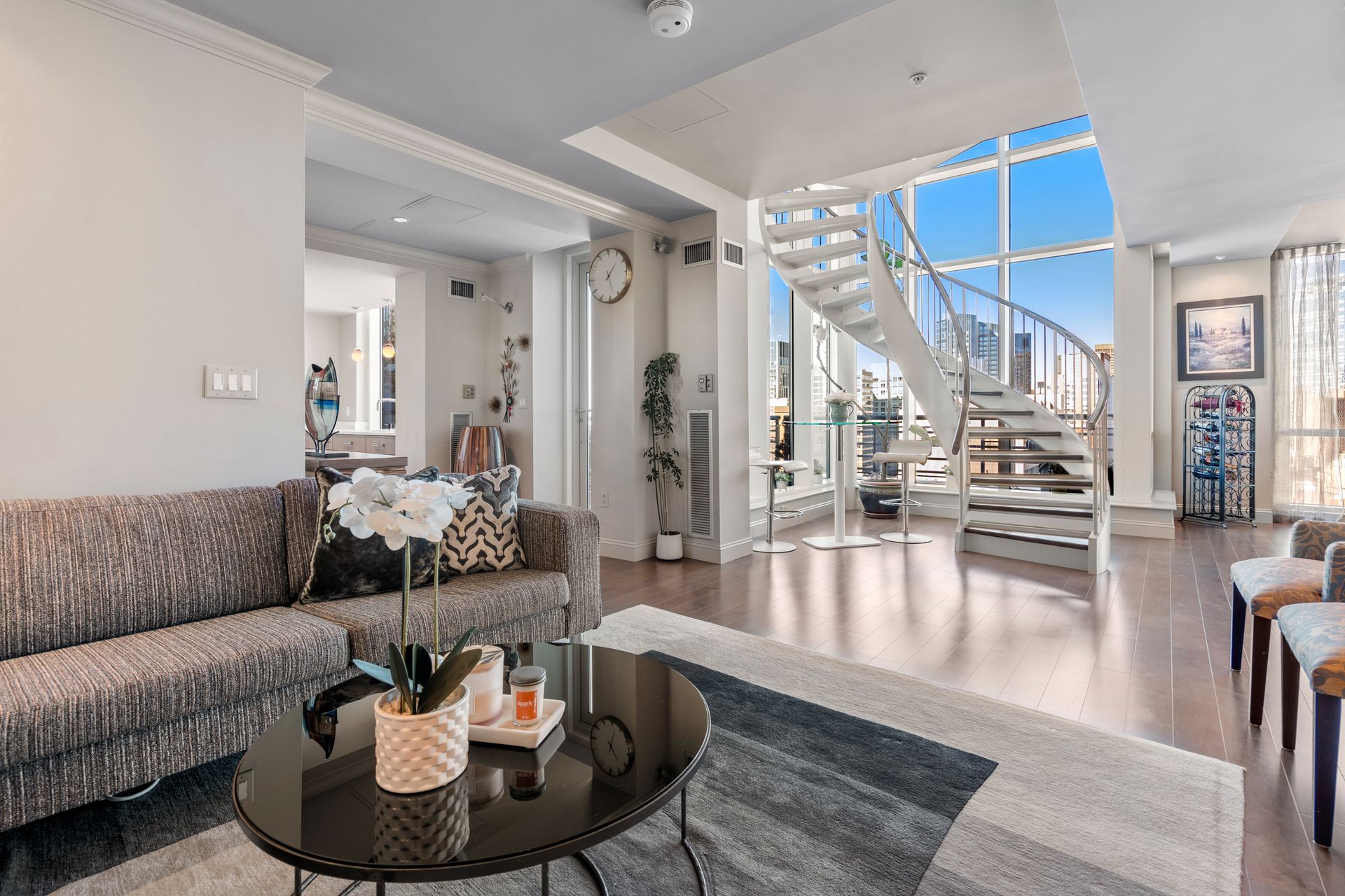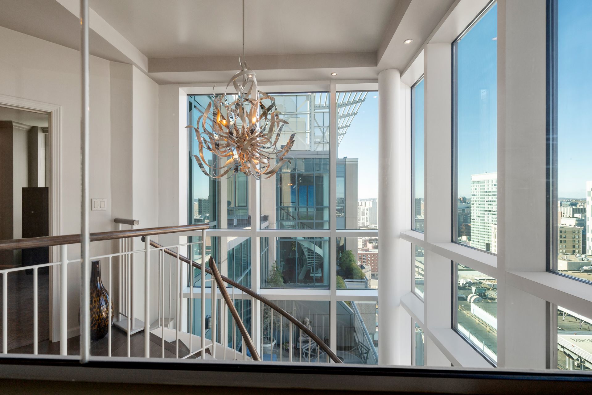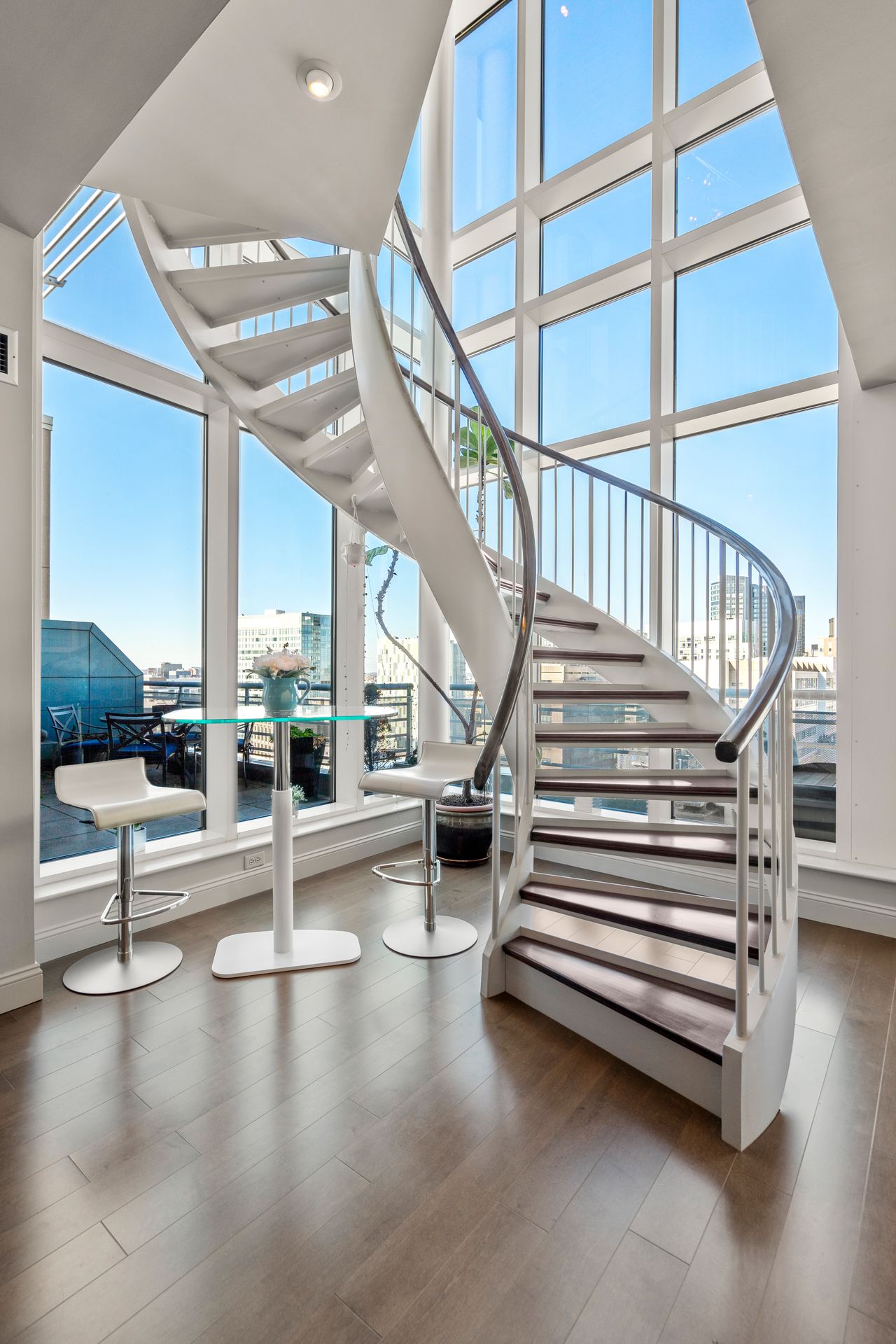 Experience urban luxury in this 2-bedroom, 2-bathroom penthouse duplex. This condo features stunning city views through floor-to-ceiling windows and a private deck, ideal for entertaining or relaxing. The open-concept living and dining area boasts hardwood floors, custom lighting, and built-in dining with a bench and table. The modern kitchen includes custom cabinetry, quartz countertops, and oversized windows showcasing panoramic views. A unique spiral staircase with corner windows connects both levels. The primary bedroom offers city views and an en-suite bathroom with marble flooring and a glass shower. The guest bedroom features a built-in desk overlooking the city. A full second bathroom and in-unit laundry add convenience. The Metropolitan provides 24-hour concierge service, deeded storage, and valet parking. Ideally located near Tufts Medical Center, the South End, Downtown, Whole Foods, dining, shopping, highways, and public transit, with Orange and Silver Line stops nearby.