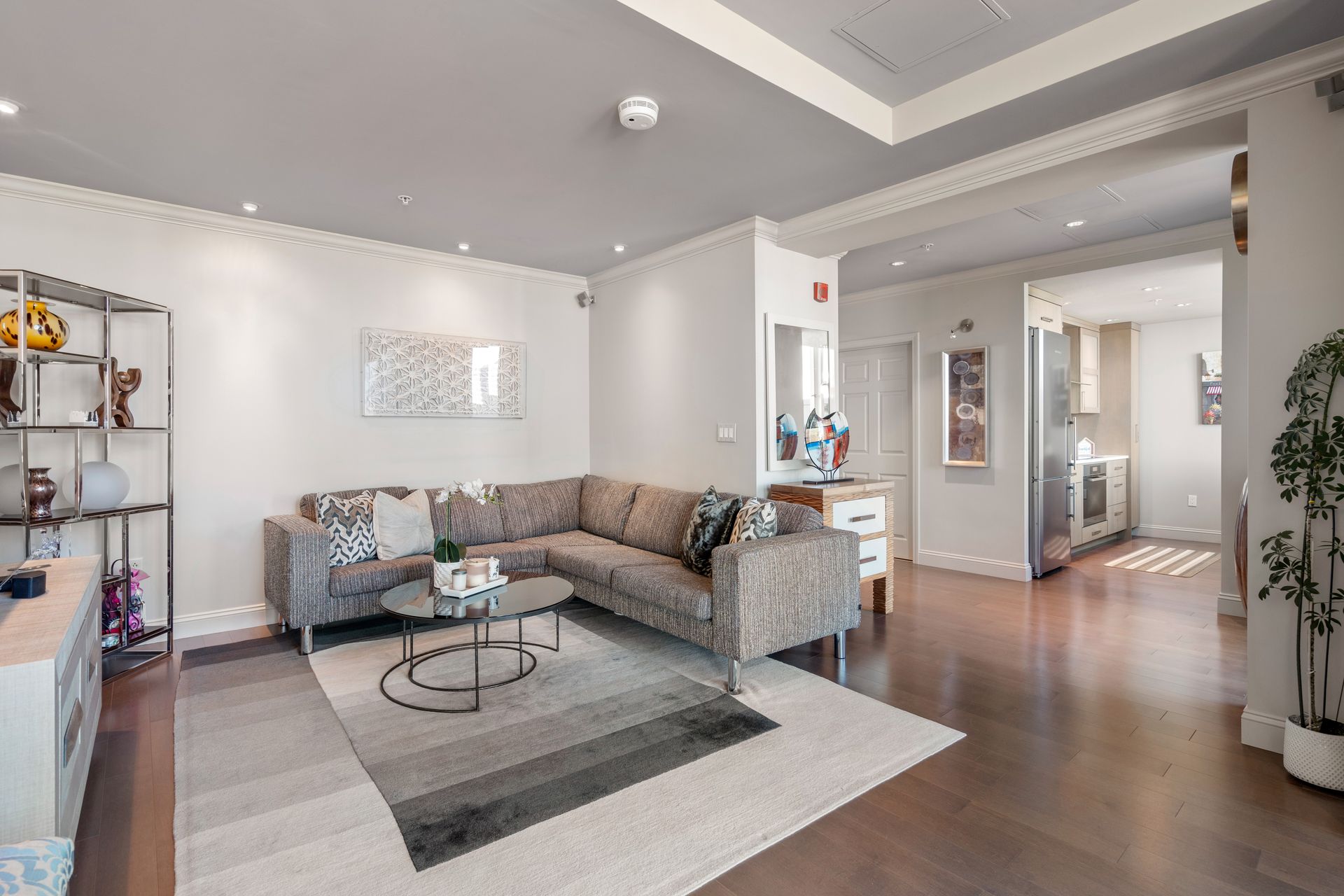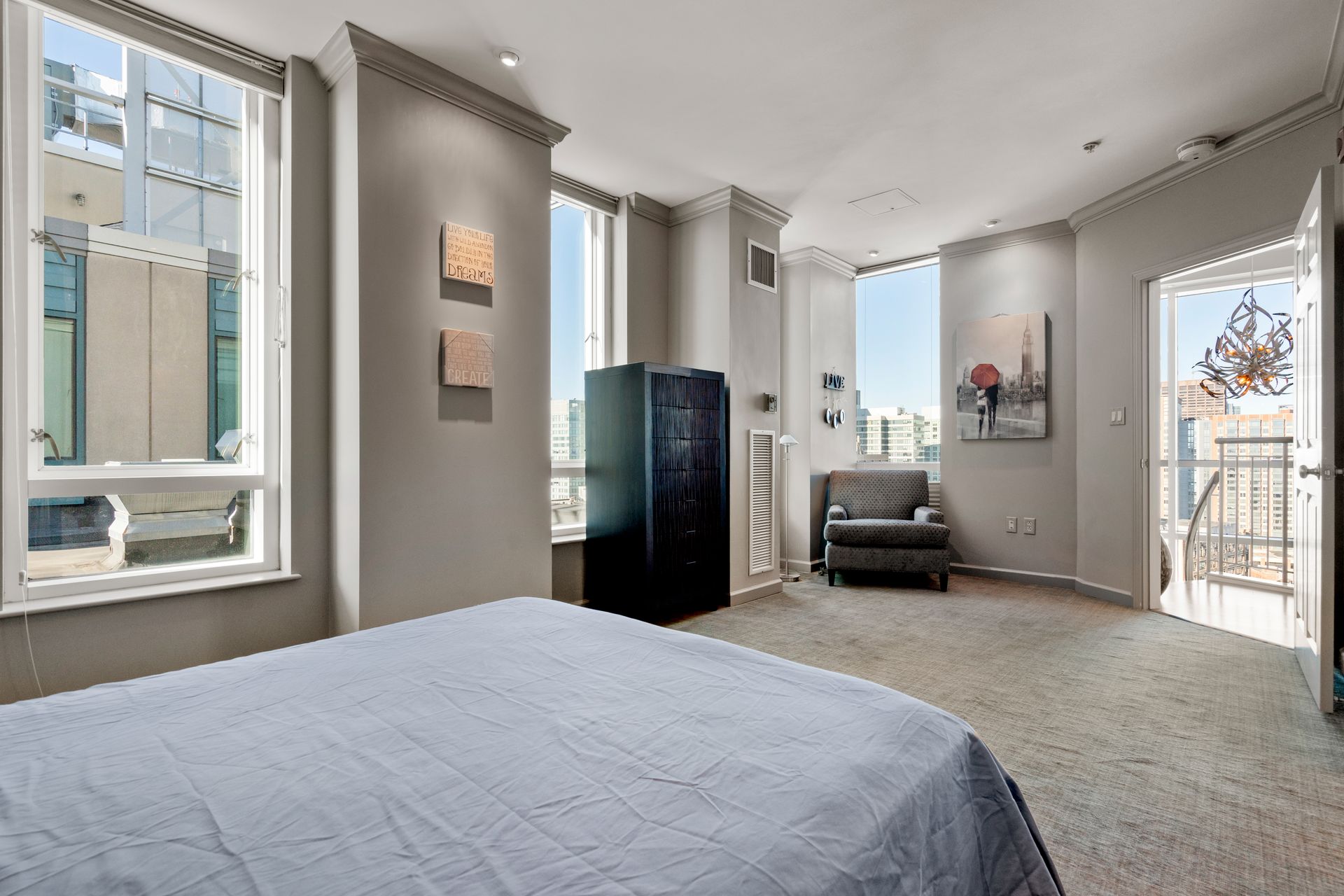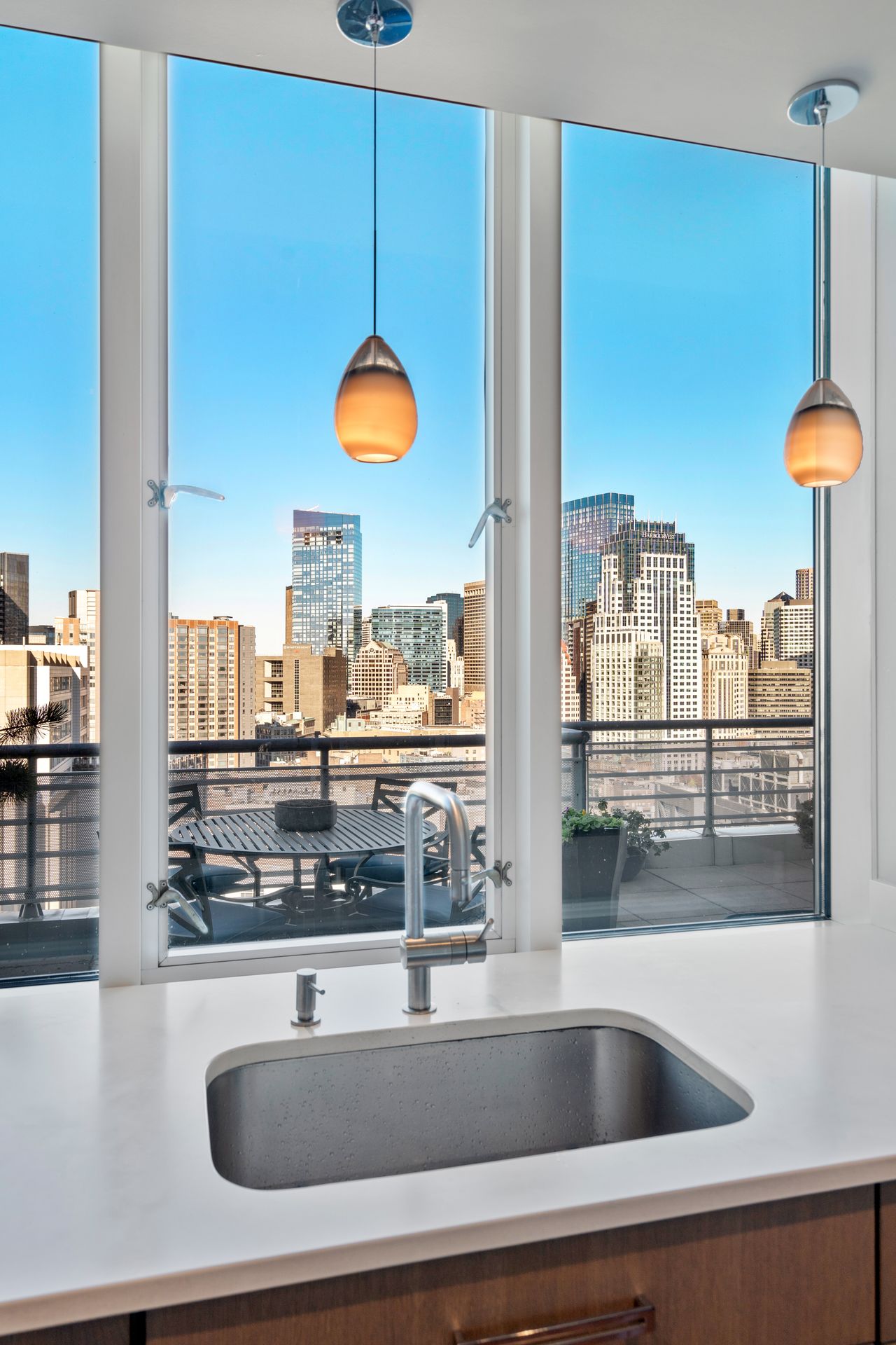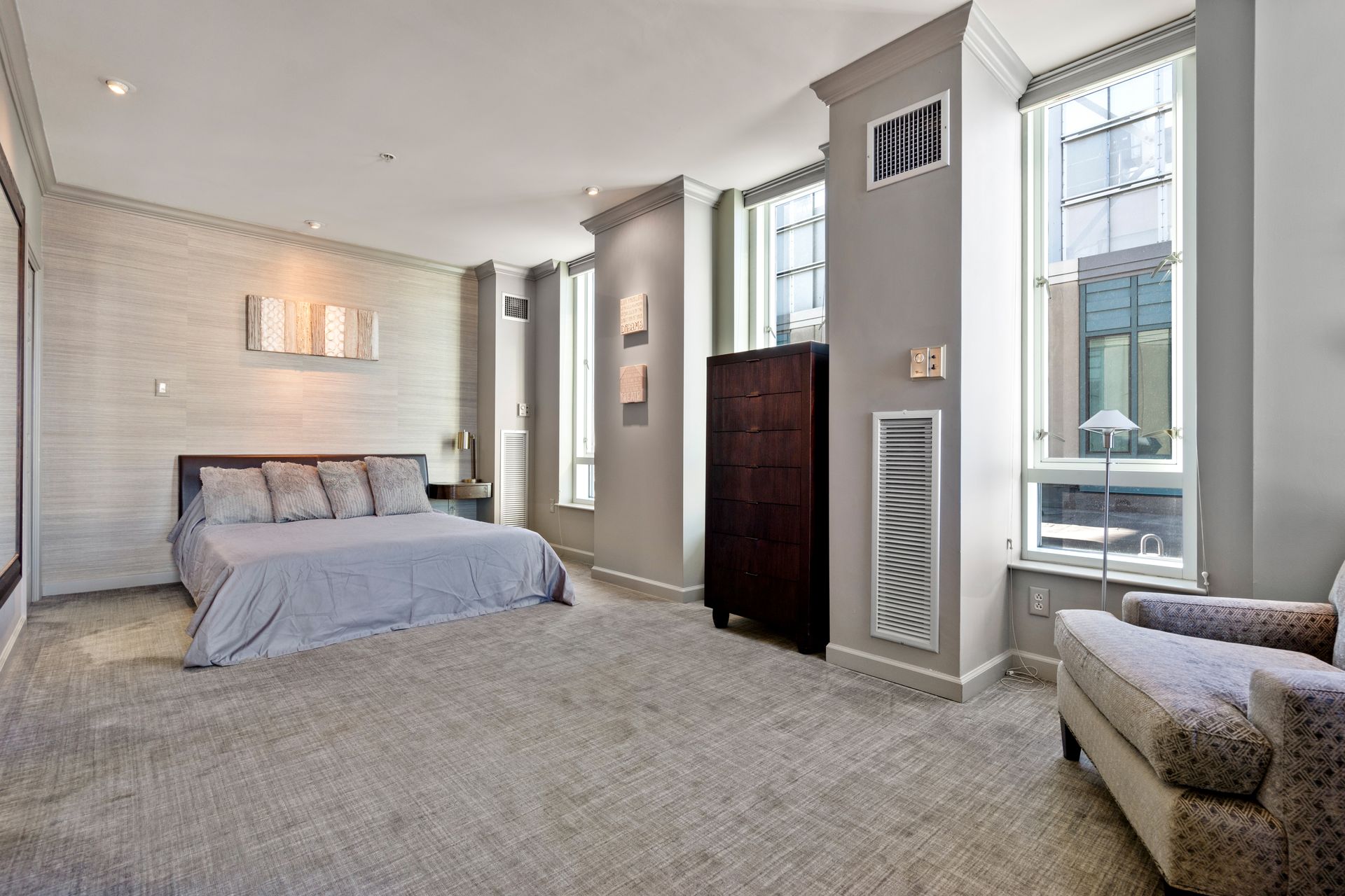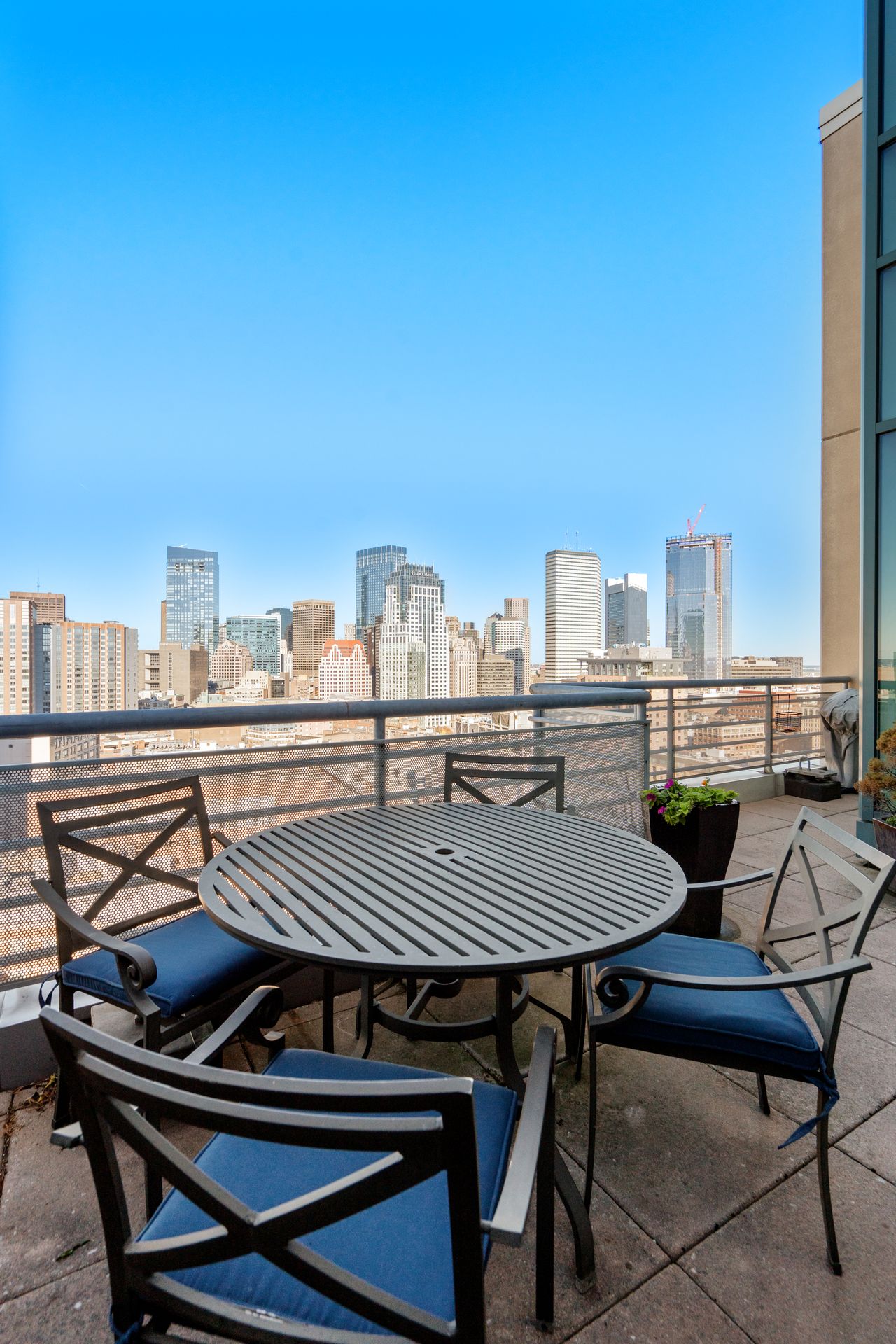 Experience urban luxury in this 2-bedroom, 2-bathroom penthouse duplex. This condo features stunning city views through floor-to-ceiling windows and a private deck, ideal for entertaining or relaxing. The open-concept living and dining area boasts hardwood floors, custom lighting, and built-in dining with a bench and table. The modern kitchen includes custom cabinetry, quartz countertops, and oversized windows showcasing panoramic views. A unique spiral staircase with corner windows connects both levels. The primary bedroom offers city views and an en-suite bathroom with marble flooring and a glass shower. The guest bedroom features a built-in desk overlooking the city. A full second bathroom and in-unit laundry add convenience. The Metropolitan provides 24-hour concierge service, deeded storage, and valet parking. Ideally located near Tufts Medical Center, the South End, Downtown, Whole Foods, dining, shopping, highways, and public transit, with Orange and Silver Line stops nearby.