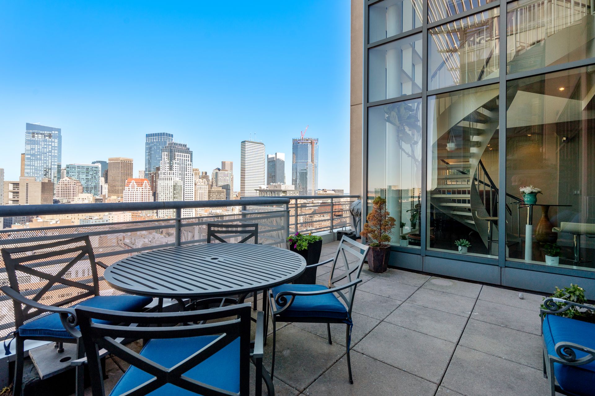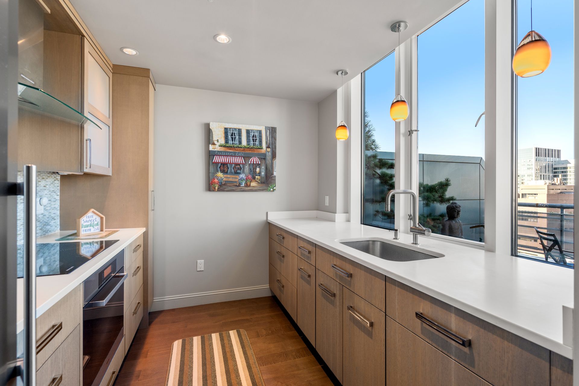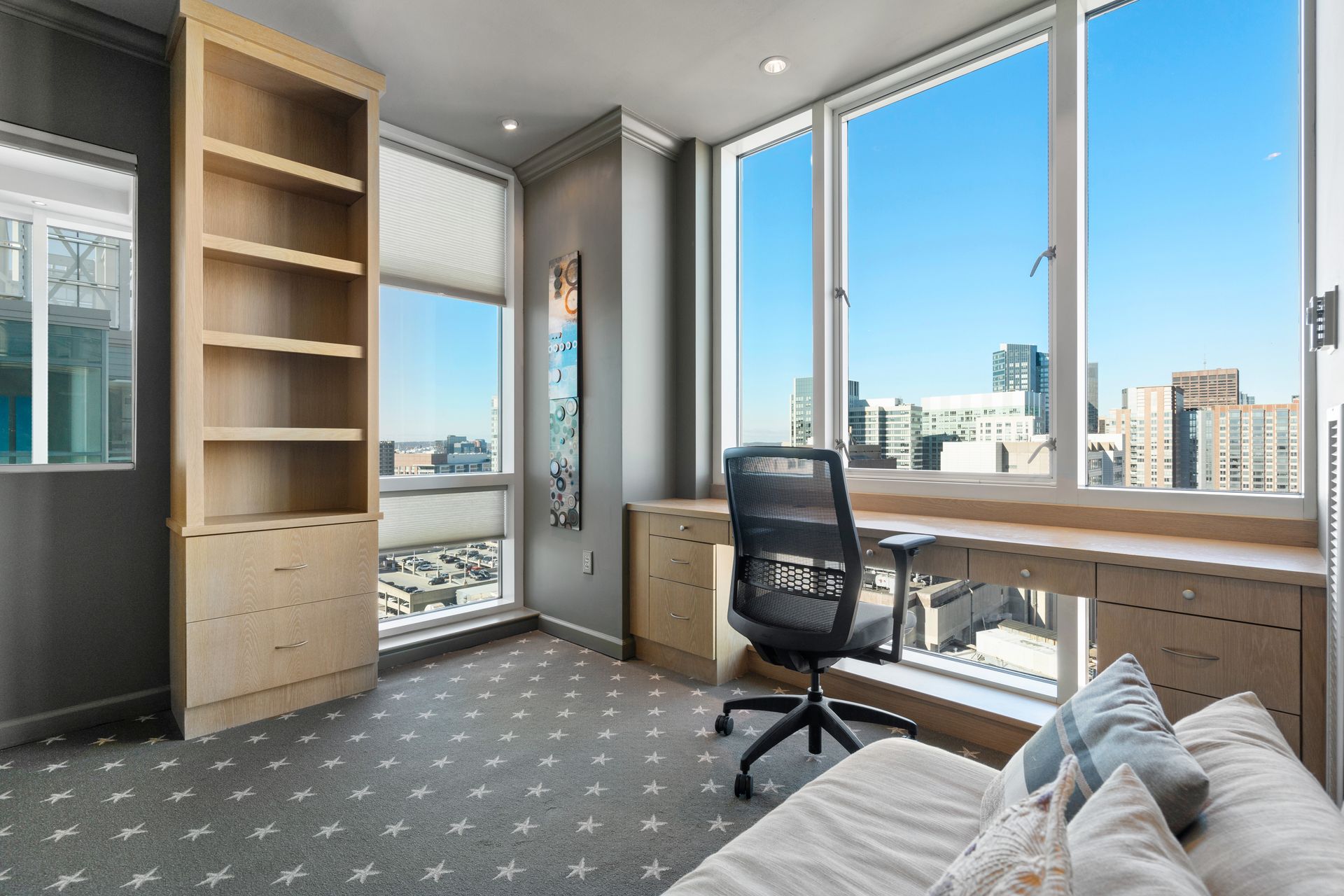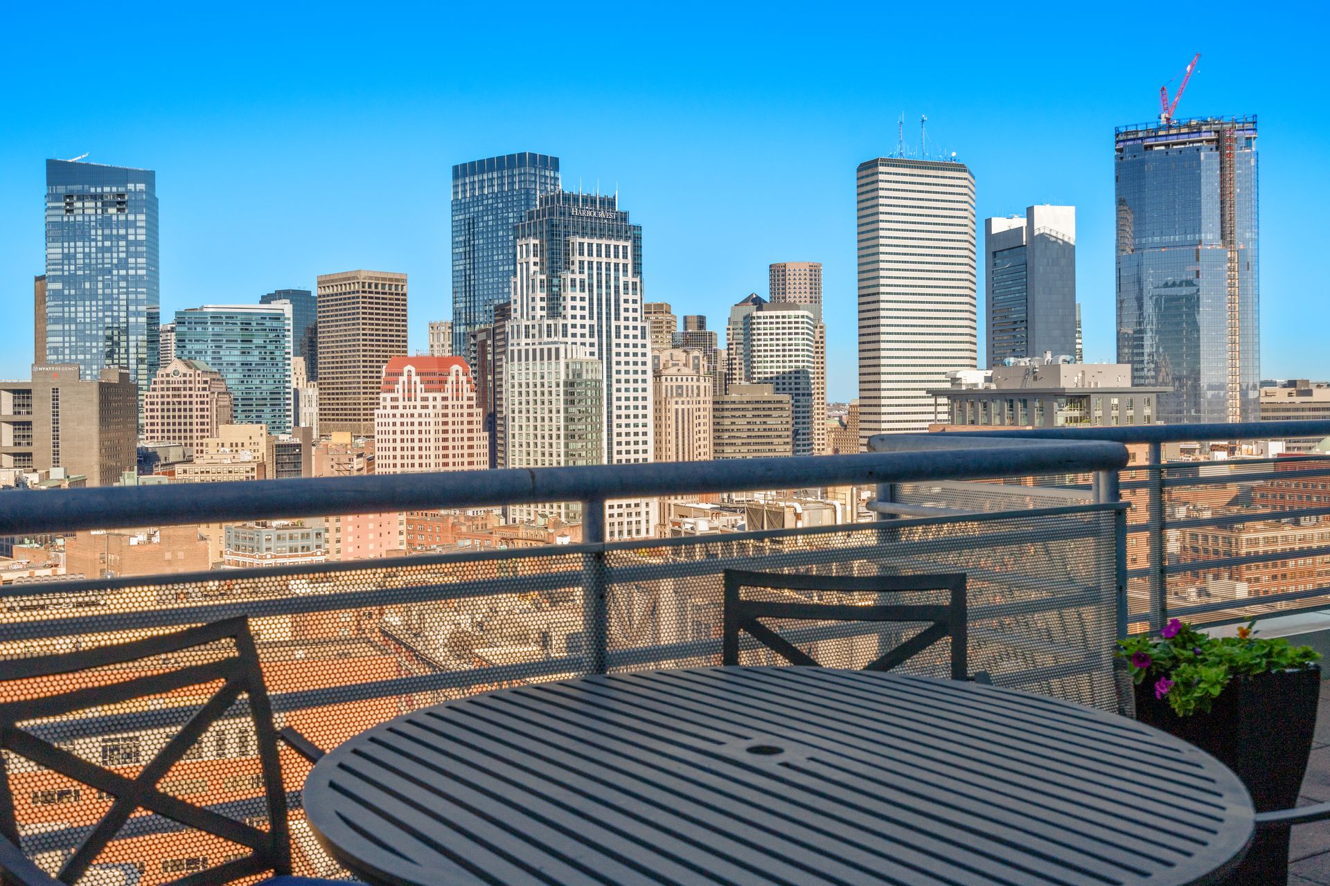 Experience urban luxury in this 2-bedroom, 2-bathroom penthouse duplex. This condo features stunning city views through floor-to-ceiling windows and a private deck, ideal for entertaining or relaxing. The open-concept living and dining area boasts hardwood floors, custom lighting, and built-in dining with a bench and table. The modern kitchen includes custom cabinetry, quartz countertops, and oversized windows showcasing panoramic views. A unique spiral staircase with corner windows connects both levels. The primary bedroom offers city views and an en-suite bathroom with marble flooring and a glass shower. The guest bedroom features a built-in desk overlooking the city. A full second bathroom and in-unit laundry add convenience. The Metropolitan provides 24-hour concierge service, deeded storage, and valet parking. Ideally located near Tufts Medical Center, the South End, Downtown, Whole Foods, dining, shopping, highways, and public transit, with Orange and Silver Line stops nearby.