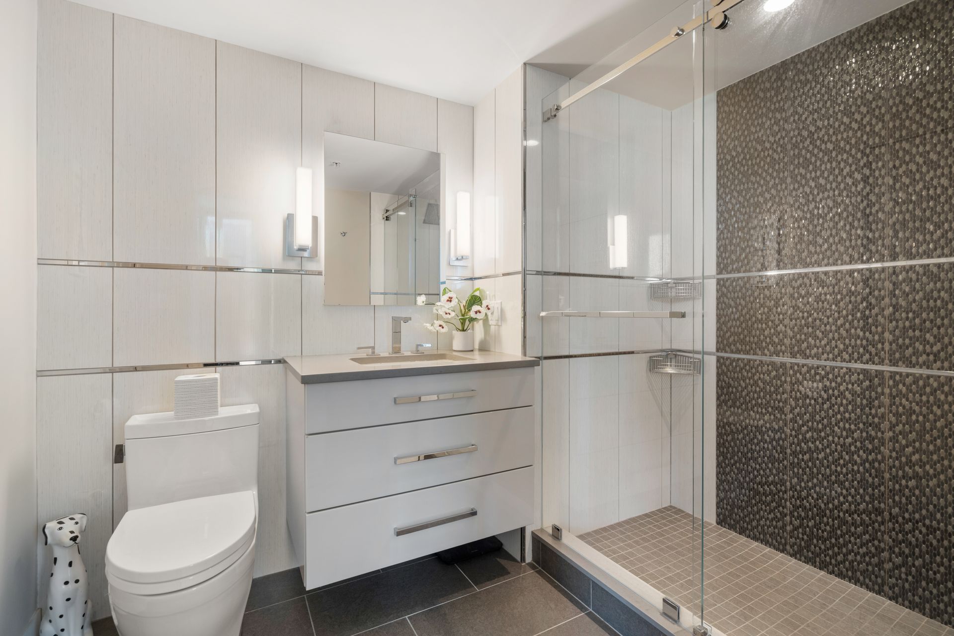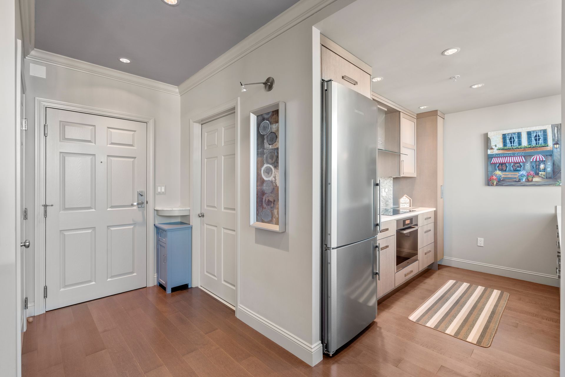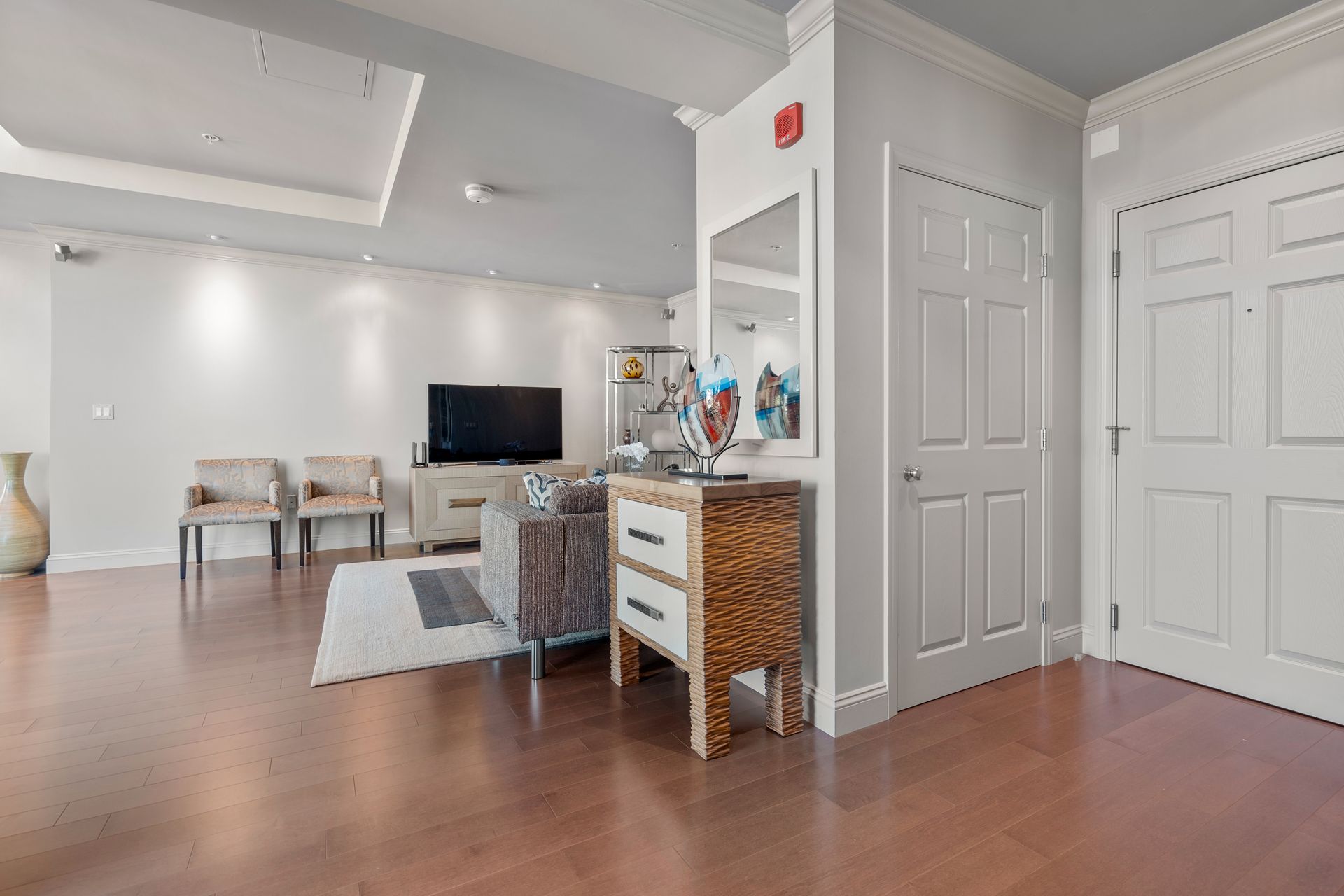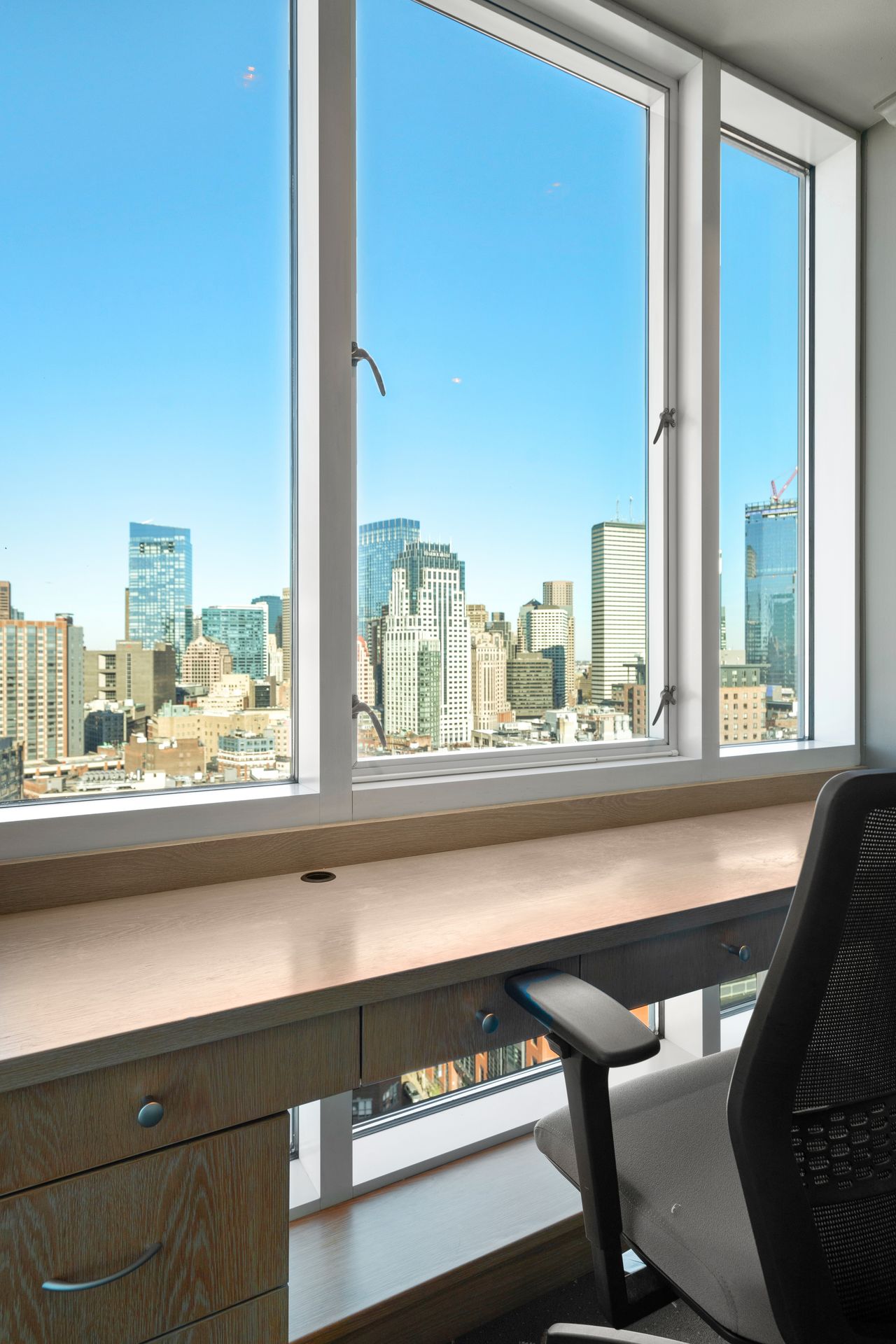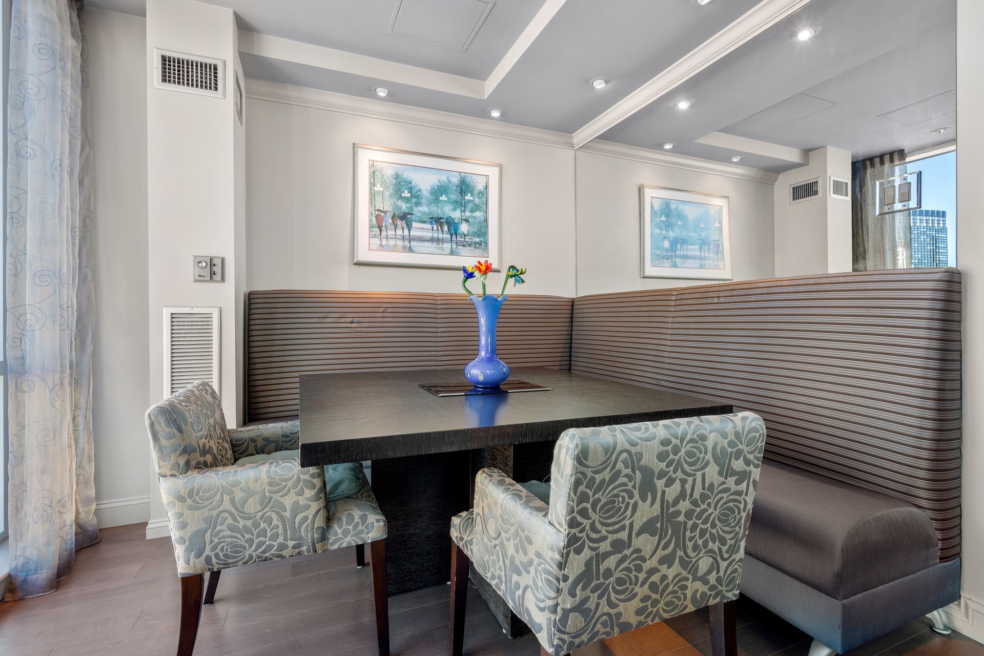 Experience urban luxury in this 2-bedroom, 2-bathroom penthouse duplex. This condo features stunning city views through floor-to-ceiling windows and a private deck, ideal for entertaining or relaxing. The open-concept living and dining area boasts hardwood floors, custom lighting, and built-in dining with a bench and table. The modern kitchen includes custom cabinetry, quartz countertops, and oversized windows showcasing panoramic views. A unique spiral staircase with corner windows connects both levels. The primary bedroom offers city views and an en-suite bathroom with marble flooring and a glass shower. The guest bedroom features a built-in desk overlooking the city. A full second bathroom and in-unit laundry add convenience. The Metropolitan provides 24-hour concierge service, deeded storage, and valet parking. Ideally located near Tufts Medical Center, the South End, Downtown, Whole Foods, dining, shopping, highways, and public transit, with Orange and Silver Line stops nearby.