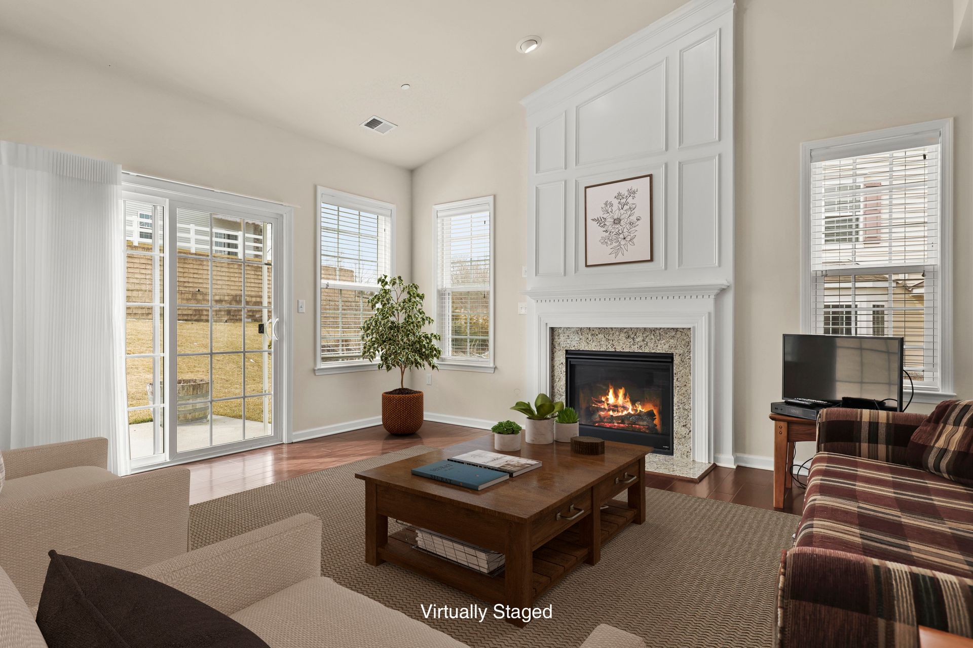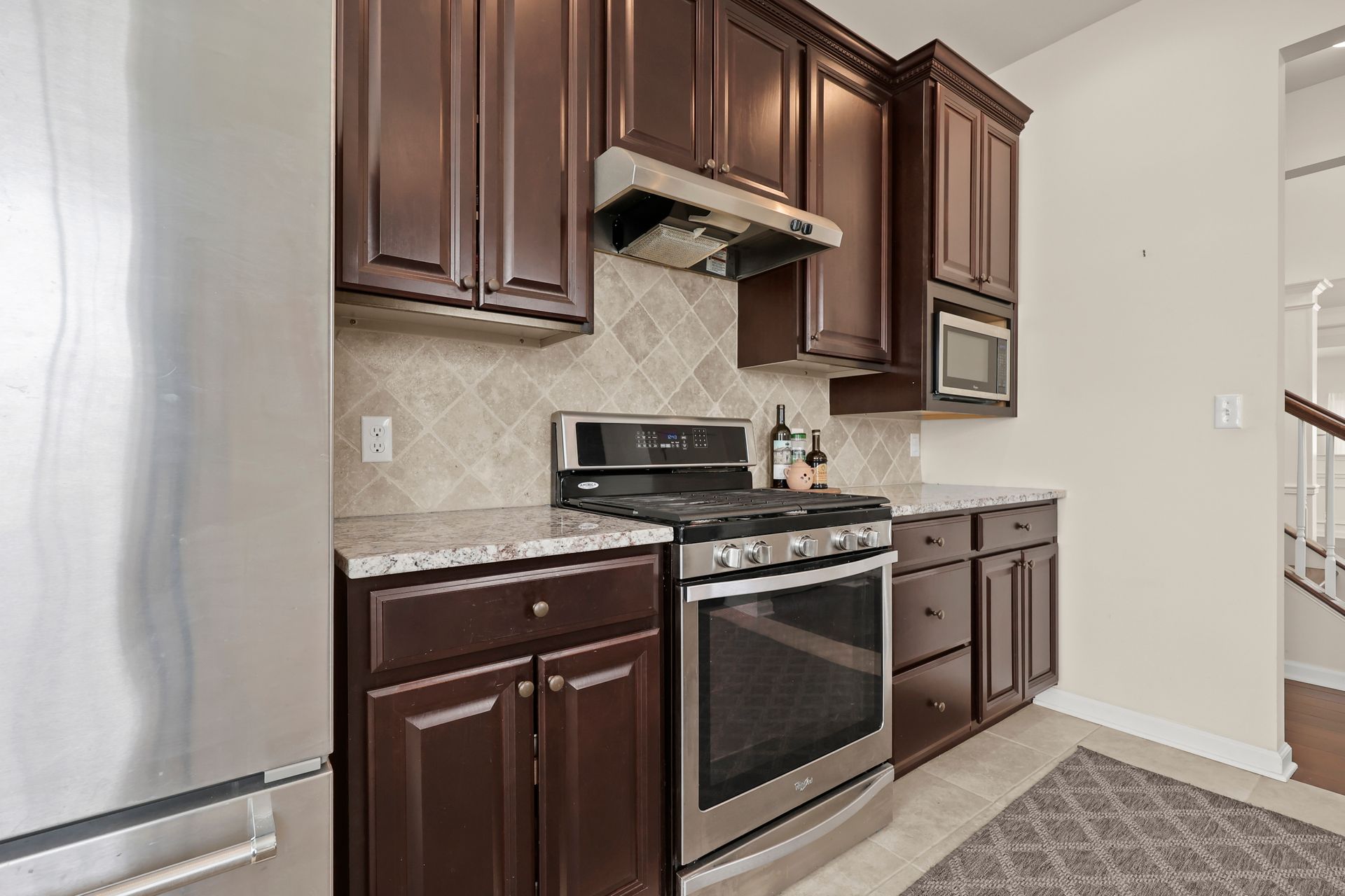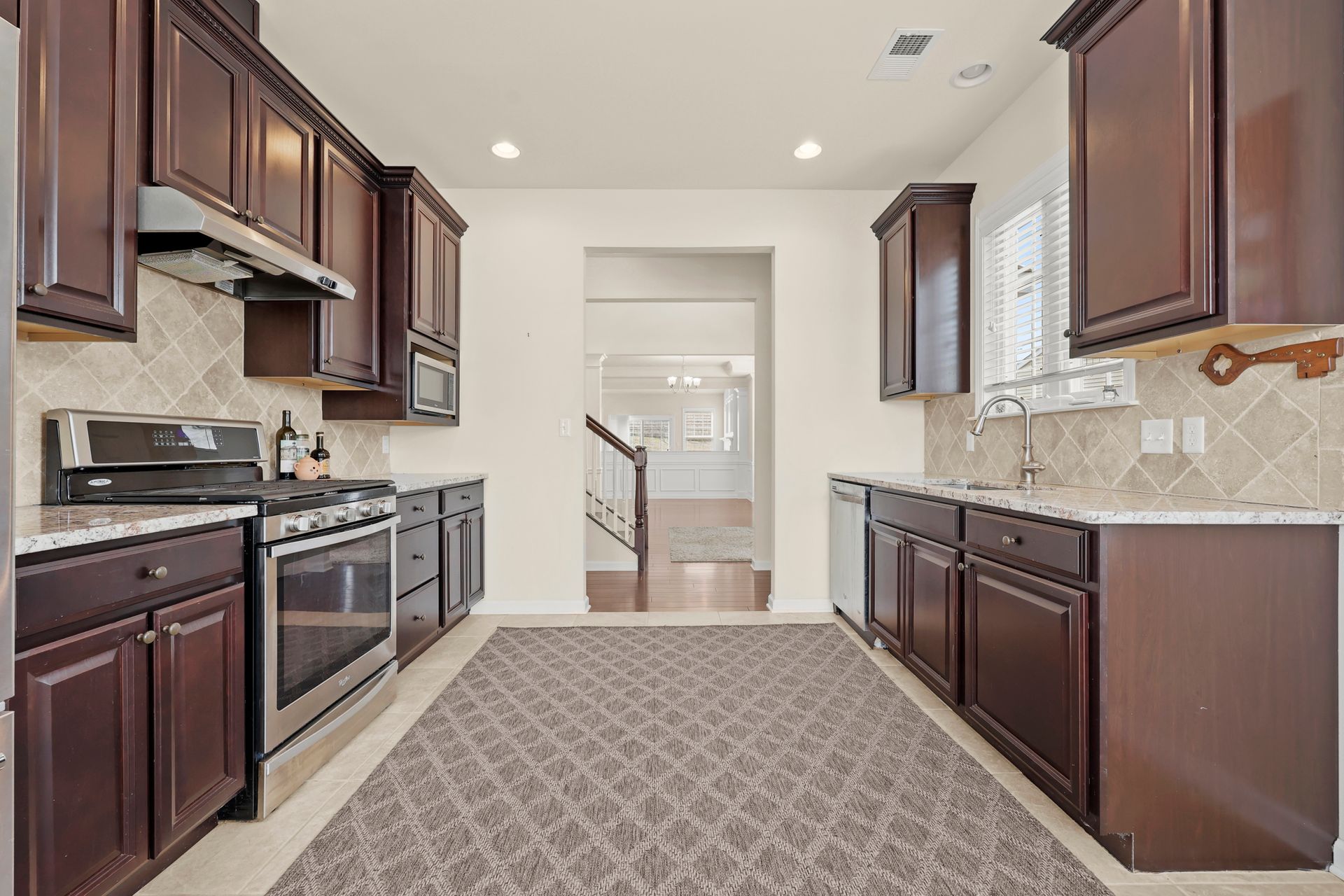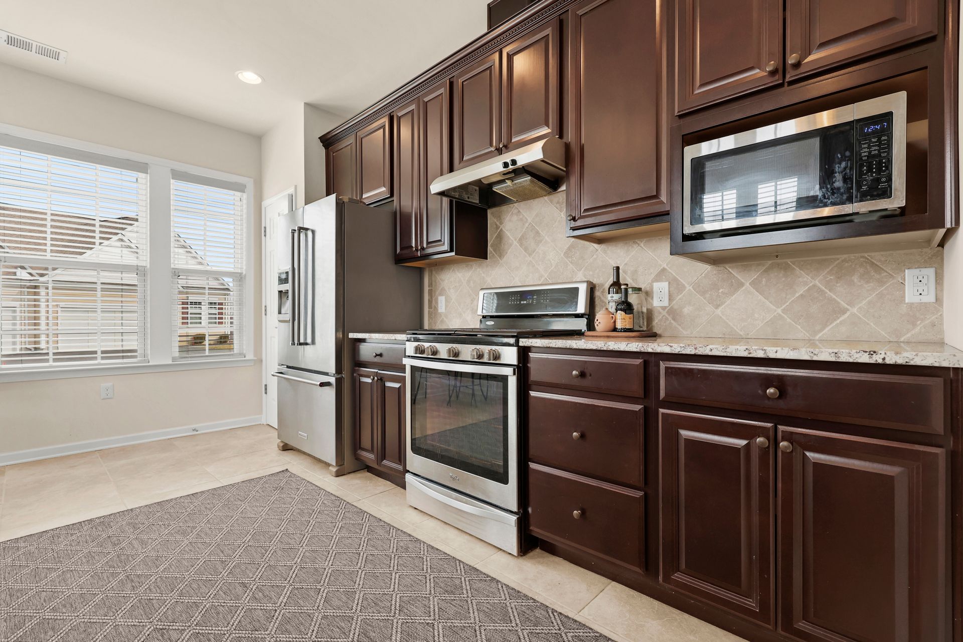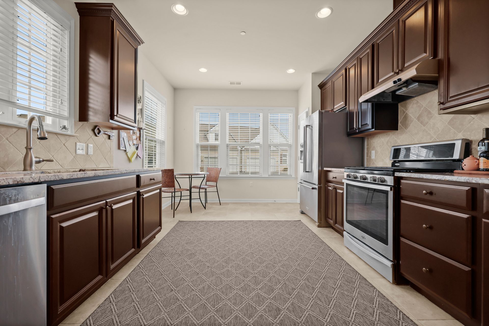 Sought after END UNIT two bedroom light and bright townhome with an open floor plan, The eat-in-kitchen has a pantry, stainless steel appliances including a five burner convection range and a French door refrigerator, granite countertops, tumbled marble backsplash and maple cabinets. First-floor spacious primary suite with a large L-shaped walk-in closet and a full bath with double vanity with a granite countertop. A family room boasting a gas fireplace and sliding glass doors to the patio, dining room with elegant tray ceiling, den/office, powder room and laundry round off the first floor.