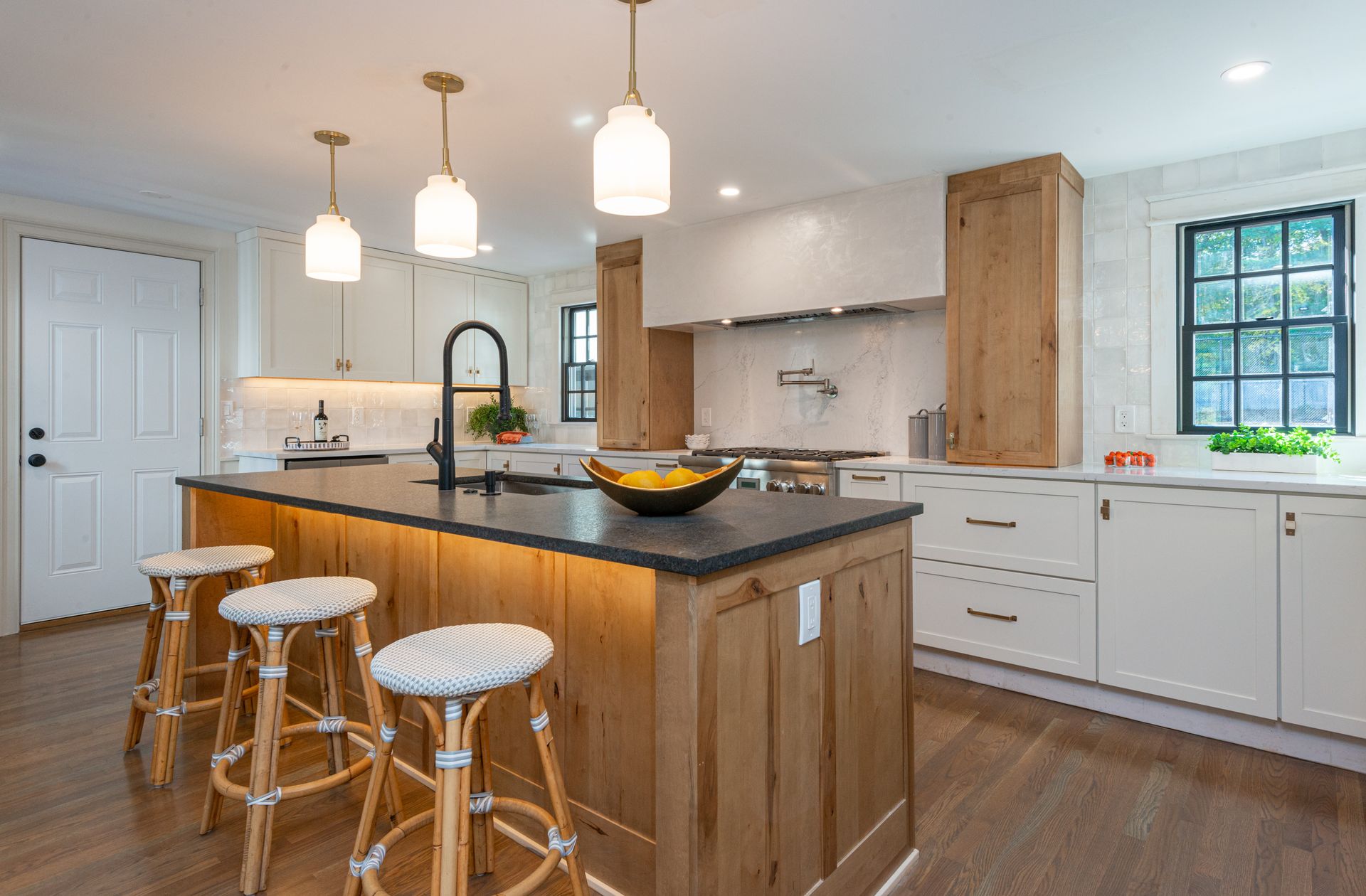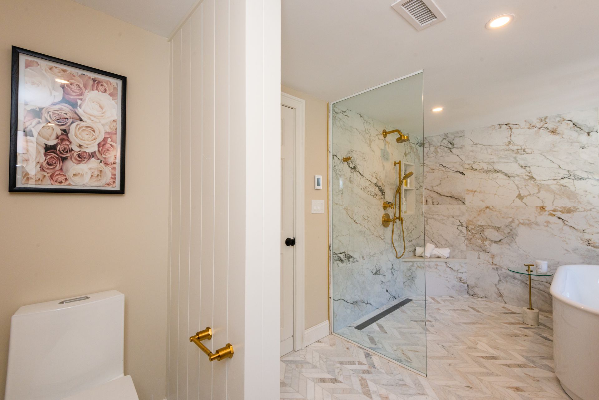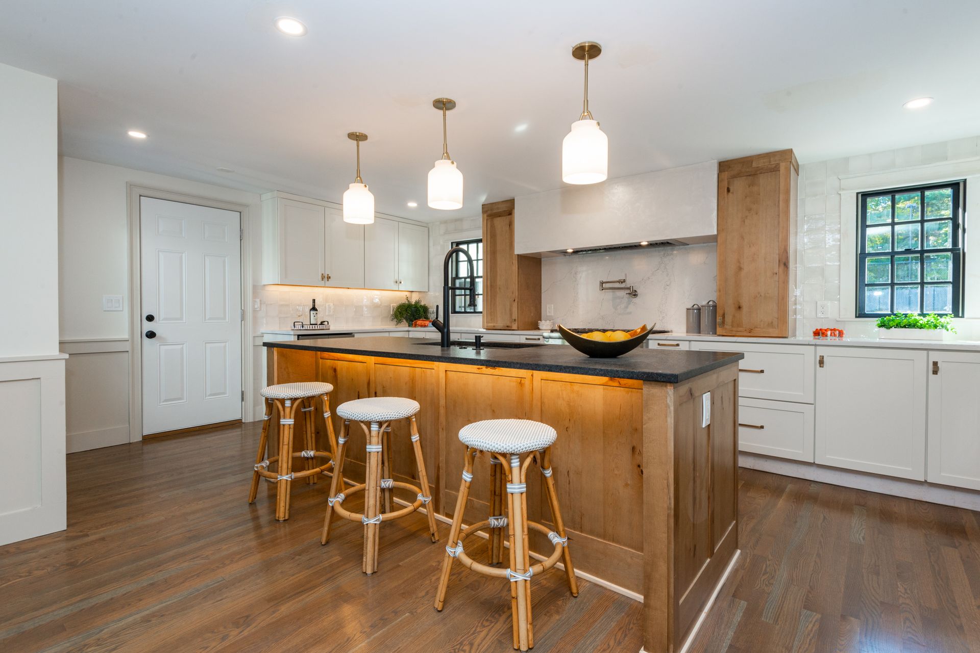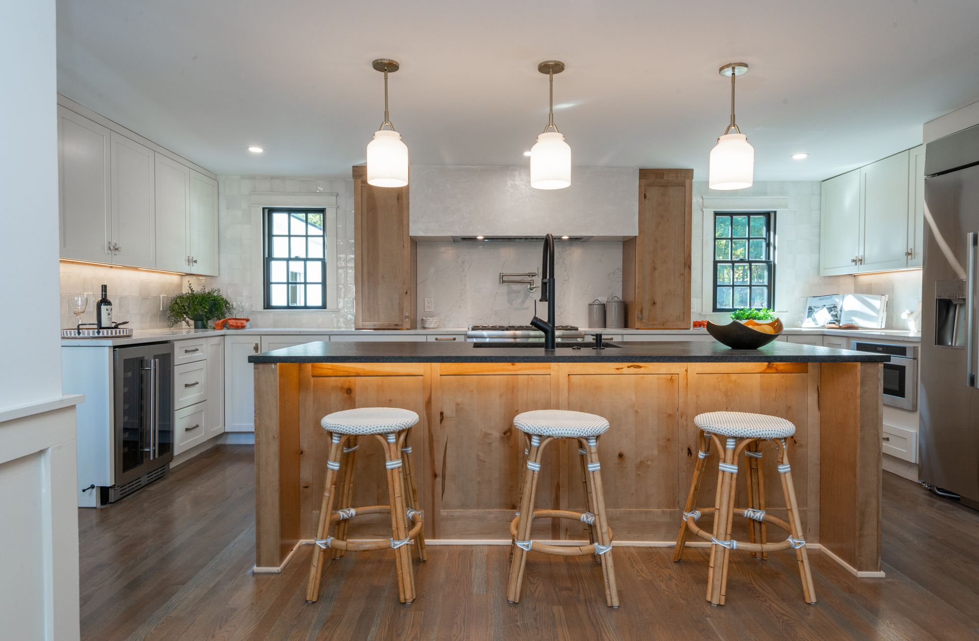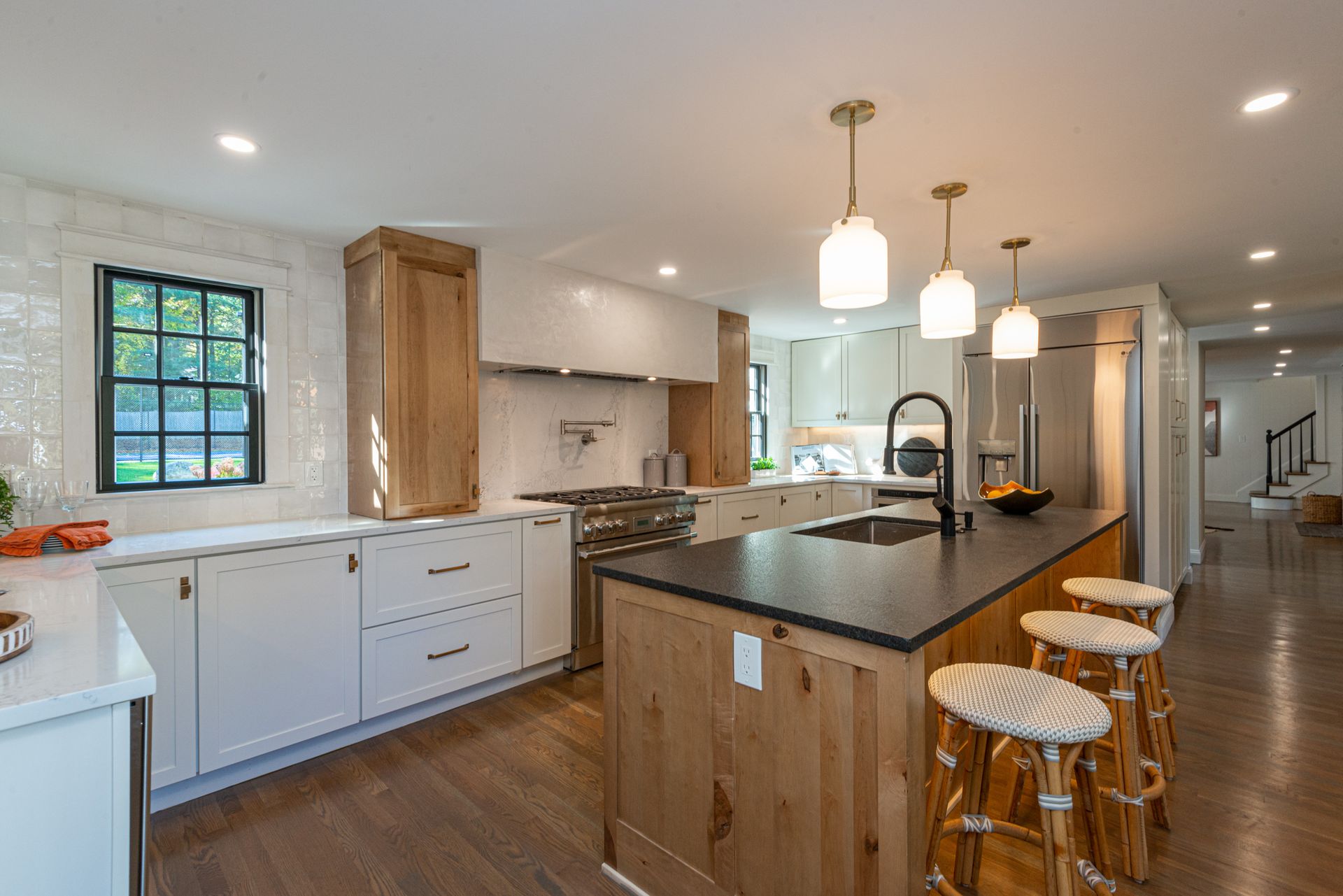 The interior of the home is equally impressive, with a new interior trim package and custom kitchen featuring high-end appliances such as a 42” fridge, Thermador 36” gas pro-series range, and a wine cooler. The countertops are Caesarstone, adding a touch of elegance to the space. Additionally, there are 4.5 new bathrooms, all featuring marble and porcelain tile, heated floors, and a soaking tub in the primary bathroom wet room. The Kohler plumbing fixtures throughout are both functional and stylish.