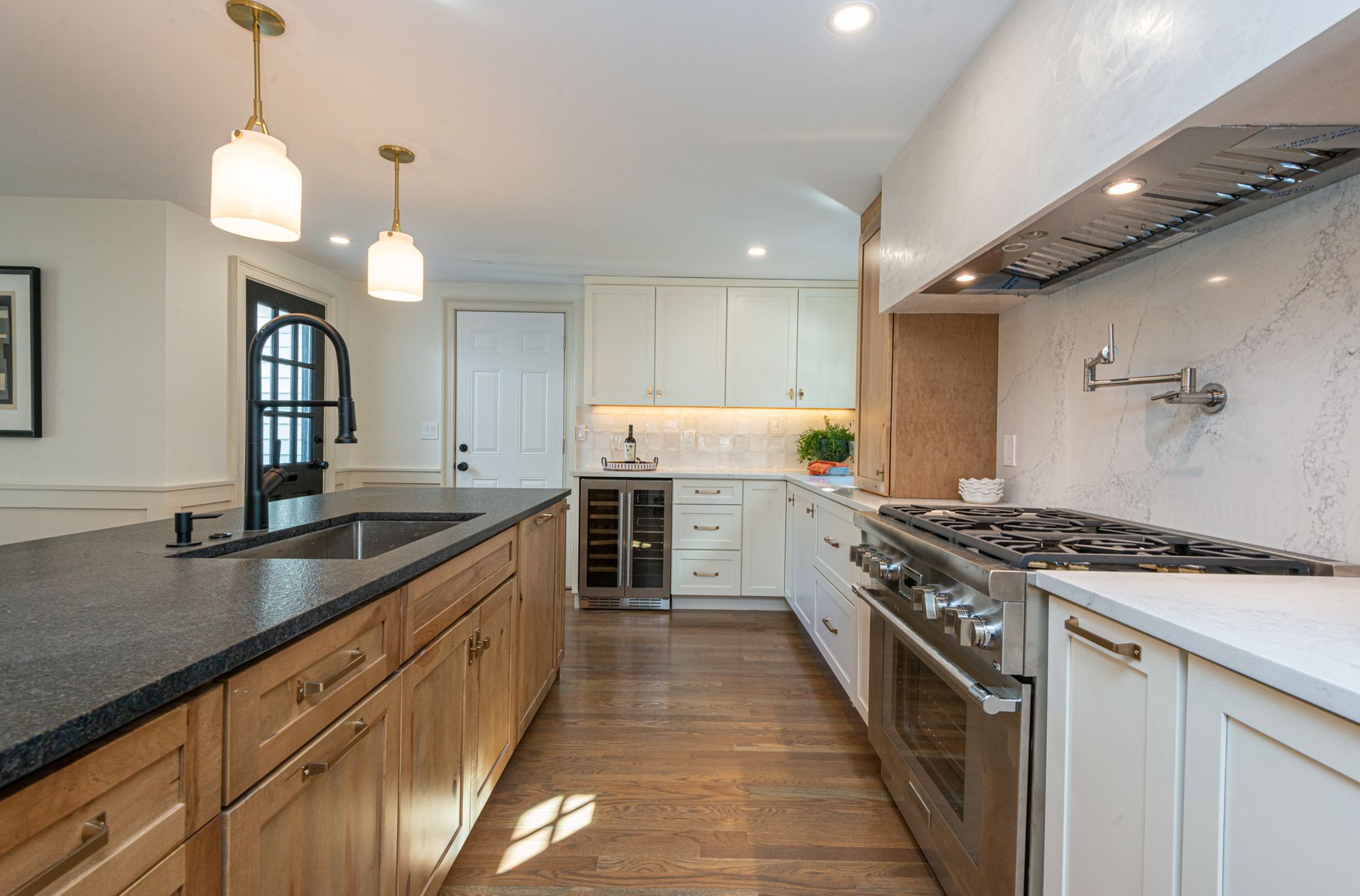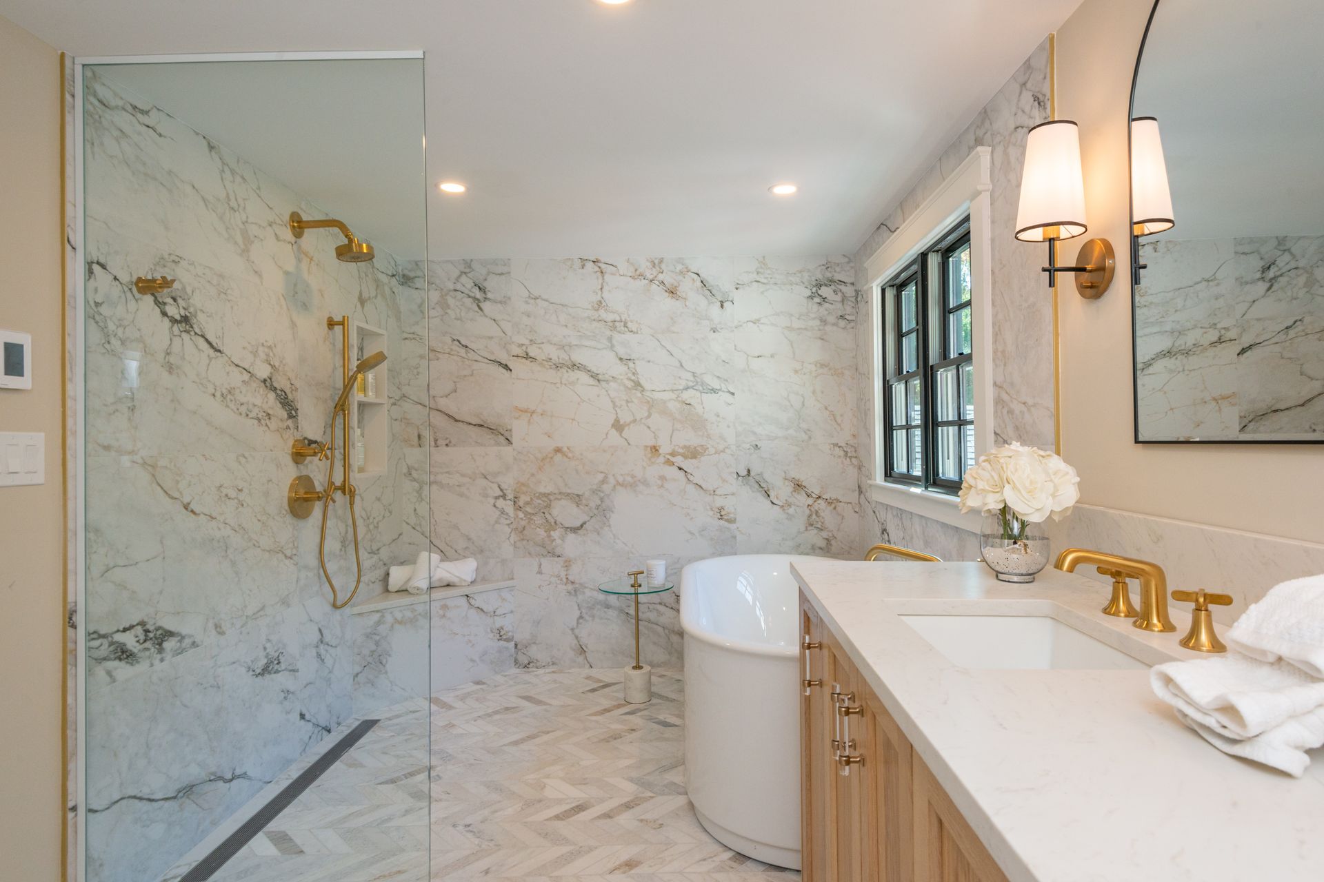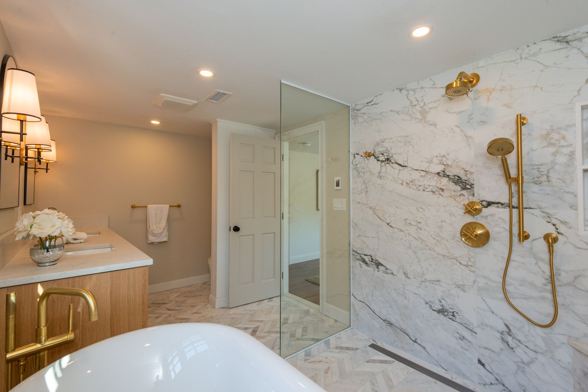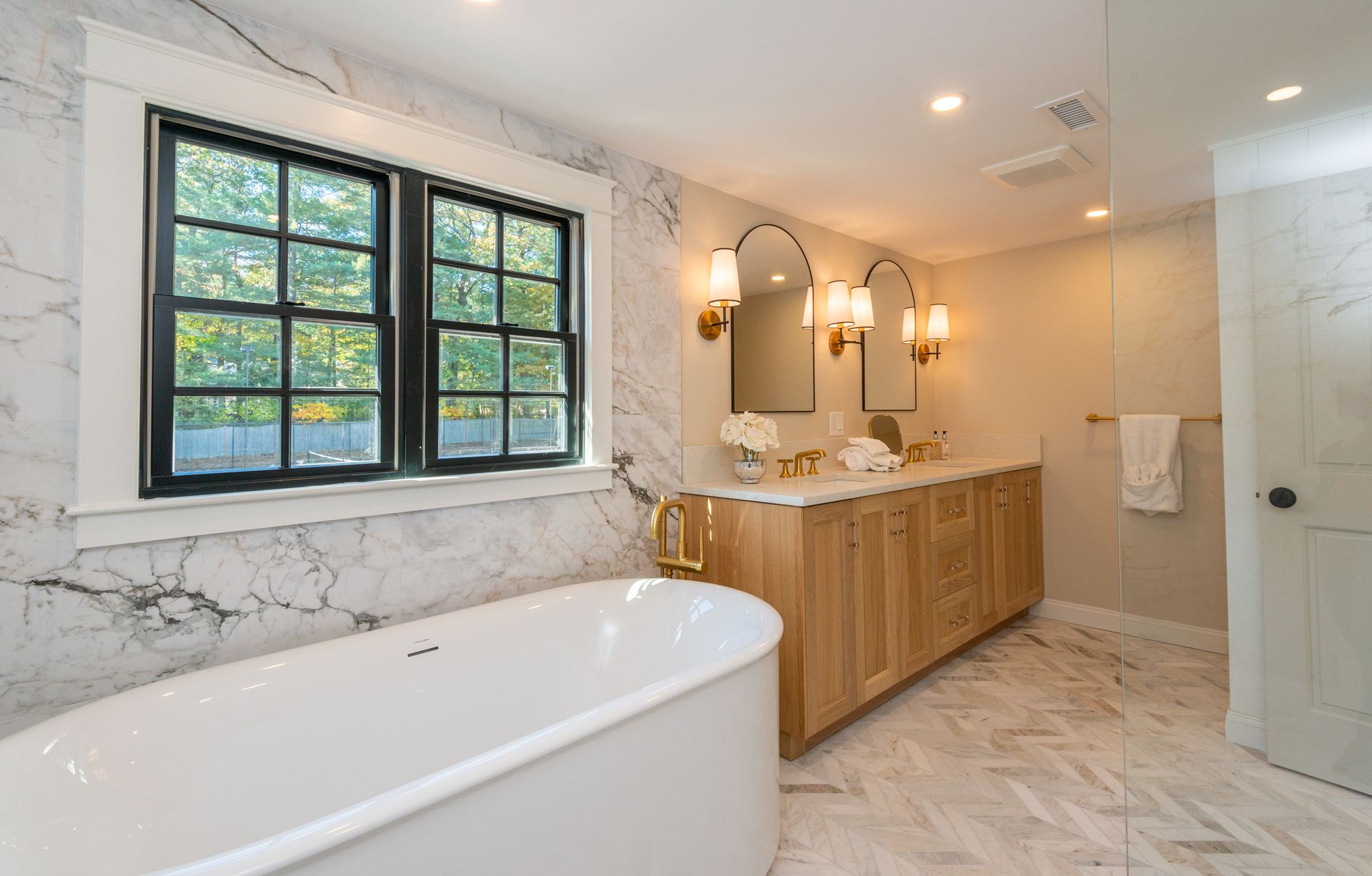 The interior of the home is equally impressive, with a new interior trim package and custom kitchen featuring high-end appliances such as a 42” fridge, Thermador 36” gas pro-series range, and a wine cooler. The countertops are Caesarstone, adding a touch of elegance to the space. Additionally, there are 4.5 new bathrooms, all featuring marble and porcelain tile, heated floors, and a soaking tub in the primary bathroom wet room. The Kohler plumbing fixtures throughout are both functional and stylish.