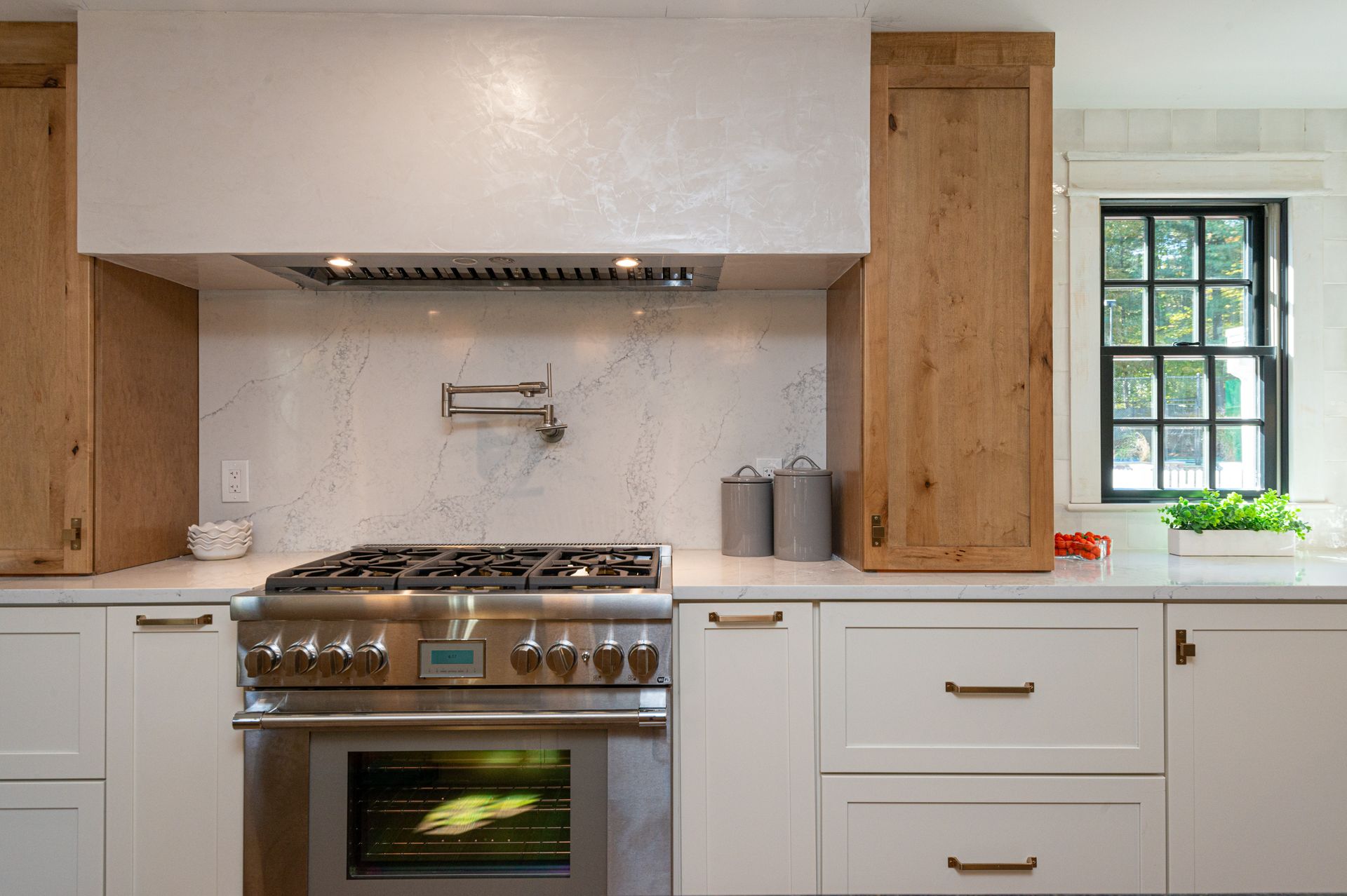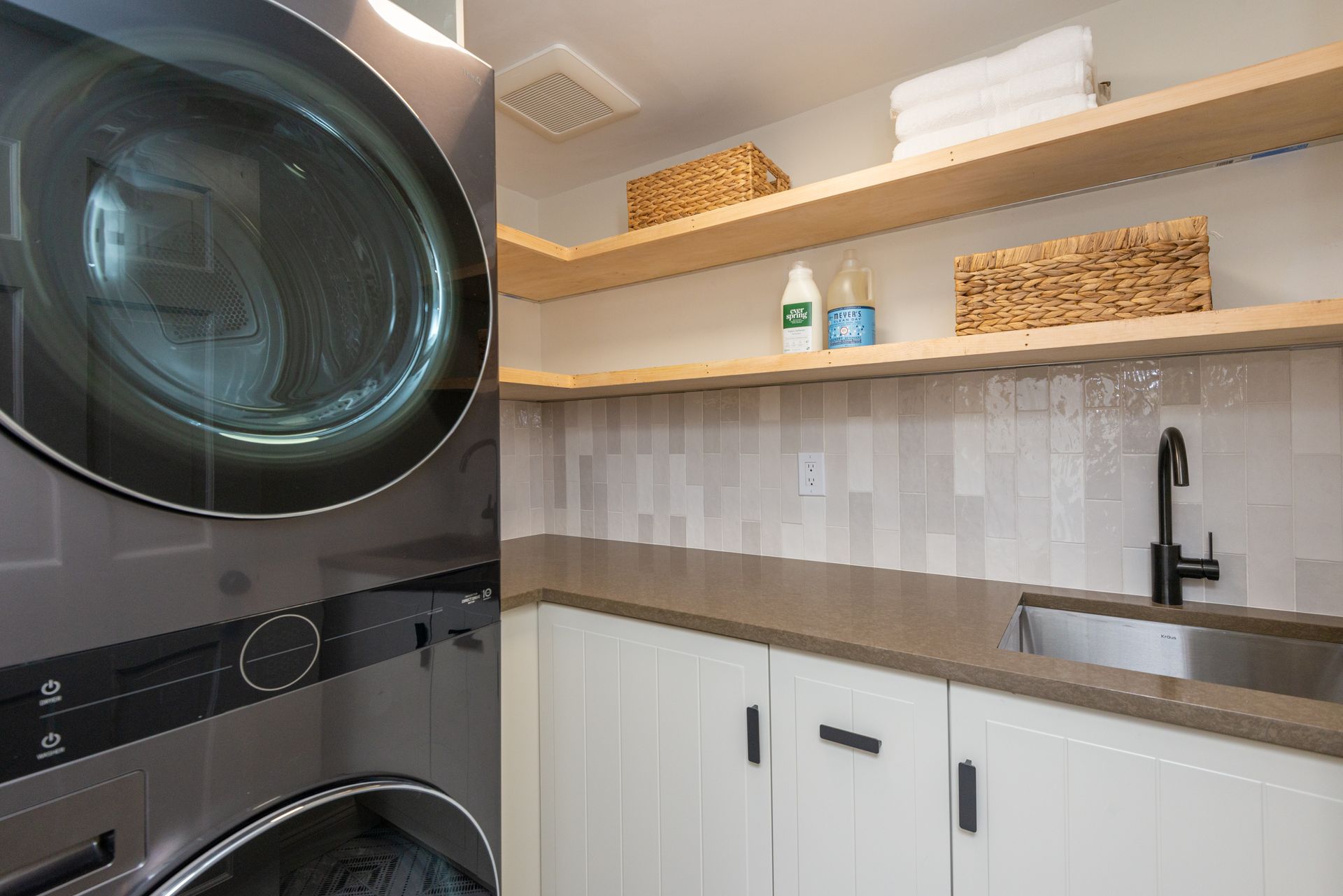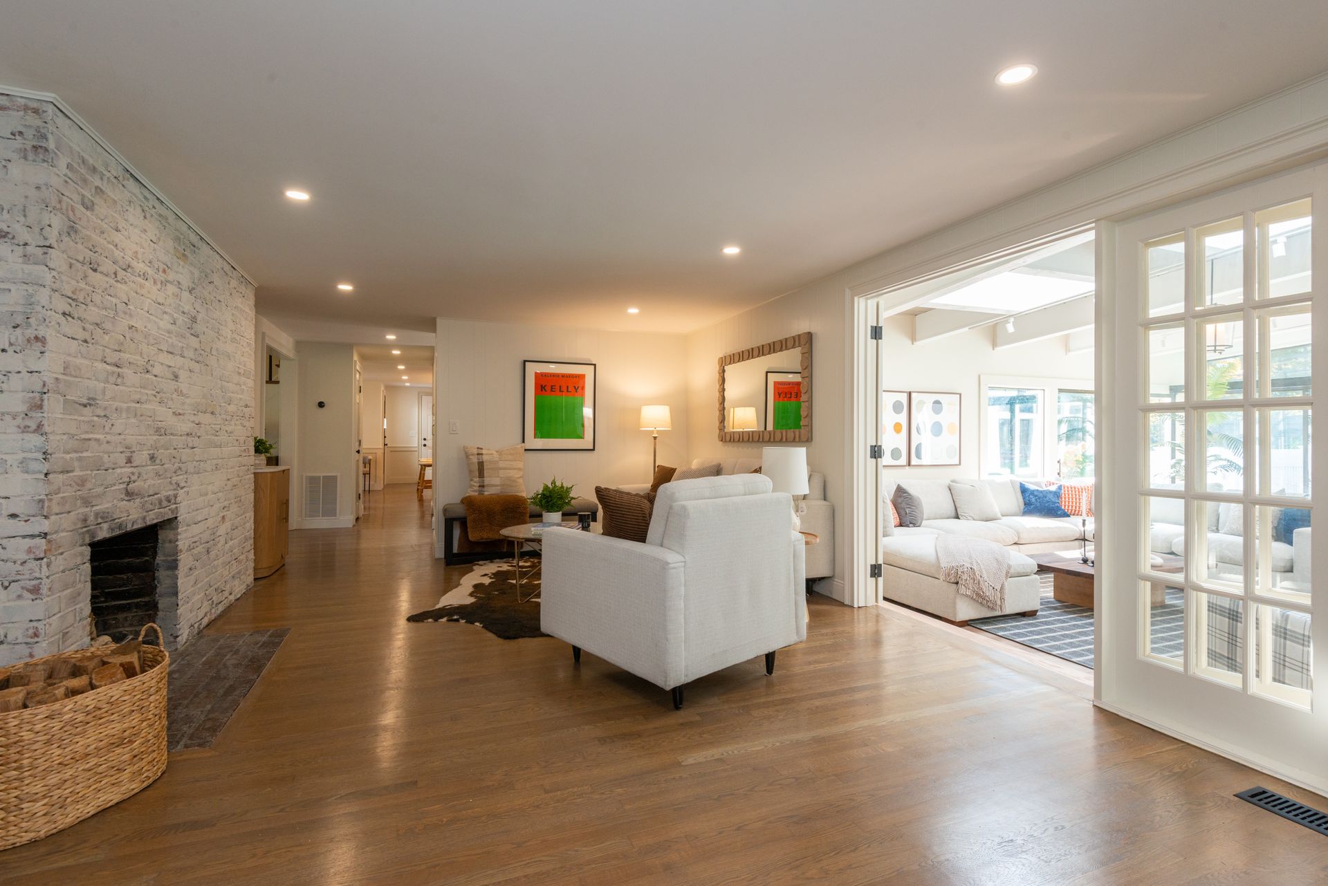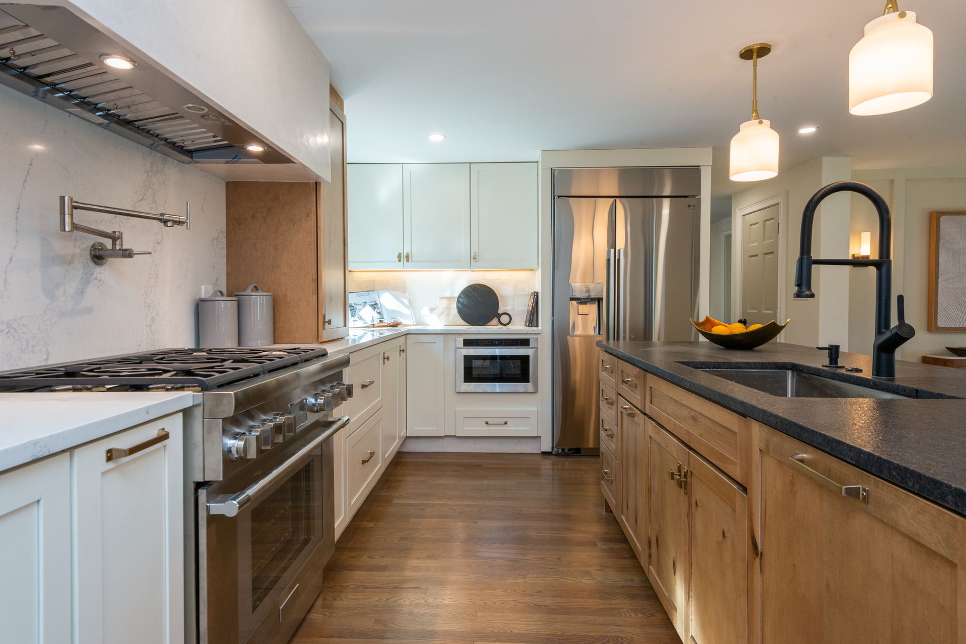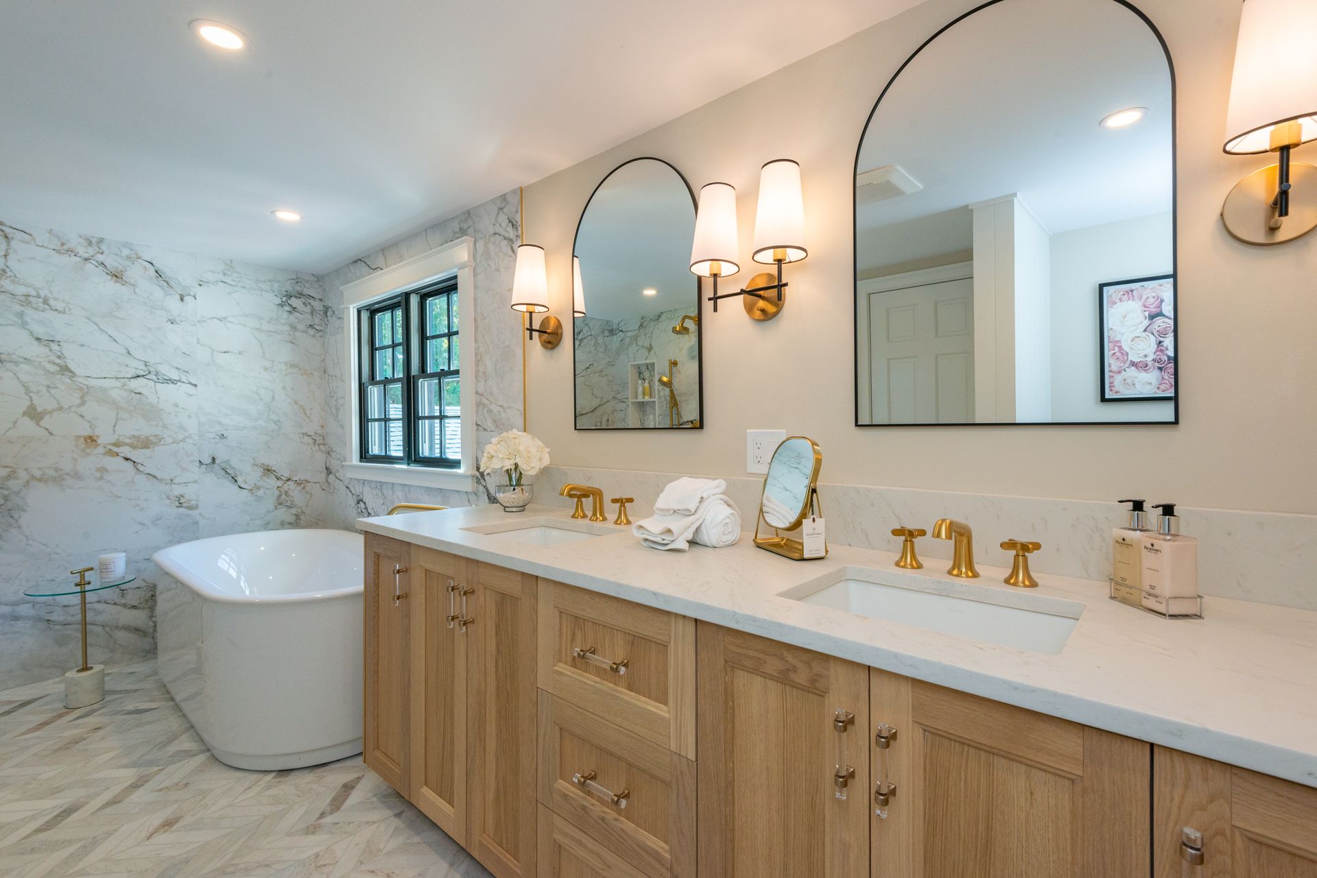 The interior of the home is equally impressive, with a new interior trim package and custom kitchen featuring high-end appliances such as a 42” fridge, Thermador 36” gas pro-series range, and a wine cooler. The countertops are Caesarstone, adding a touch of elegance to the space. Additionally, there are 4.5 new bathrooms, all featuring marble and porcelain tile, heated floors, and a soaking tub in the primary bathroom wet room. The Kohler plumbing fixtures throughout are both functional and stylish.