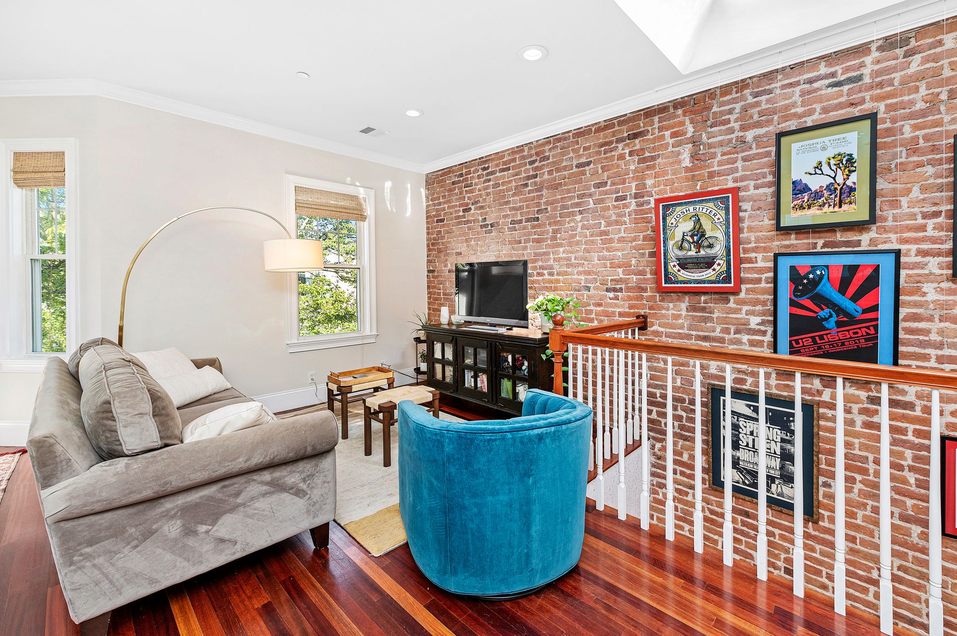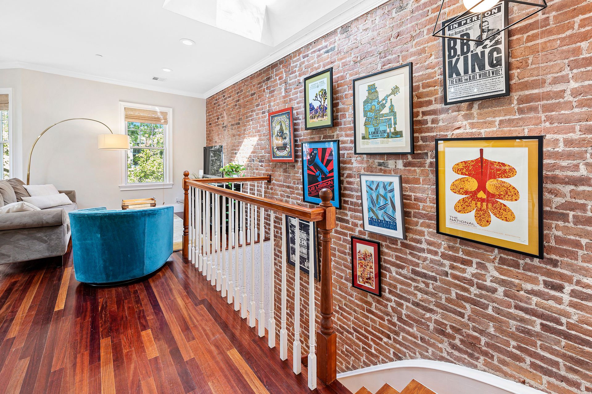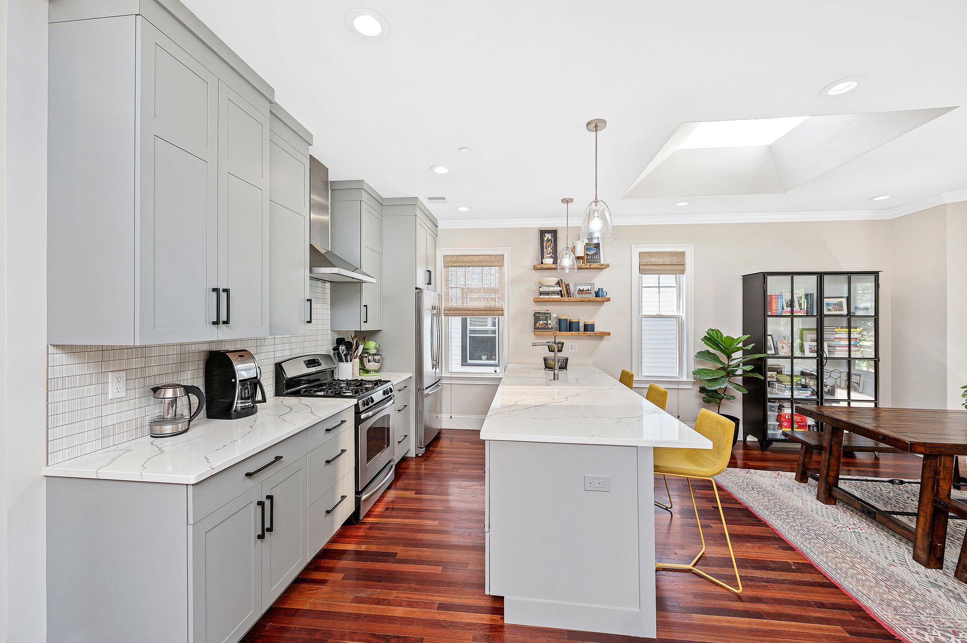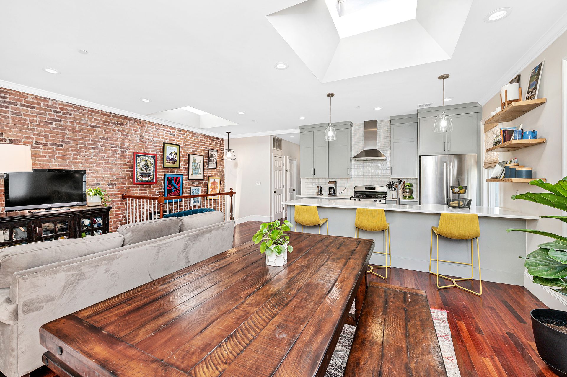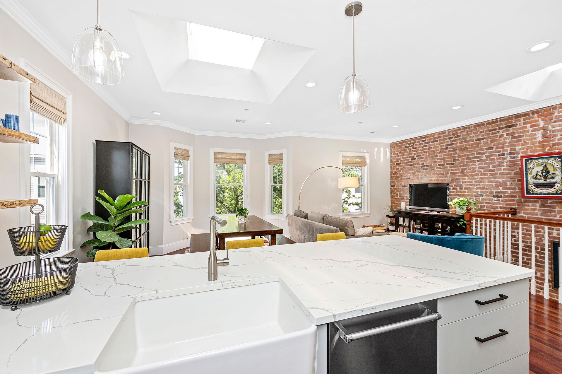 This third floor top unit has it all! Large skylights over the flowy great room with living room, dining room, exposed brick, bay window, and even an exercise space. Fantastic recent custom kitchen renovation with quartz, undermount farmer’s sink and ample cabinets, dishwasher, gas stove and hood. Central A/C, new 2022 large in-unit washer/dryer.